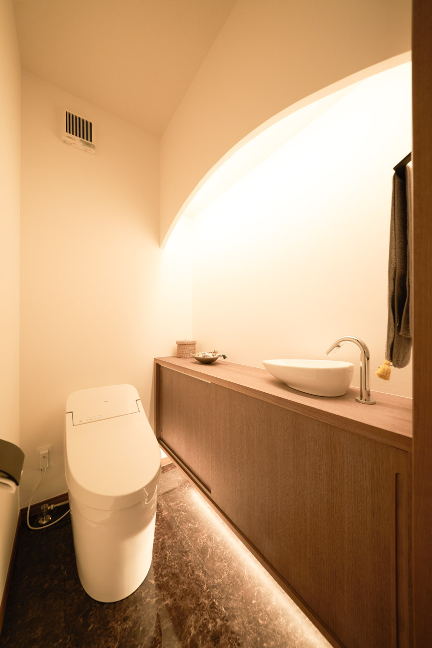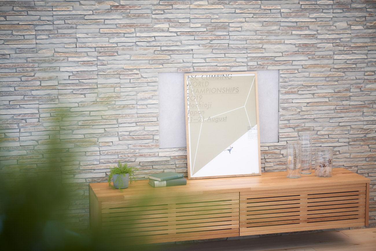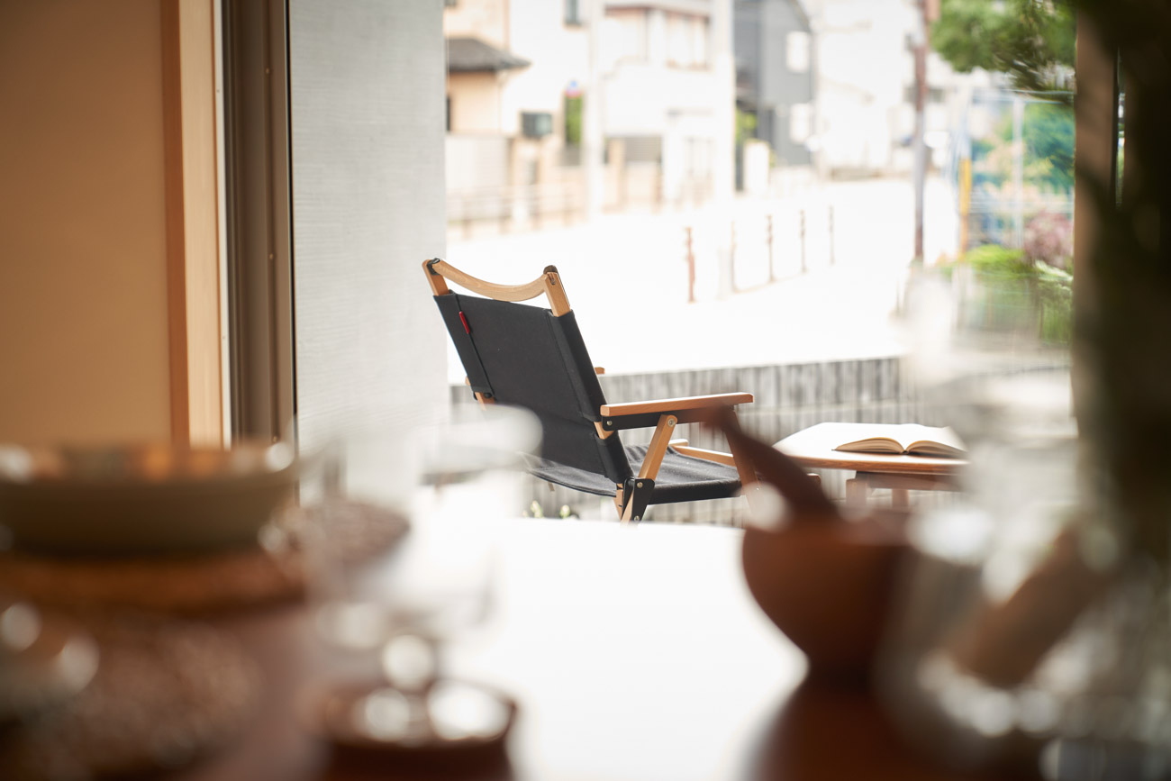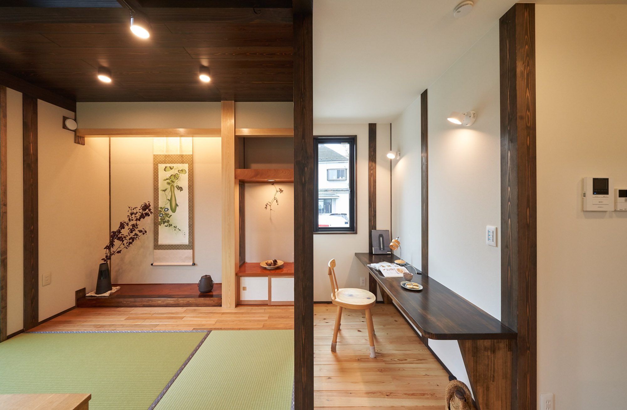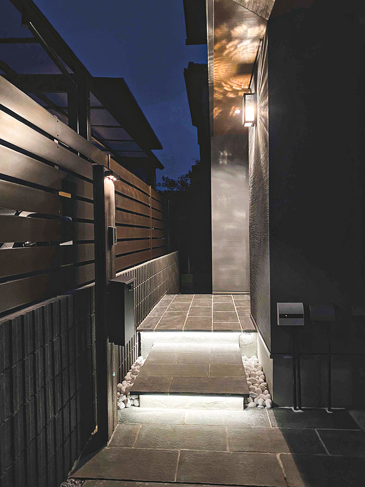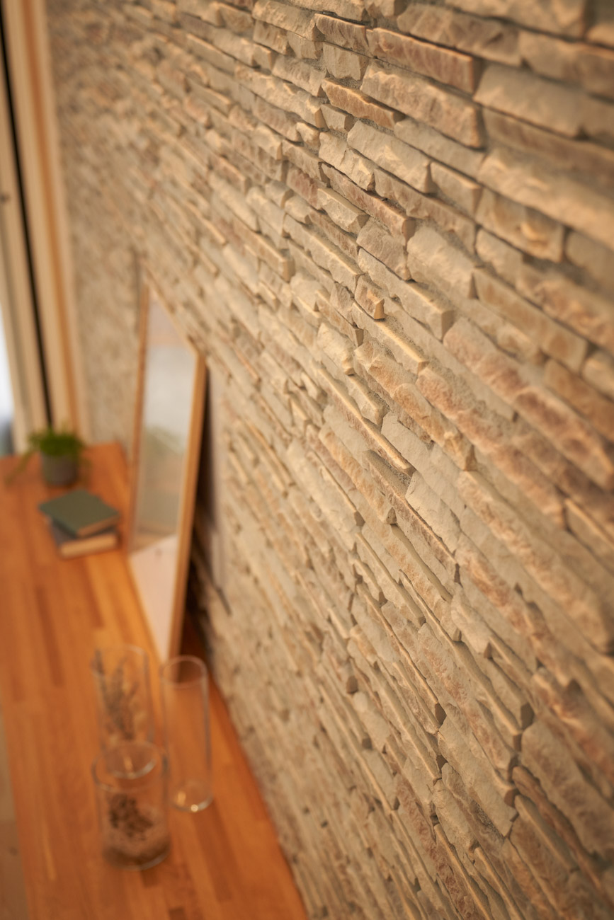 デザイン・仕様・素材。一つ一つのこだわりを散りばめ、趣向を凝らしたお住まい。壁と繋がるように仕上げたレッドシダーの造作引き戸。深くシャープな質感が印象的な石積み調のアクセントウォール。職人が丹精込めた家具や建具。それぞれがリズムよく配置され、奥行きや高さの工夫で心地よい空間を実現したお住まい。 質感と配置の工夫で 心地よい空間演出。 リビングのTVボードの壁には、外壁材としても使用される、天然石風の壁材を使用。意匠性が高く深い質感が上質な空間を演出してくれます。吹き抜けのあるリビングと、緩く分けられたダイニングキッチンの配置で奥行きと高さが生まれ、より広さを体感できます。空間が繋がるように配置されたアウトドアリビングは、外壁を上手に配置する事で、風の流れは遮らず、道路からの目線は遮る工夫がされています。 職人と設計士のコラボレーション。 オリジナルの建具や家具。 レッドシダーの造作引き戸、ウォールナットの階段手すりやトイレの造作棚、床受けのないすっきりとした仕切り格子など、自由設計ならではの造作アイテムが多数。