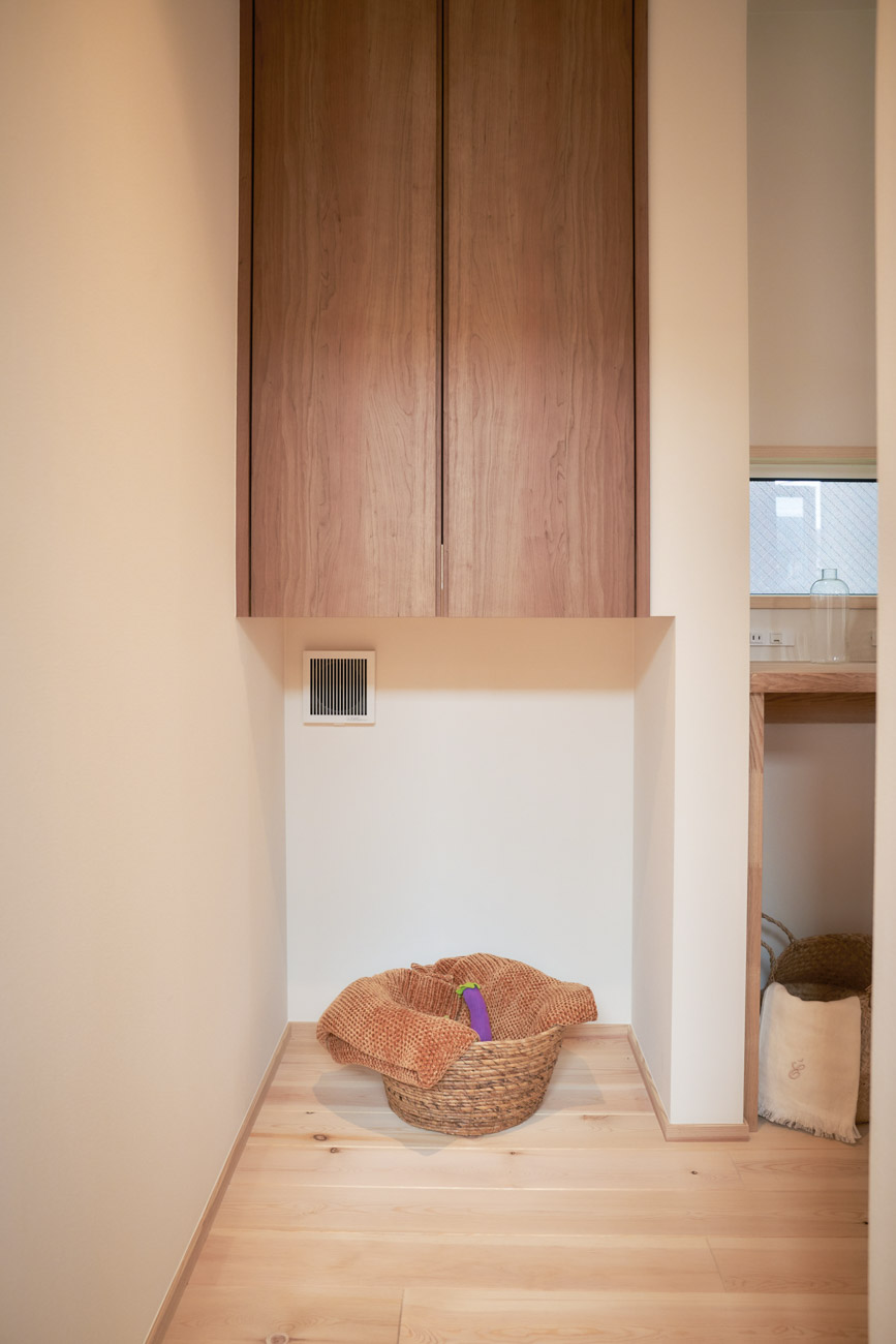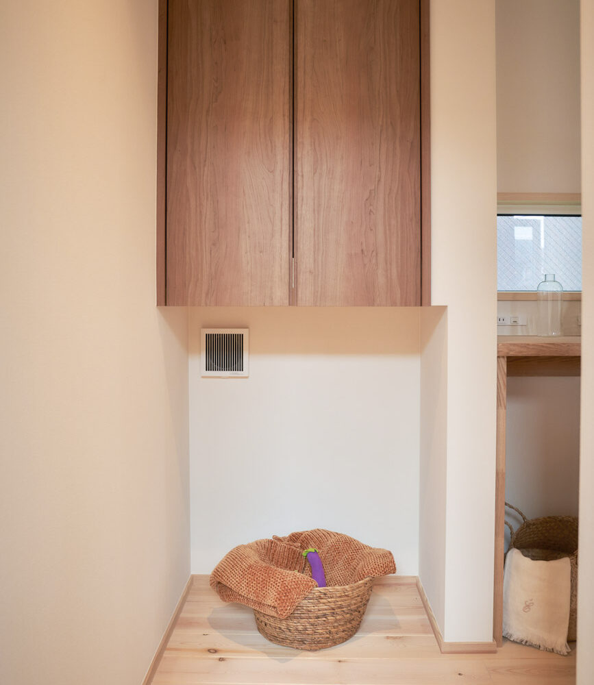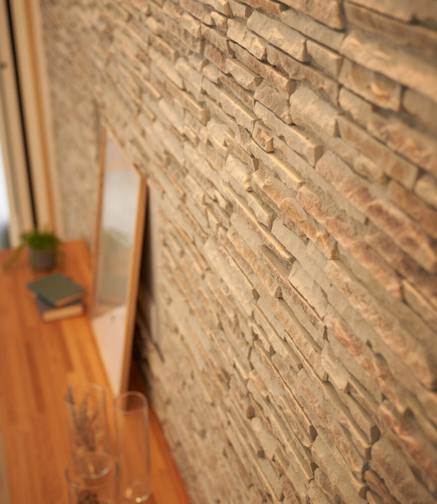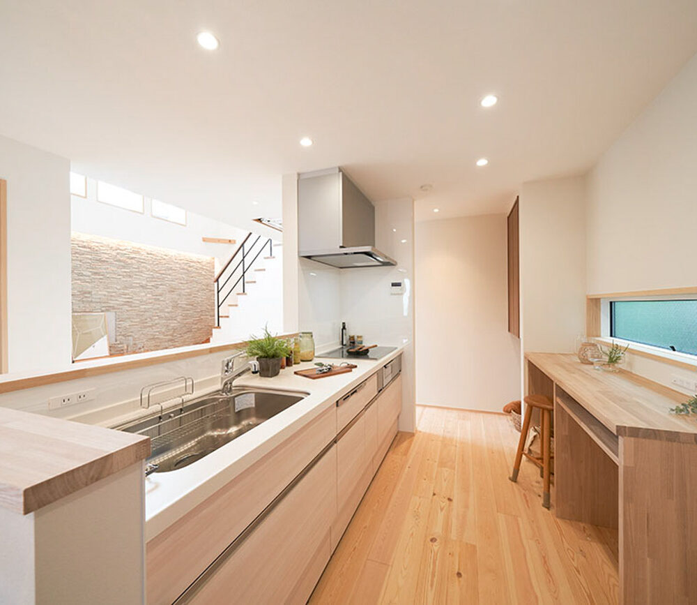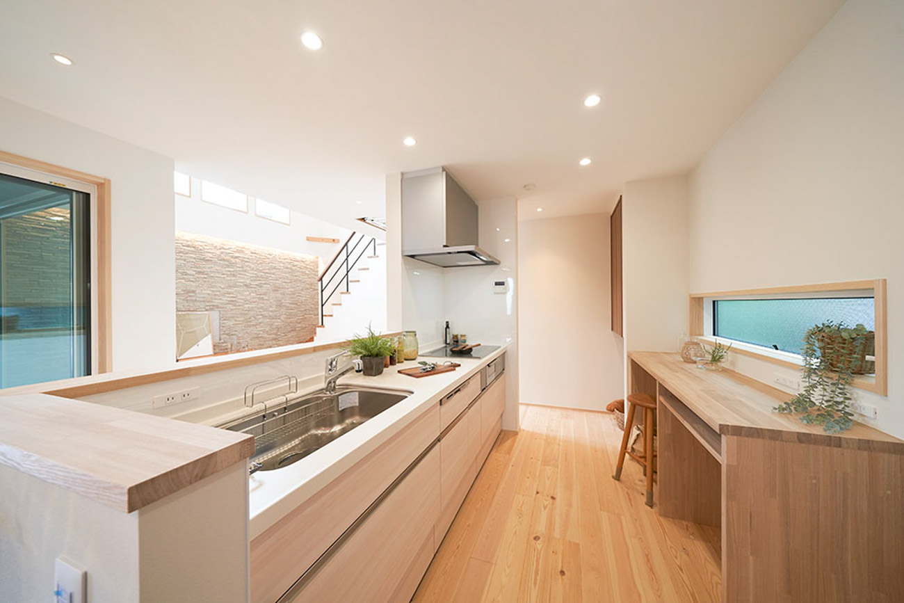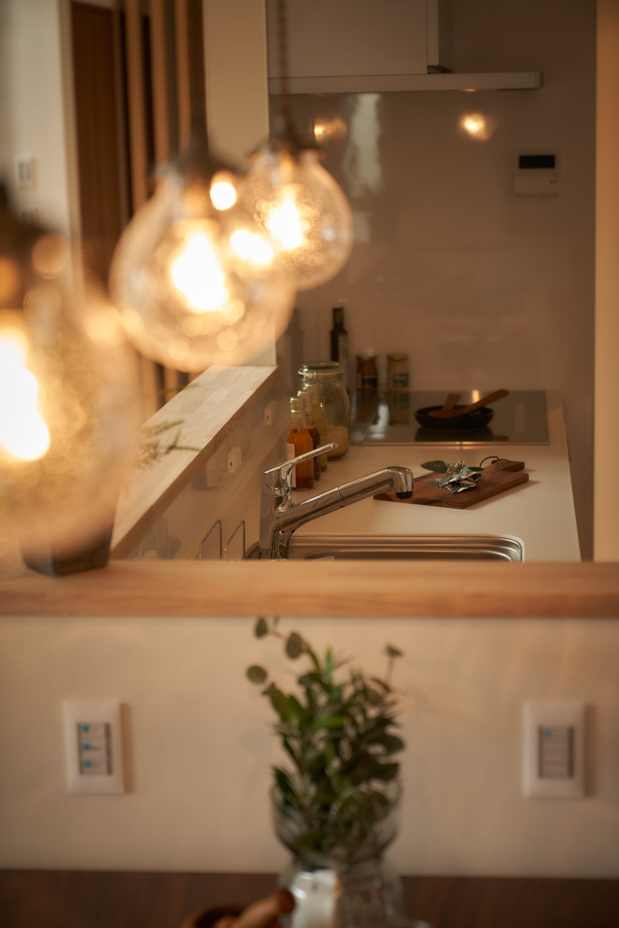 デザイン・仕様・素材。一つ一つのこだわりを散りばめ、趣向を凝らしたお住まい。壁と繋がるように仕上げたレッドシダーの造作引き戸。深くシャープな質感が印象的な石積み調のアクセントウォール。職人が丹精込めた家具や建具。それぞれがリズムよく配置され、奥行きや高さの工夫で心地よい空間を実現したお住まい。 質感と配置の工夫で 心地よい空間演出。 リビングのTVボードの壁には、外壁材としても使用される、天然石風の壁材を使用。意匠性が高く深い質感が上質な空間を演出してくれます。吹き抜けのあるリビングと、緩く分けられたダイニングキッチンの配置で奥行きと高さが生まれ、より広さを体感できます。空間が繋がるように配置されたアウトドアリビングは、外壁を上手に配置する事で、風の流れは遮らず、道路からの目線は遮る工夫がされています。 職人と設計士のコラボレーション。 オリジナルの建具や家具。 レッドシダーの造作引き戸、ウォールナットの階段手すりやトイレの造作棚、床受けのないすっきりとした仕切り格子など、自由設計ならではの造作アイテムが多数。