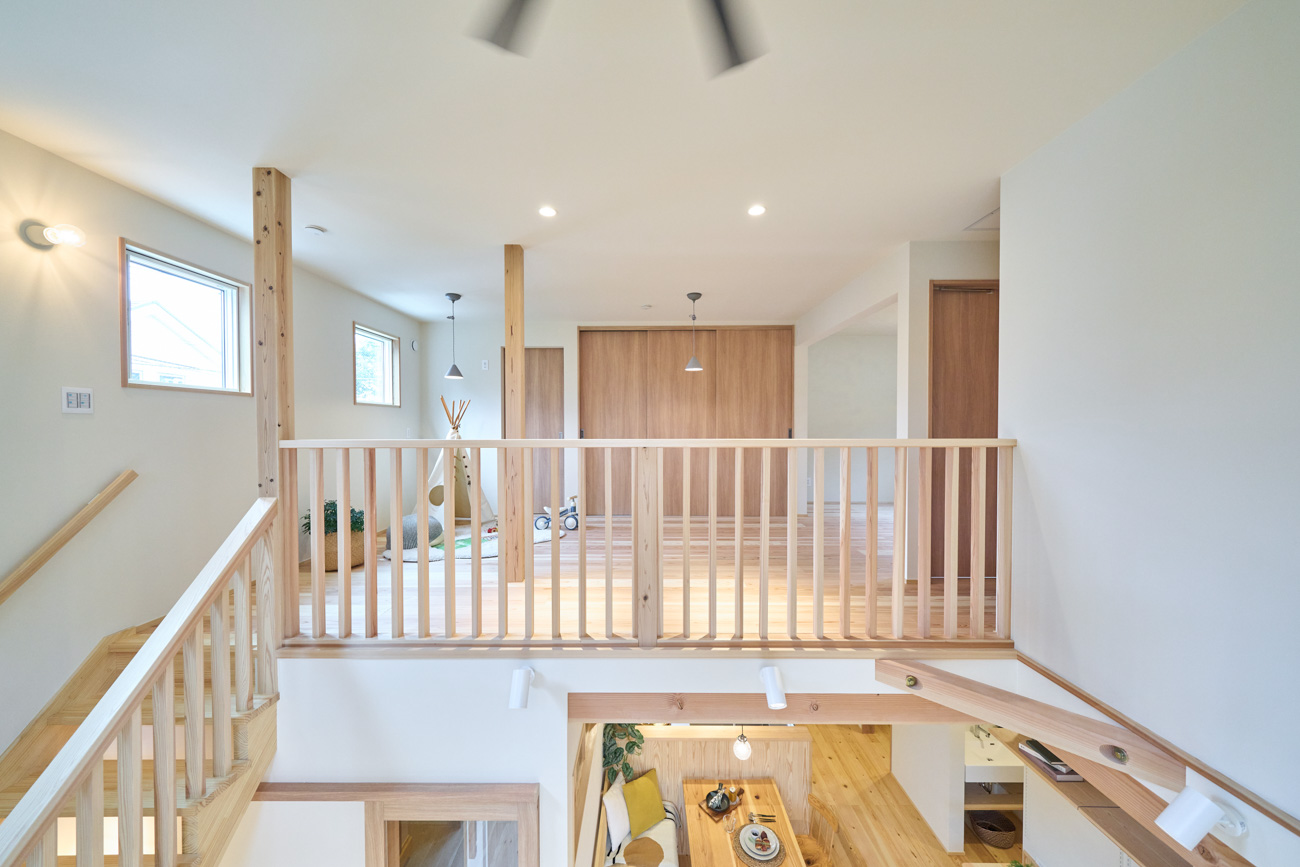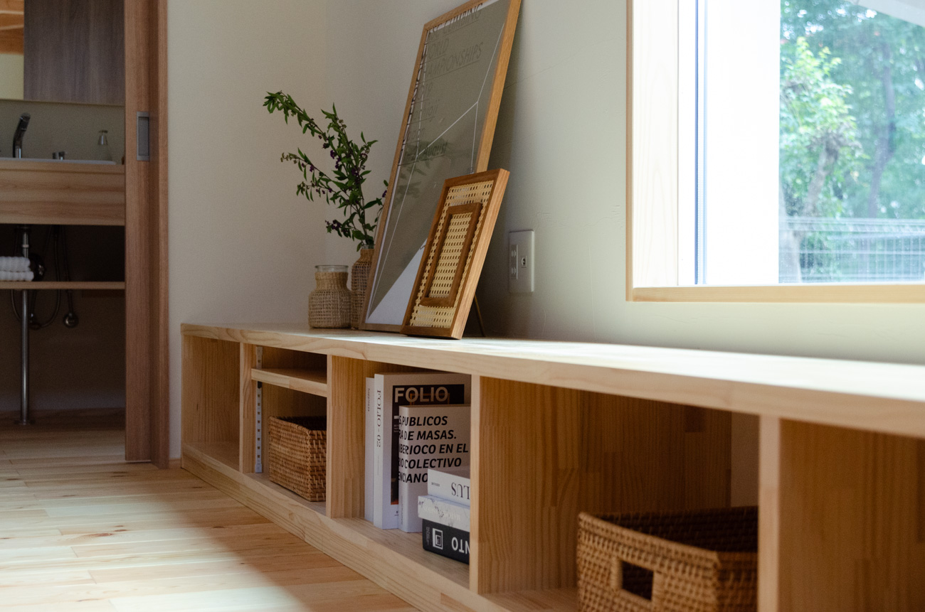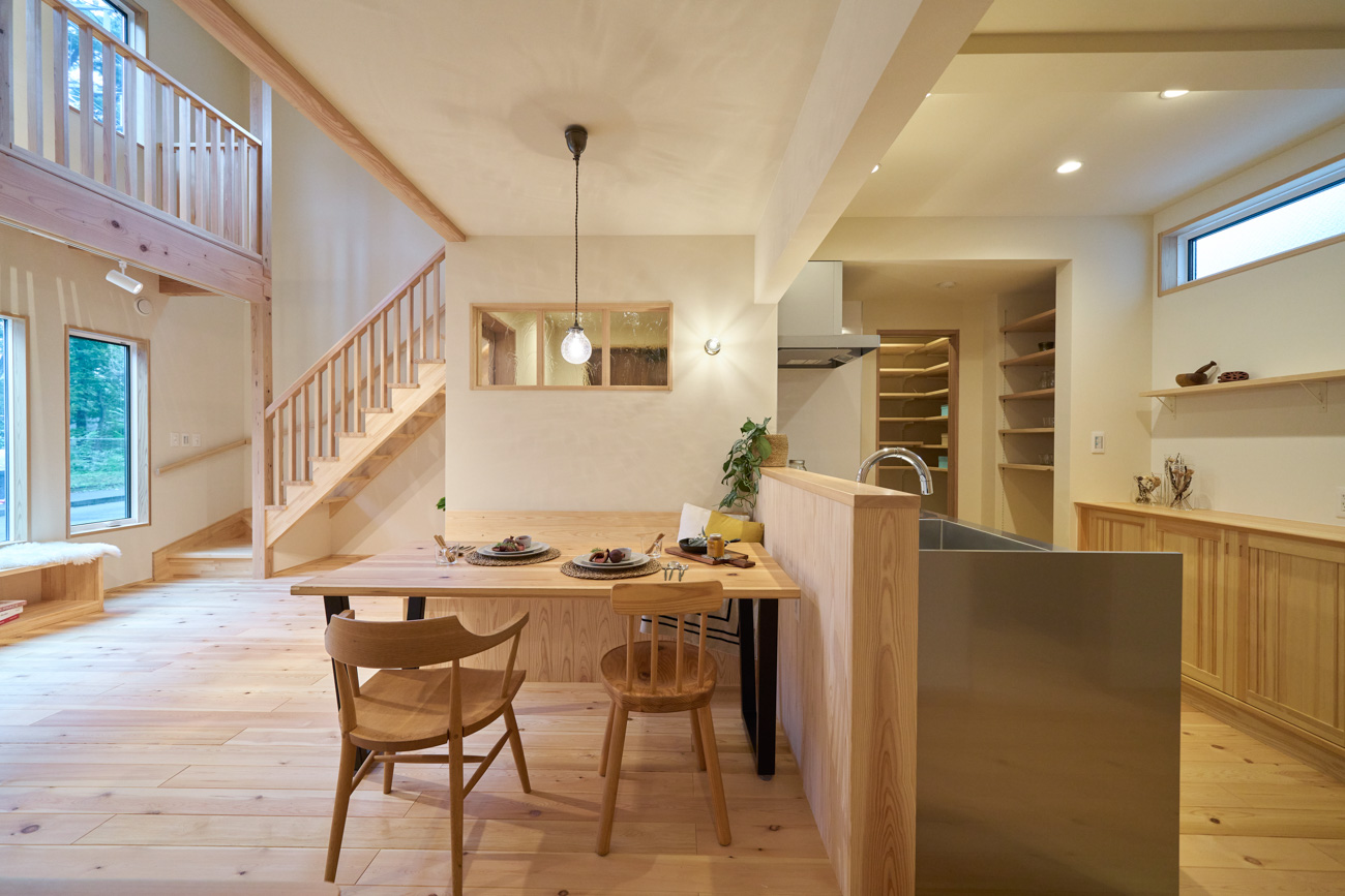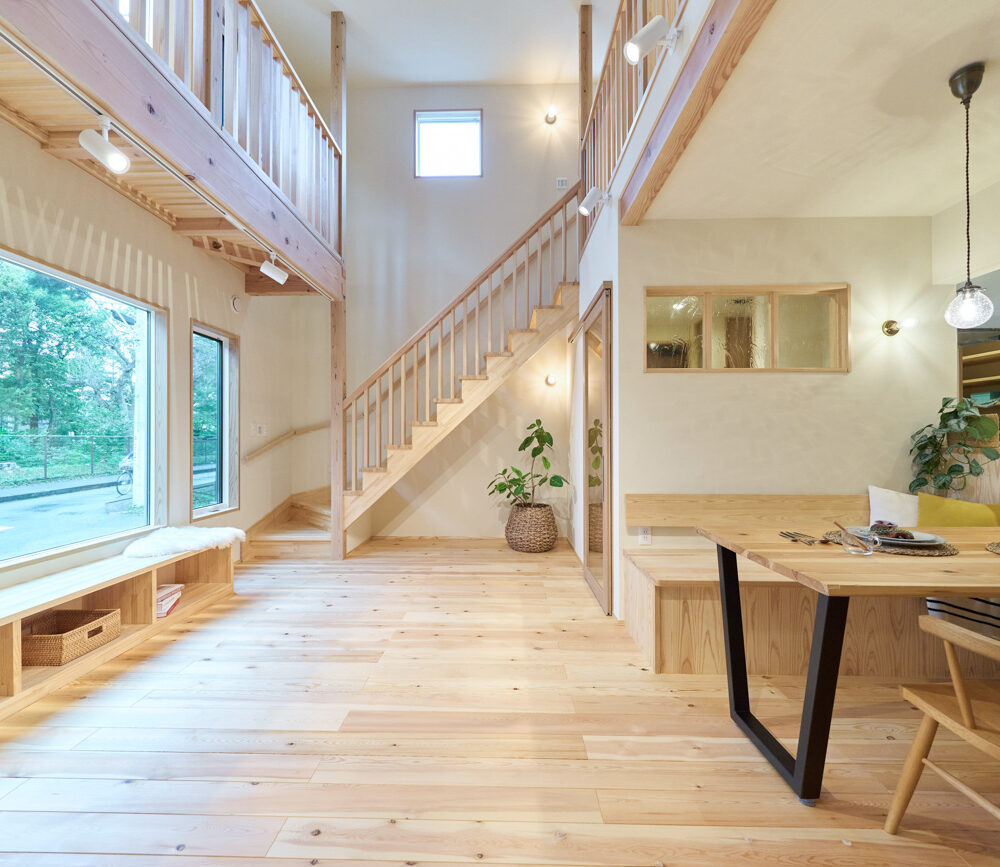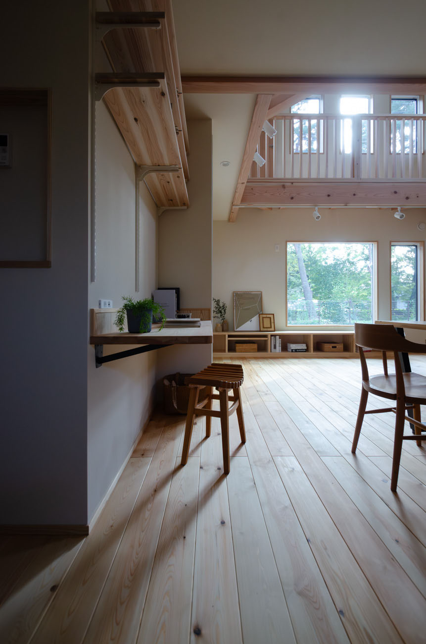 豊かな借景を望む大きなピクチャーウィンドウ。気配をつなぐ吹き抜けや仕切りをなくしたフリースペースといったおおらかな間取り。趣味を楽しんだり、住む人に丁度良く設えた多彩な造作家具たち。用途を分けて使い勝手の良い二箇所のワークスペース。 家族のつながりを大事にしながらもそれぞれのライフスタイルを尊重した家づくり。立地の良さも最大限活かし、居心地の良さと暮らしやすさを両立したお住まいです。 多彩な造作家具と ピクチャーウィンドウ リビングの主役となるのは豊かな風景を切り取る大きなピクチャーウィンドウ。リビングのあらゆるところから借景を楽しむことができます。また、多彩な造作家具を採用。下部収納のあるリビングベンチ・洗面化粧台・ダイニングベンチ・ワークスペースなど、自分たちサイズにオーダーしたこだわりの家具が散りばめられています。キッチンは無垢との相性も良いマニッシュなオールステンレスキッチンを採用。キッチン横には独立した小さな書斎を設け、趣味に読書に没頭できる場所も作りました。 洗面家事室/家族のサイズに合わせた広々洗面台 洗面室には広々と家事スペースを取った大きな洗面家事台を造作。洗濯物を畳んだり、アイロンをかけたりと大活躍。ガス乾燥機を設置予定のため、洗濯に関する家事はこのスペースで全て完了できます。乾燥機にかけられないものは家事室から直接出られる広々ウッドデッキへ。雨風の強い日は室内干しも可能です。 玄関/2方向動線や彩光など工夫がたくさん 玄関を開けるとまず目に入るのが室内窓。アルトドイッチェガラスをはめ込んだ室内窓と大きなガラスのリビングドアを設置。暗くなりがちな玄関も彩光が取れる工夫です。趣味の釣り道具をディスプレイするための棚や、竿を掛けて保管するための美しい上小の杉の無垢パネリングウォールがあります。リビング側とキッチンがわそれぞれに移動できる二つの動線も暮らしやすさの工夫です。 2F 吹き抜けでつながるフリースペース 階段を上がると広々とした大空間が迎えてくれます。将来的に二つの個室へと可変できるフリースペースはお子様が小さいうちは遊び場やファミリースペースとして大活躍。吹き抜けで上下階が大きく繋がっているので開放感と共にどこにいても家族の気配を伝えてくれます。吹き抜け上部に寝室とつながるキャットウォーク設置。彩光を取りつつ、窓のお掃除にも活躍します。
