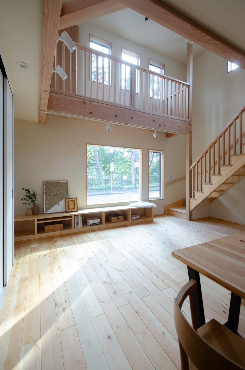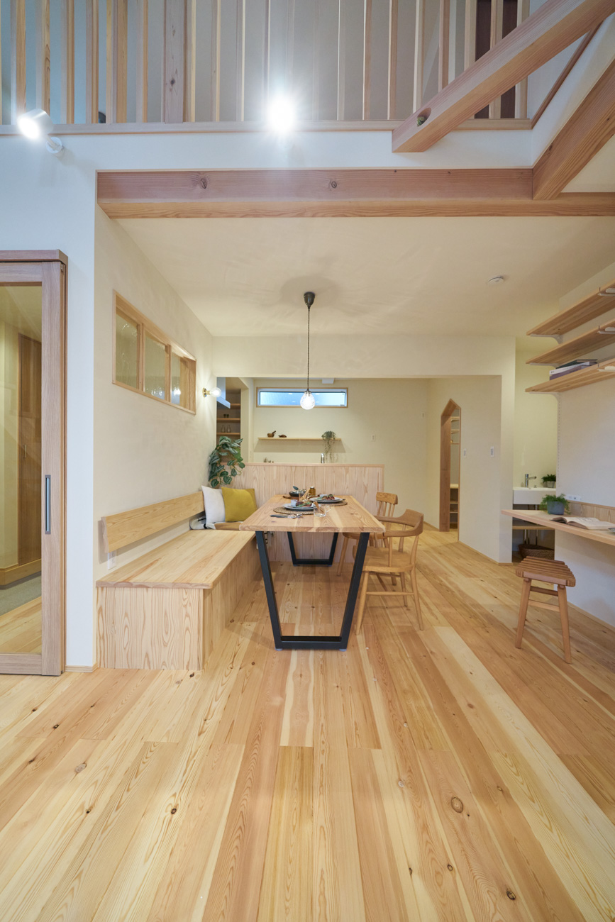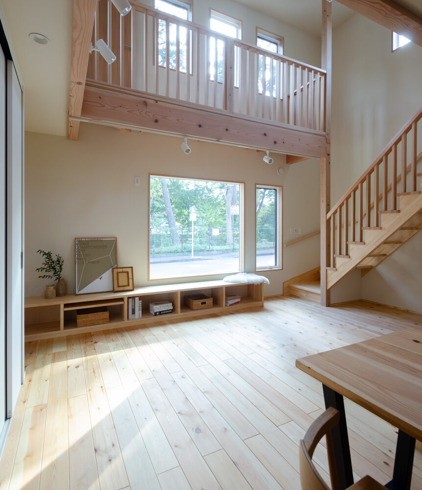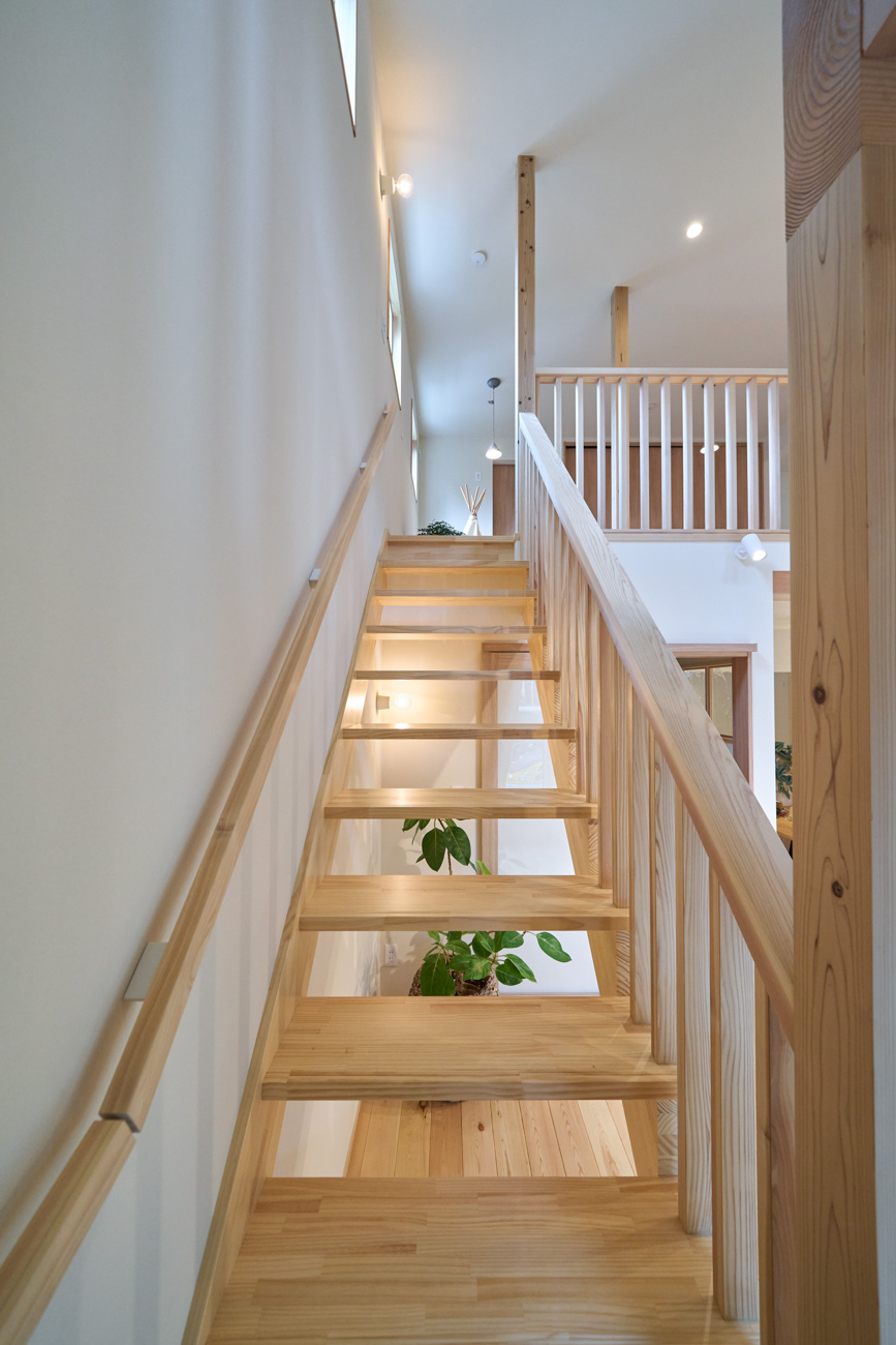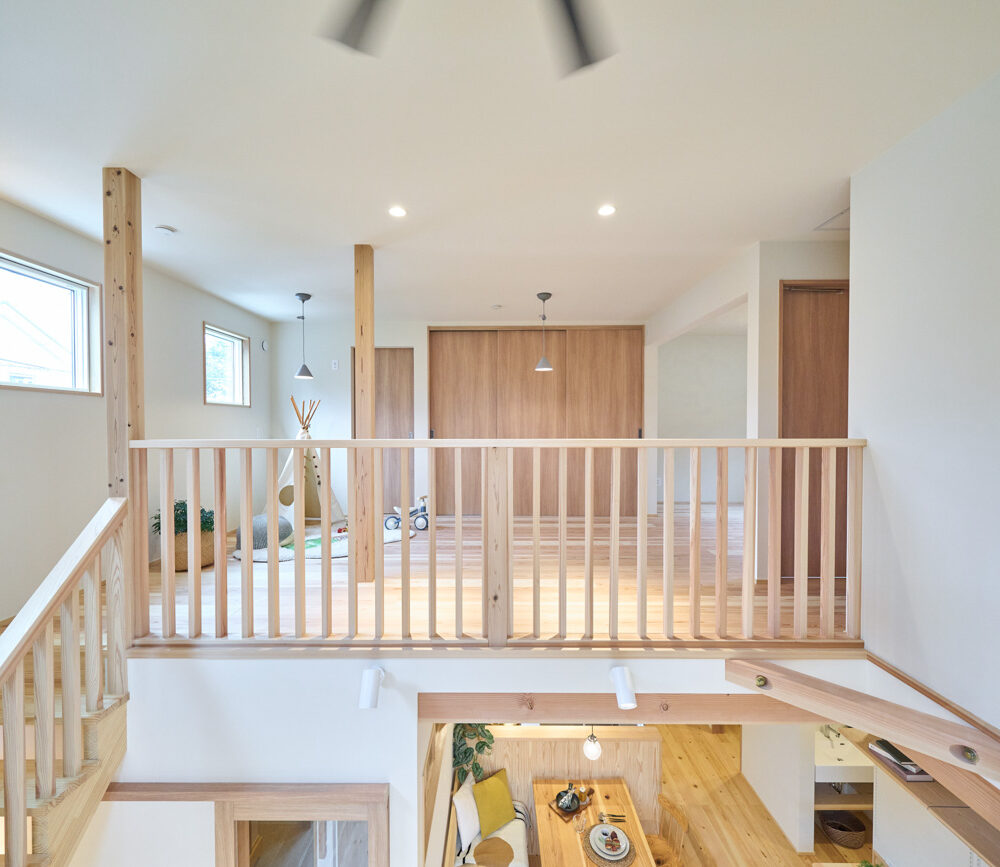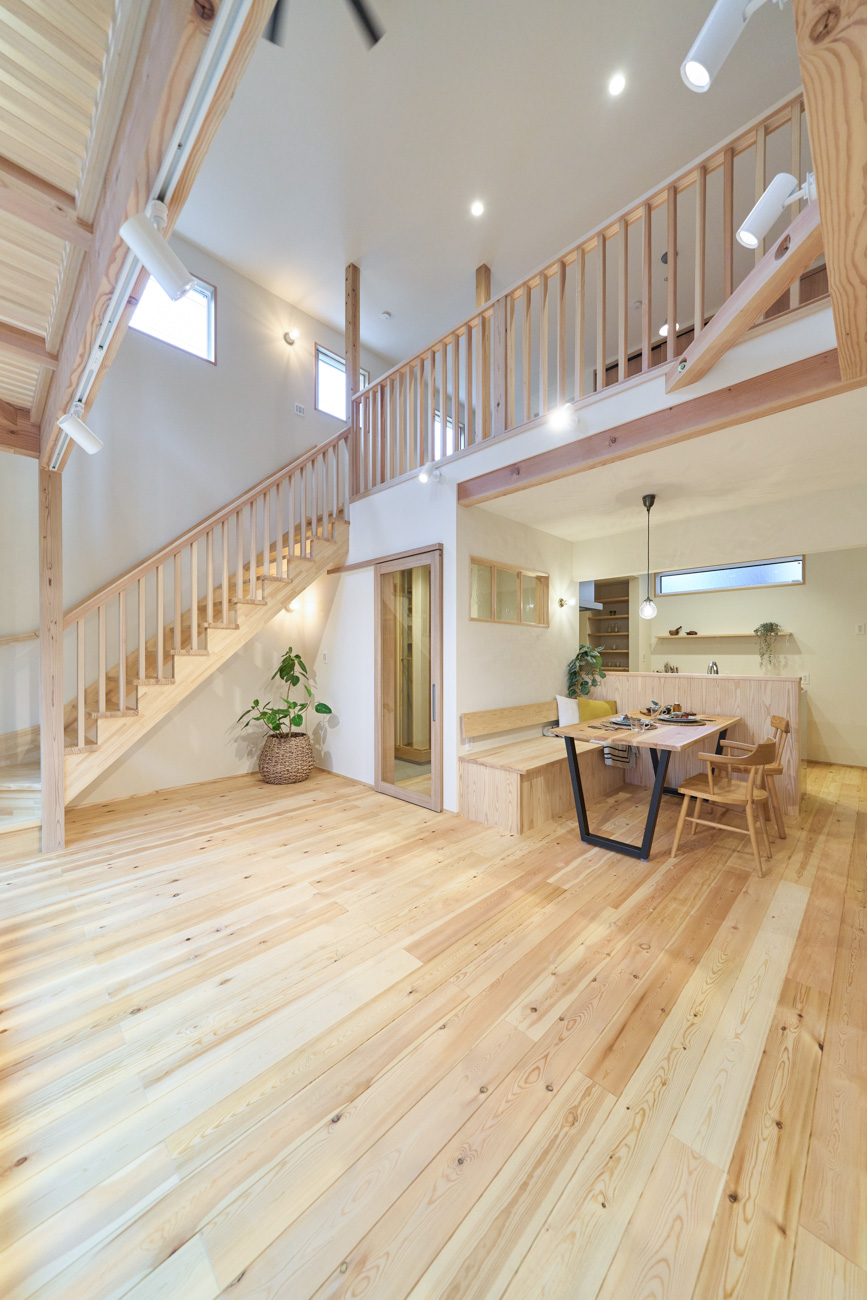 豊かな借景を望む大きなピクチャーウィンドウ。気配をつなぐ吹き抜けや仕切りをなくしたフリースペースといったおおらかな間取り。趣味を楽しんだり、住む人に丁度良く設えた多彩な造作家具たち。用途を分けて使い勝手の良い二箇所のワークスペース。 家族のつながりを大事にしながらもそれぞれのライフスタイルを尊重した家づくり。立地の良さも最大限活かし、居心地の良さと暮らしやすさを両立したお住まいです。 多彩な造作家具と ピクチャーウィンドウ リビングの主役となるのは豊かな風景を切り取る大きなピクチャーウィンドウ。リビングのあらゆるところから借景を楽しむことができます。また、多彩な造作家具を採用。下部収納のあるリビングベンチ・洗面化粧台・ダイニングベンチ・ワークスペースなど、自分たちサイズにオーダーしたこだわりの家具が散りばめられています。キッチンは無垢との相性も良いマニッシュなオールステンレスキッチンを採用。キッチン横には独立した小さな書斎を設け、趣味に読書に没頭できる場所も作りました。 洗面家事室/家族のサイズに合わせた広々洗面台 洗面室には広々と家事スペースを取った大きな洗面家事台を造作。洗濯物を畳んだり、アイロンをかけたりと大活躍。ガス乾燥機を設置予定のため、洗濯に関する家事はこのスペースで全て完了できます。乾燥機にかけられないものは家事室から直接出られる広々ウッドデッキへ。雨風の強い日は室内干しも可能です。 玄関/2方向動線や彩光など工夫がたくさん 玄関を開けるとまず目に入るのが室内窓。アルトドイッチェガラスをはめ込んだ室内窓と大きなガラスのリビングドアを設置。暗くなりがちな玄関も彩光が取れる工夫です。趣味の釣り道具をディスプレイするための棚や、竿を掛けて保管するための美しい上小の杉の無垢パネリングウォールがあります。リビング側とキッチンがわそれぞれに移動できる二つの動線も暮らしやすさの工夫です。 2F 吹き抜けでつながるフリースペース 階段を上がると広々とした大空間が迎えてくれます。将来的に二つの個室へと可変できるフリースペースはお子様が小さいうちは遊び場やファミリースペースとして大活躍。吹き抜けで上下階が大きく繋がっているので開放感と共にどこにいても家族の気配を伝えてくれます。吹き抜け上部に寝室とつながるキャットウォーク設置。彩光を取りつつ、窓のお掃除にも活躍します。