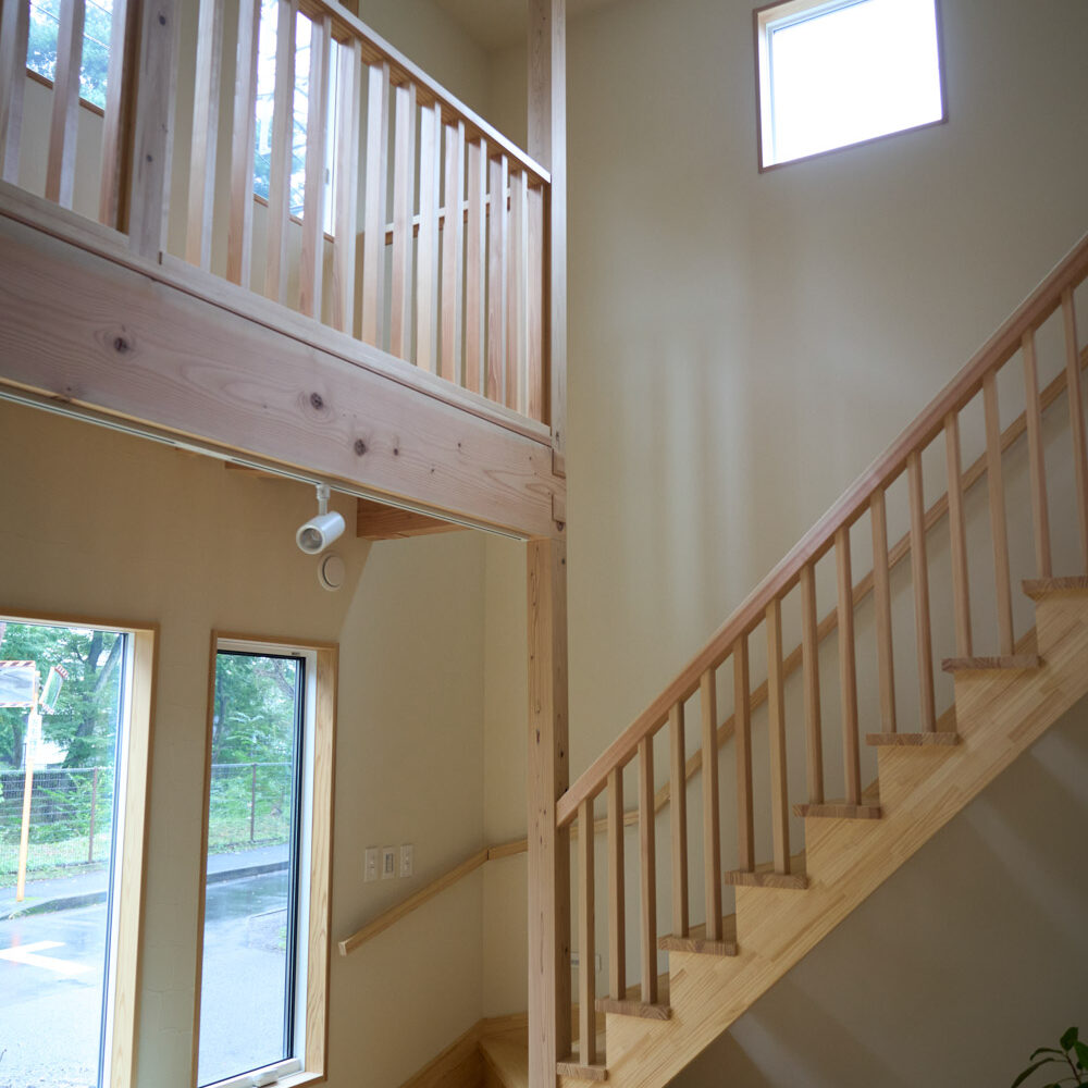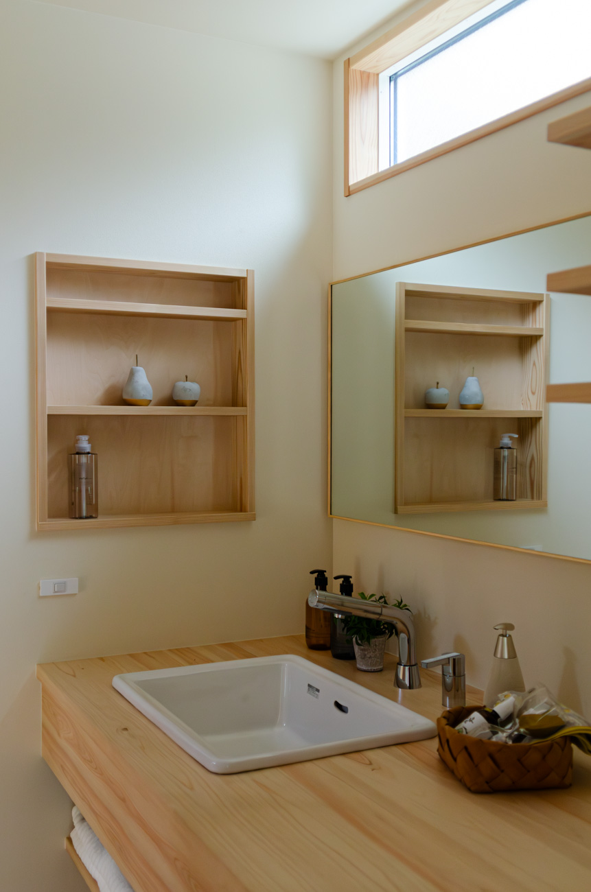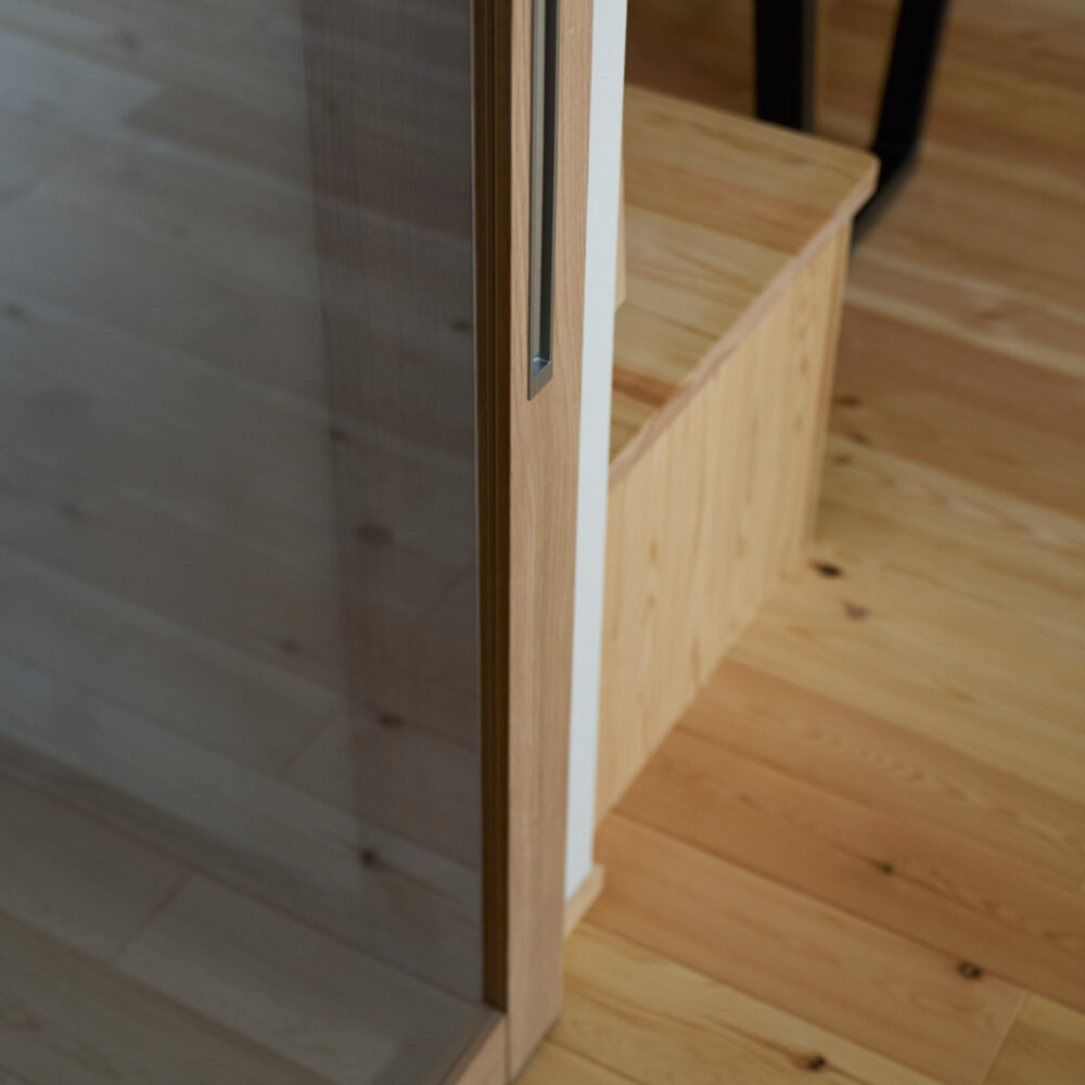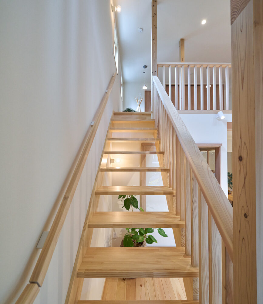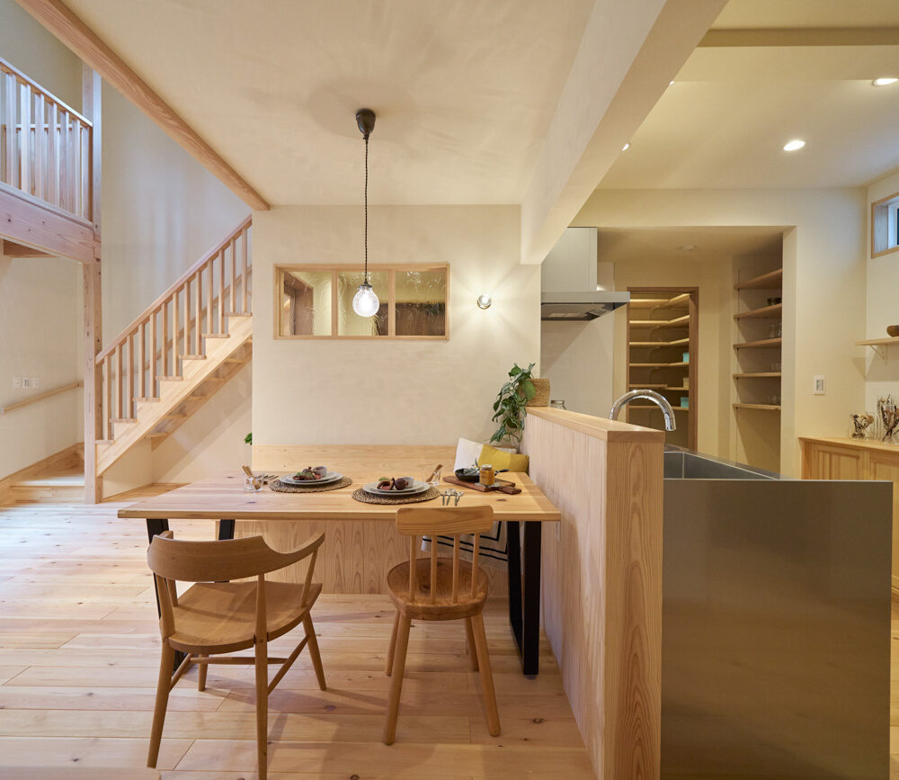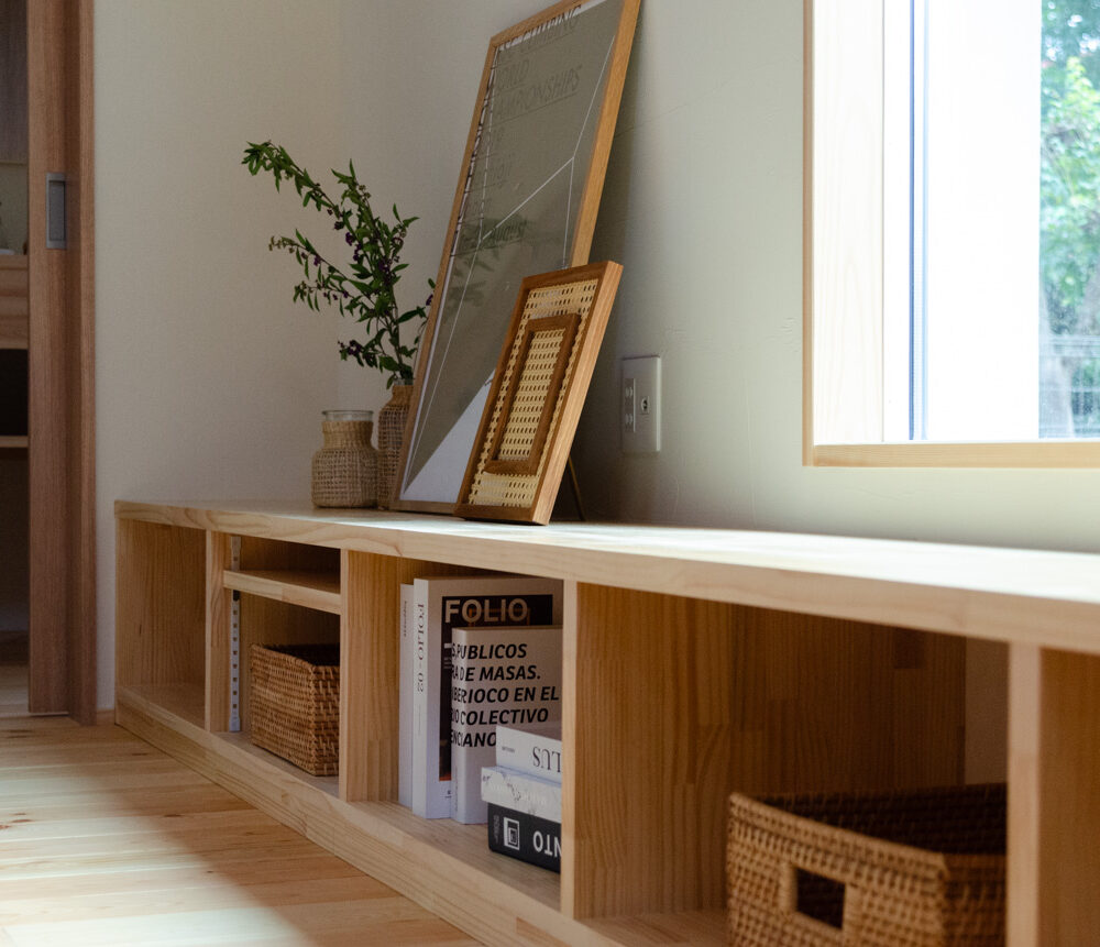 豊かな借景を望む大きなピクチャーウィンドウ。気配をつなぐ吹き抜けや仕切りをなくしたフリースペースといったおおらかな間取り。趣味を楽しんだり、住む人に丁度良く設えた多彩な造作家具たち。用途を分けて使い勝手の良い二箇所のワークスペース。 家族のつながりを大事にしながらもそれぞれのライフスタイルを尊重した家づくり。立地の良さも最大限活かし、居心地の良さと暮らしやすさを両立したお住まいです。 多彩な造作家具と ピクチャーウィンドウ リビングの主役となるのは豊かな風景を切り取る大きなピクチャーウィンドウ。リビングのあらゆるところから借景を楽しむことができます。また、多彩な造作家具を採用。下部収納のあるリビングベンチ・洗面化粧台・ダイニングベンチ・ワークスペースなど、自分たちサイズにオーダーしたこだわりの家具が散りばめられています。キッチンは無垢との相性も良いマニッシュなオールステンレスキッチンを採用。キッチン横には独立した小さな書斎を設け、趣味に読書に没頭できる場所も作りました。 洗面家事室/家族のサイズに合わせた広々洗面台 洗面室には広々と家事スペースを取った大きな洗面家事台を造作。洗濯物を畳んだり、アイロンをかけたりと大活躍。ガス乾燥機を設置予定のため、洗濯に関する家事はこのスペースで全て完了できます。乾燥機にかけられないものは家事室から直接出られる広々ウッドデッキへ。雨風の強い日は室内干しも可能です。 玄関/2方向動線や彩光など工夫がたくさん 玄関を開けるとまず目に入るのが室内窓。アルトドイッチェガラスをはめ込んだ室内窓と大きなガラスのリビングドアを設置。暗くなりがちな玄関も彩光が取れる工夫です。趣味の釣り道具をディスプレイするための棚や、竿を掛けて保管するための美しい上小の杉の無垢パネリングウォールがあります。リビング側とキッチンがわそれぞれに移動できる二つの動線も暮らしやすさの工夫です。 2F 吹き抜けでつながるフリースペース 階段を上がると広々とした大空間が迎えてくれます。将来的に二つの個室へと可変できるフリースペースはお子様が小さいうちは遊び場やファミリースペースとして大活躍。吹き抜けで上下階が大きく繋がっているので開放感と共にどこにいても家族の気配を伝えてくれます。吹き抜け上部に寝室とつながるキャットウォーク設置。彩光を取りつつ、窓のお掃除にも活躍します。