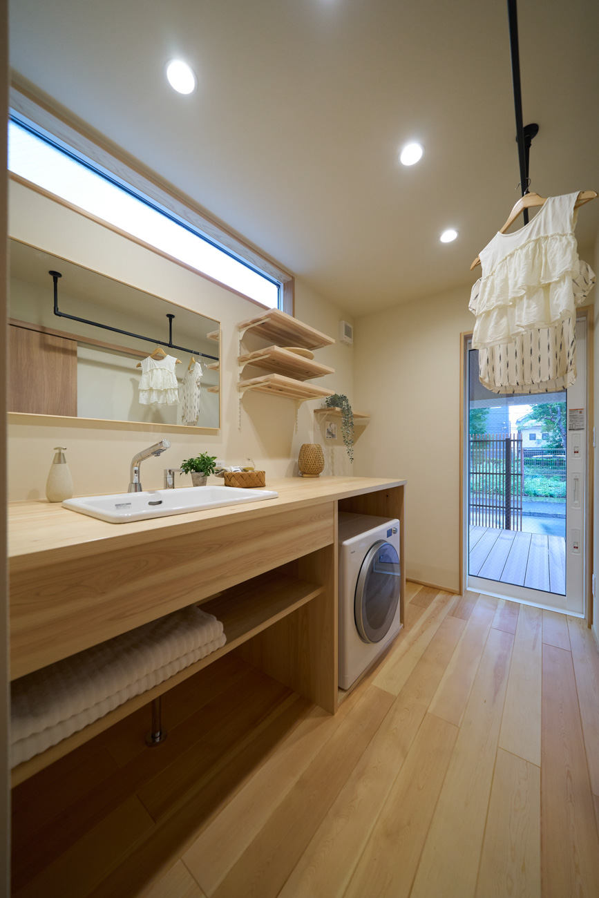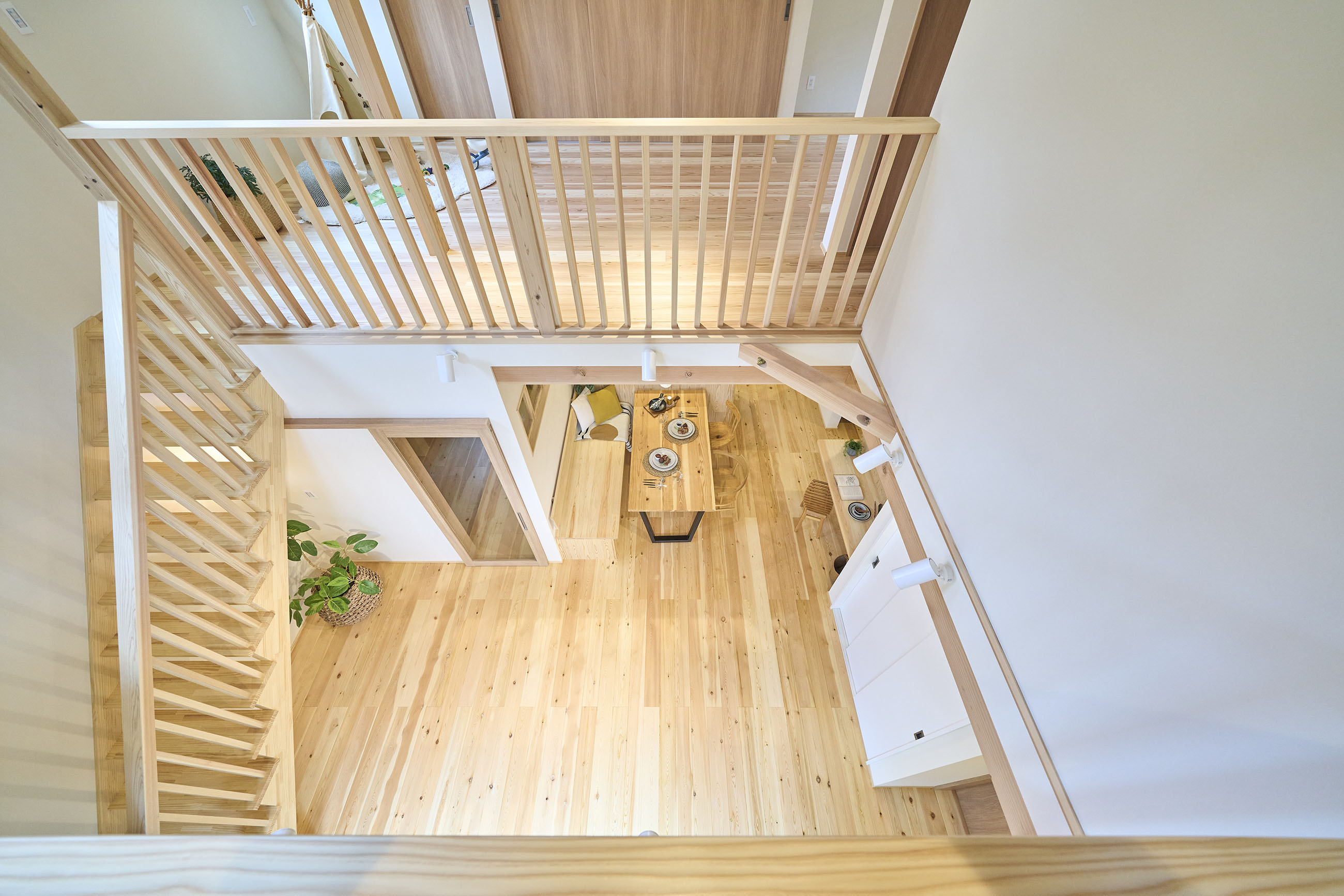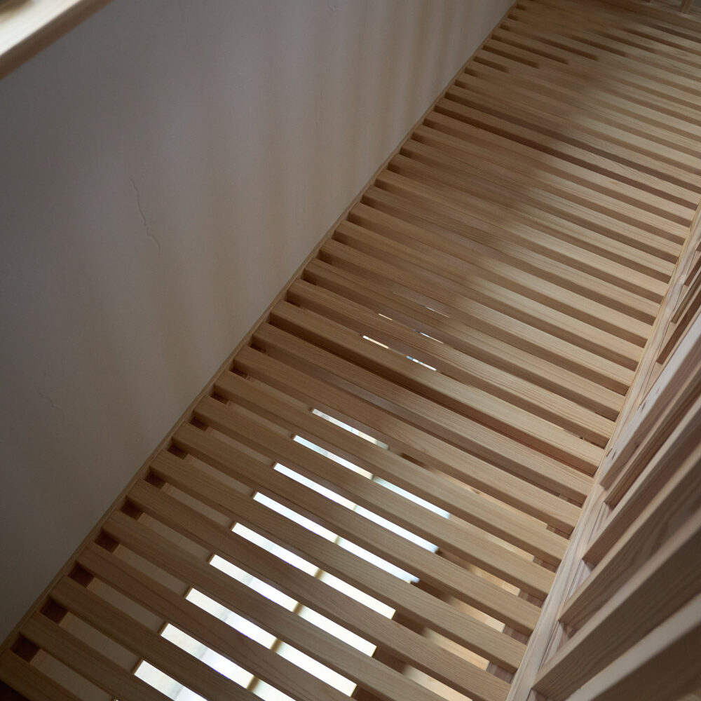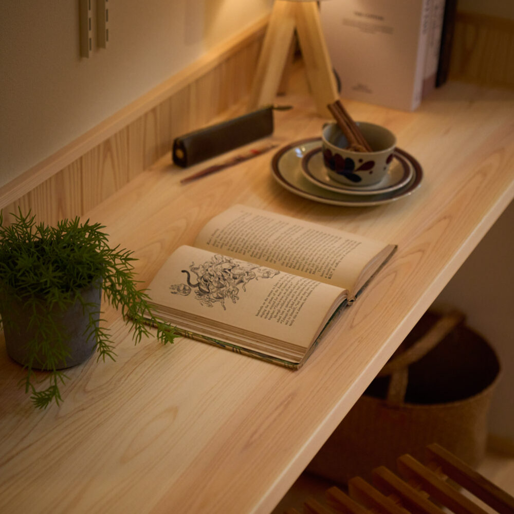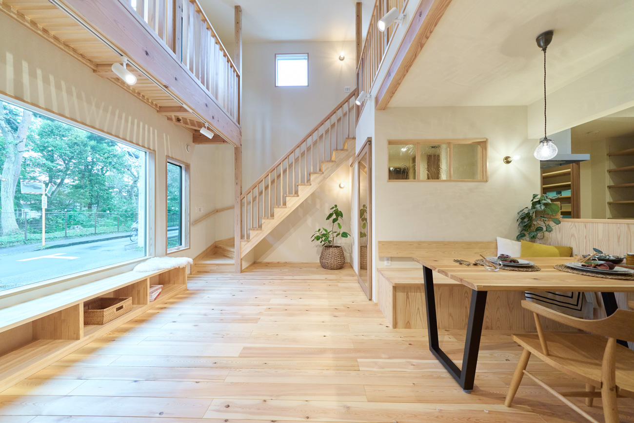 豊かな借景を望む大きなピクチャーウィンドウ。気配をつなぐ吹き抜けや仕切りをなくしたフリースペースといったおおらかな間取り。趣味を楽しんだり、住む人に丁度良く設えた多彩な造作家具たち。用途を分けて使い勝手の良い二箇所のワークスペース。 家族のつながりを大事にしながらもそれぞれのライフスタイルを尊重した家づくり。立地の良さも最大限活かし、居心地の良さと暮らしやすさを両立したお住まいです。 多彩な造作家具と ピクチャーウィンドウ リビングの主役となるのは豊かな風景を切り取る大きなピクチャーウィンドウ。リビングのあらゆるところから借景を楽しむことができます。また、多彩な造作家具を採用。下部収納のあるリビングベンチ・洗面化粧台・ダイニングベンチ・ワークスペースなど、自分たちサイズにオーダーしたこだわりの家具が散りばめられています。キッチンは無垢との相性も良いマニッシュなオールステンレスキッチンを採用。キッチン横には独立した小さな書斎を設け、趣味に読書に没頭できる場所も作りました。 洗面家事室/家族のサイズに合わせた広々洗面台 洗面室には広々と家事スペースを取った大きな洗面家事台を造作。洗濯物を畳んだり、アイロンをかけたりと大活躍。ガス乾燥機を設置予定のため、洗濯に関する家事はこのスペースで全て完了できます。乾燥機にかけられないものは家事室から直接出られる広々ウッドデッキへ。雨風の強い日は室内干しも可能です。 玄関/2方向動線や彩光など工夫がたくさん 玄関を開けるとまず目に入るのが室内窓。アルトドイッチェガラスをはめ込んだ室内窓と大きなガラスのリビングドアを設置。暗くなりがちな玄関も彩光が取れる工夫です。趣味の釣り道具をディスプレイするための棚や、竿を掛けて保管するための美しい上小の杉の無垢パネリングウォールがあります。リビング側とキッチンがわそれぞれに移動できる二つの動線も暮らしやすさの工夫です。 2F 吹き抜けでつながるフリースペース 階段を上がると広々とした大空間が迎えてくれます。将来的に二つの個室へと可変できるフリースペースはお子様が小さいうちは遊び場やファミリースペースとして大活躍。吹き抜けで上下階が大きく繋がっているので開放感と共にどこにいても家族の気配を伝えてくれます。吹き抜け上部に寝室とつながるキャットウォーク設置。彩光を取りつつ、窓のお掃除にも活躍します。