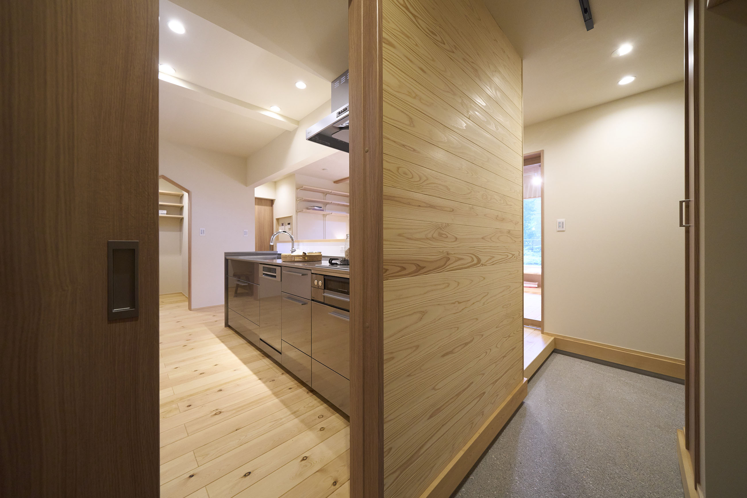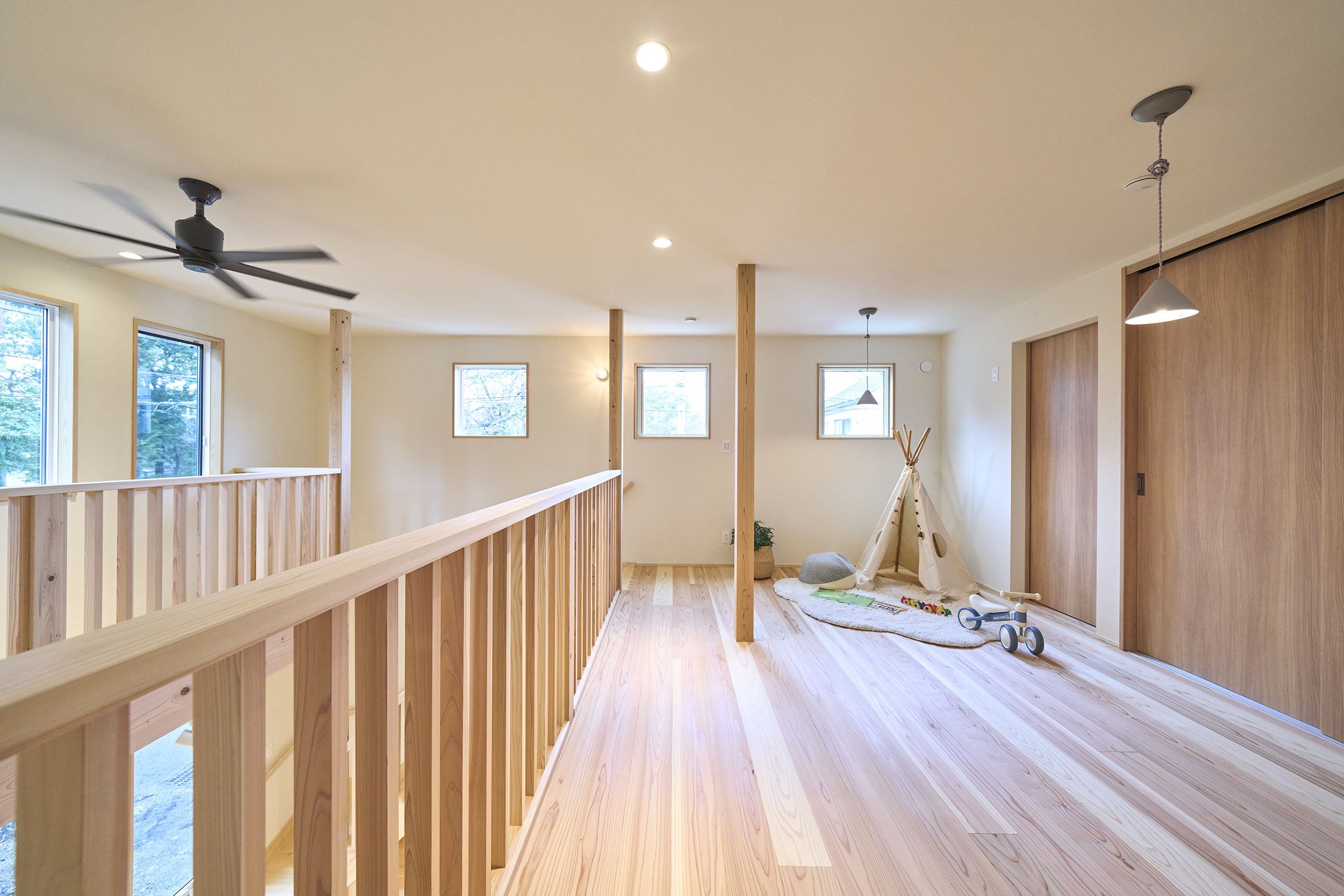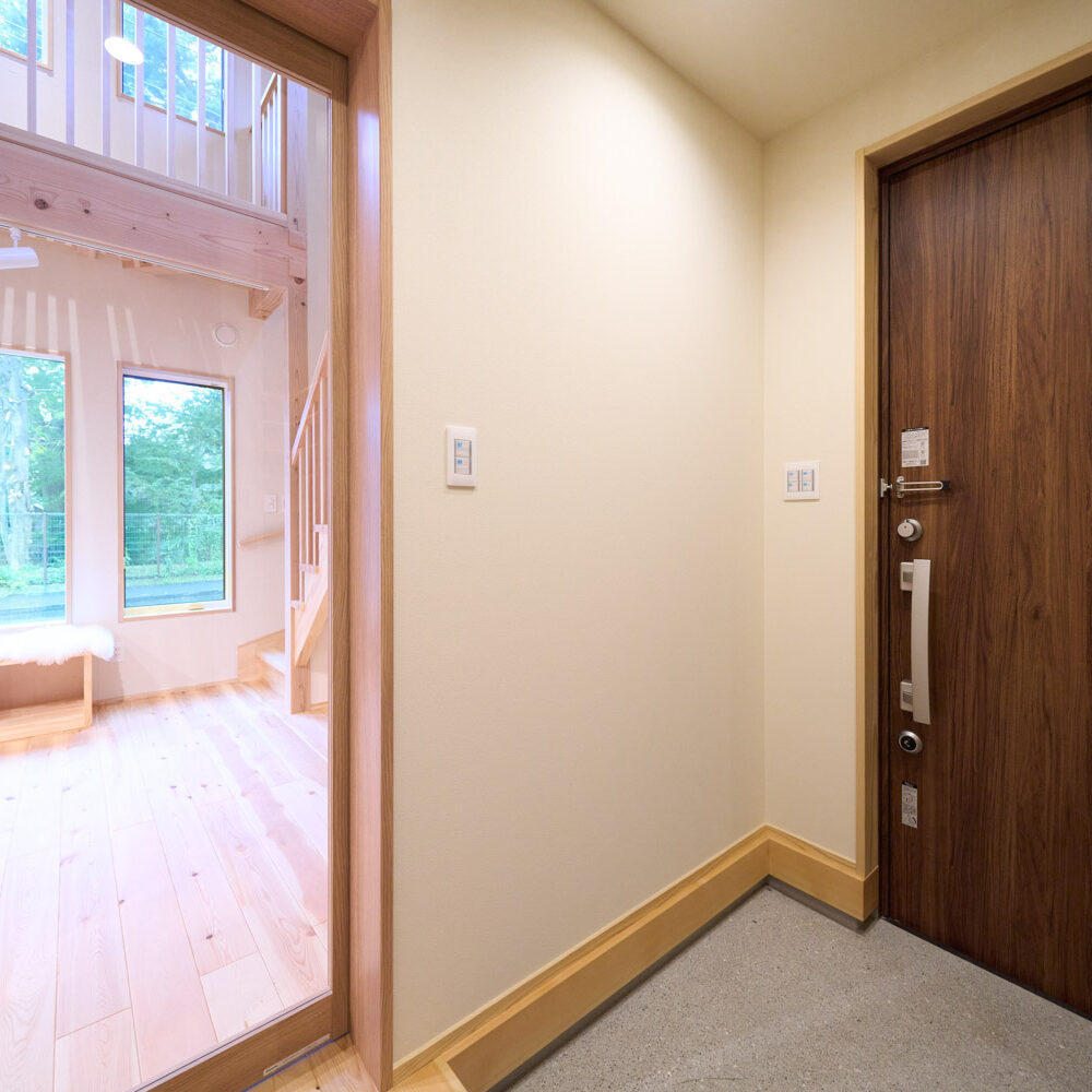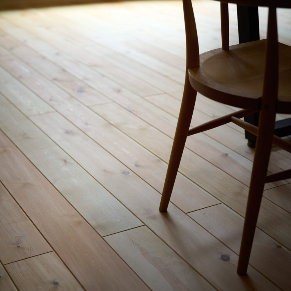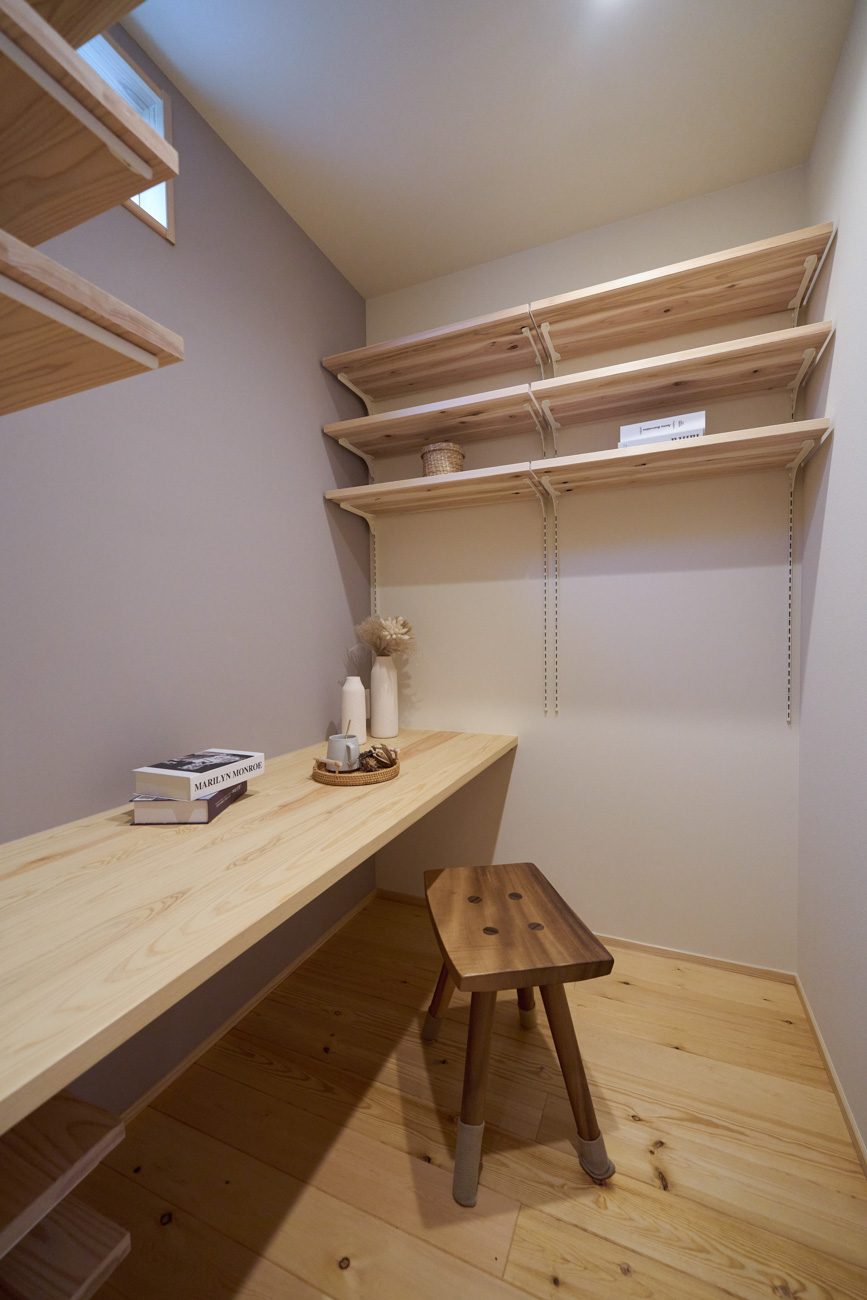 豊かな借景を望む大きなピクチャーウィンドウ。気配をつなぐ吹き抜けや仕切りをなくしたフリースペースといったおおらかな間取り。趣味を楽しんだり、住む人に丁度良く設えた多彩な造作家具たち。用途を分けて使い勝手の良い二箇所のワークスペース。 家族のつながりを大事にしながらもそれぞれのライフスタイルを尊重した家づくり。立地の良さも最大限活かし、居心地の良さと暮らしやすさを両立したお住まいです。 多彩な造作家具と ピクチャーウィンドウ リビングの主役となるのは豊かな風景を切り取る大きなピクチャーウィンドウ。リビングのあらゆるところから借景を楽しむことができます。また、多彩な造作家具を採用。下部収納のあるリビングベンチ・洗面化粧台・ダイニングベンチ・ワークスペースなど、自分たちサイズにオーダーしたこだわりの家具が散りばめられています。キッチンは無垢との相性も良いマニッシュなオールステンレスキッチンを採用。キッチン横には独立した小さな書斎を設け、趣味に読書に没頭できる場所も作りました。 洗面家事室/家族のサイズに合わせた広々洗面台 洗面室には広々と家事スペースを取った大きな洗面家事台を造作。洗濯物を畳んだり、アイロンをかけたりと大活躍。ガス乾燥機を設置予定のため、洗濯に関する家事はこのスペースで全て完了できます。乾燥機にかけられないものは家事室から直接出られる広々ウッドデッキへ。雨風の強い日は室内干しも可能です。 玄関/2方向動線や彩光など工夫がたくさん 玄関を開けるとまず目に入るのが室内窓。アルトドイッチェガラスをはめ込んだ室内窓と大きなガラスのリビングドアを設置。暗くなりがちな玄関も彩光が取れる工夫です。趣味の釣り道具をディスプレイするための棚や、竿を掛けて保管するための美しい上小の杉の無垢パネリングウォールがあります。リビング側とキッチンがわそれぞれに移動できる二つの動線も暮らしやすさの工夫です。 2F 吹き抜けでつながるフリースペース 階段を上がると広々とした大空間が迎えてくれます。将来的に二つの個室へと可変できるフリースペースはお子様が小さいうちは遊び場やファミリースペースとして大活躍。吹き抜けで上下階が大きく繋がっているので開放感と共にどこにいても家族の気配を伝えてくれます。吹き抜け上部に寝室とつながるキャットウォーク設置。彩光を取りつつ、窓のお掃除にも活躍します。