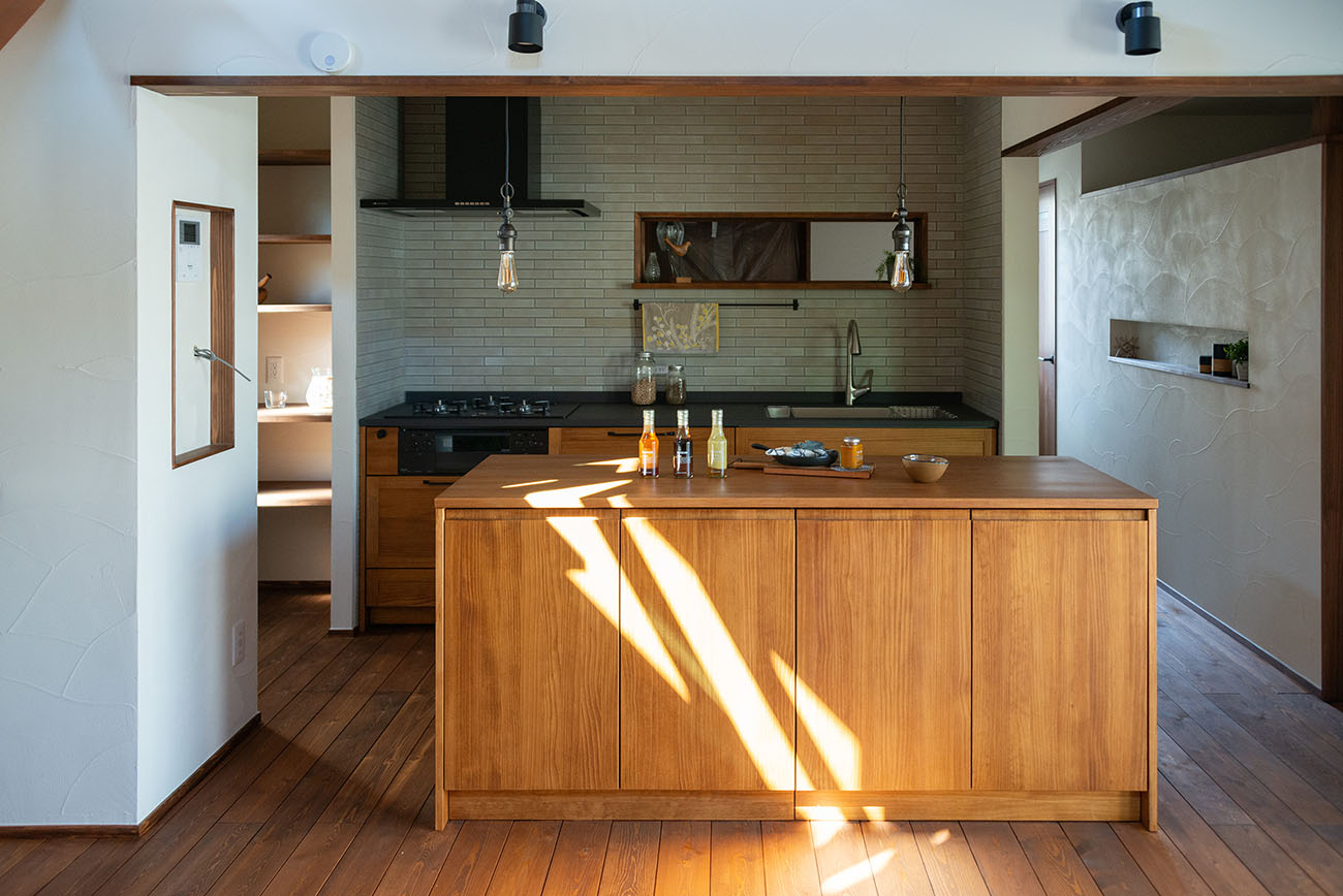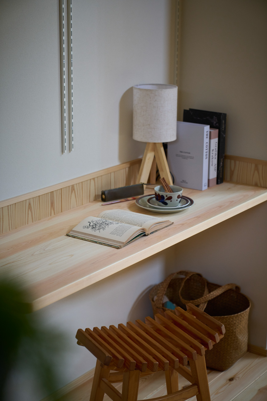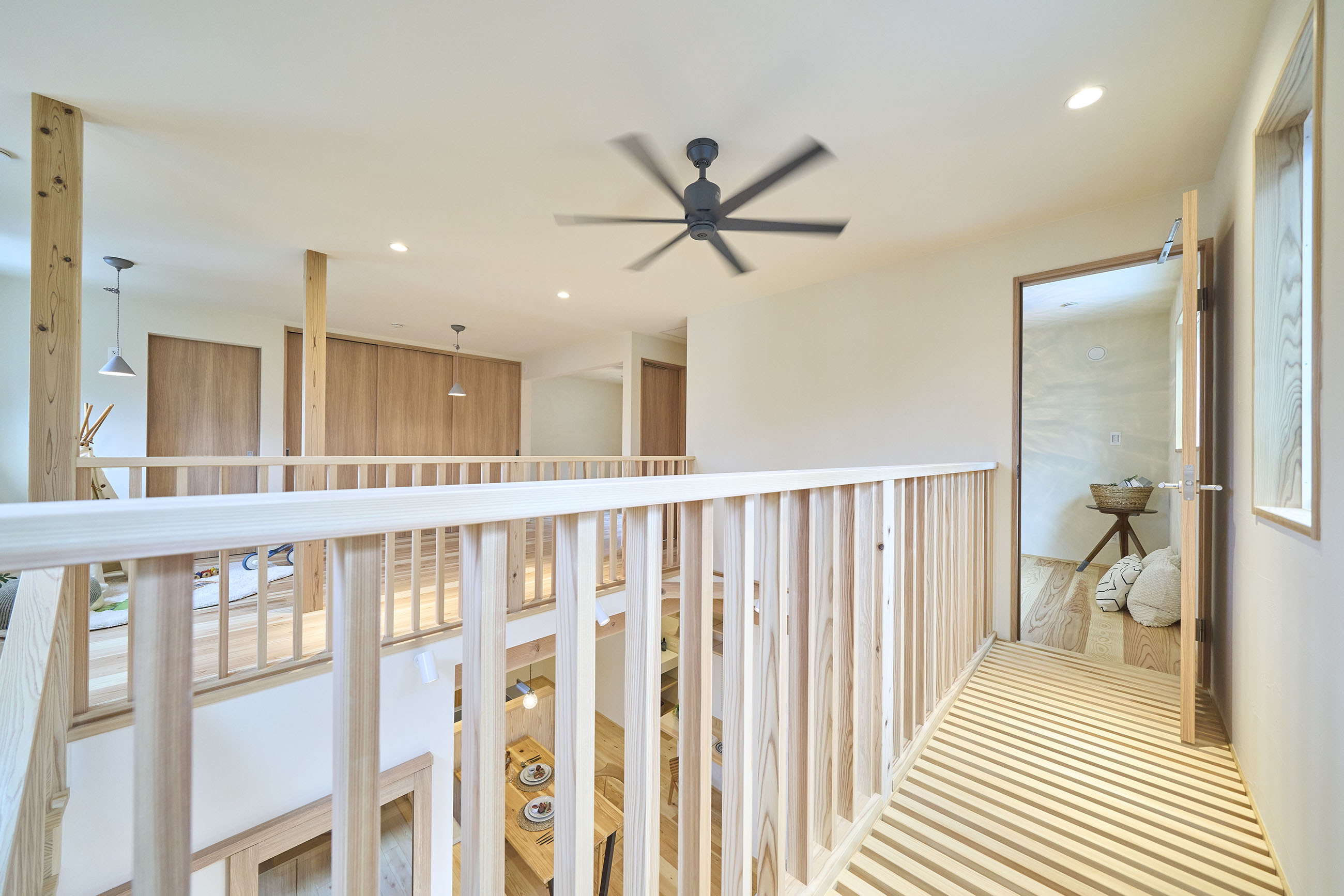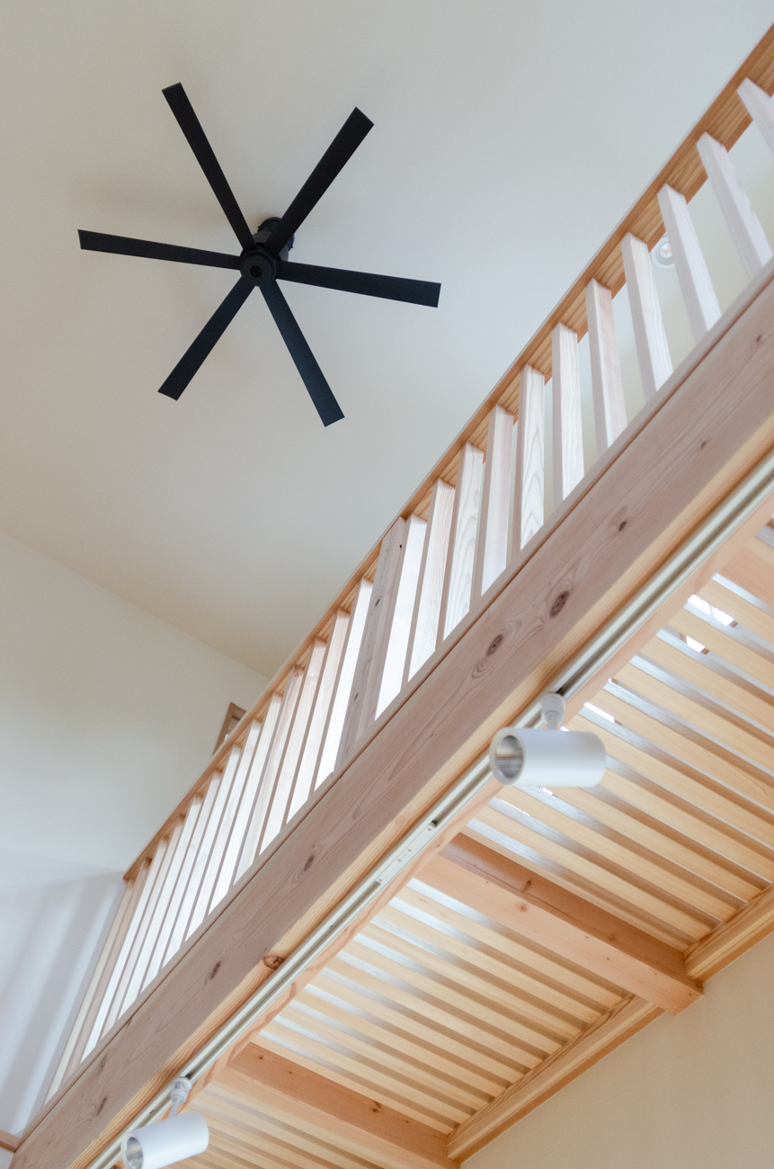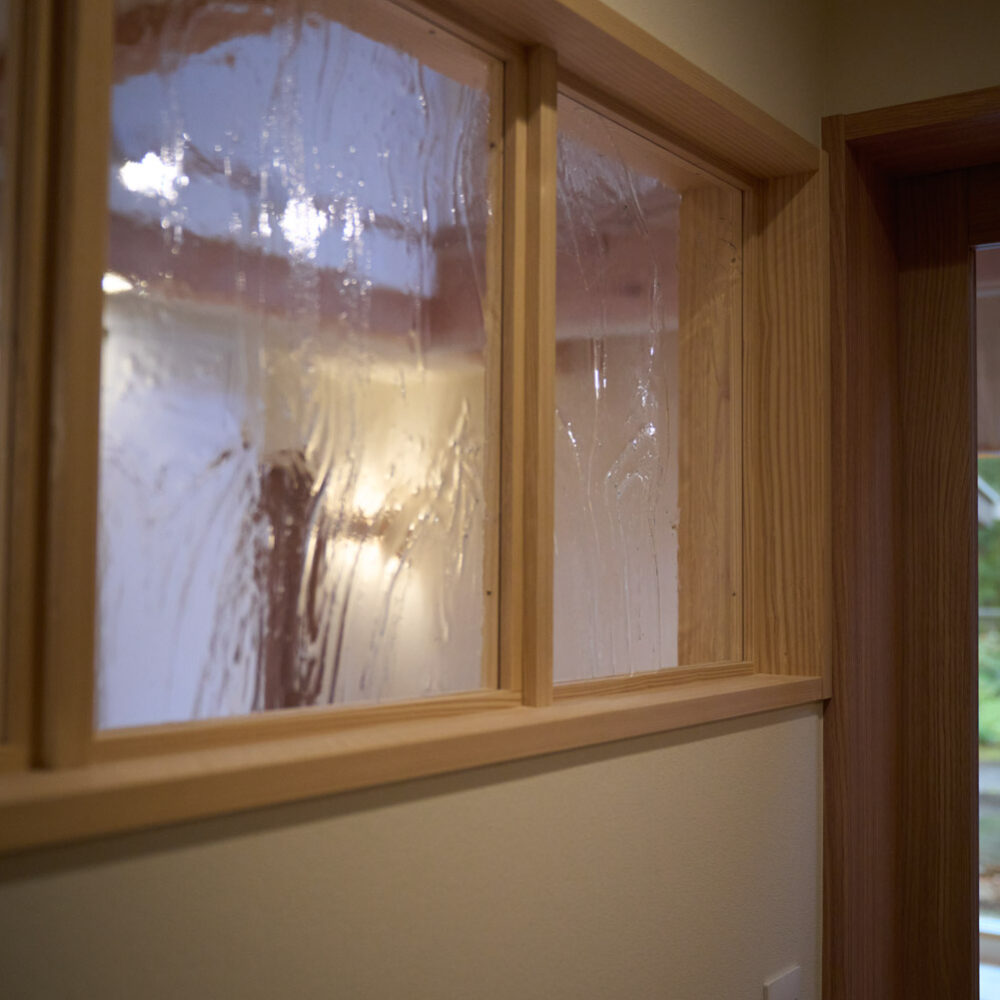 豊かな借景を望む大きなピクチャーウィンドウ。気配をつなぐ吹き抜けや仕切りをなくしたフリースペースといったおおらかな間取り。趣味を楽しんだり、住む人に丁度良く設えた多彩な造作家具たち。用途を分けて使い勝手の良い二箇所のワークスペース。 家族のつながりを大事にしながらもそれぞれのライフスタイルを尊重した家づくり。立地の良さも最大限活かし、居心地の良さと暮らしやすさを両立したお住まいです。 多彩な造作家具と ピクチャーウィンドウ リビングの主役となるのは豊かな風景を切り取る大きなピクチャーウィンドウ。リビングのあらゆるところから借景を楽しむことができます。また、多彩な造作家具を採用。下部収納のあるリビングベンチ・洗面化粧台・ダイニングベンチ・ワークスペースなど、自分たちサイズにオーダーしたこだわりの家具が散りばめられています。キッチンは無垢との相性も良いマニッシュなオールステンレスキッチンを採用。キッチン横には独立した小さな書斎を設け、趣味に読書に没頭できる場所も作りました。 洗面家事室/家族のサイズに合わせた広々洗面台 洗面室には広々と家事スペースを取った大きな洗面家事台を造作。洗濯物を畳んだり、アイロンをかけたりと大活躍。ガス乾燥機を設置予定のため、洗濯に関する家事はこのスペースで全て完了できます。乾燥機にかけられないものは家事室から直接出られる広々ウッドデッキへ。雨風の強い日は室内干しも可能です。 玄関/2方向動線や彩光など工夫がたくさん 玄関を開けるとまず目に入るのが室内窓。アルトドイッチェガラスをはめ込んだ室内窓と大きなガラスのリビングドアを設置。暗くなりがちな玄関も彩光が取れる工夫です。趣味の釣り道具をディスプレイするための棚や、竿を掛けて保管するための美しい上小の杉の無垢パネリングウォールがあります。リビング側とキッチンがわそれぞれに移動できる二つの動線も暮らしやすさの工夫です。 2F 吹き抜けでつながるフリースペース 階段を上がると広々とした大空間が迎えてくれます。将来的に二つの個室へと可変できるフリースペースはお子様が小さいうちは遊び場やファミリースペースとして大活躍。吹き抜けで上下階が大きく繋がっているので開放感と共にどこにいても家族の気配を伝えてくれます。吹き抜け上部に寝室とつながるキャットウォーク設置。彩光を取りつつ、窓のお掃除にも活躍します。