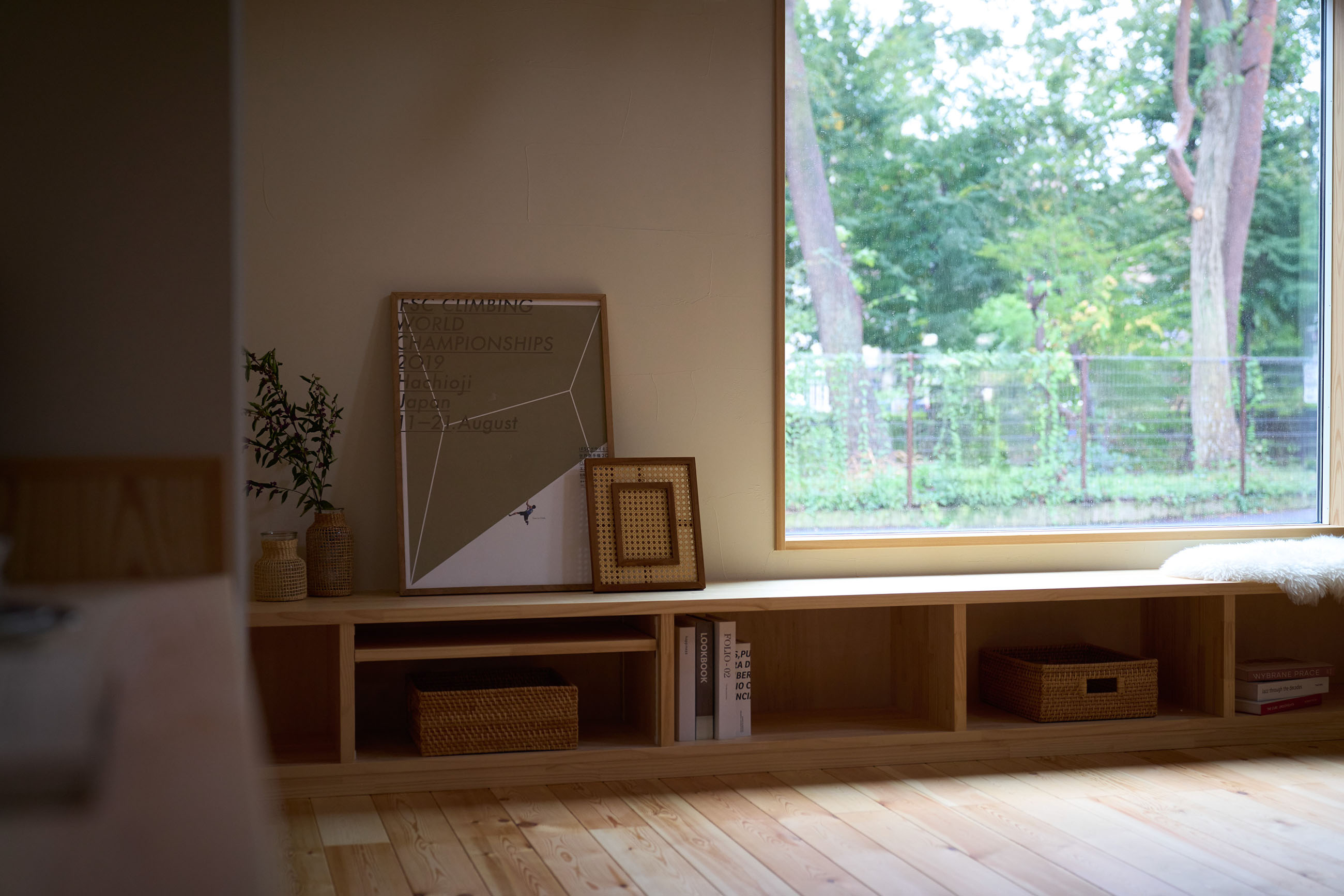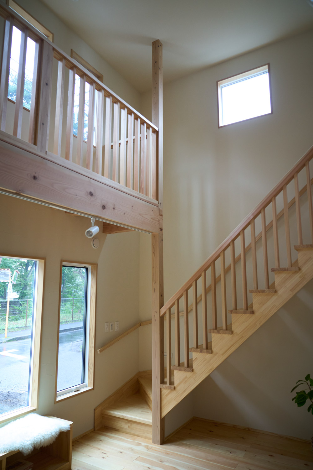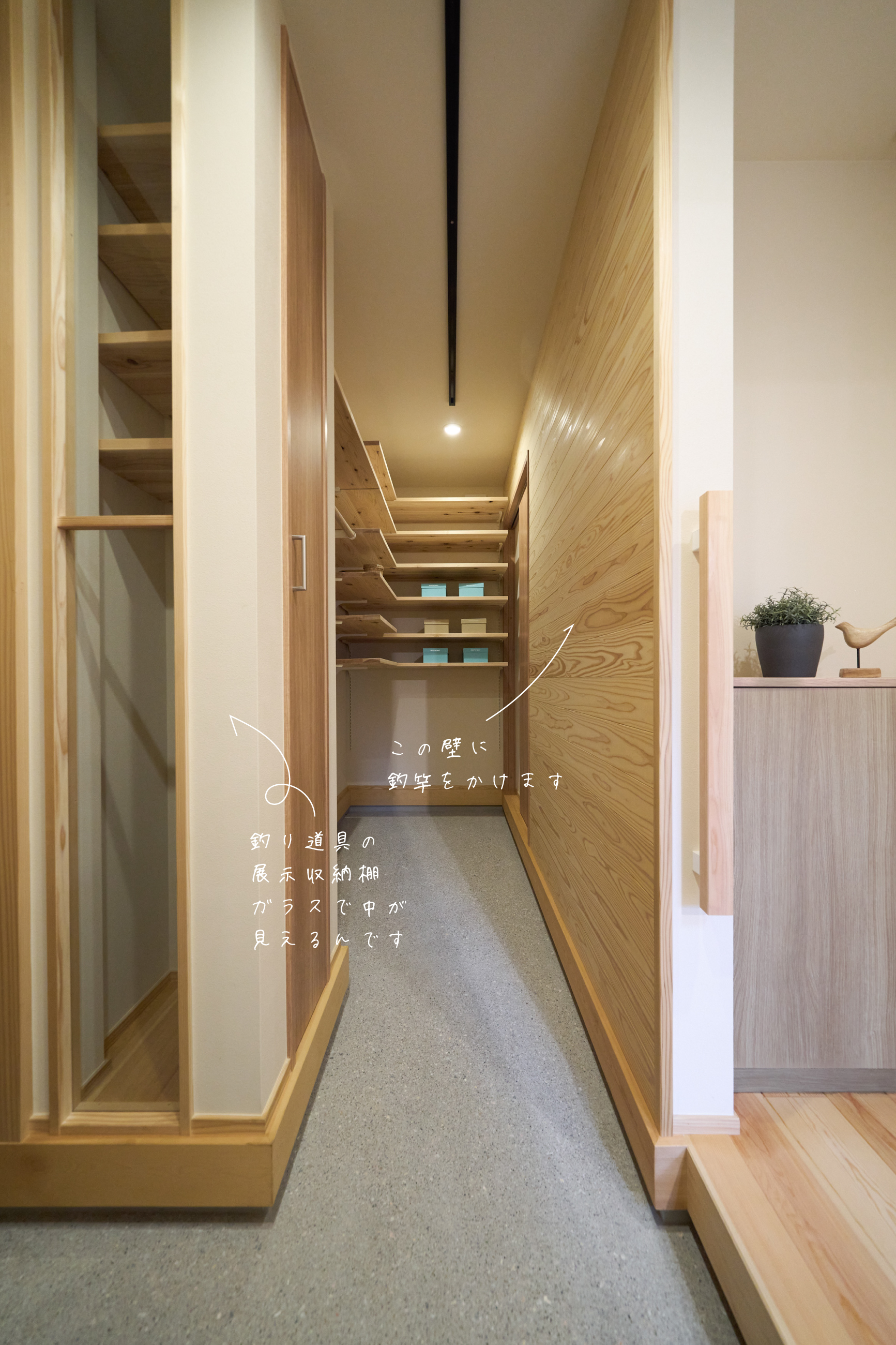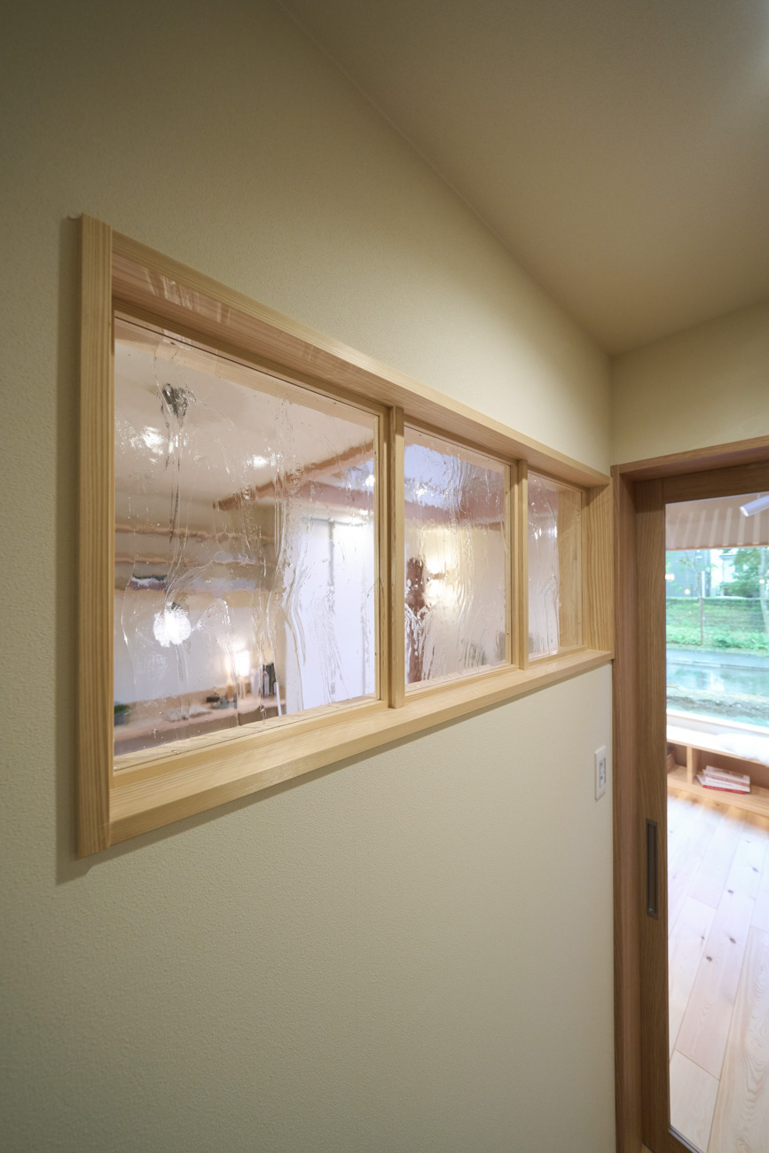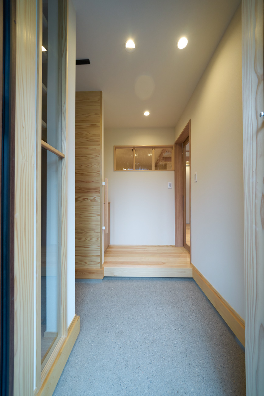 豊かな借景を望む大きなピクチャーウィンドウ。気配をつなぐ吹き抜けや仕切りをなくしたフリースペースといったおおらかな間取り。趣味を楽しんだり、住む人に丁度良く設えた多彩な造作家具たち。用途を分けて使い勝手の良い二箇所のワークスペース。 家族のつながりを大事にしながらもそれぞれのライフスタイルを尊重した家づくり。立地の良さも最大限活かし、居心地の良さと暮らしやすさを両立したお住まいです。 多彩な造作家具と ピクチャーウィンドウ リビングの主役となるのは豊かな風景を切り取る大きなピクチャーウィンドウ。リビングのあらゆるところから借景を楽しむことができます。また、多彩な造作家具を採用。下部収納のあるリビングベンチ・洗面化粧台・ダイニングベンチ・ワークスペースなど、自分たちサイズにオーダーしたこだわりの家具が散りばめられています。キッチンは無垢との相性も良いマニッシュなオールステンレスキッチンを採用。キッチン横には独立した小さな書斎を設け、趣味に読書に没頭できる場所も作りました。 洗面家事室/家族のサイズに合わせた広々洗面台 洗面室には広々と家事スペースを取った大きな洗面家事台を造作。洗濯物を畳んだり、アイロンをかけたりと大活躍。ガス乾燥機を設置予定のため、洗濯に関する家事はこのスペースで全て完了できます。乾燥機にかけられないものは家事室から直接出られる広々ウッドデッキへ。雨風の強い日は室内干しも可能です。 玄関/2方向動線や彩光など工夫がたくさん 玄関を開けるとまず目に入るのが室内窓。アルトドイッチェガラスをはめ込んだ室内窓と大きなガラスのリビングドアを設置。暗くなりがちな玄関も彩光が取れる工夫です。趣味の釣り道具をディスプレイするための棚や、竿を掛けて保管するための美しい上小の杉の無垢パネリングウォールがあります。リビング側とキッチンがわそれぞれに移動できる二つの動線も暮らしやすさの工夫です。 2F 吹き抜けでつながるフリースペース 階段を上がると広々とした大空間が迎えてくれます。将来的に二つの個室へと可変できるフリースペースはお子様が小さいうちは遊び場やファミリースペースとして大活躍。吹き抜けで上下階が大きく繋がっているので開放感と共にどこにいても家族の気配を伝えてくれます。吹き抜け上部に寝室とつながるキャットウォーク設置。彩光を取りつつ、窓のお掃除にも活躍します。