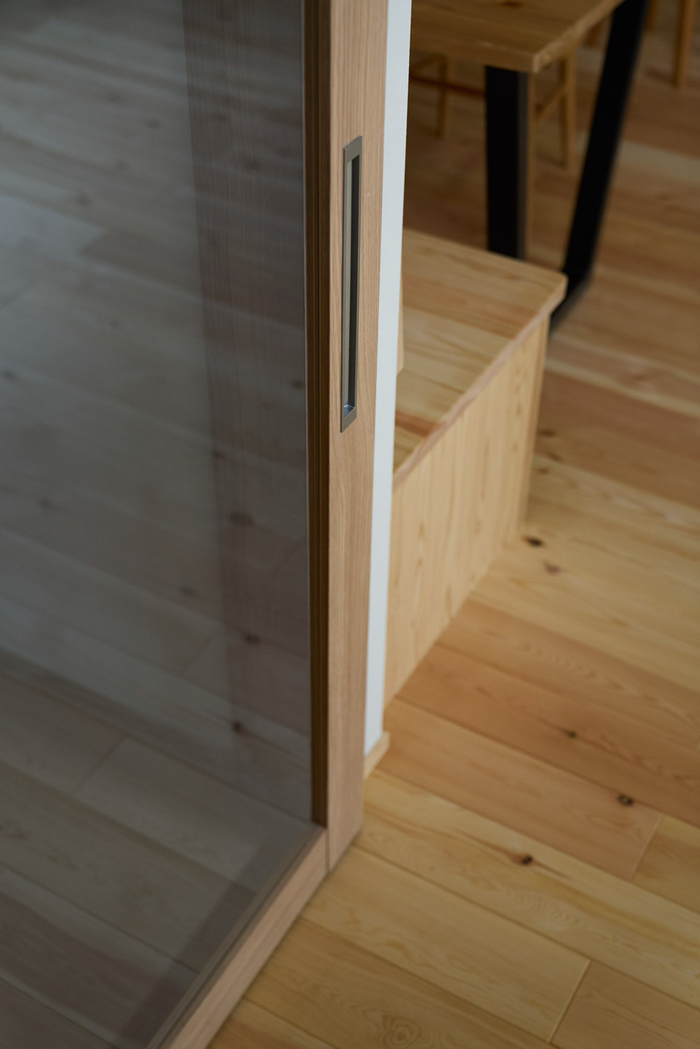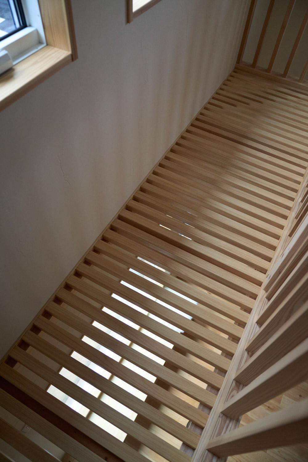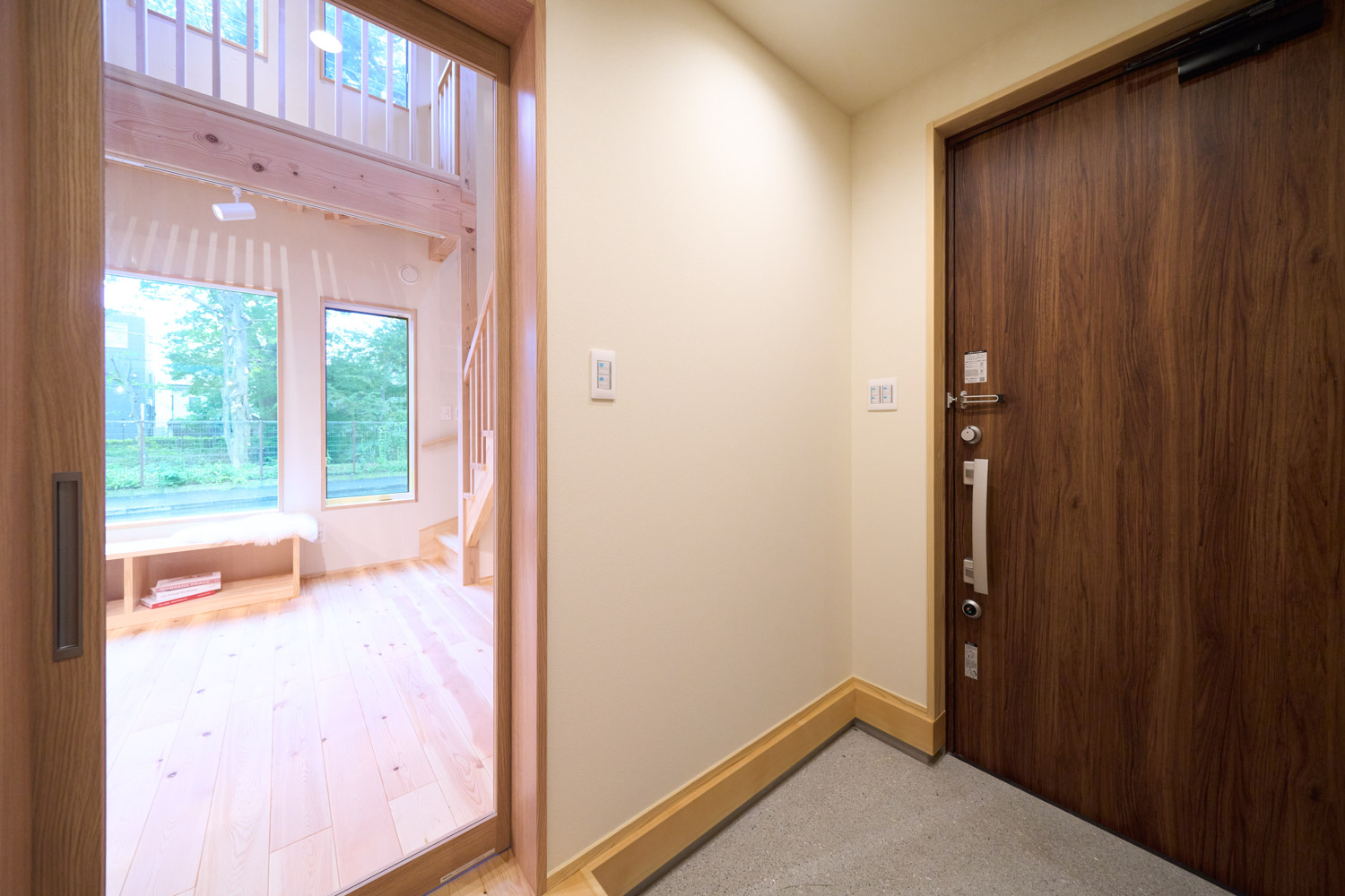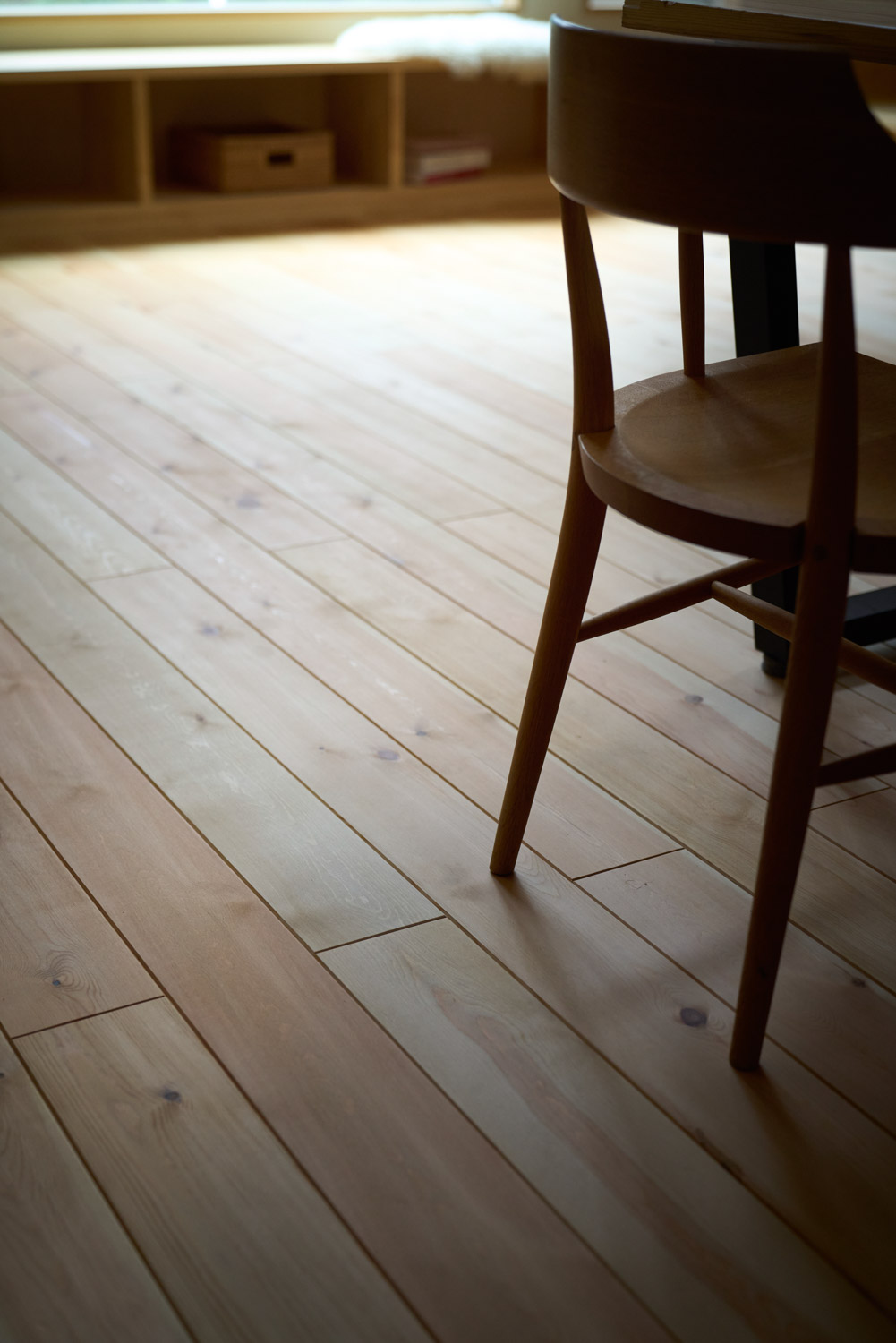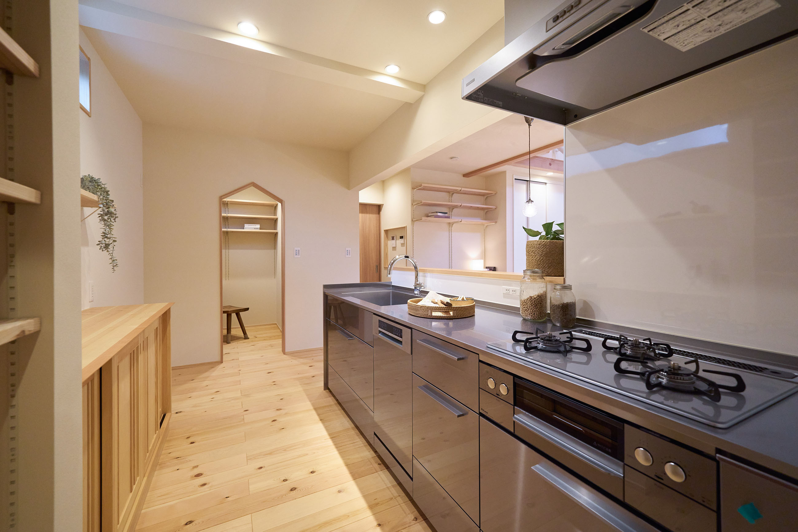 豊かな借景を望む大きなピクチャーウィンドウ。気配をつなぐ吹き抜けや仕切りをなくしたフリースペースといったおおらかな間取り。趣味を楽しんだり、住む人に丁度良く設えた多彩な造作家具たち。用途を分けて使い勝手の良い二箇所のワークスペース。 家族のつながりを大事にしながらもそれぞれのライフスタイルを尊重した家づくり。立地の良さも最大限活かし、居心地の良さと暮らしやすさを両立したお住まいです。 多彩な造作家具と ピクチャーウィンドウ リビングの主役となるのは豊かな風景を切り取る大きなピクチャーウィンドウ。リビングのあらゆるところから借景を楽しむことができます。また、多彩な造作家具を採用。下部収納のあるリビングベンチ・洗面化粧台・ダイニングベンチ・ワークスペースなど、自分たちサイズにオーダーしたこだわりの家具が散りばめられています。キッチンは無垢との相性も良いマニッシュなオールステンレスキッチンを採用。キッチン横には独立した小さな書斎を設け、趣味に読書に没頭できる場所も作りました。 洗面家事室/家族のサイズに合わせた広々洗面台 洗面室には広々と家事スペースを取った大きな洗面家事台を造作。洗濯物を畳んだり、アイロンをかけたりと大活躍。ガス乾燥機を設置予定のため、洗濯に関する家事はこのスペースで全て完了できます。乾燥機にかけられないものは家事室から直接出られる広々ウッドデッキへ。雨風の強い日は室内干しも可能です。 玄関/2方向動線や彩光など工夫がたくさん 玄関を開けるとまず目に入るのが室内窓。アルトドイッチェガラスをはめ込んだ室内窓と大きなガラスのリビングドアを設置。暗くなりがちな玄関も彩光が取れる工夫です。趣味の釣り道具をディスプレイするための棚や、竿を掛けて保管するための美しい上小の杉の無垢パネリングウォールがあります。リビング側とキッチンがわそれぞれに移動できる二つの動線も暮らしやすさの工夫です。 2F 吹き抜けでつながるフリースペース 階段を上がると広々とした大空間が迎えてくれます。将来的に二つの個室へと可変できるフリースペースはお子様が小さいうちは遊び場やファミリースペースとして大活躍。吹き抜けで上下階が大きく繋がっているので開放感と共にどこにいても家族の気配を伝えてくれます。吹き抜け上部に寝室とつながるキャットウォーク設置。彩光を取りつつ、窓のお掃除にも活躍します。