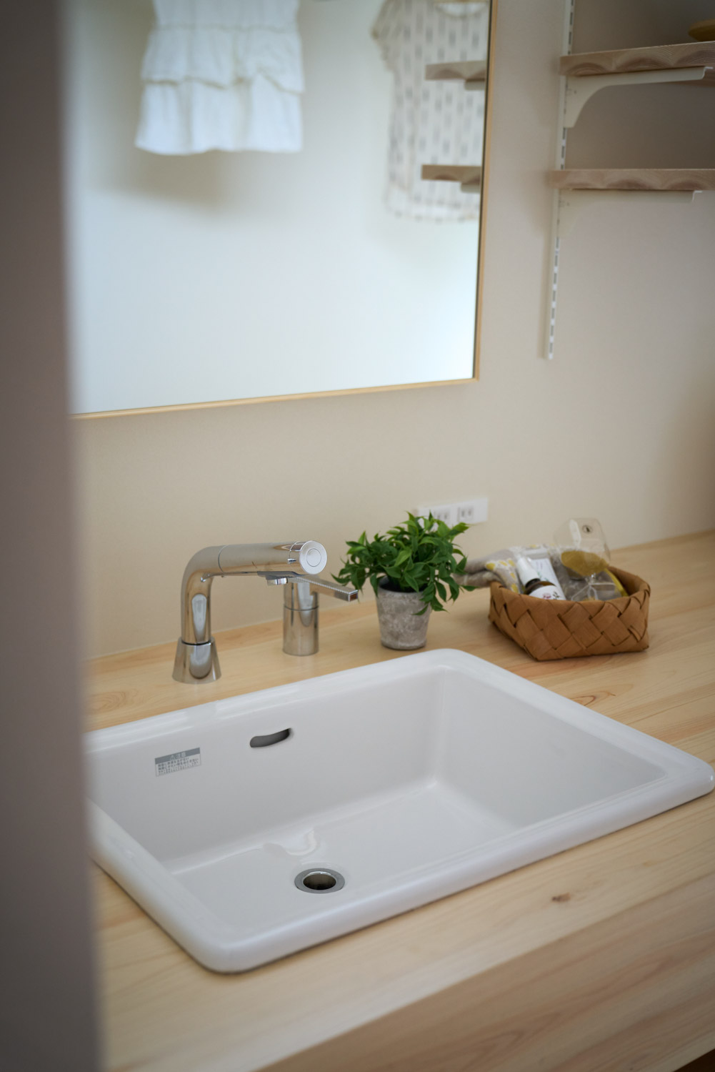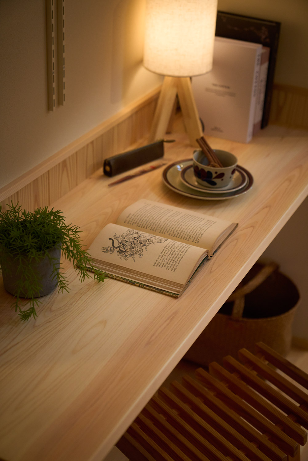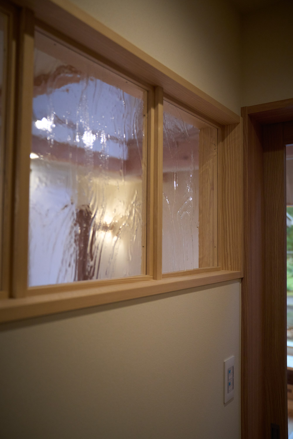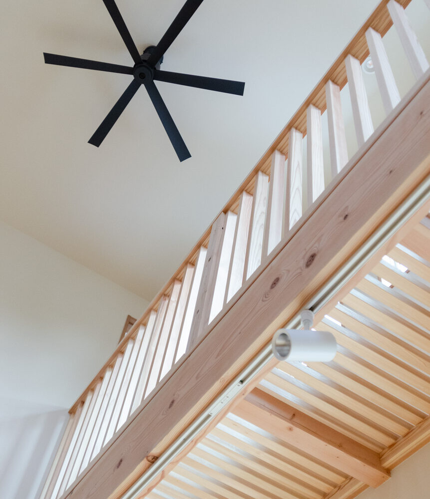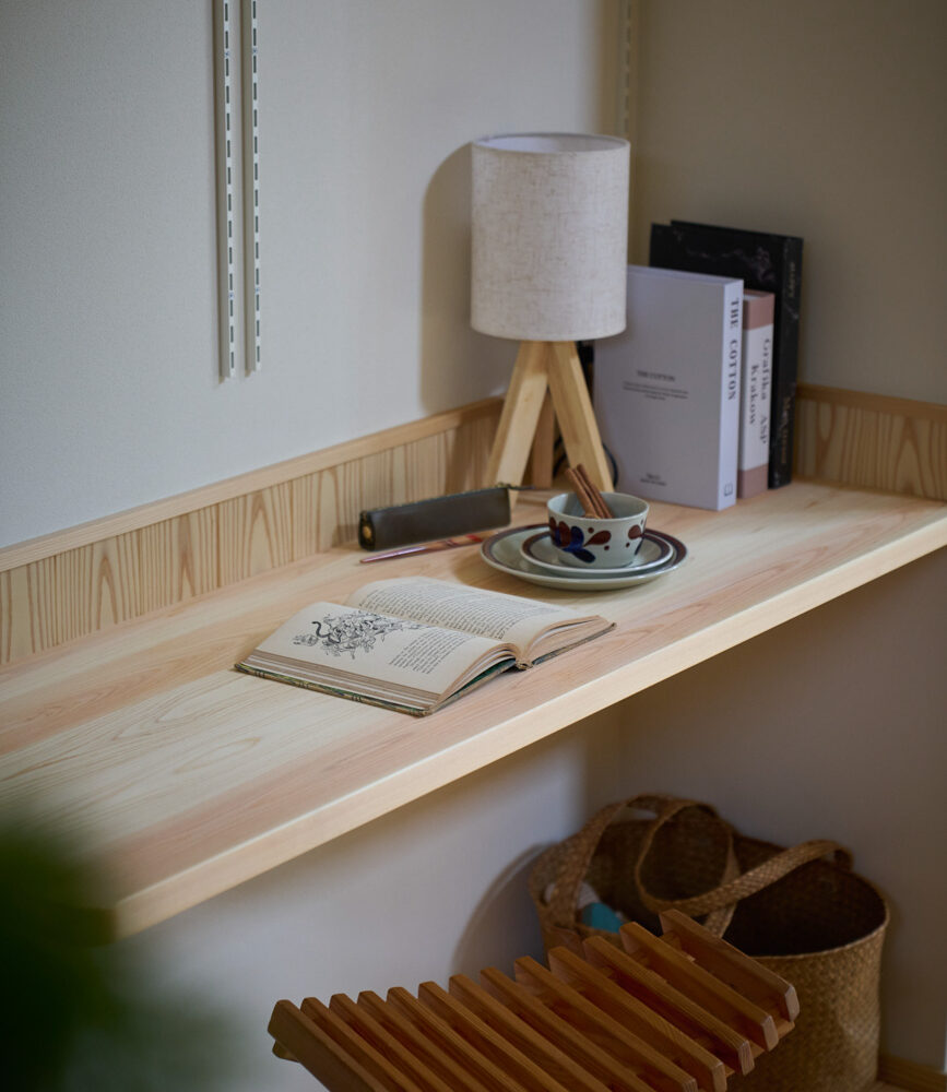 豊かな借景を望む大きなピクチャーウィンドウ。気配をつなぐ吹き抜けや仕切りをなくしたフリースペースといったおおらかな間取り。趣味を楽しんだり、住む人に丁度良く設えた多彩な造作家具たち。用途を分けて使い勝手の良い二箇所のワークスペース。 家族のつながりを大事にしながらもそれぞれのライフスタイルを尊重した家づくり。立地の良さも最大限活かし、居心地の良さと暮らしやすさを両立したお住まいです。 多彩な造作家具と ピクチャーウィンドウ リビングの主役となるのは豊かな風景を切り取る大きなピクチャーウィンドウ。リビングのあらゆるところから借景を楽しむことができます。また、多彩な造作家具を採用。下部収納のあるリビングベンチ・洗面化粧台・ダイニングベンチ・ワークスペースなど、自分たちサイズにオーダーしたこだわりの家具が散りばめられています。キッチンは無垢との相性も良いマニッシュなオールステンレスキッチンを採用。キッチン横には独立した小さな書斎を設け、趣味に読書に没頭できる場所も作りました。 洗面家事室/家族のサイズに合わせた広々洗面台 洗面室には広々と家事スペースを取った大きな洗面家事台を造作。洗濯物を畳んだり、アイロンをかけたりと大活躍。ガス乾燥機を設置予定のため、洗濯に関する家事はこのスペースで全て完了できます。乾燥機にかけられないものは家事室から直接出られる広々ウッドデッキへ。雨風の強い日は室内干しも可能です。 玄関/2方向動線や彩光など工夫がたくさん 玄関を開けるとまず目に入るのが室内窓。アルトドイッチェガラスをはめ込んだ室内窓と大きなガラスのリビングドアを設置。暗くなりがちな玄関も彩光が取れる工夫です。趣味の釣り道具をディスプレイするための棚や、竿を掛けて保管するための美しい上小の杉の無垢パネリングウォールがあります。リビング側とキッチンがわそれぞれに移動できる二つの動線も暮らしやすさの工夫です。 2F 吹き抜けでつながるフリースペース 階段を上がると広々とした大空間が迎えてくれます。将来的に二つの個室へと可変できるフリースペースはお子様が小さいうちは遊び場やファミリースペースとして大活躍。吹き抜けで上下階が大きく繋がっているので開放感と共にどこにいても家族の気配を伝えてくれます。吹き抜け上部に寝室とつながるキャットウォーク設置。彩光を取りつつ、窓のお掃除にも活躍します。