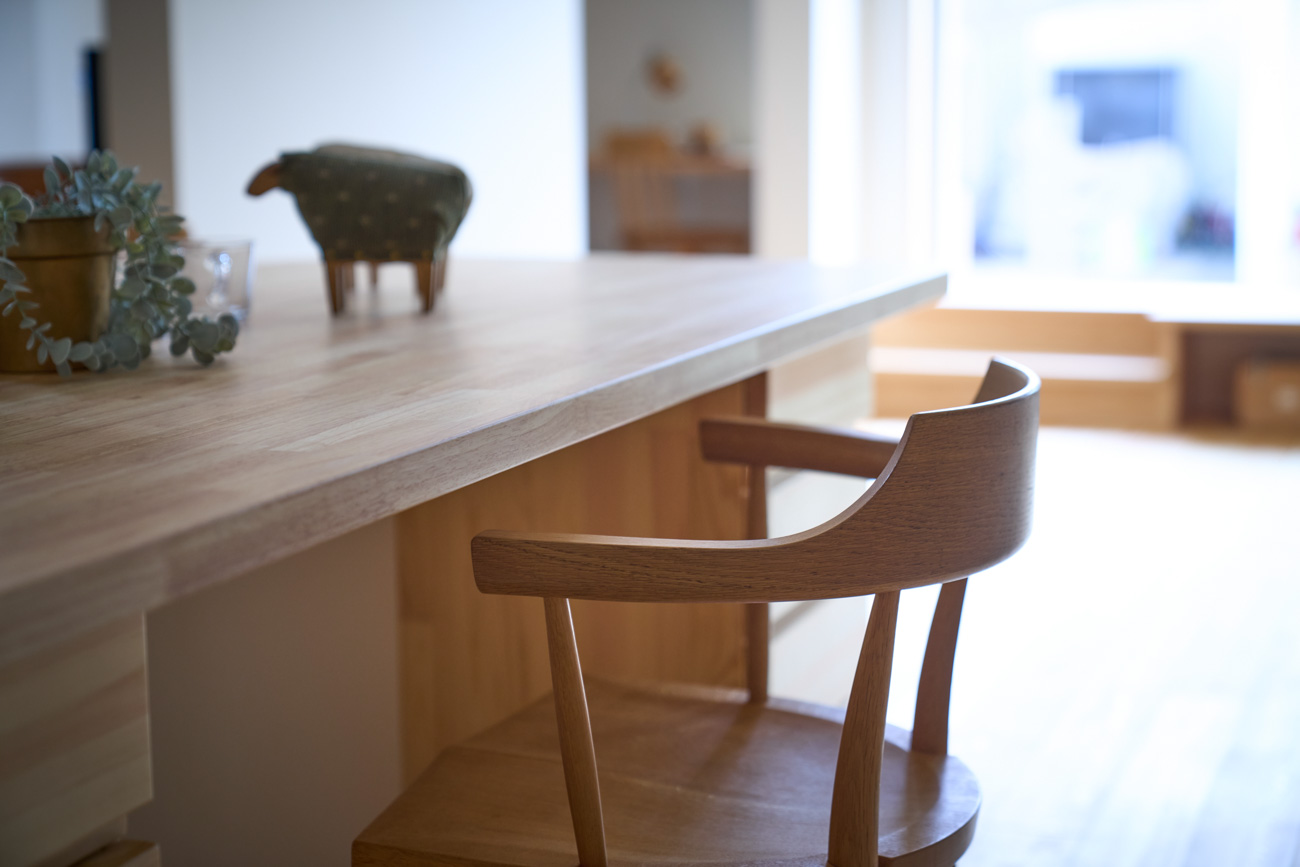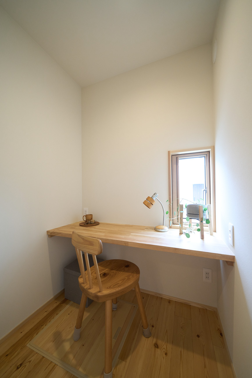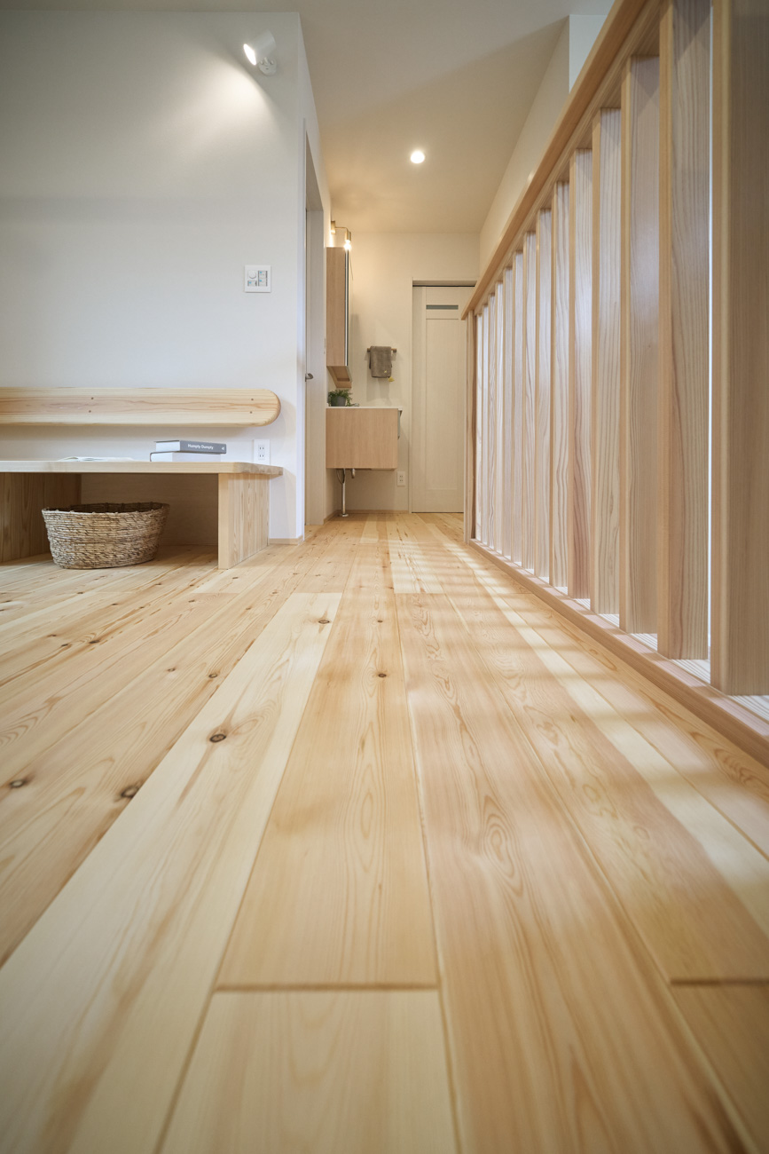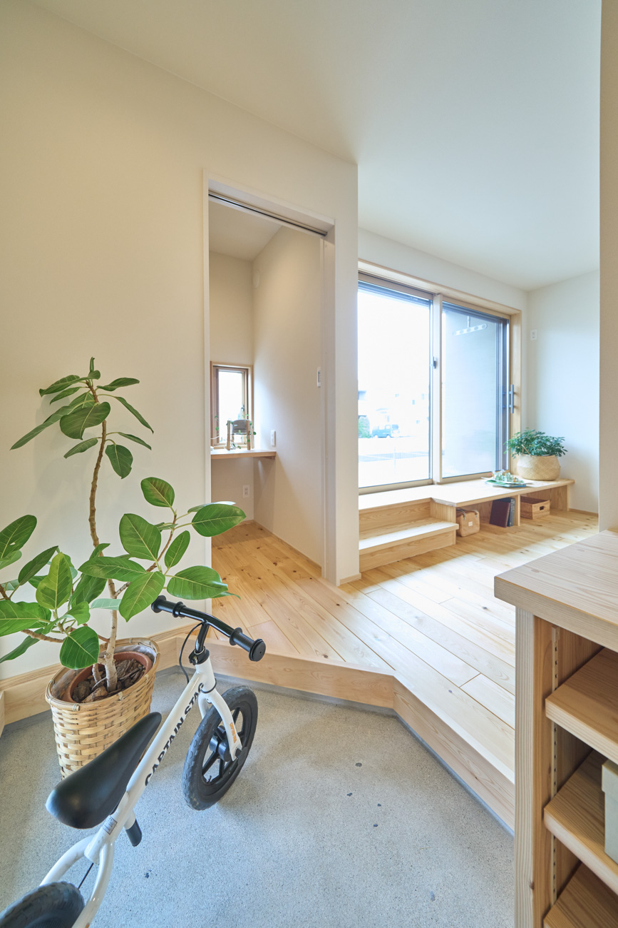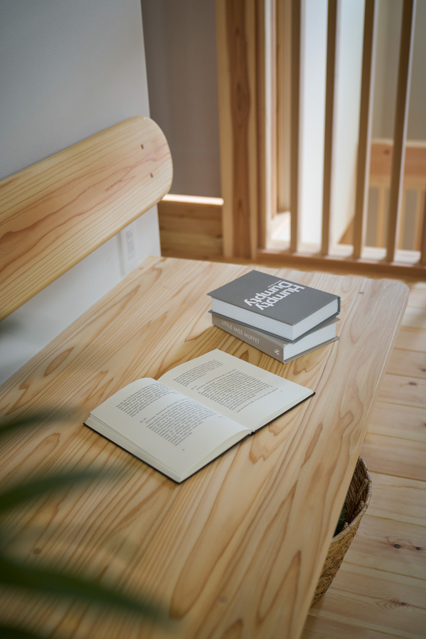 暮らしの変化もあり、お土地とのご縁を待つ間、多くの見学会にご参加いただいた建主様。OB様たちのアイデアをたくさん参考にされ、シムラでの家づくりを楽しみつくしたと言っても過言ではありません。 公私を分けた二つのリビング3方向動線の土間ワークスペースや適材適所の収納・・・。 多彩な設備を採用し、かつ上手に配置することで、広さや奥行きを感じられる空間設計。理想をカタチにし、人が集まる温かな住まいです。 1F 巧みな動線と設備の配置 来客も多いという建主様。1階は人の出入りも想定したリビングを設置。ちょっと篭れる書斎やリビングベンチ。ご同居のお母様の寝室にパントリーやクローゼット、階段下にはヌックと、たくさんの設備を設置しました。配置や奥行きの取り方が巧みで、キッチンとダイニングを中心にそれらが不思議と喧嘩せず、圧迫感なく配置されていてます。ひとつひとつこだわりを持って採用されているため、住む人も訪れる人も楽しくなるお住まいです。 2F 家族のリビングとそれぞれの部屋 2階は大きな本棚のあるファミリースペースを中心に各居室を配置。ワークスペースやベンチと造作の家具が光ります。たくさん人の居場所のあるお住まいです。