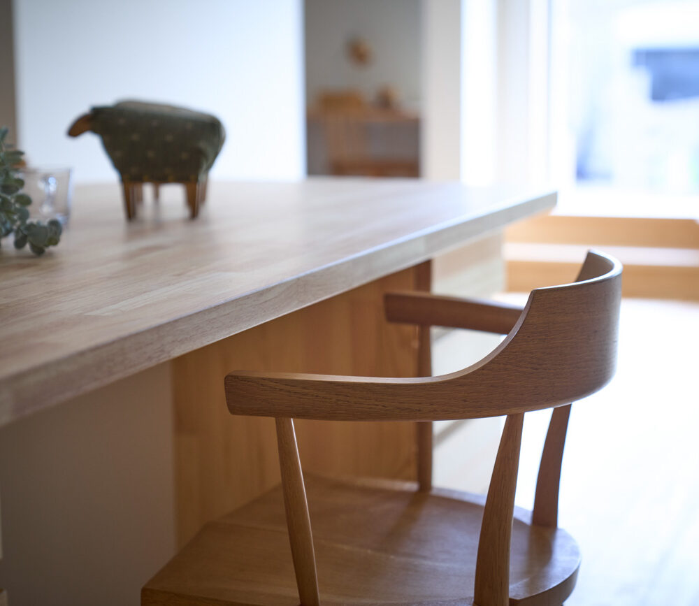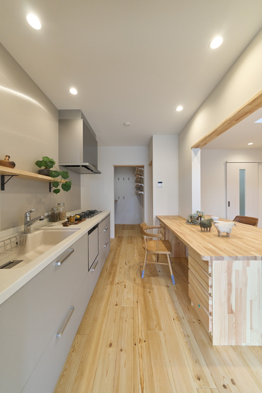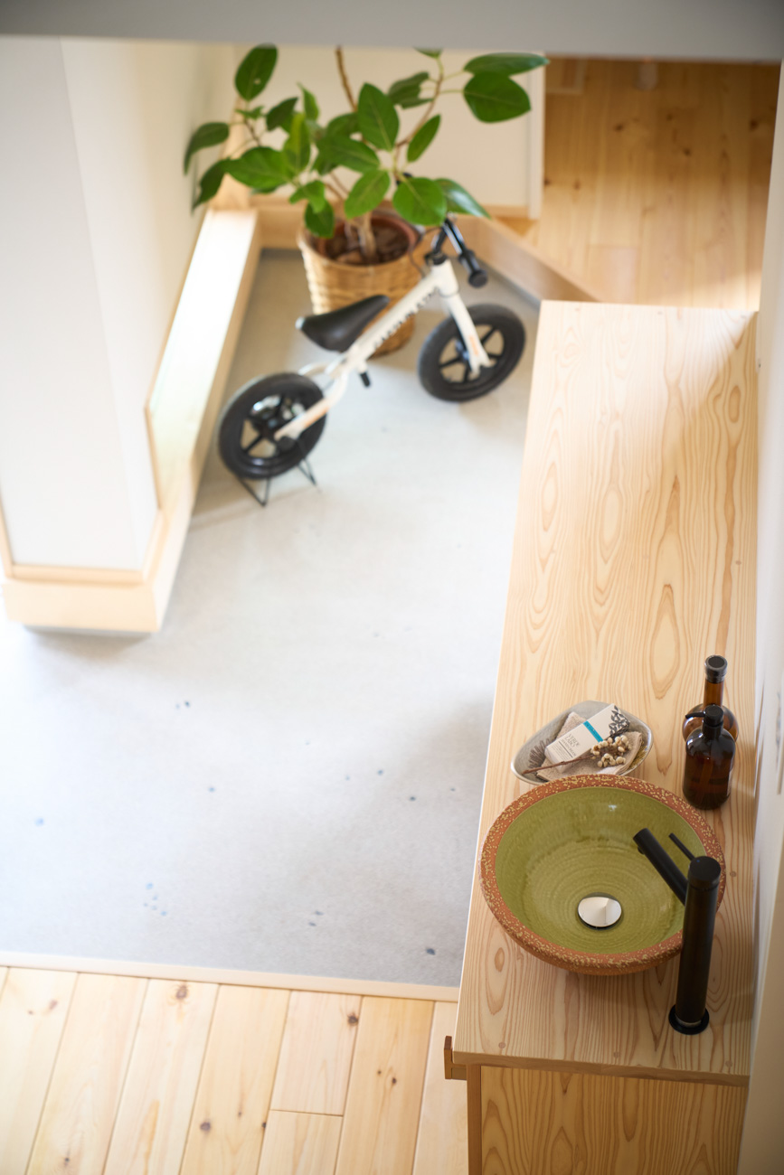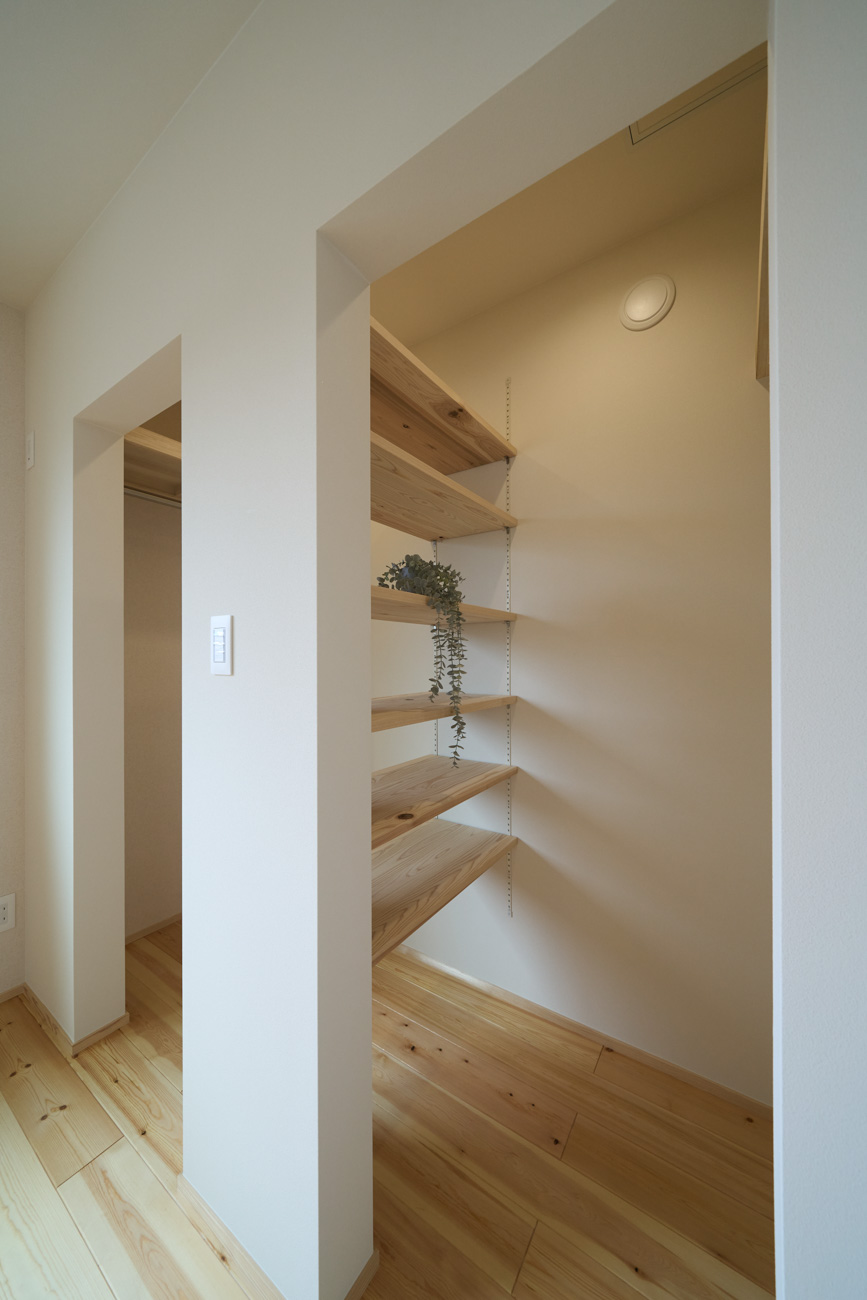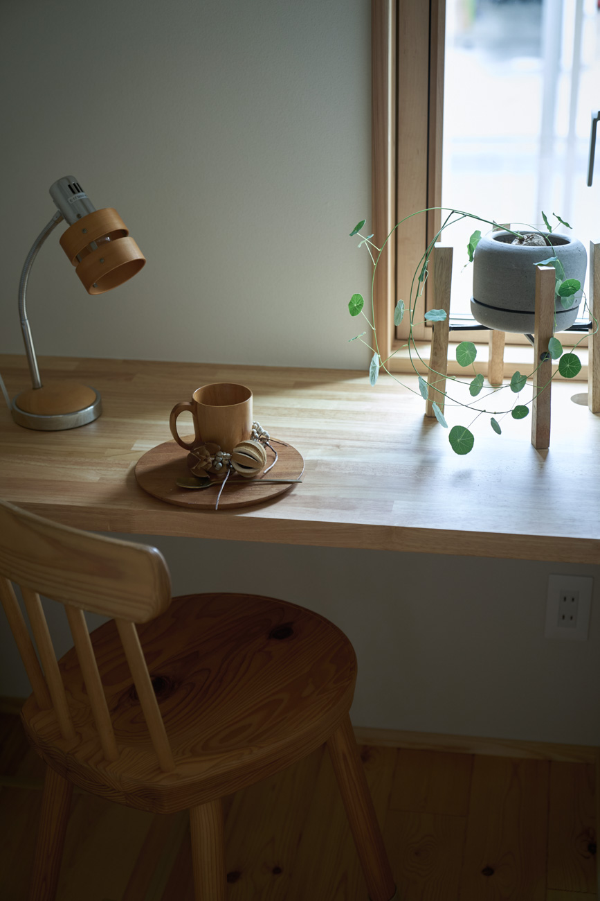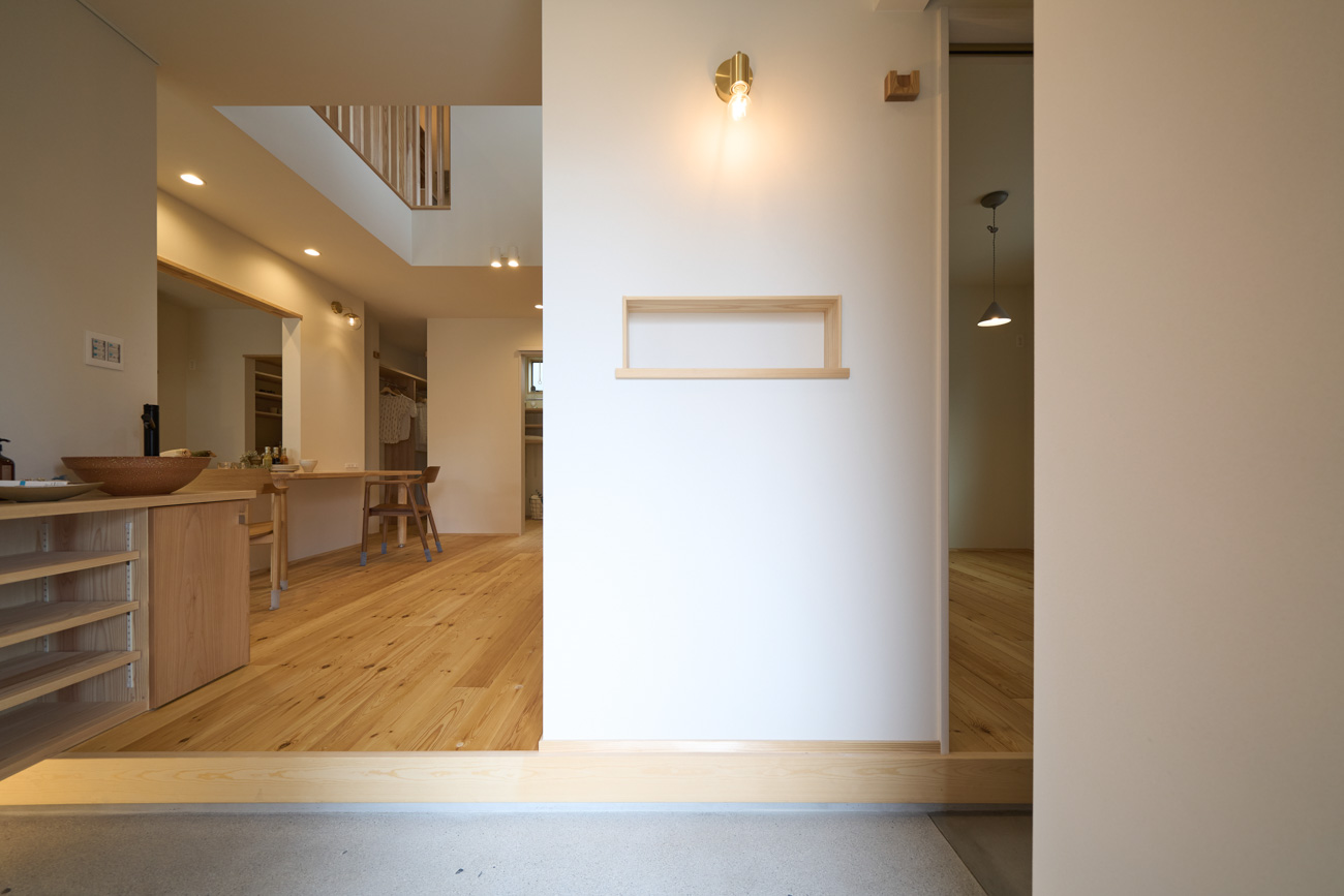 暮らしの変化もあり、お土地とのご縁を待つ間、多くの見学会にご参加いただいた建主様。OB様たちのアイデアをたくさん参考にされ、シムラでの家づくりを楽しみつくしたと言っても過言ではありません。 公私を分けた二つのリビング3方向動線の土間ワークスペースや適材適所の収納・・・。 多彩な設備を採用し、かつ上手に配置することで、広さや奥行きを感じられる空間設計。理想をカタチにし、人が集まる温かな住まいです。 1F 巧みな動線と設備の配置 来客も多いという建主様。1階は人の出入りも想定したリビングを設置。ちょっと篭れる書斎やリビングベンチ。ご同居のお母様の寝室にパントリーやクローゼット、階段下にはヌックと、たくさんの設備を設置しました。配置や奥行きの取り方が巧みで、キッチンとダイニングを中心にそれらが不思議と喧嘩せず、圧迫感なく配置されていてます。ひとつひとつこだわりを持って採用されているため、住む人も訪れる人も楽しくなるお住まいです。 2F 家族のリビングとそれぞれの部屋 2階は大きな本棚のあるファミリースペースを中心に各居室を配置。ワークスペースやベンチと造作の家具が光ります。たくさん人の居場所のあるお住まいです。