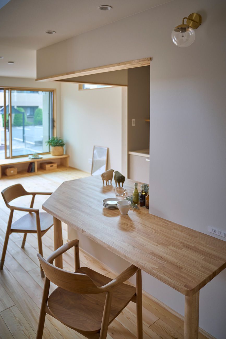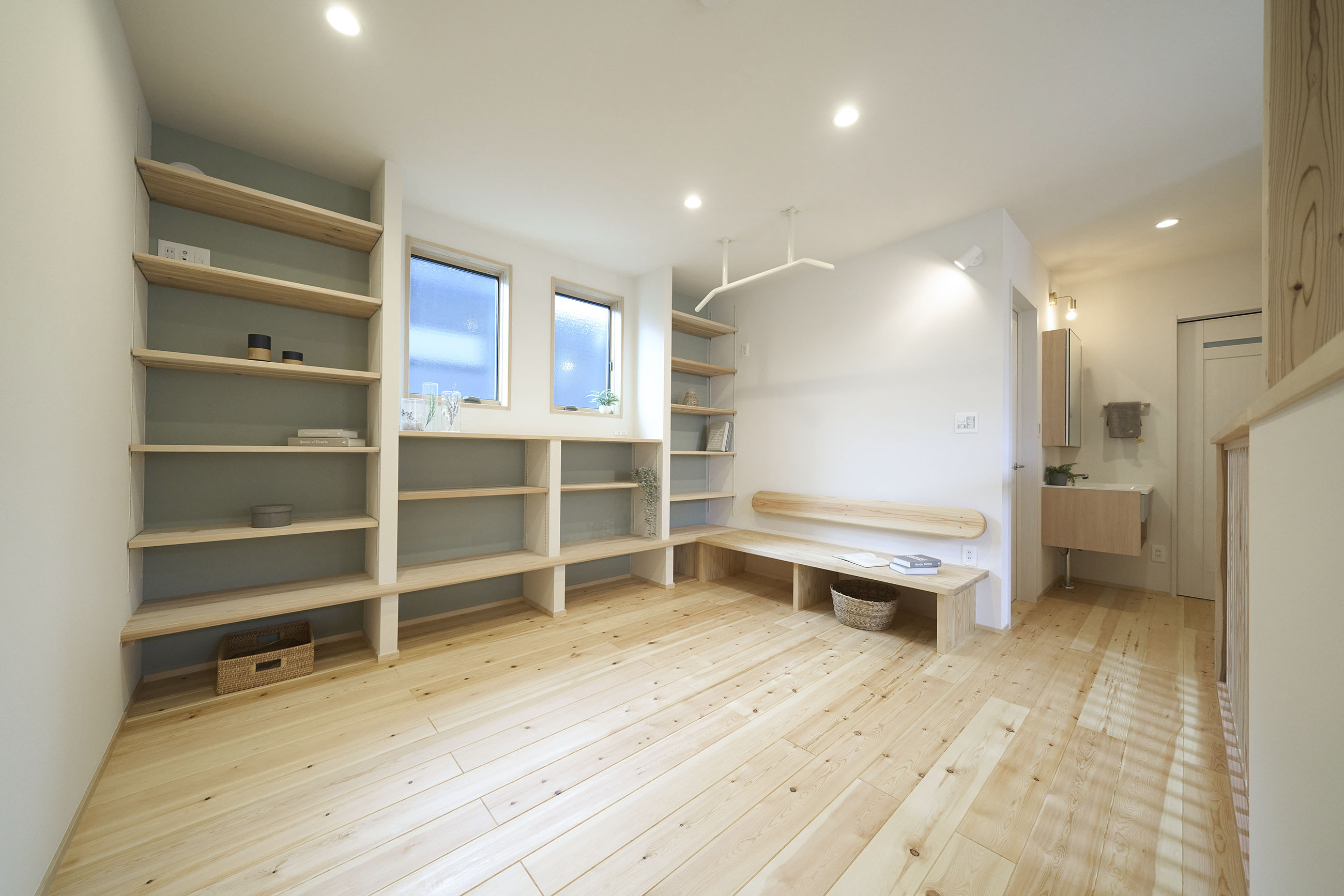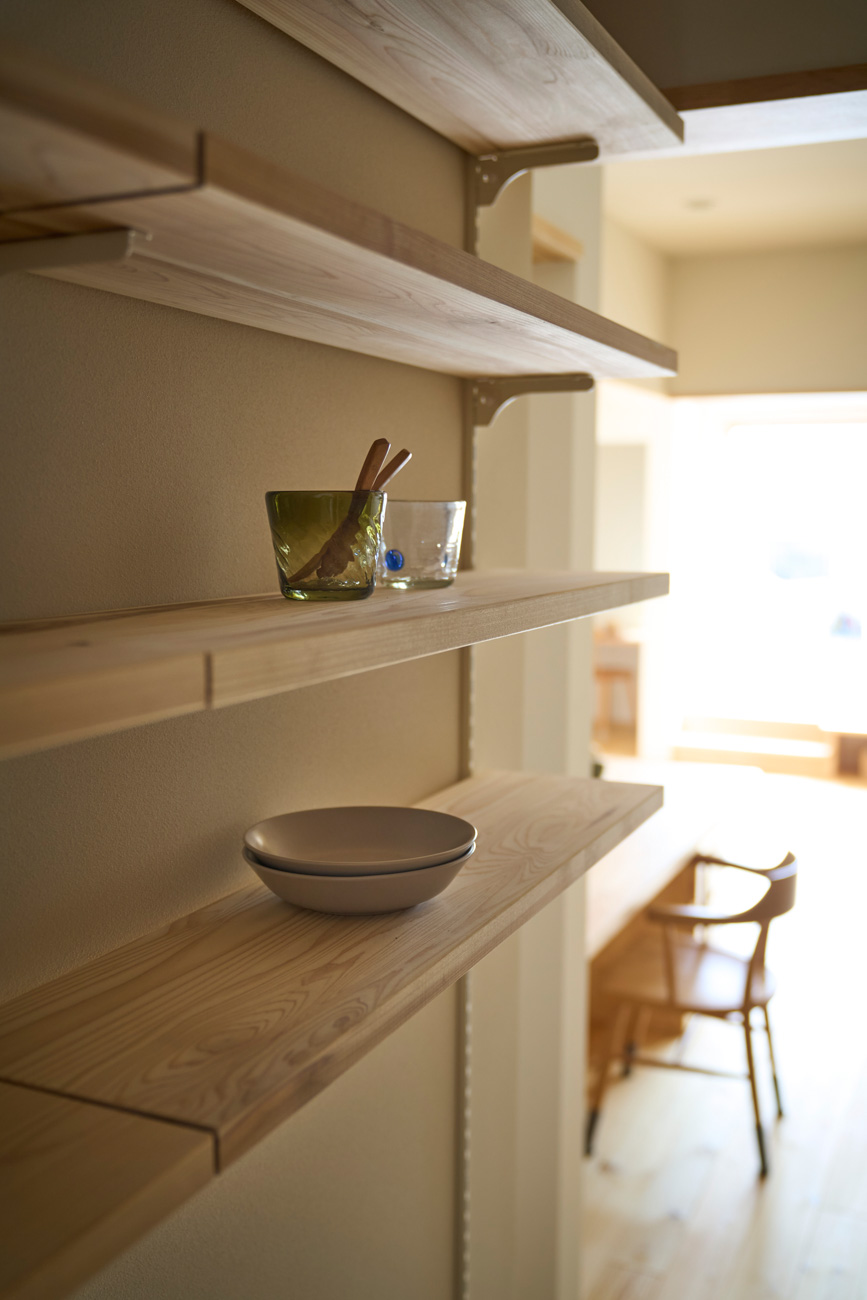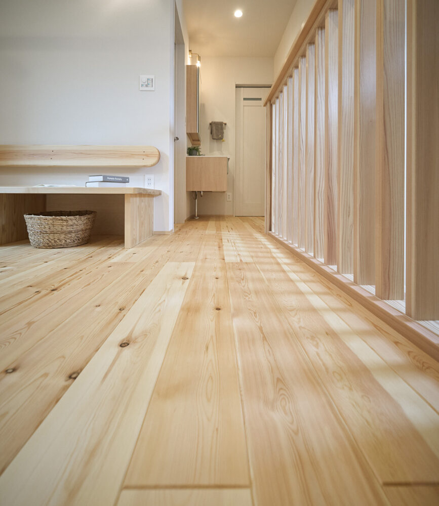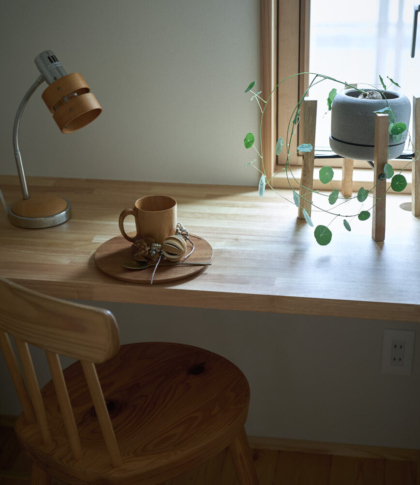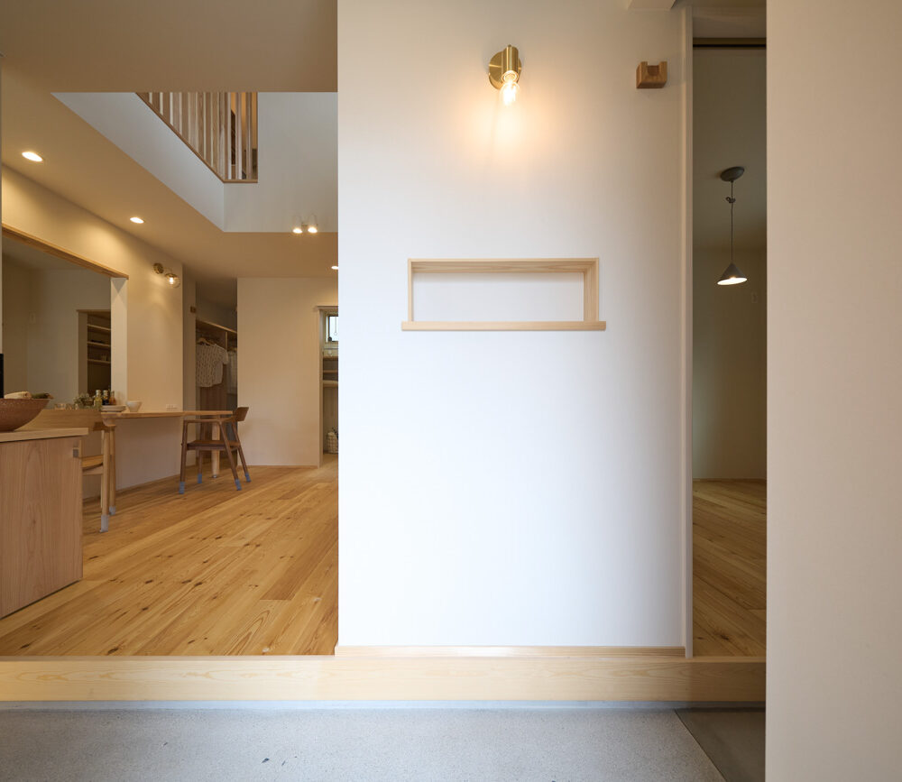 暮らしの変化もあり、お土地とのご縁を待つ間、多くの見学会にご参加いただいた建主様。OB様たちのアイデアをたくさん参考にされ、シムラでの家づくりを楽しみつくしたと言っても過言ではありません。 公私を分けた二つのリビング3方向動線の土間ワークスペースや適材適所の収納・・・。 多彩な設備を採用し、かつ上手に配置することで、広さや奥行きを感じられる空間設計。理想をカタチにし、人が集まる温かな住まいです。 1F 巧みな動線と設備の配置 来客も多いという建主様。1階は人の出入りも想定したリビングを設置。ちょっと篭れる書斎やリビングベンチ。ご同居のお母様の寝室にパントリーやクローゼット、階段下にはヌックと、たくさんの設備を設置しました。配置や奥行きの取り方が巧みで、キッチンとダイニングを中心にそれらが不思議と喧嘩せず、圧迫感なく配置されていてます。ひとつひとつこだわりを持って採用されているため、住む人も訪れる人も楽しくなるお住まいです。 2F 家族のリビングとそれぞれの部屋 2階は大きな本棚のあるファミリースペースを中心に各居室を配置。ワークスペースやベンチと造作の家具が光ります。たくさん人の居場所のあるお住まいです。