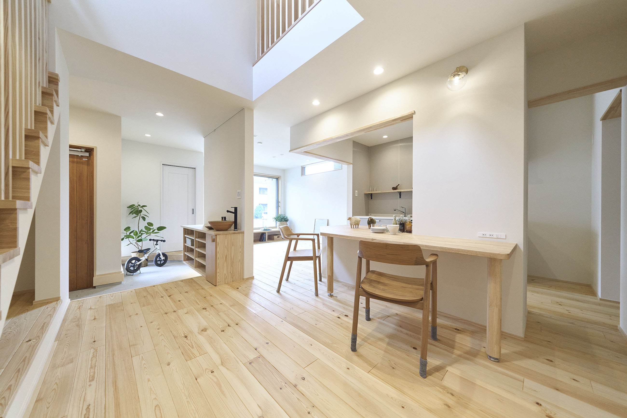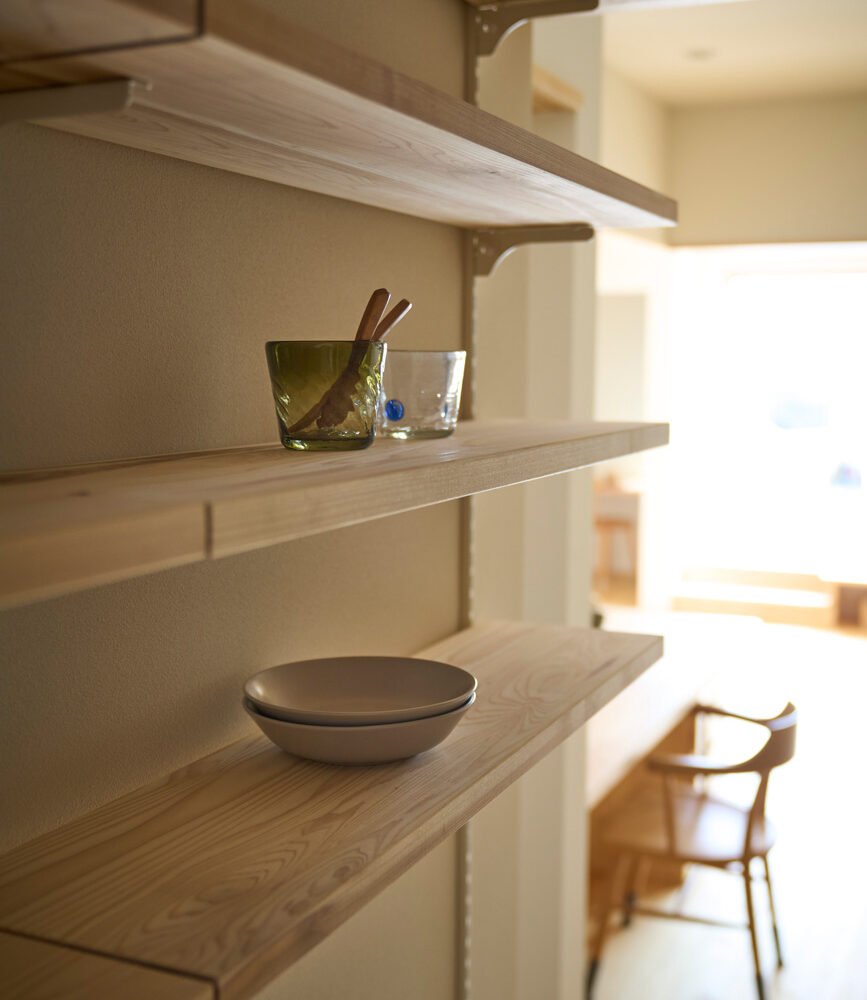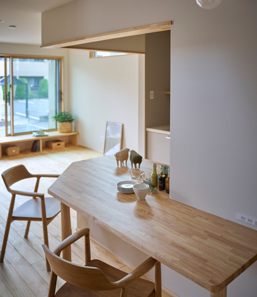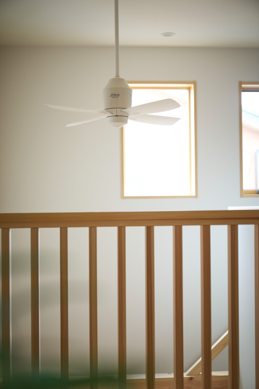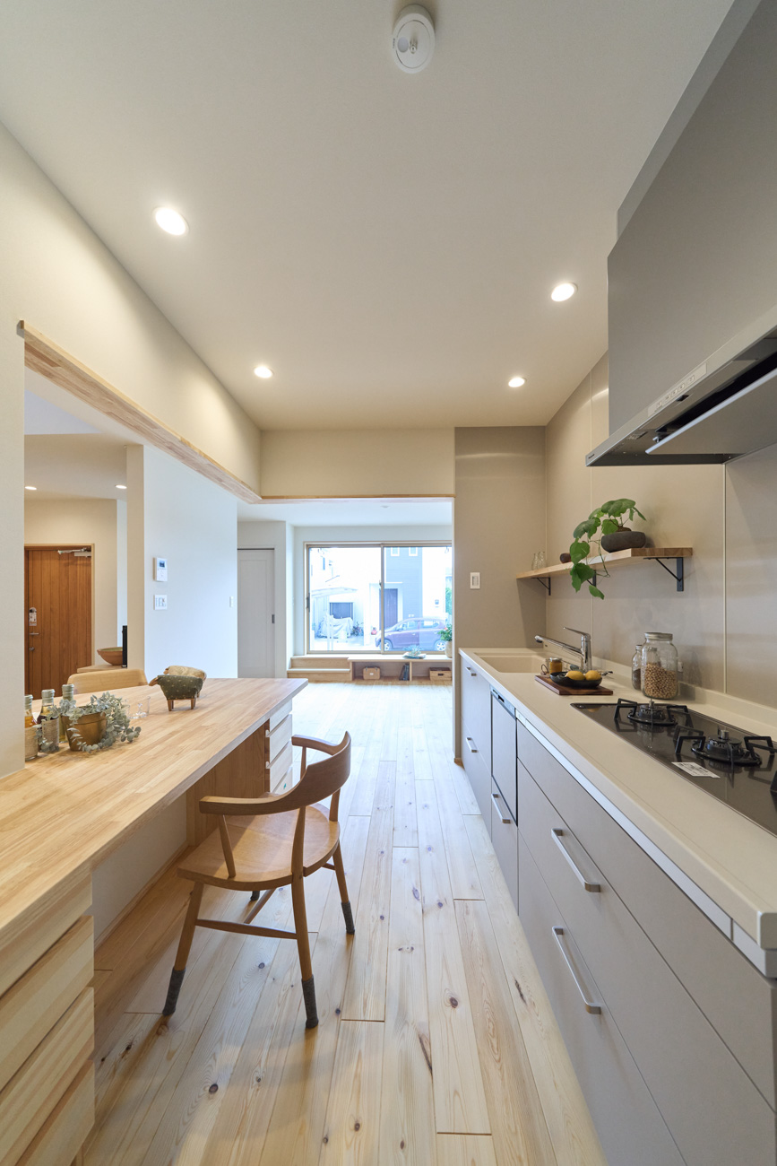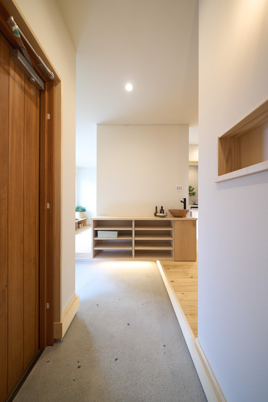 暮らしの変化もあり、お土地とのご縁を待つ間、多くの見学会にご参加いただいた建主様。OB様たちのアイデアをたくさん参考にされ、シムラでの家づくりを楽しみつくしたと言っても過言ではありません。 公私を分けた二つのリビング3方向動線の土間ワークスペースや適材適所の収納・・・。 多彩な設備を採用し、かつ上手に配置することで、広さや奥行きを感じられる空間設計。理想をカタチにし、人が集まる温かな住まいです。 1F 巧みな動線と設備の配置 来客も多いという建主様。1階は人の出入りも想定したリビングを設置。ちょっと篭れる書斎やリビングベンチ。ご同居のお母様の寝室にパントリーやクローゼット、階段下にはヌックと、たくさんの設備を設置しました。配置や奥行きの取り方が巧みで、キッチンとダイニングを中心にそれらが不思議と喧嘩せず、圧迫感なく配置されていてます。ひとつひとつこだわりを持って採用されているため、住む人も訪れる人も楽しくなるお住まいです。 2F 家族のリビングとそれぞれの部屋 2階は大きな本棚のあるファミリースペースを中心に各居室を配置。ワークスペースやベンチと造作の家具が光ります。たくさん人の居場所のあるお住まいです。
