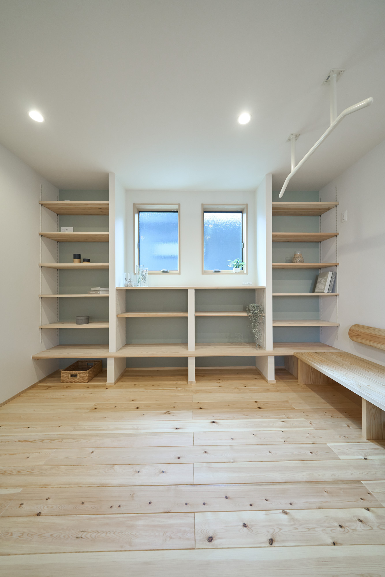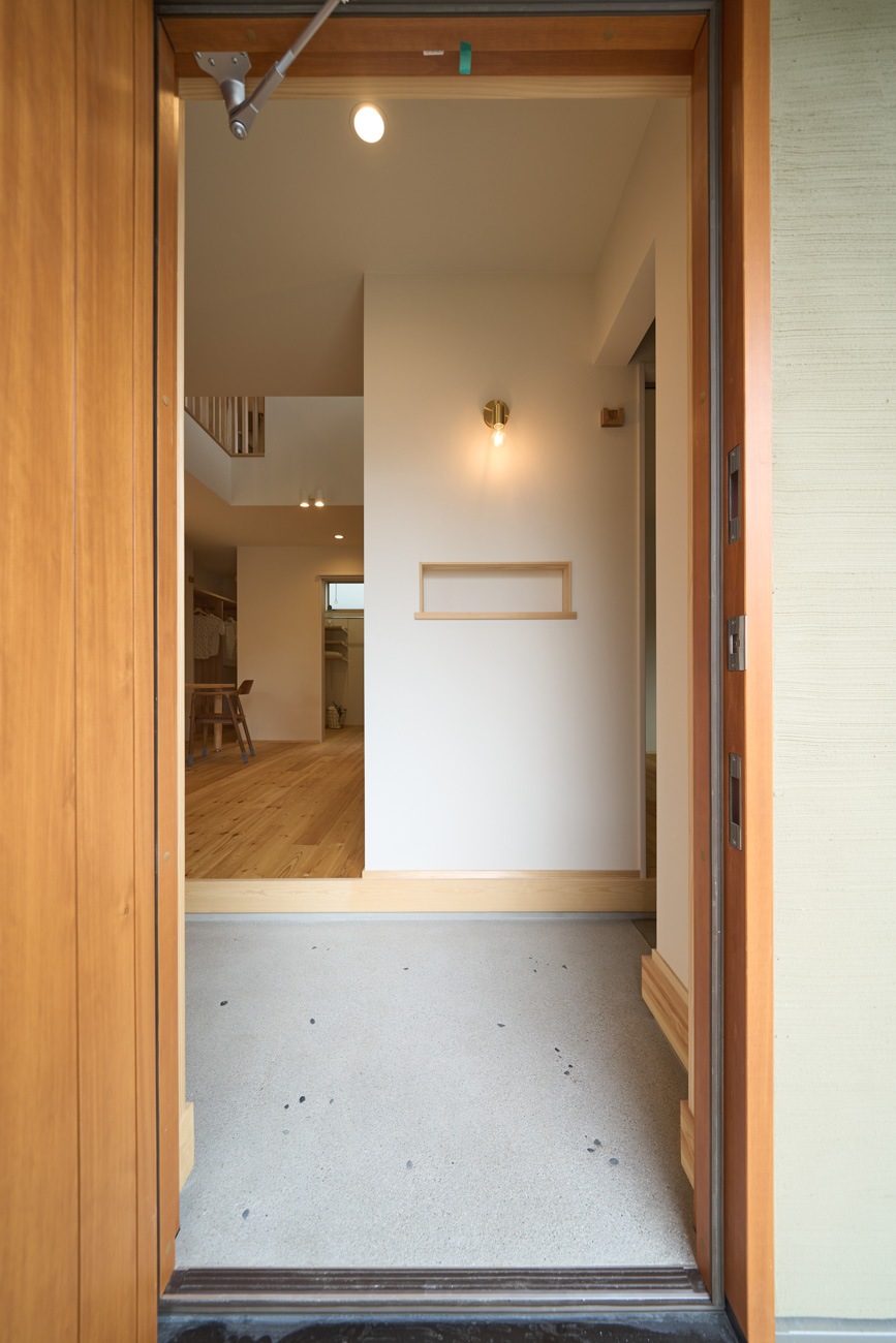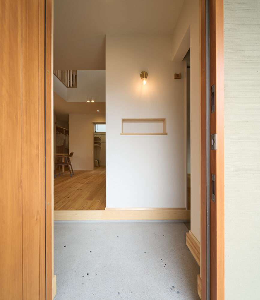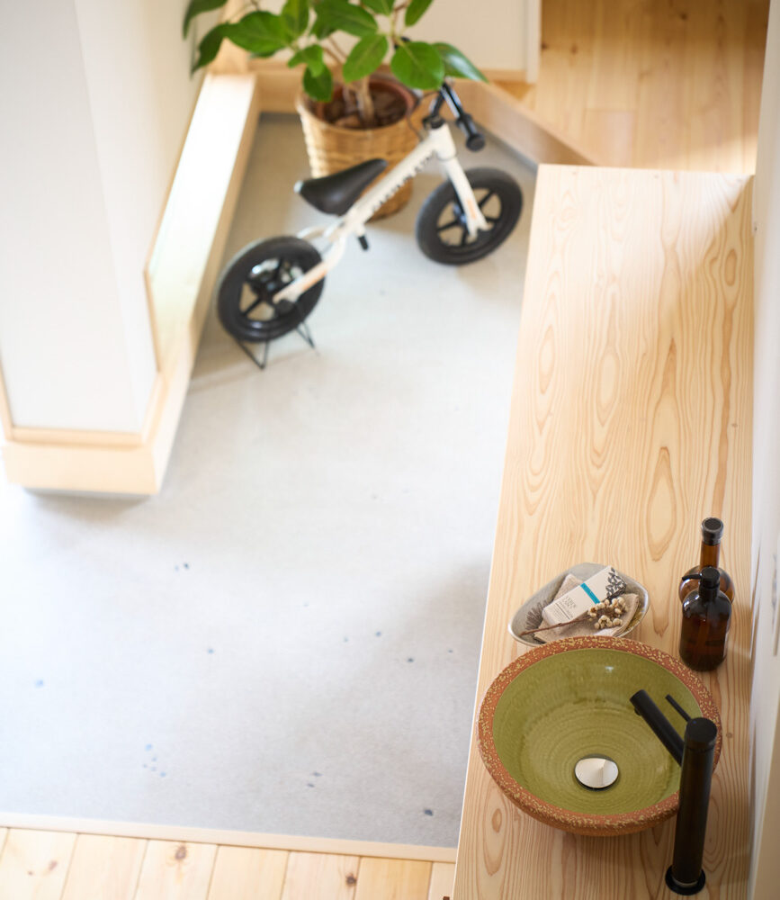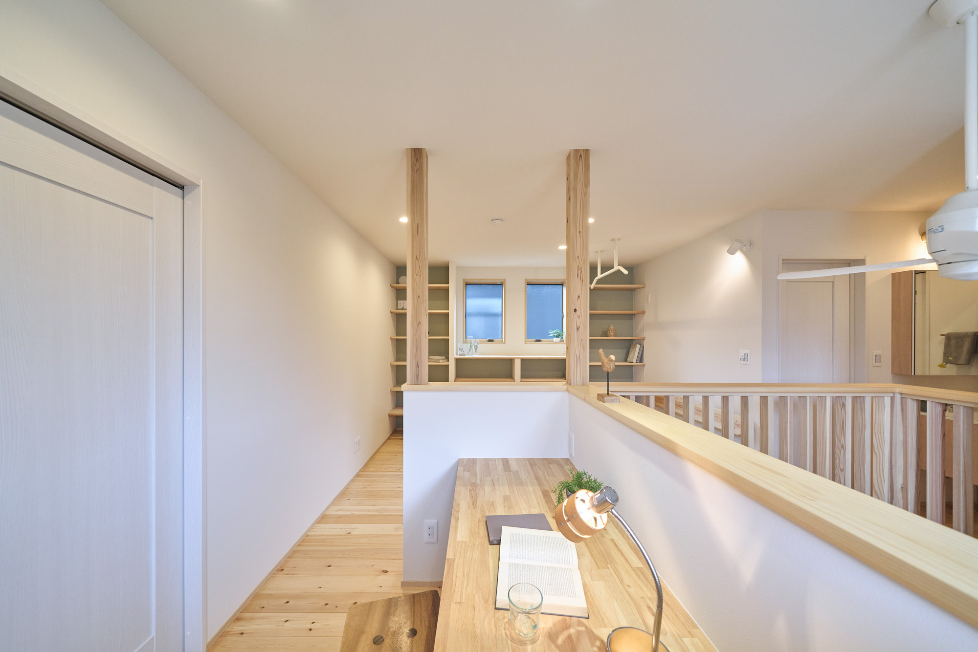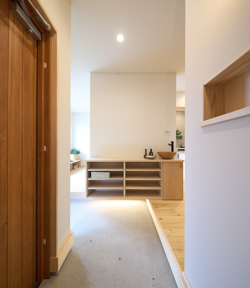 暮らしの変化もあり、お土地とのご縁を待つ間、多くの見学会にご参加いただいた建主様。OB様たちのアイデアをたくさん参考にされ、シムラでの家づくりを楽しみつくしたと言っても過言ではありません。 公私を分けた二つのリビング3方向動線の土間ワークスペースや適材適所の収納・・・。 多彩な設備を採用し、かつ上手に配置することで、広さや奥行きを感じられる空間設計。理想をカタチにし、人が集まる温かな住まいです。 1F 巧みな動線と設備の配置 来客も多いという建主様。1階は人の出入りも想定したリビングを設置。ちょっと篭れる書斎やリビングベンチ。ご同居のお母様の寝室にパントリーやクローゼット、階段下にはヌックと、たくさんの設備を設置しました。配置や奥行きの取り方が巧みで、キッチンとダイニングを中心にそれらが不思議と喧嘩せず、圧迫感なく配置されていてます。ひとつひとつこだわりを持って採用されているため、住む人も訪れる人も楽しくなるお住まいです。 2F 家族のリビングとそれぞれの部屋 2階は大きな本棚のあるファミリースペースを中心に各居室を配置。ワークスペースやベンチと造作の家具が光ります。たくさん人の居場所のあるお住まいです。