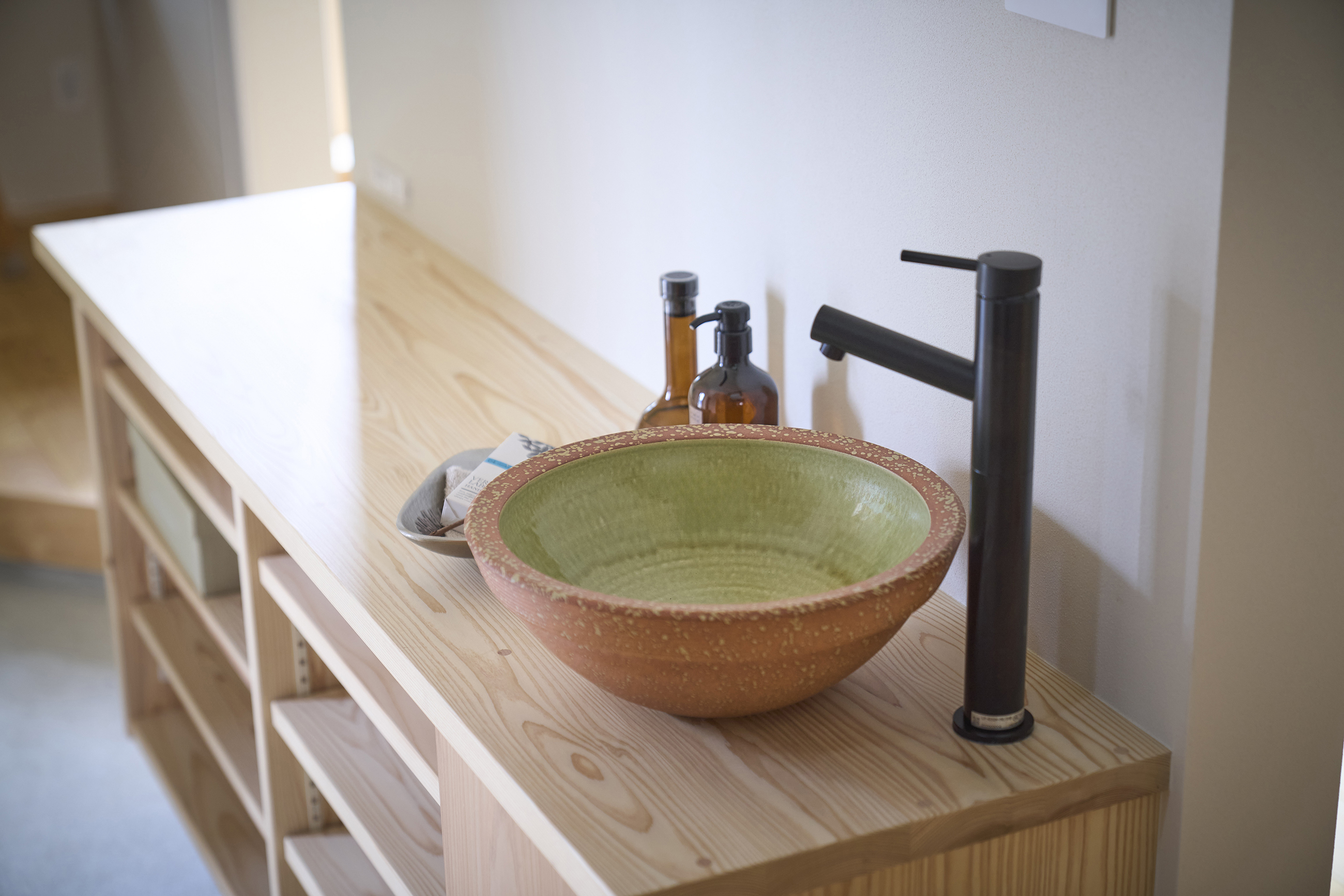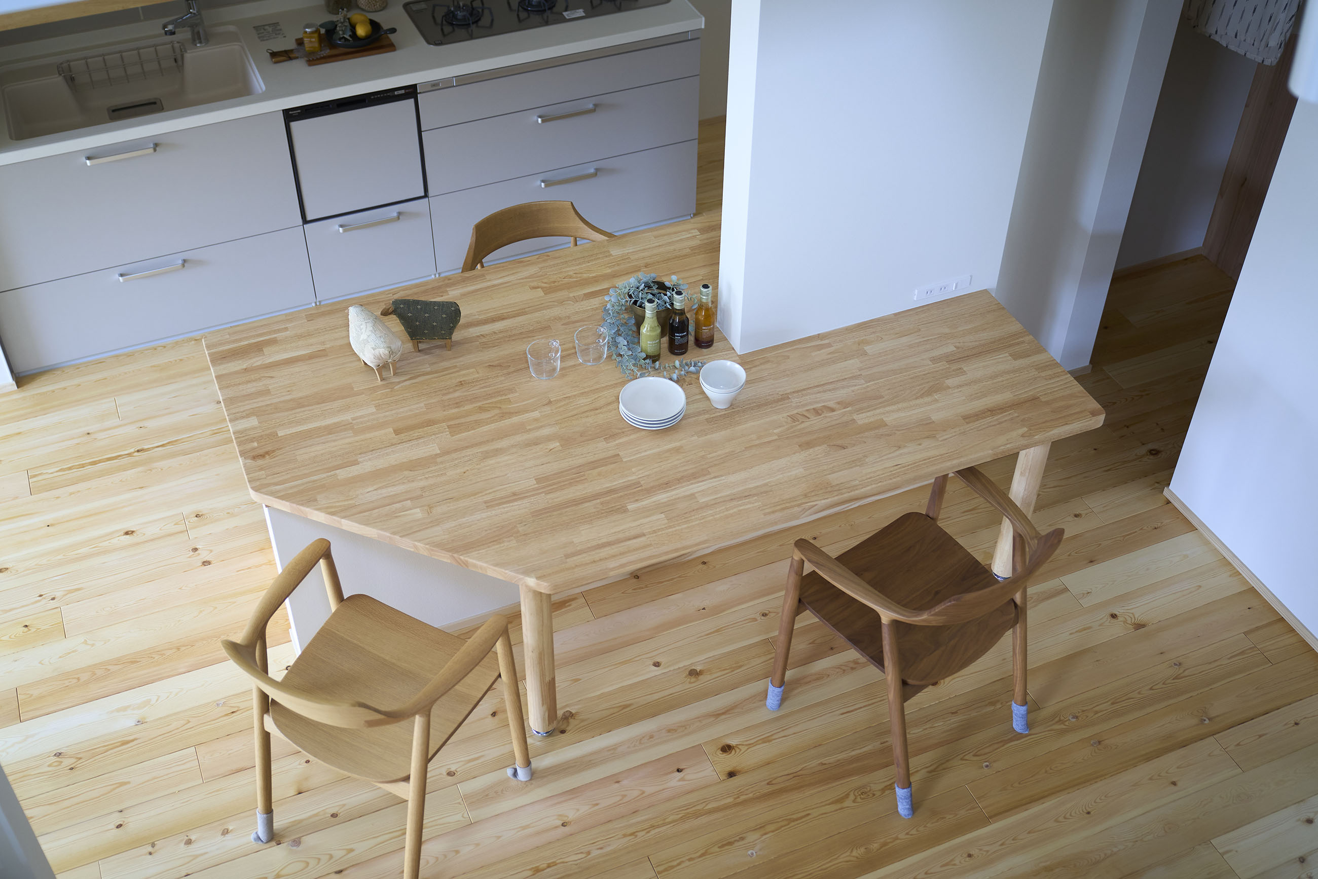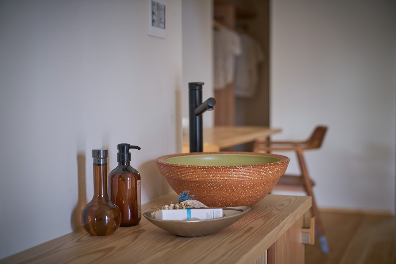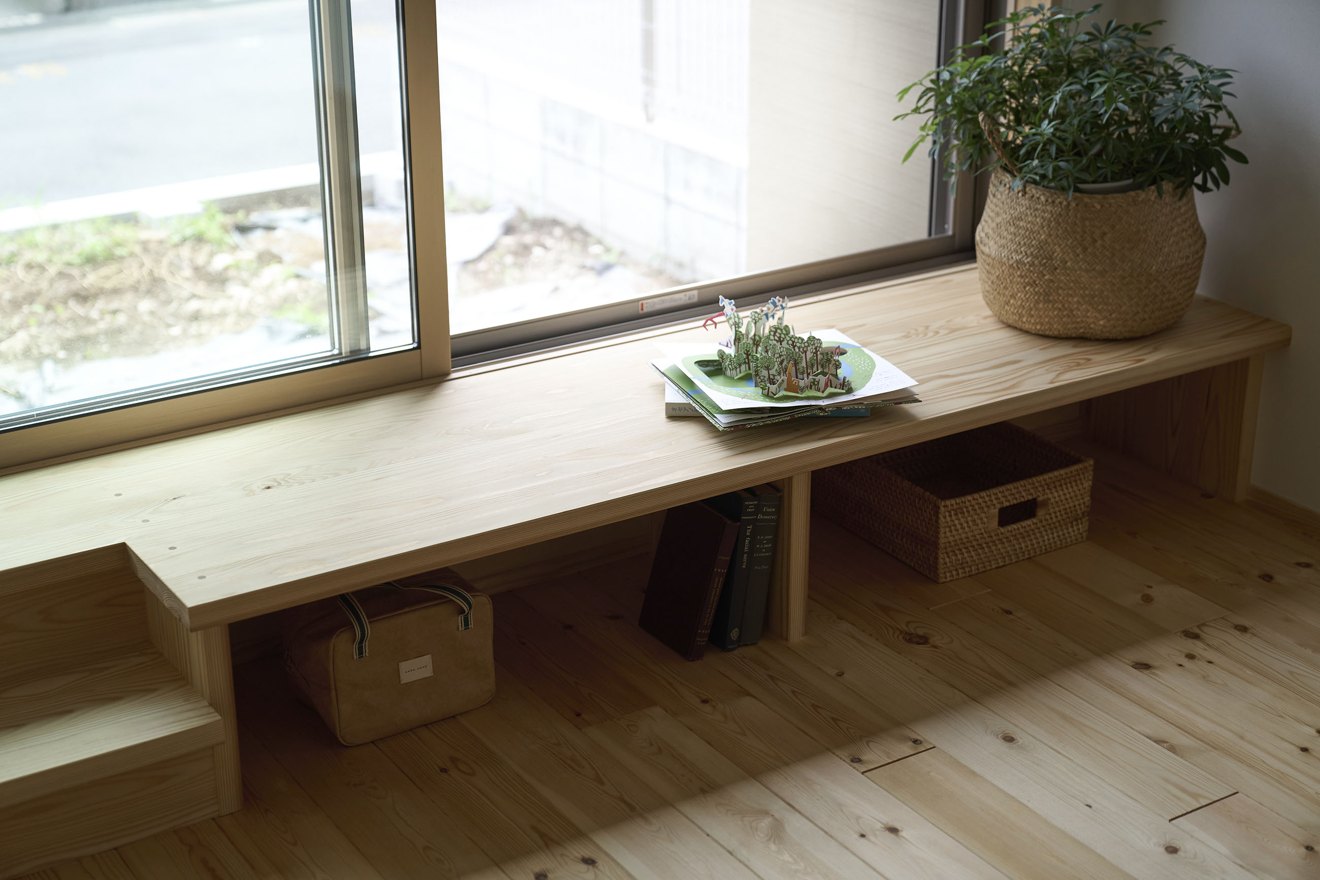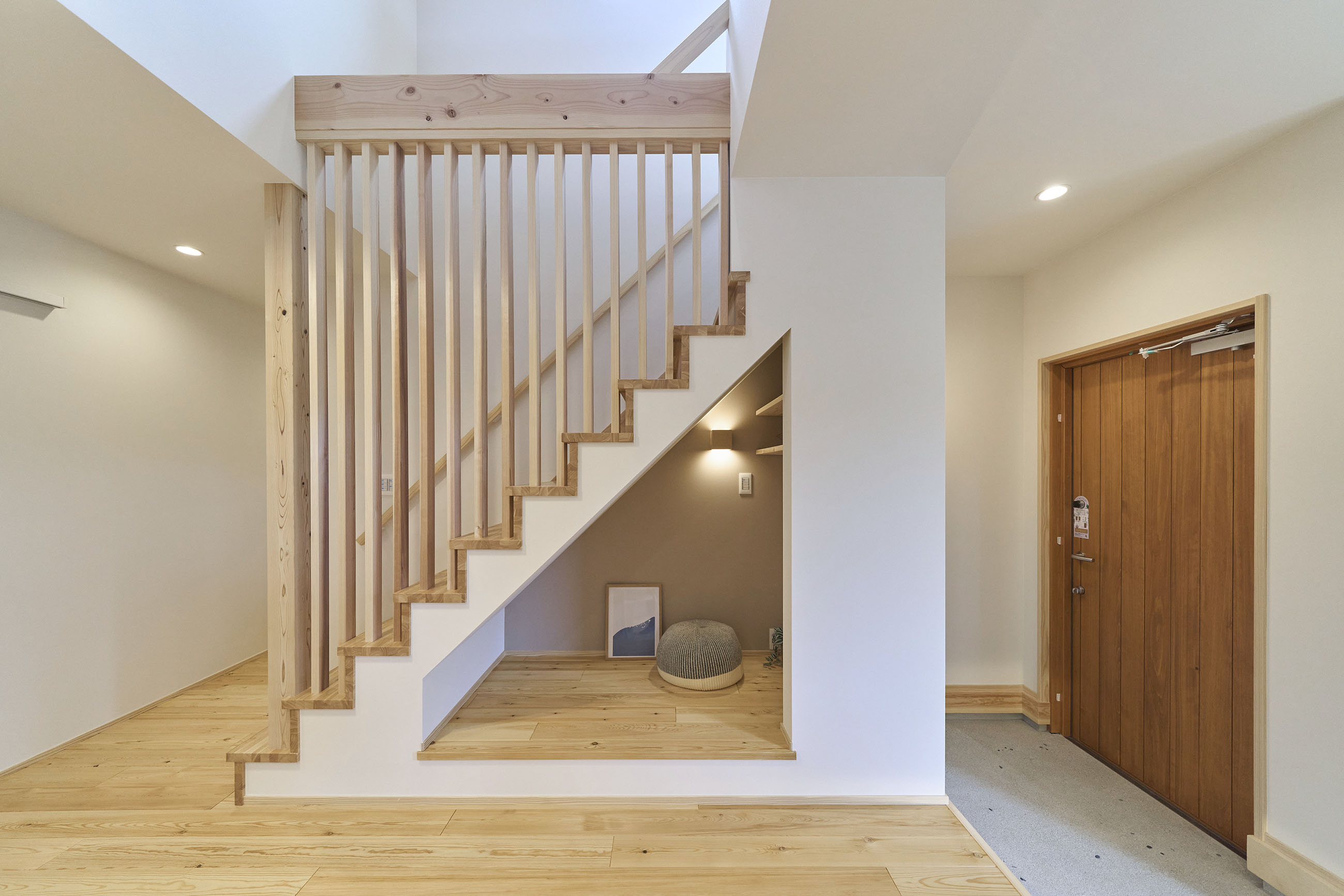 暮らしの変化もあり、お土地とのご縁を待つ間、多くの見学会にご参加いただいた建主様。OB様たちのアイデアをたくさん参考にされ、シムラでの家づくりを楽しみつくしたと言っても過言ではありません。 公私を分けた二つのリビング3方向動線の土間ワークスペースや適材適所の収納・・・。 多彩な設備を採用し、かつ上手に配置することで、広さや奥行きを感じられる空間設計。理想をカタチにし、人が集まる温かな住まいです。 1F 巧みな動線と設備の配置 来客も多いという建主様。1階は人の出入りも想定したリビングを設置。ちょっと篭れる書斎やリビングベンチ。ご同居のお母様の寝室にパントリーやクローゼット、階段下にはヌックと、たくさんの設備を設置しました。配置や奥行きの取り方が巧みで、キッチンとダイニングを中心にそれらが不思議と喧嘩せず、圧迫感なく配置されていてます。ひとつひとつこだわりを持って採用されているため、住む人も訪れる人も楽しくなるお住まいです。 2F 家族のリビングとそれぞれの部屋 2階は大きな本棚のあるファミリースペースを中心に各居室を配置。ワークスペースやベンチと造作の家具が光ります。たくさん人の居場所のあるお住まいです。