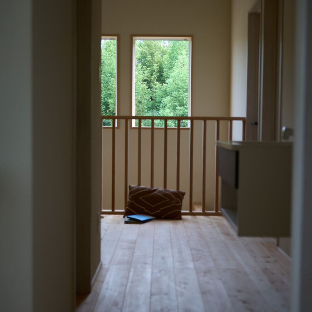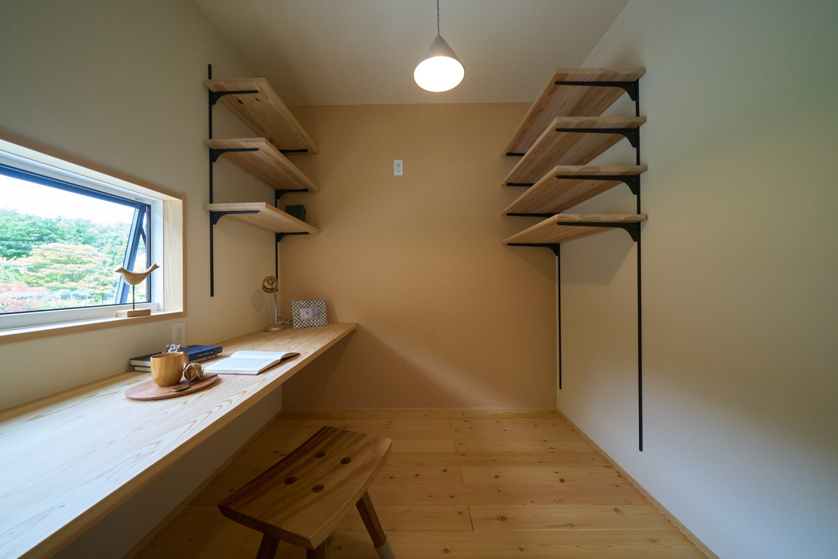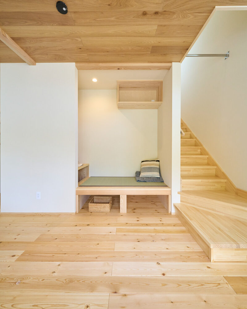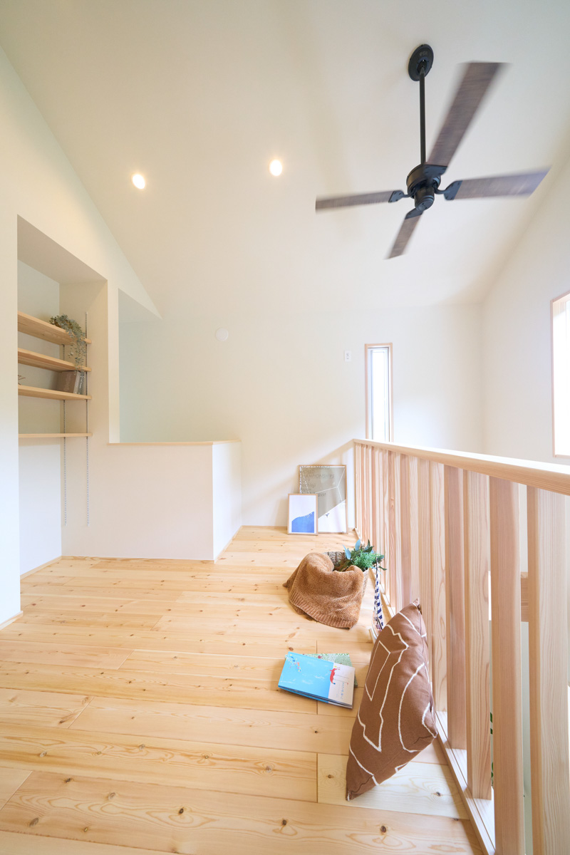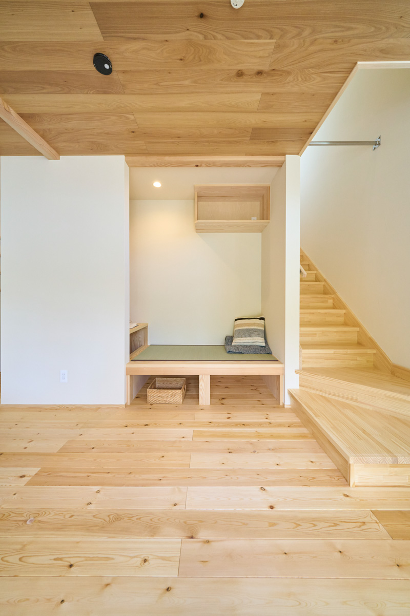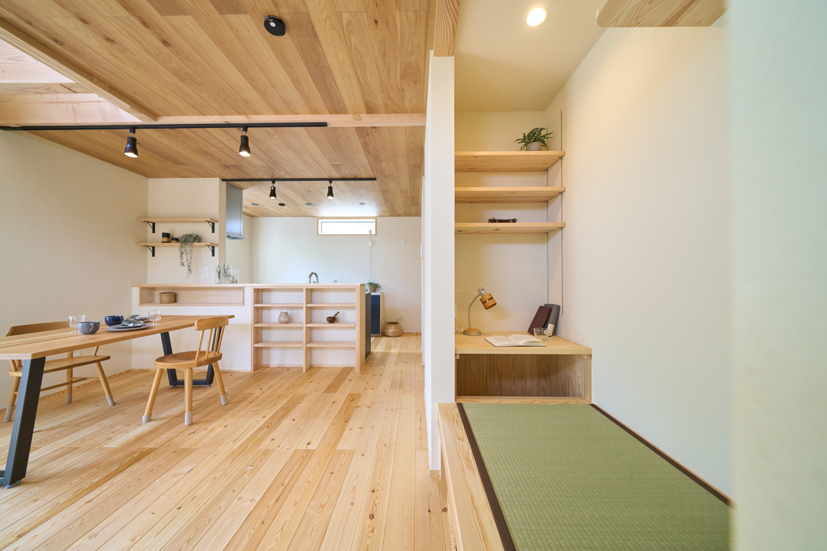 理想の住まいづくりのため、お土地探しからお手伝いさせていただきました。 周囲の美しい風景を取り込む窓の配置。 趣味を楽しむ眺めの良い書斎。 親子で使える畳ソファのリビングワークスペース。 大きなファミリークローゼットや家事室などの多彩な設備。 動線に沿った適材適所の収納も充実。 柔らかな表情が心地よい、無垢の造作家具。 自由設計の楽しさを体感できるこだわりのお住まいです。 設備充実のお住まい 1Fにはたくさんの設備を配置。動きやすい二重動線上に上手に配置されています。家事室と繋がる大きなファミリークローゼットは普段使いの服やリネンなどの管理に大活躍。細々配置された収納はリビングから見えすぎない工夫が◎。リビングには本を読んだりちょっと腰掛けられる畳スペースを。 趣味と借景を楽しむ2階 階段横には大きなワークスペースのある書斎。持ち帰り仕事に集中できるほか、趣味の道具を整理しておける仕様に。少し広く取った吹き抜け横のフリースペースは子供達の遊び場にも。書斎吹き抜けの窓からは心安らぐ近隣ののどかな風景を楽しめます。