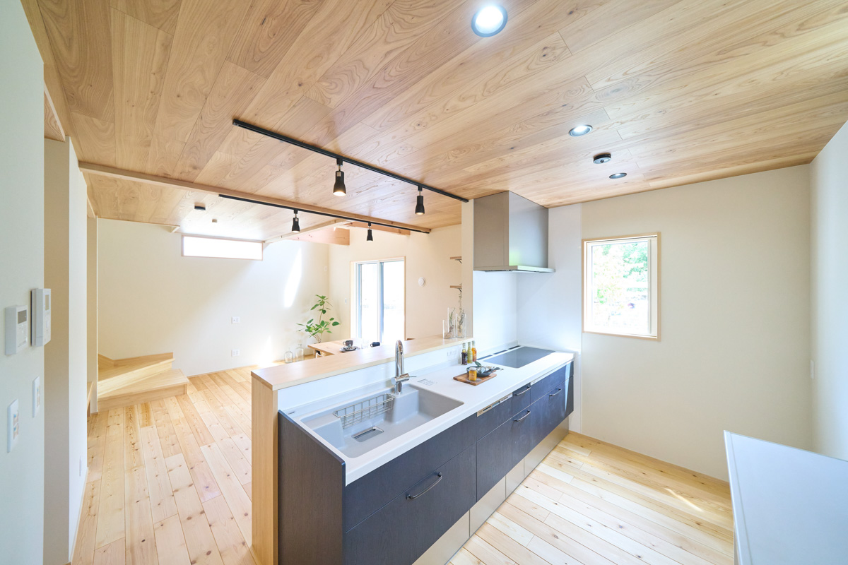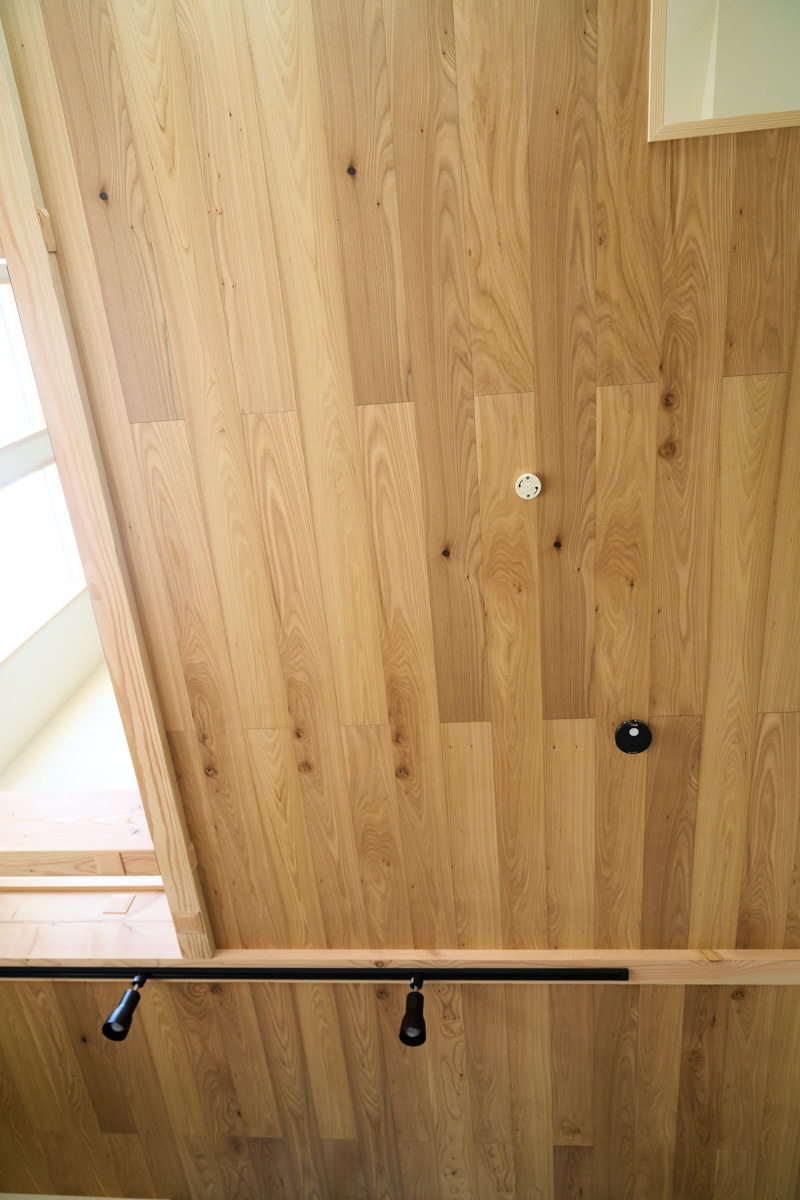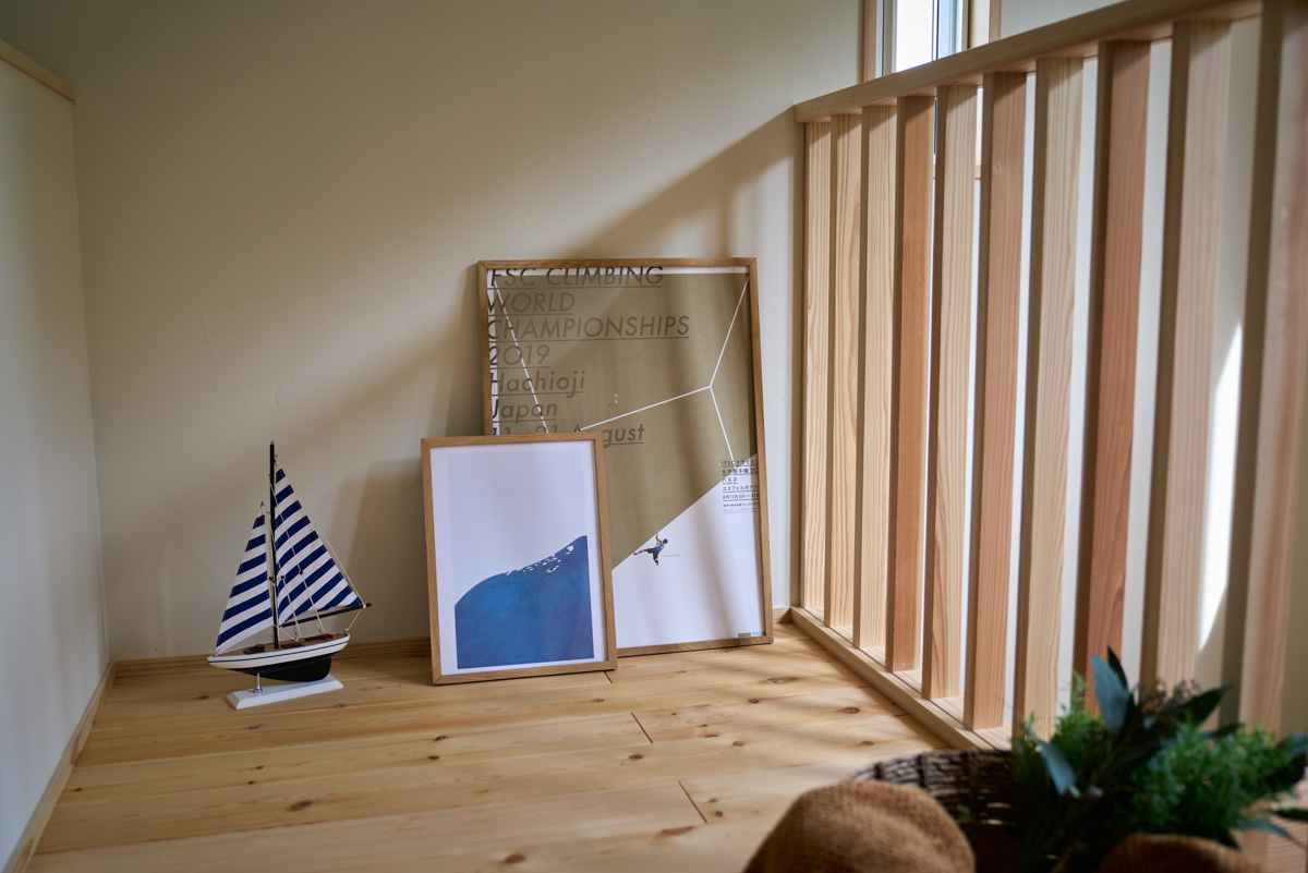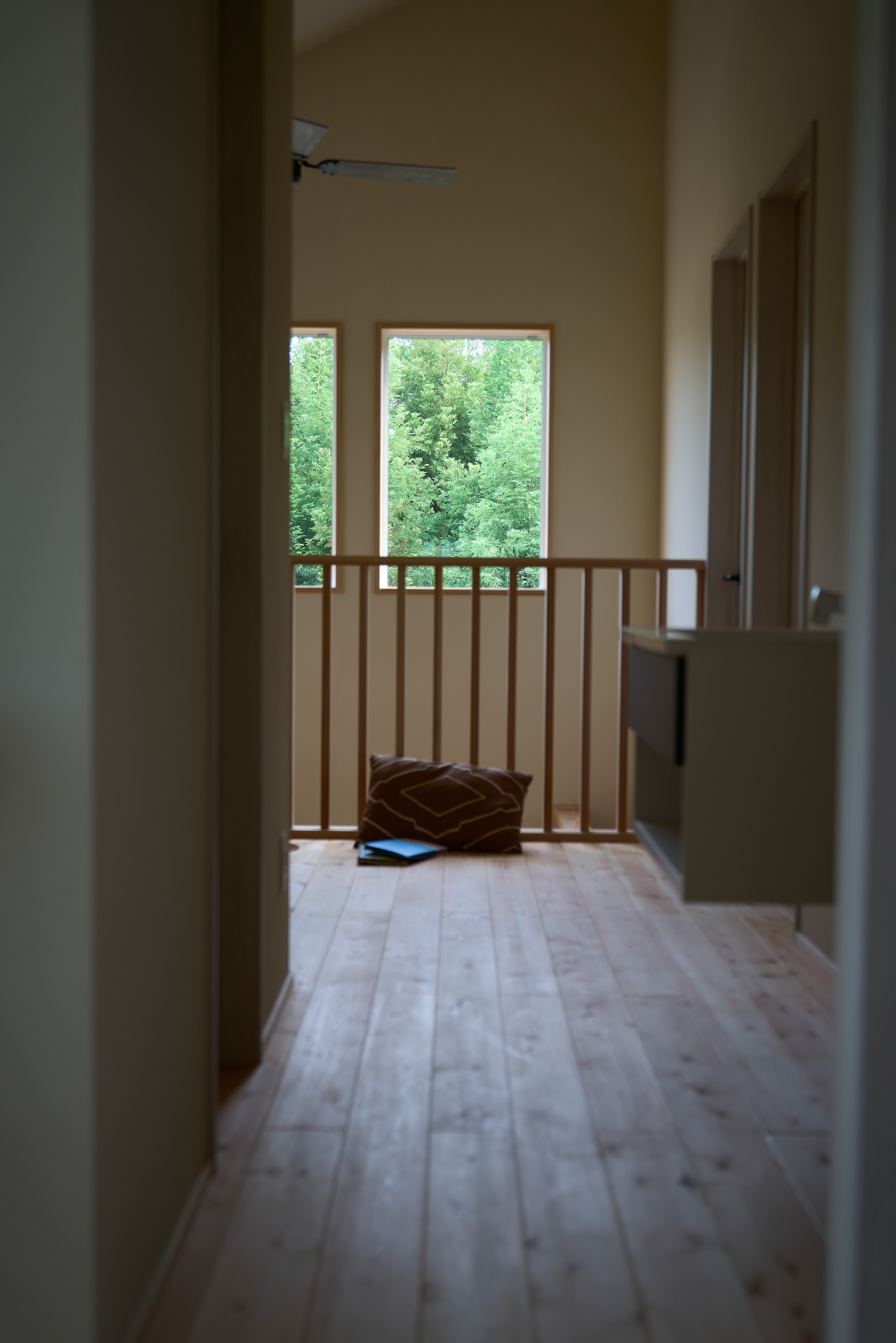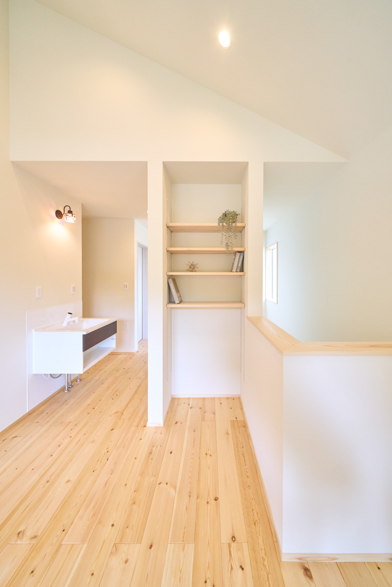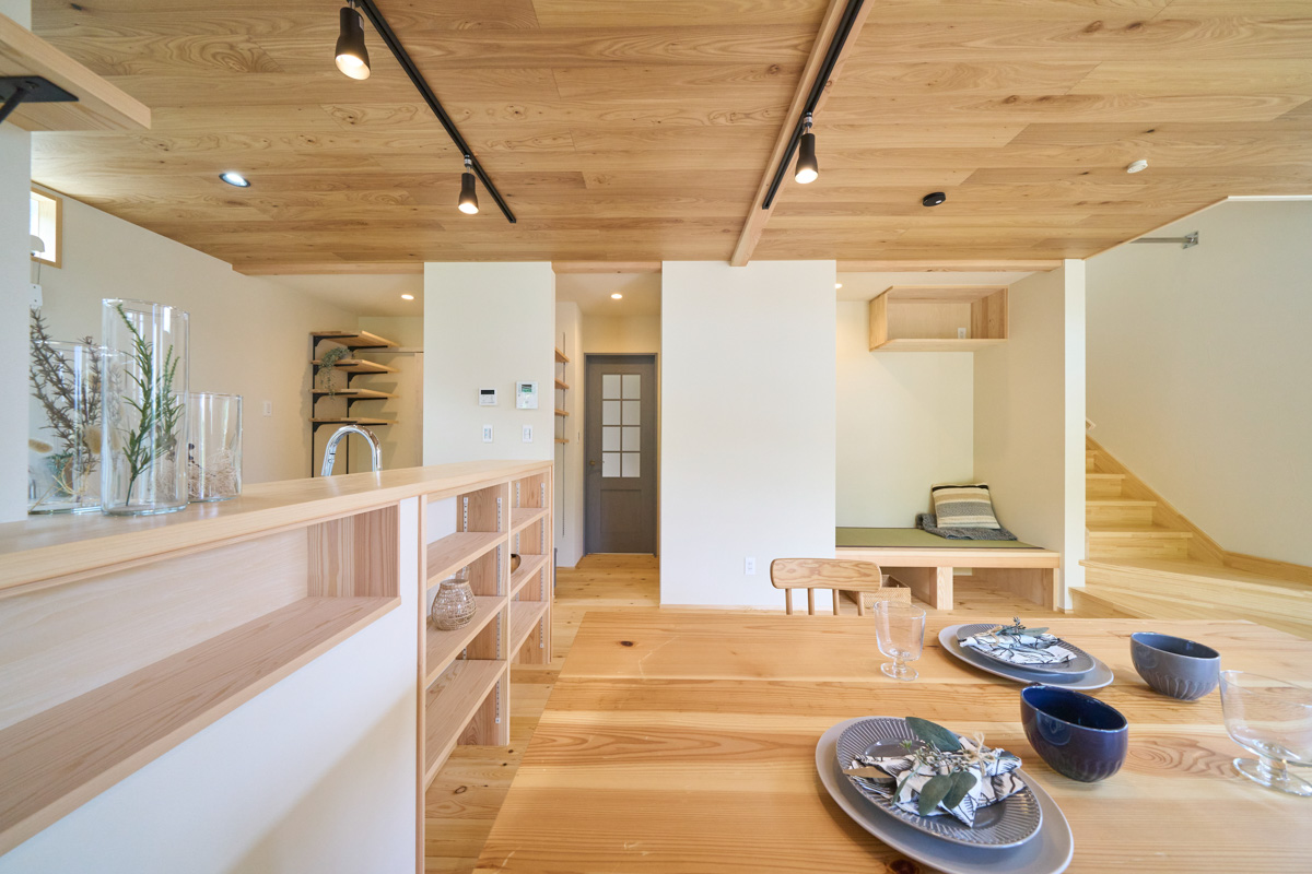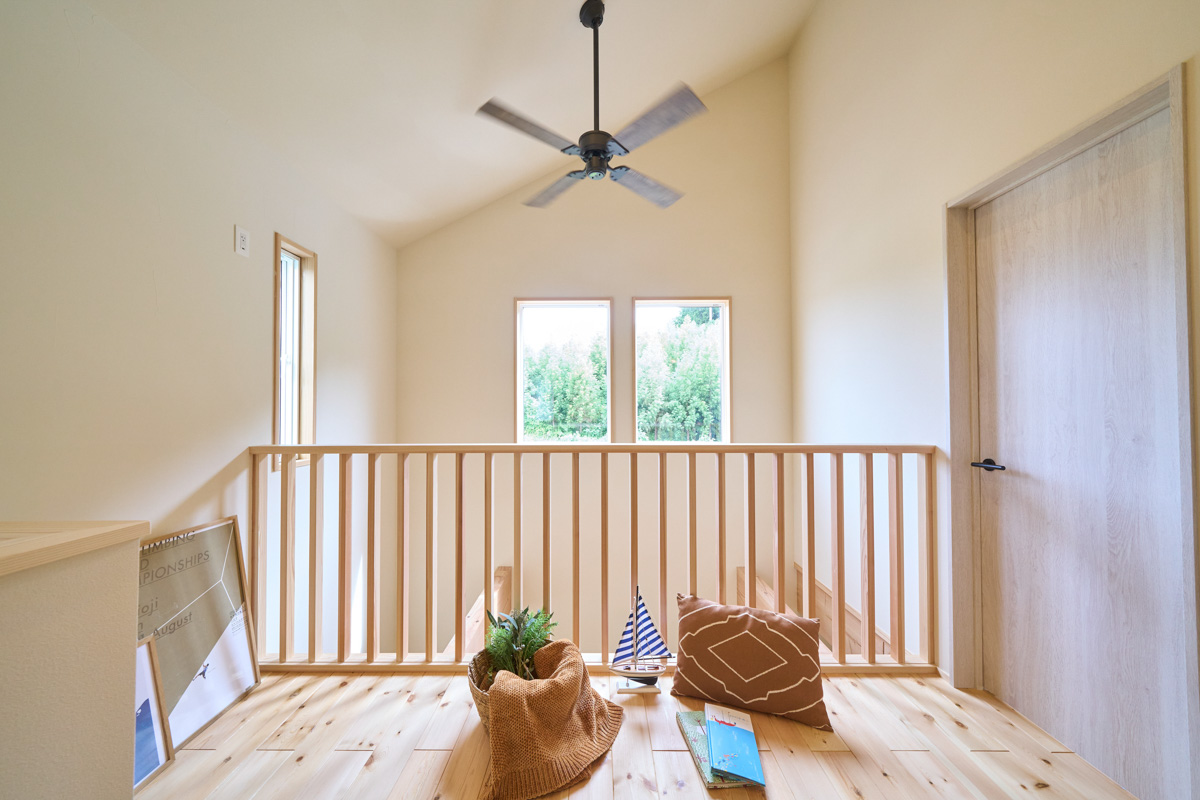理想の住まいづくりのため、お土地探しからお手伝いさせていただきました。 周囲の美しい風景を取り込む窓の配置。 趣味を楽しむ眺めの良い書斎。 親子で使える畳ソファのリビングワークスペース。 大きなファミリークローゼットや家事室などの多彩な設備。 動線に沿った適材適所の収納も充実。 柔らかな表情が心地よい、無垢の造作家具。 自由設計の楽しさを体感できるこだわりのお住まいです。 設備充実のお住まい 1Fにはたくさんの設備を配置。動きやすい二重動線上に上手に配置されています。家事室と繋がる大きなファミリークローゼットは普段使いの服やリネンなどの管理に大活躍。細々配置された収納はリビングから見えすぎない工夫が◎。リビングには本を読んだりちょっと腰掛けられる畳スペースを。 趣味と借景を楽しむ2階 階段横には大きなワークスペースのある書斎。持ち帰り仕事に集中できるほか、趣味の道具を整理しておける仕様に。少し広く取った吹き抜け横のフリースペースは子供達の遊び場にも。書斎吹き抜けの窓からは心安らぐ近隣ののどかな風景を楽しめます。