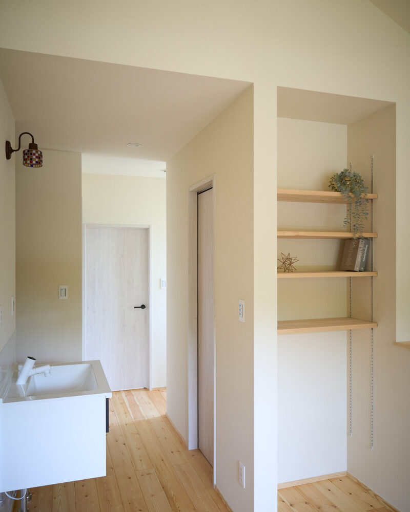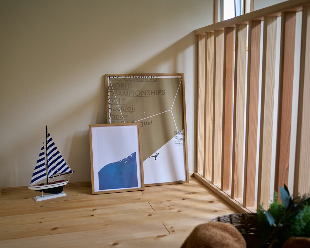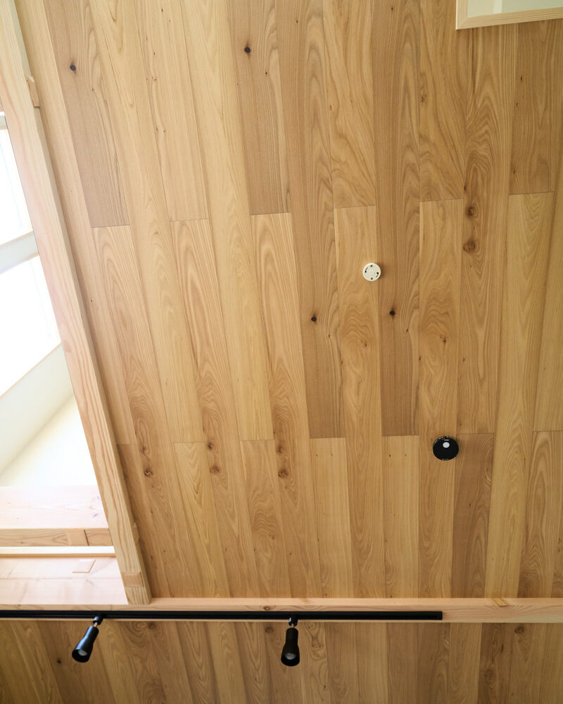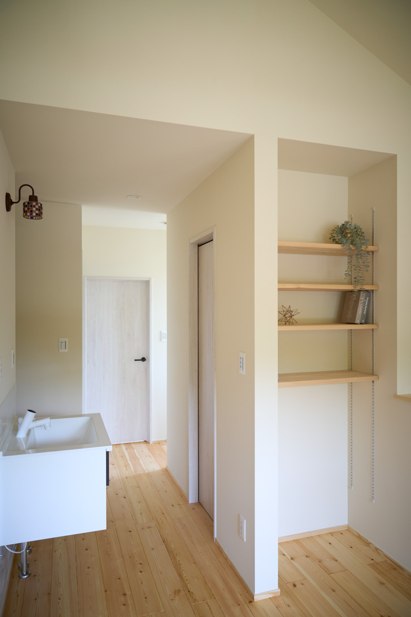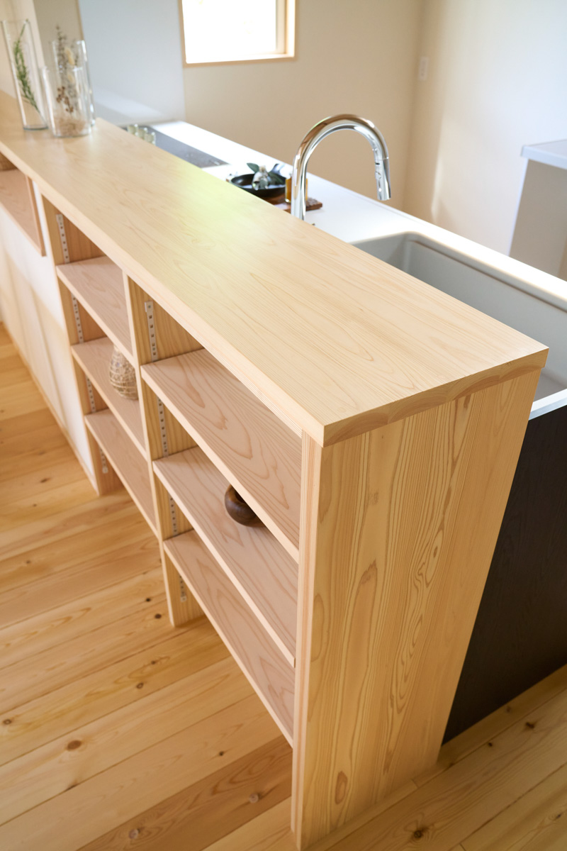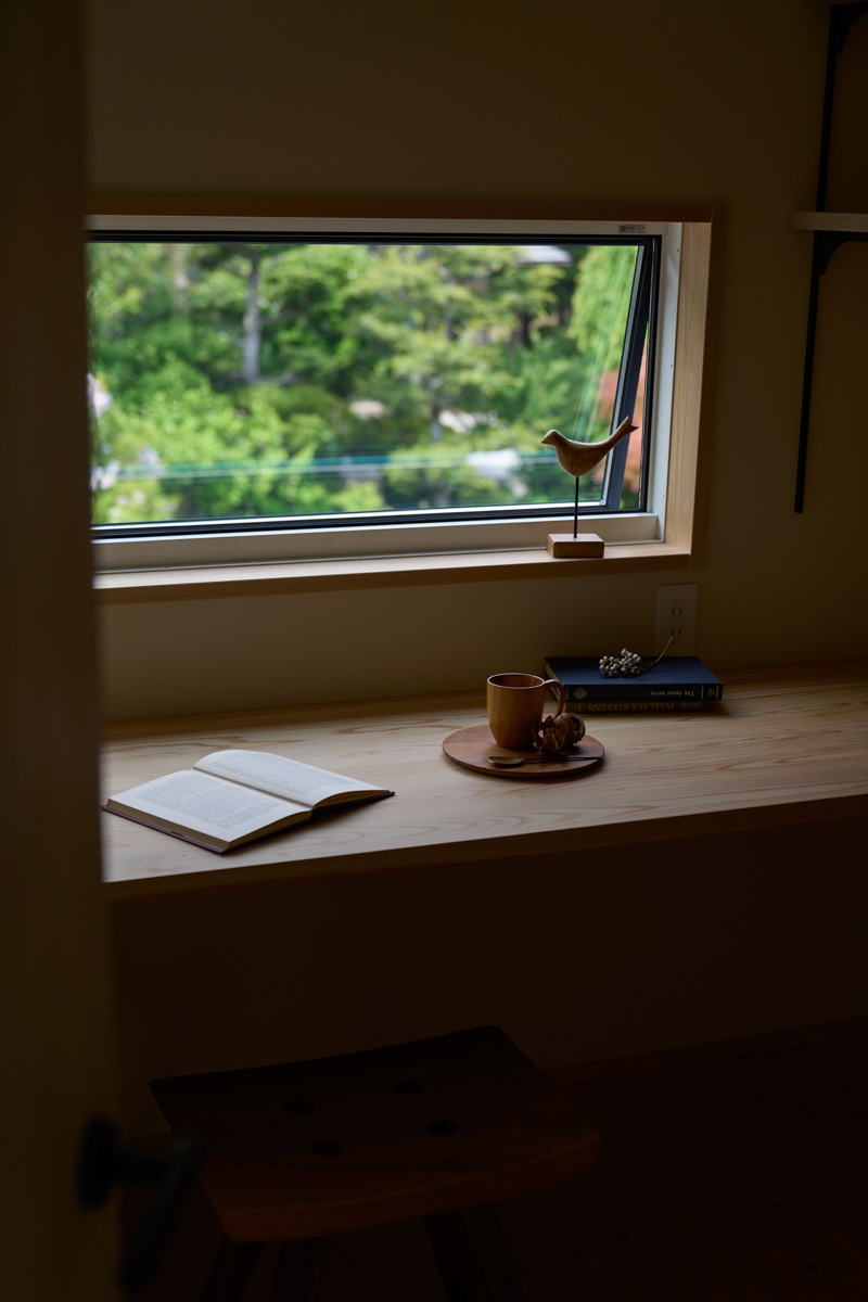 理想の住まいづくりのため、お土地探しからお手伝いさせていただきました。 周囲の美しい風景を取り込む窓の配置。 趣味を楽しむ眺めの良い書斎。 親子で使える畳ソファのリビングワークスペース。 大きなファミリークローゼットや家事室などの多彩な設備。 動線に沿った適材適所の収納も充実。 柔らかな表情が心地よい、無垢の造作家具。 自由設計の楽しさを体感できるこだわりのお住まいです。 設備充実のお住まい 1Fにはたくさんの設備を配置。動きやすい二重動線上に上手に配置されています。家事室と繋がる大きなファミリークローゼットは普段使いの服やリネンなどの管理に大活躍。細々配置された収納はリビングから見えすぎない工夫が◎。リビングには本を読んだりちょっと腰掛けられる畳スペースを。 趣味と借景を楽しむ2階 階段横には大きなワークスペースのある書斎。持ち帰り仕事に集中できるほか、趣味の道具を整理しておける仕様に。少し広く取った吹き抜け横のフリースペースは子供達の遊び場にも。書斎吹き抜けの窓からは心安らぐ近隣ののどかな風景を楽しめます。