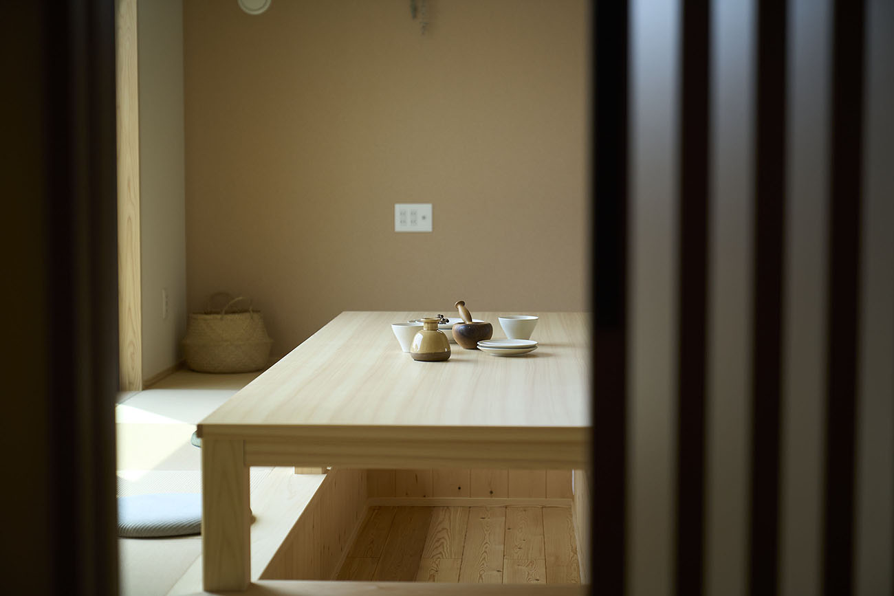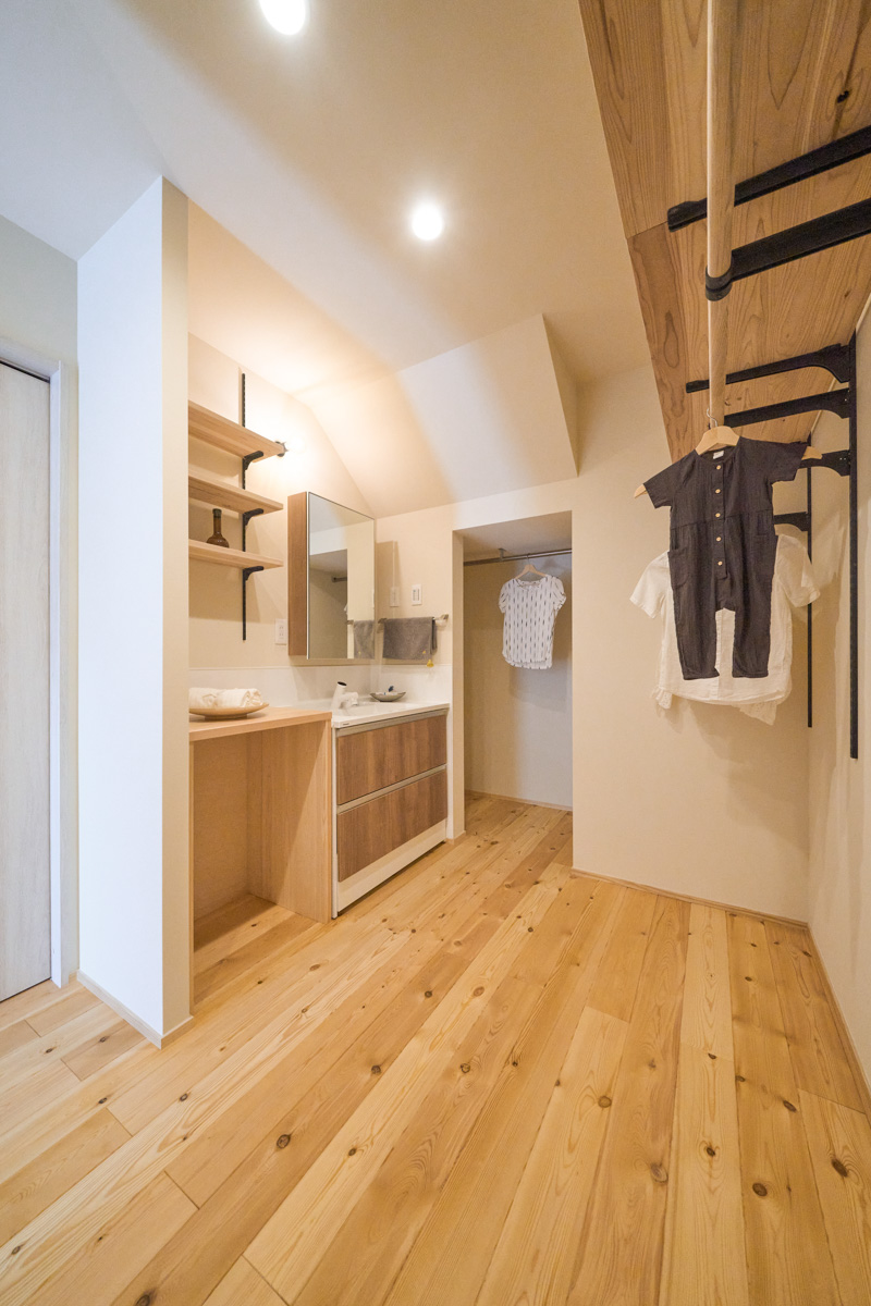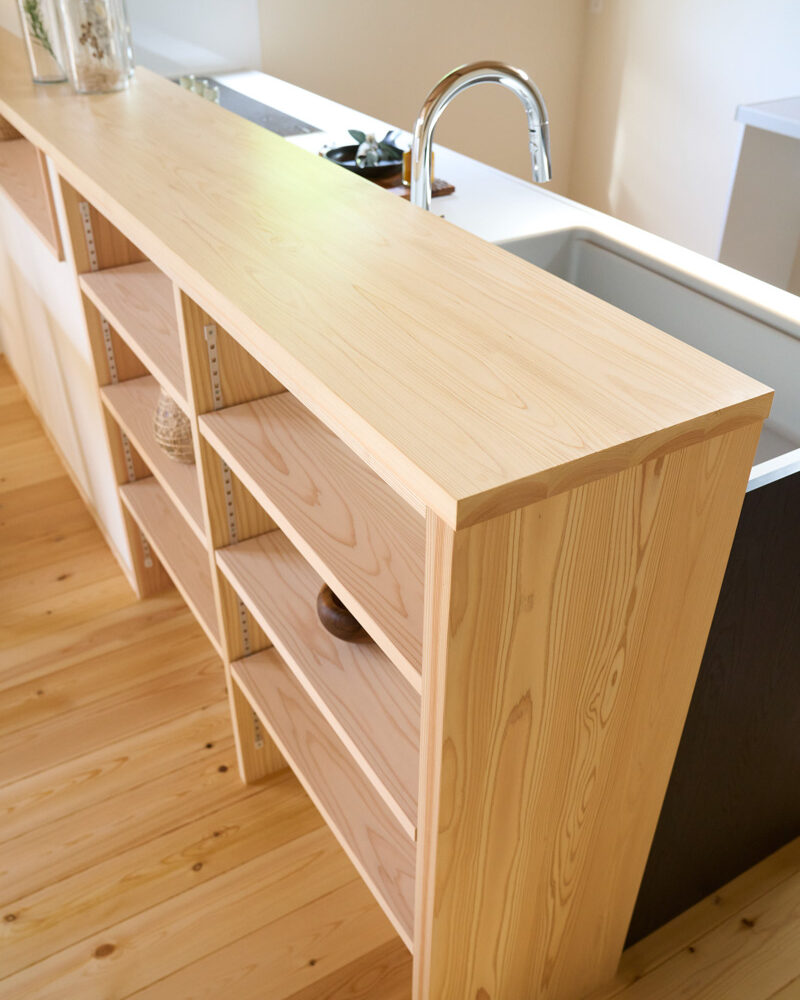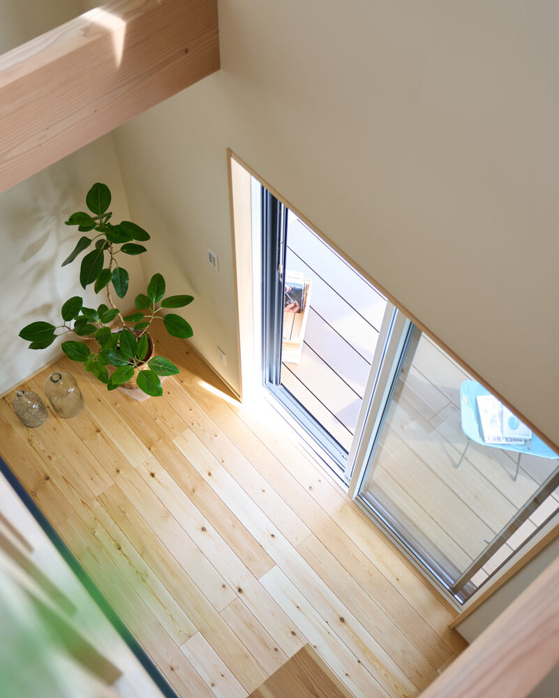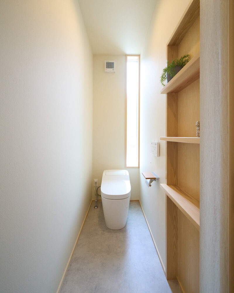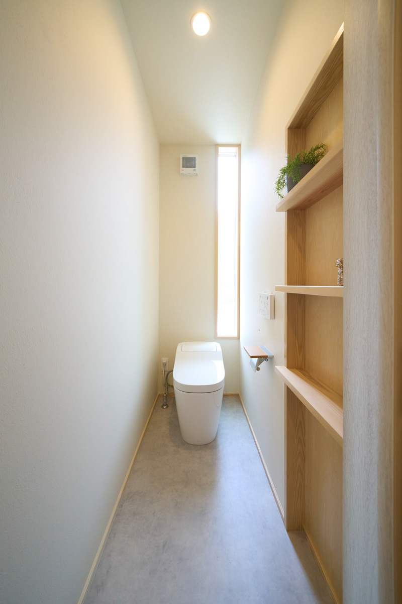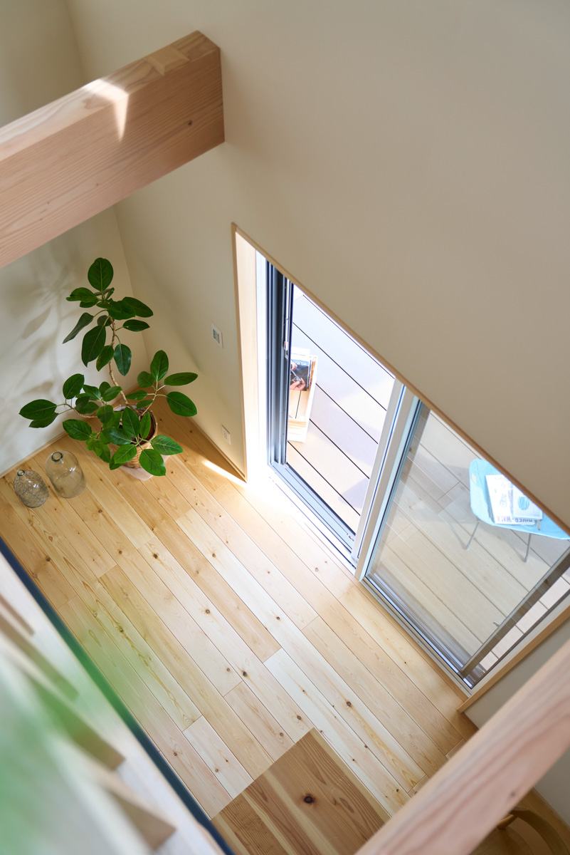 理想の住まいづくりのため、お土地探しからお手伝いさせていただきました。 周囲の美しい風景を取り込む窓の配置。 趣味を楽しむ眺めの良い書斎。 親子で使える畳ソファのリビングワークスペース。 大きなファミリークローゼットや家事室などの多彩な設備。 動線に沿った適材適所の収納も充実。 柔らかな表情が心地よい、無垢の造作家具。 自由設計の楽しさを体感できるこだわりのお住まいです。 設備充実のお住まい 1Fにはたくさんの設備を配置。動きやすい二重動線上に上手に配置されています。家事室と繋がる大きなファミリークローゼットは普段使いの服やリネンなどの管理に大活躍。細々配置された収納はリビングから見えすぎない工夫が◎。リビングには本を読んだりちょっと腰掛けられる畳スペースを。 趣味と借景を楽しむ2階 階段横には大きなワークスペースのある書斎。持ち帰り仕事に集中できるほか、趣味の道具を整理しておける仕様に。少し広く取った吹き抜け横のフリースペースは子供達の遊び場にも。書斎吹き抜けの窓からは心安らぐ近隣ののどかな風景を楽しめます。