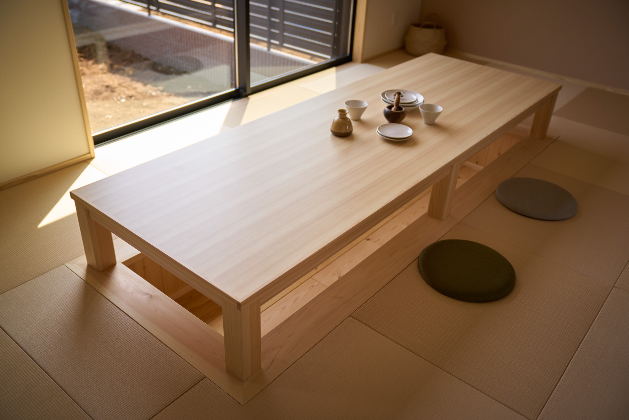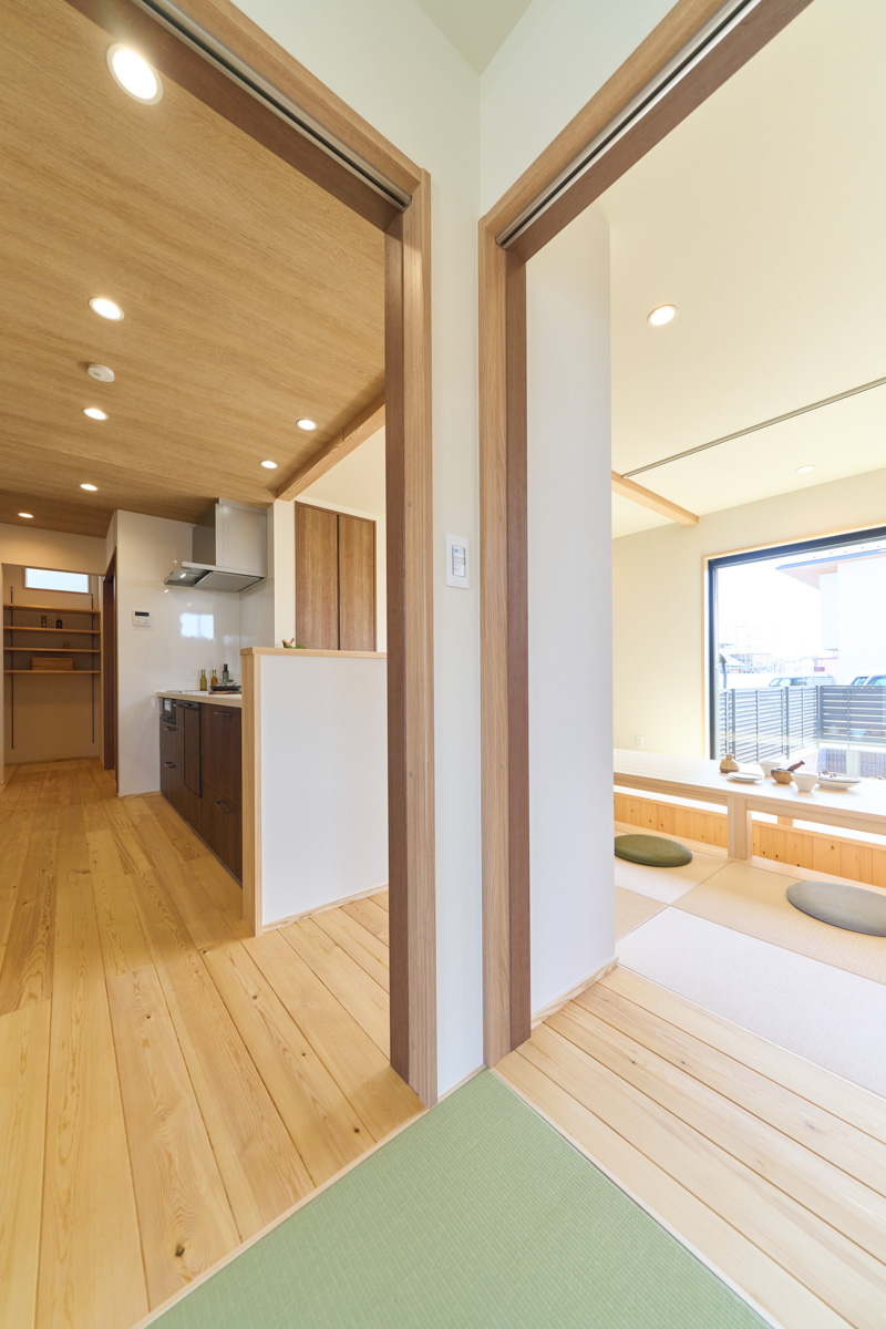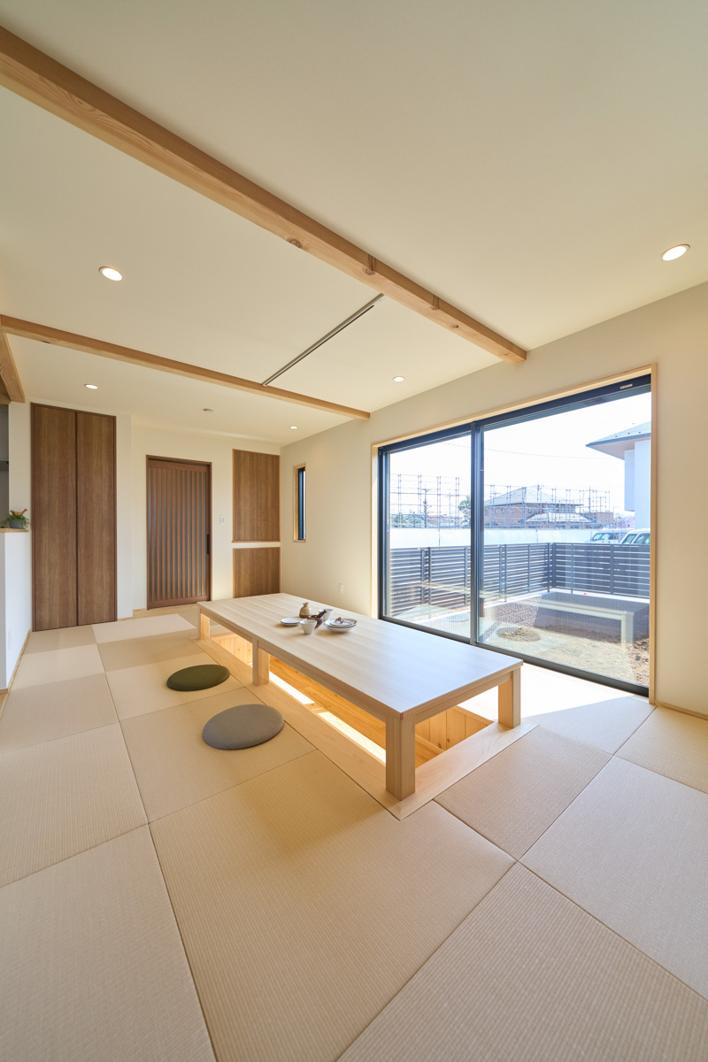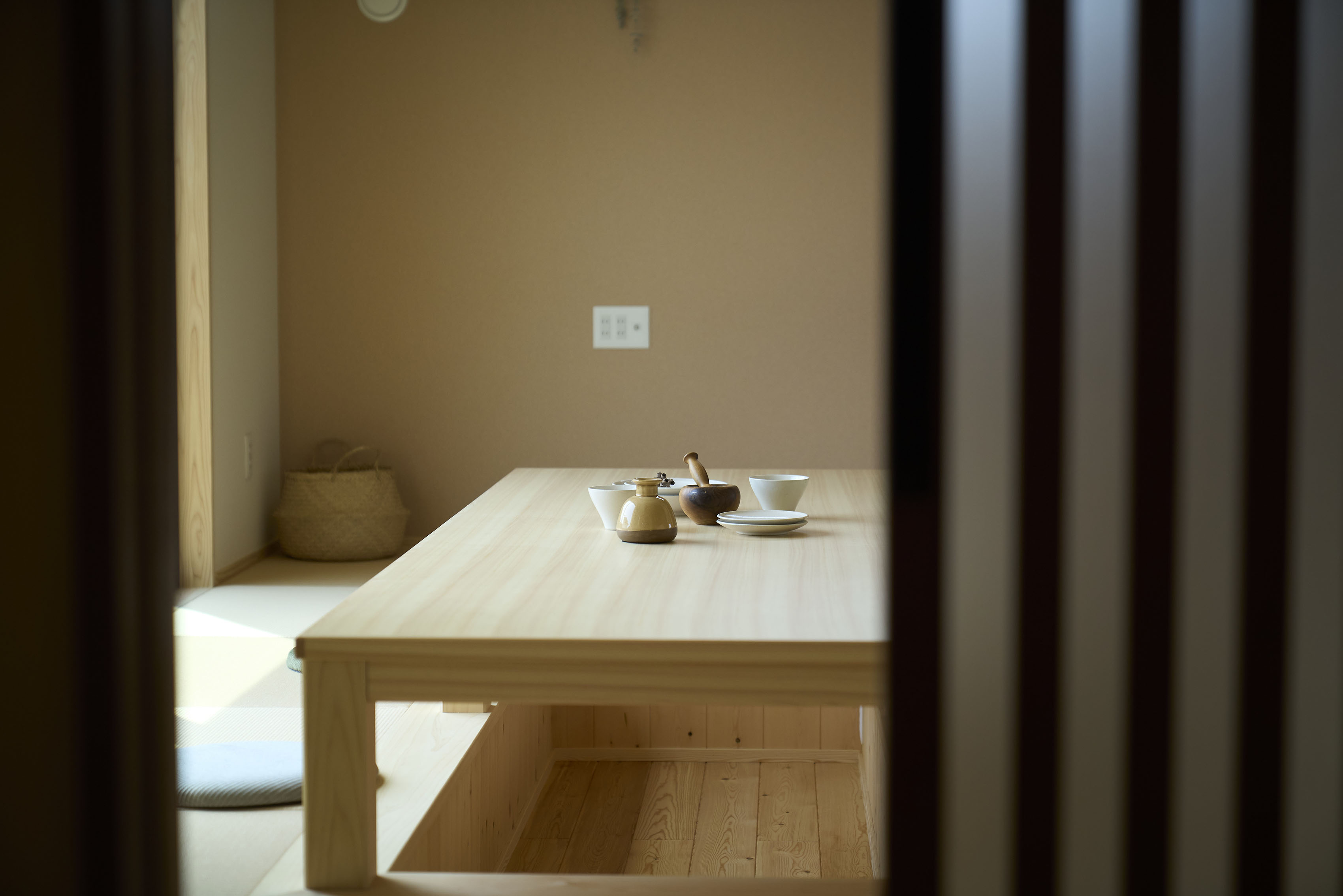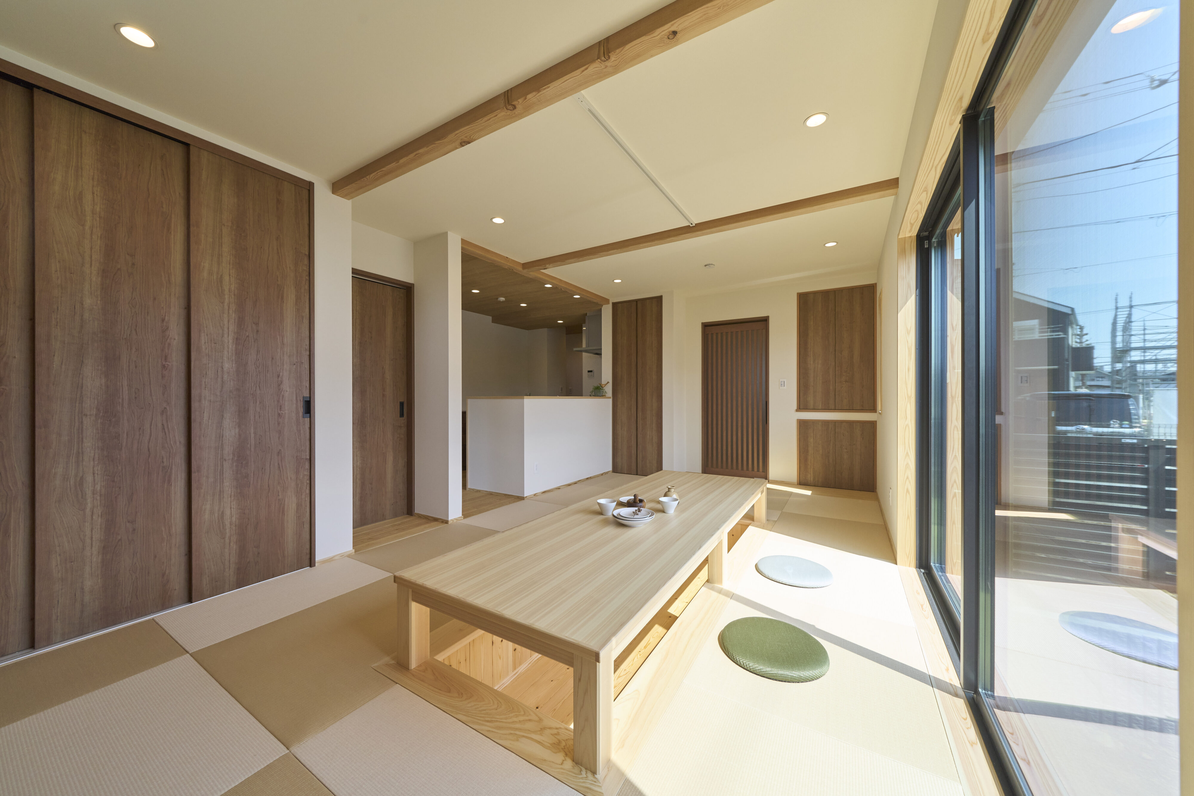 高齢のお母様と暮らす二世帯のお住まい。近隣のお子さまご家族もよく訪ねられるということで、家族が心地よく集まれる空間をご希望されました。 みんなで囲める大きな掘りごたつのある、憩いの畳リビング。家の中で一番日当たりの良い場所に、動線よく配置したお母様のお部屋。夫婦の個室にはちょうど良い距離を保って。回遊動線や使いやすい造作家具で暮らしやすい工夫を。 お話を伺い、住む人も訪ねる人も過ごしやすいようプランを描きました。 家族を思う気持ちを描いたプラン 広い畳リビングには大きな掘り炬燵。ご高齢のお母さまが暮らしやすいよう、暮らし方を大きく変えないよう配慮。1階の日当たりの良い位置にお母さまのお部屋も配置。リビングへもお風呂へも、どこへも行きやすい設計です。 近隣に住むご家族が尋ねられてきても、大きな掘り炬燵リビングで楽しく居心地よく過ごせます。 夫婦の寝室は程よい距離感で 2階にはご夫婦それぞれの個室があるものの、お互いの気配がわかるようオープンにつながっています。 外観はブラックでモダンに