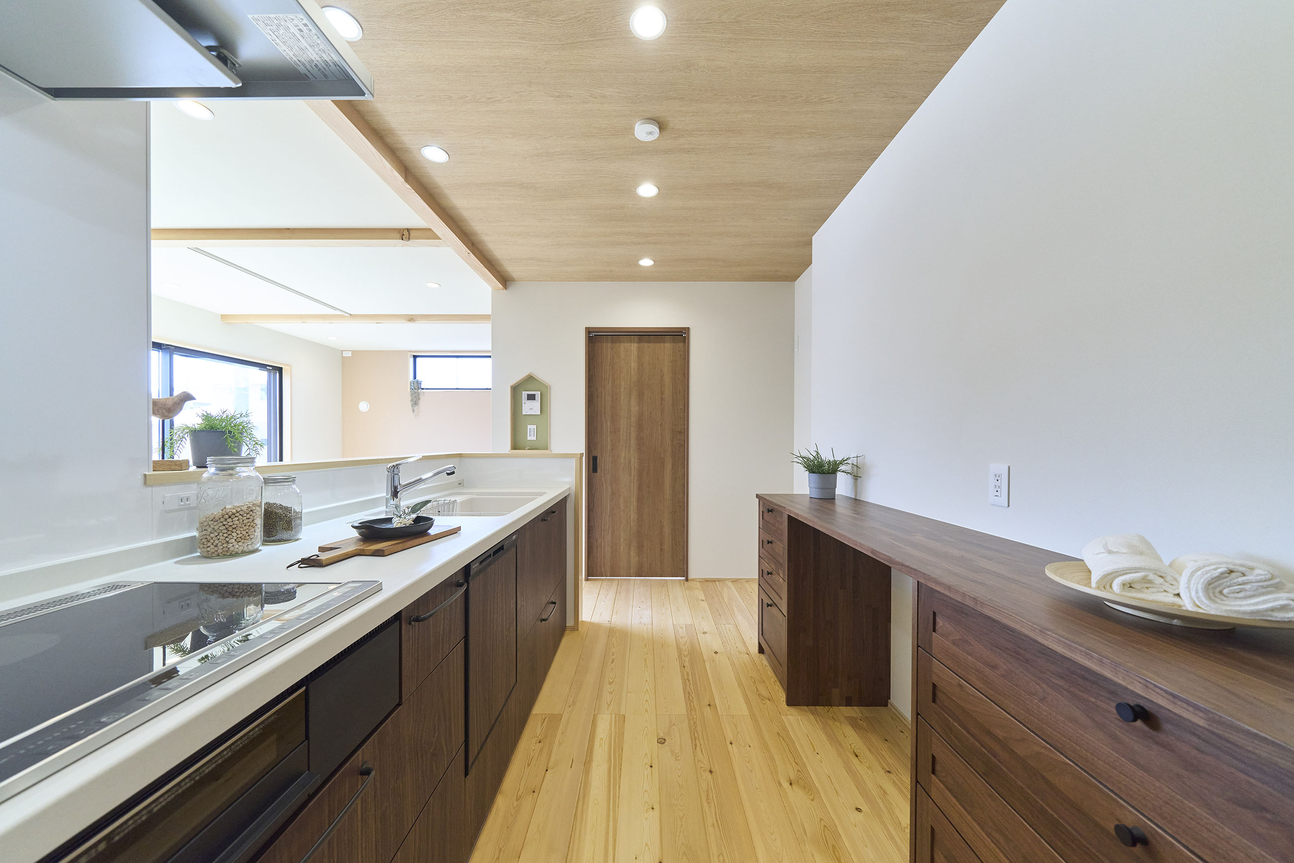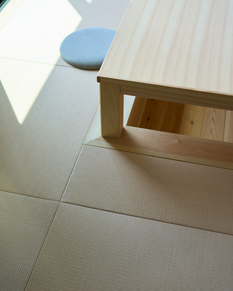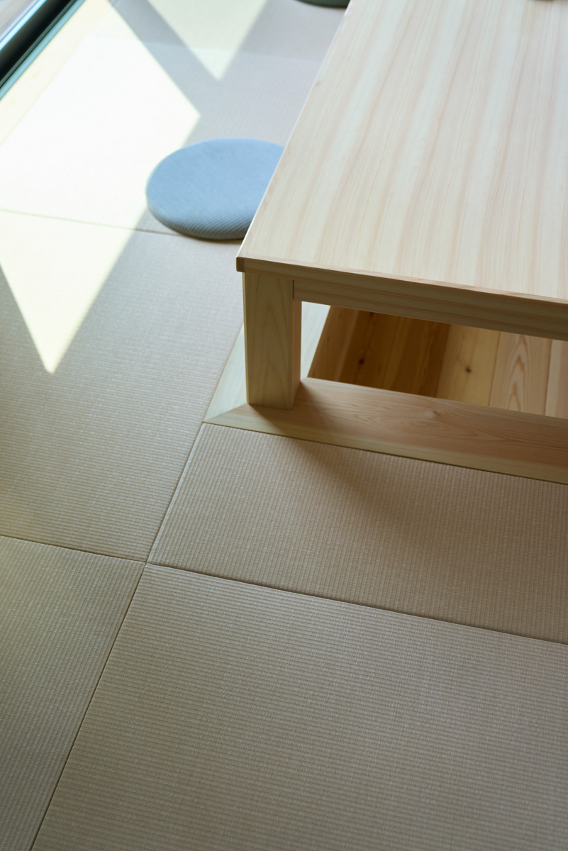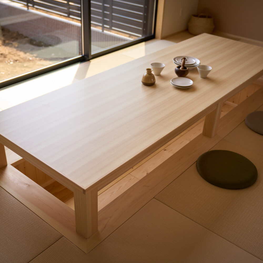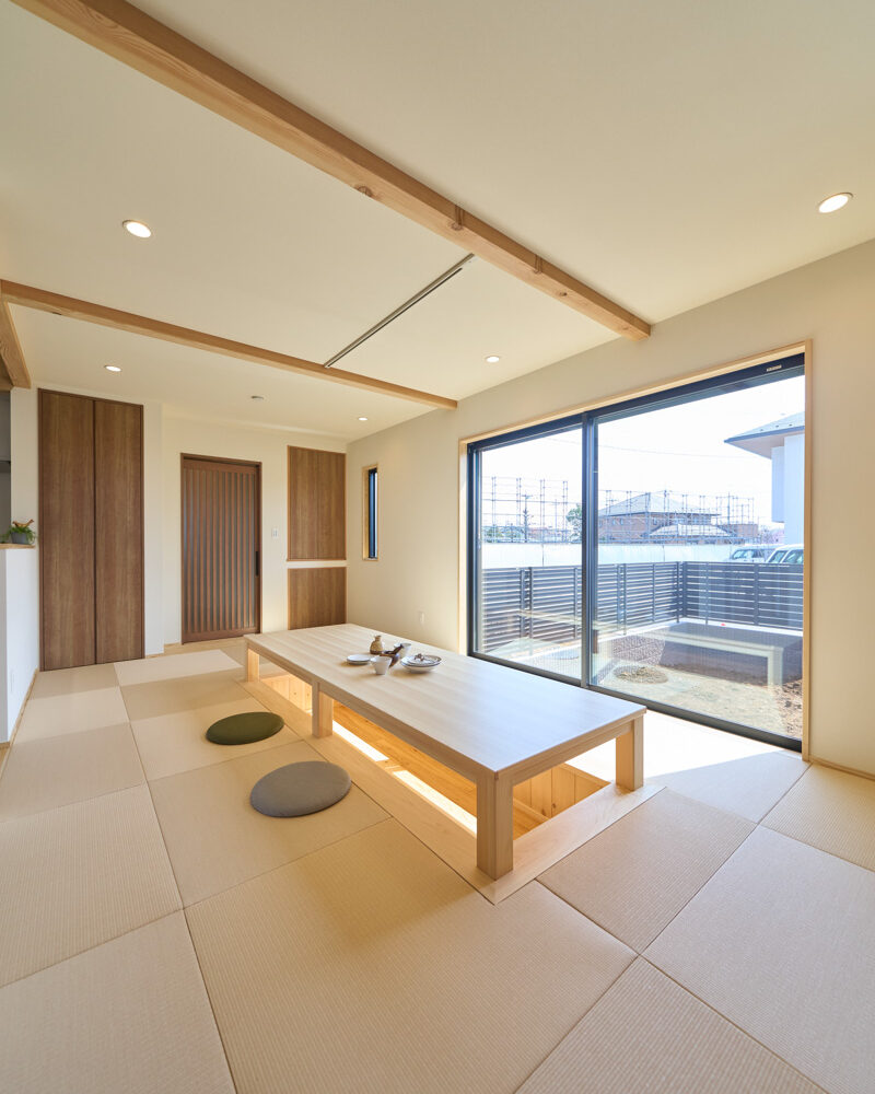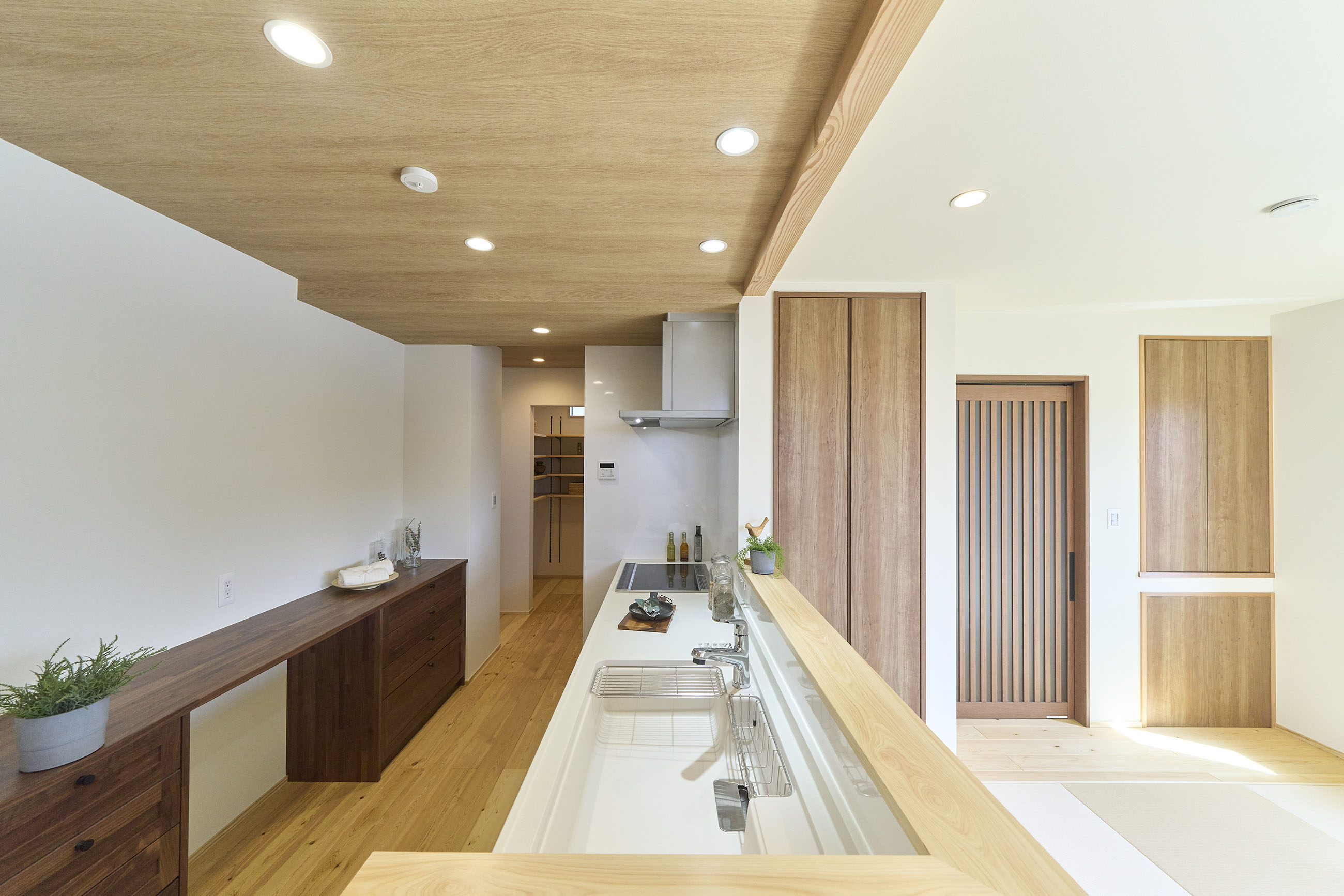 高齢のお母様と暮らす二世帯のお住まい。近隣のお子さまご家族もよく訪ねられるということで、家族が心地よく集まれる空間をご希望されました。 みんなで囲める大きな掘りごたつのある、憩いの畳リビング。家の中で一番日当たりの良い場所に、動線よく配置したお母様のお部屋。夫婦の個室にはちょうど良い距離を保って。回遊動線や使いやすい造作家具で暮らしやすい工夫を。 お話を伺い、住む人も訪ねる人も過ごしやすいようプランを描きました。 家族を思う気持ちを描いたプラン 広い畳リビングには大きな掘り炬燵。ご高齢のお母さまが暮らしやすいよう、暮らし方を大きく変えないよう配慮。1階の日当たりの良い位置にお母さまのお部屋も配置。リビングへもお風呂へも、どこへも行きやすい設計です。 近隣に住むご家族が尋ねられてきても、大きな掘り炬燵リビングで楽しく居心地よく過ごせます。 夫婦の寝室は程よい距離感で 2階にはご夫婦それぞれの個室があるものの、お互いの気配がわかるようオープンにつながっています。 外観はブラックでモダンに