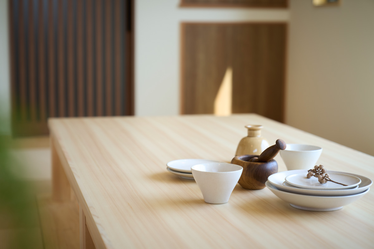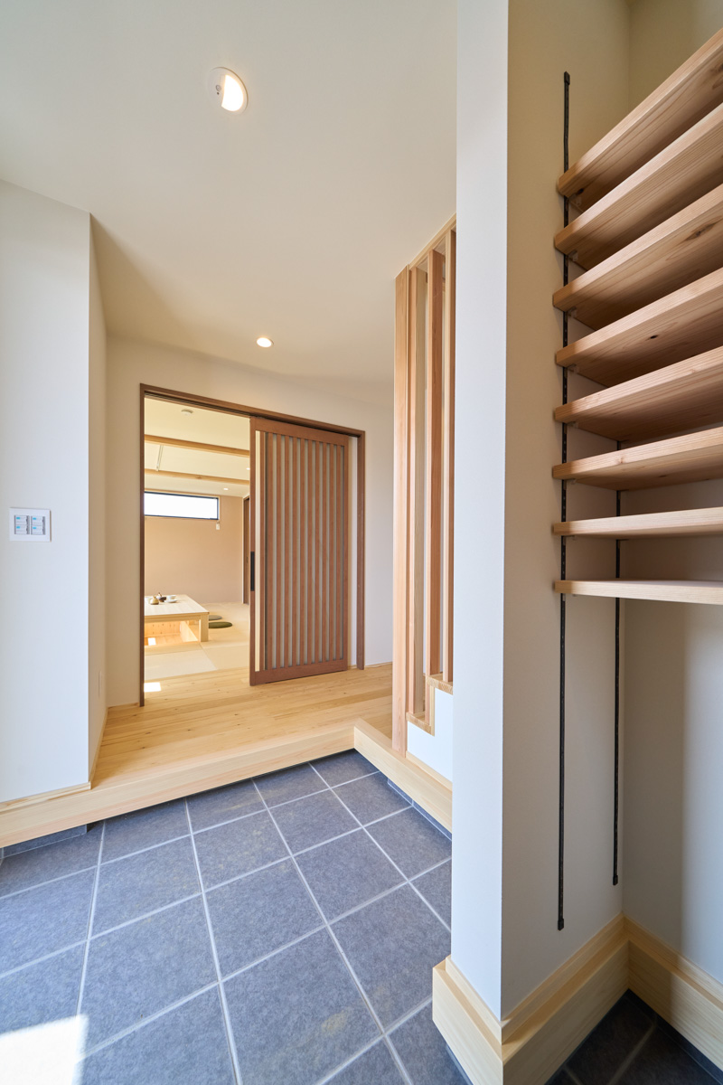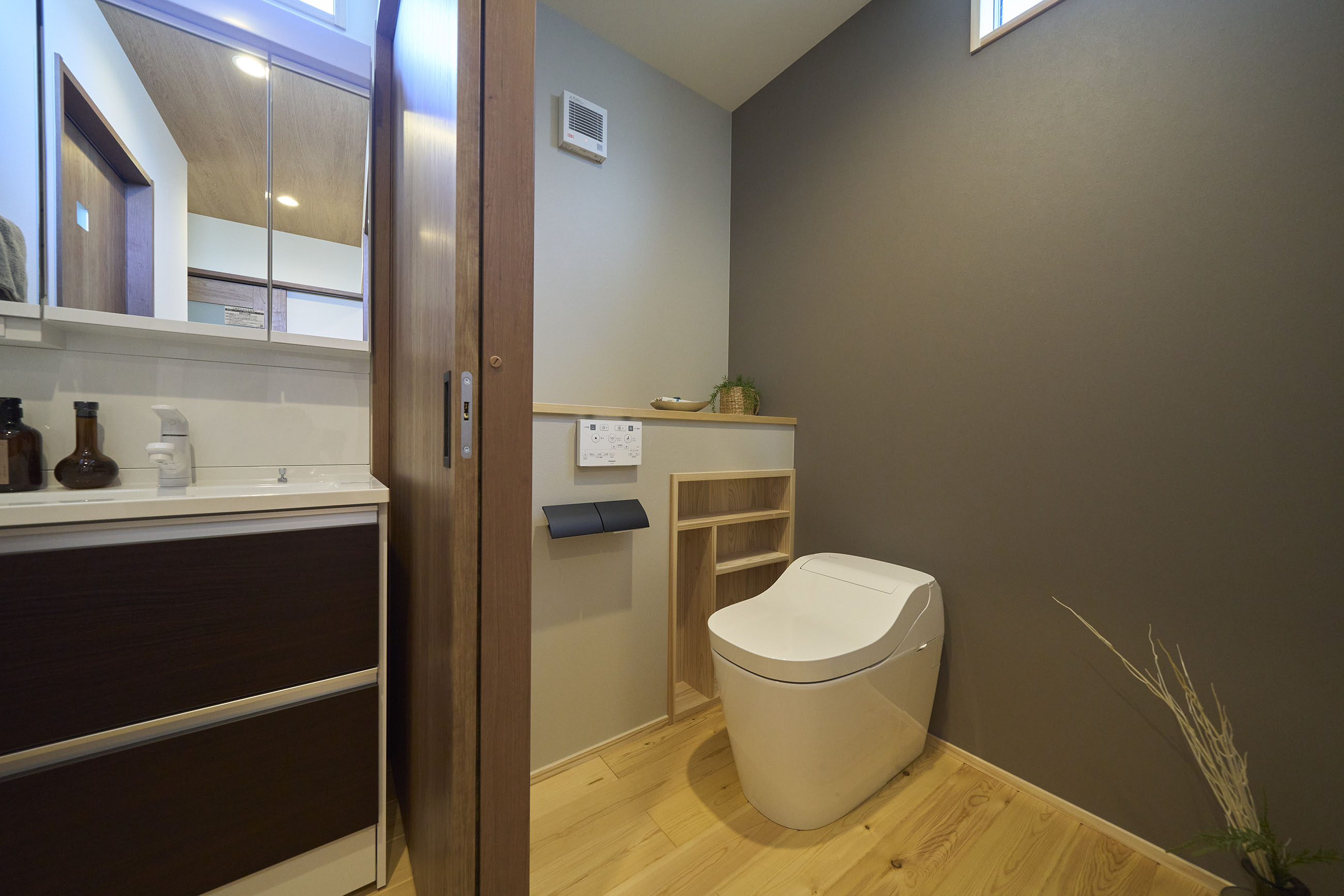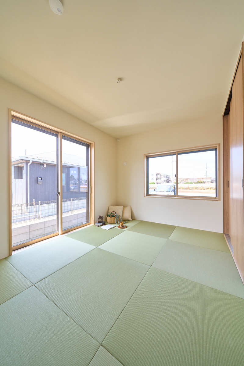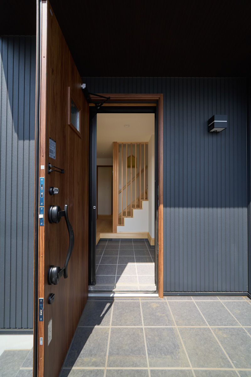 高齢のお母様と暮らす二世帯のお住まい。近隣のお子さまご家族もよく訪ねられるということで、家族が心地よく集まれる空間をご希望されました。 みんなで囲める大きな掘りごたつのある、憩いの畳リビング。家の中で一番日当たりの良い場所に、動線よく配置したお母様のお部屋。夫婦の個室にはちょうど良い距離を保って。回遊動線や使いやすい造作家具で暮らしやすい工夫を。 お話を伺い、住む人も訪ねる人も過ごしやすいようプランを描きました。 家族を思う気持ちを描いたプラン 広い畳リビングには大きな掘り炬燵。ご高齢のお母さまが暮らしやすいよう、暮らし方を大きく変えないよう配慮。1階の日当たりの良い位置にお母さまのお部屋も配置。リビングへもお風呂へも、どこへも行きやすい設計です。 近隣に住むご家族が尋ねられてきても、大きな掘り炬燵リビングで楽しく居心地よく過ごせます。 夫婦の寝室は程よい距離感で 2階にはご夫婦それぞれの個室があるものの、お互いの気配がわかるようオープンにつながっています。 外観はブラックでモダンに