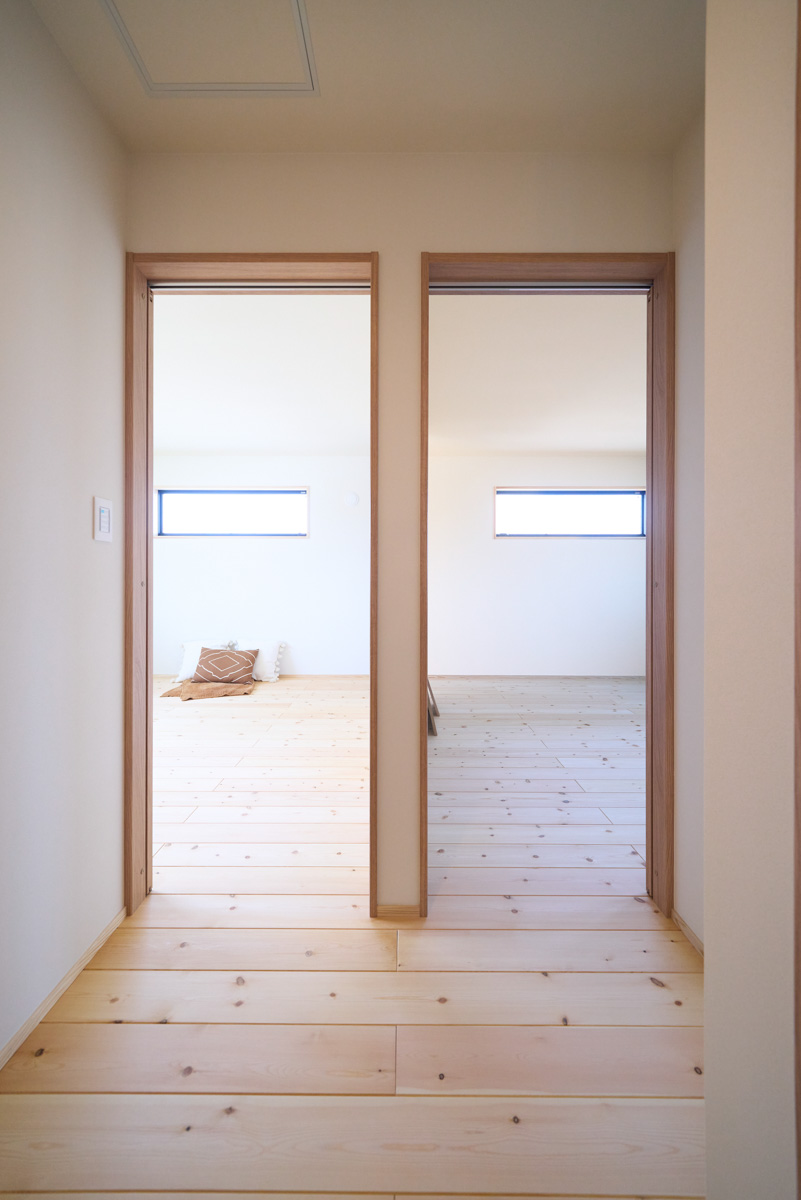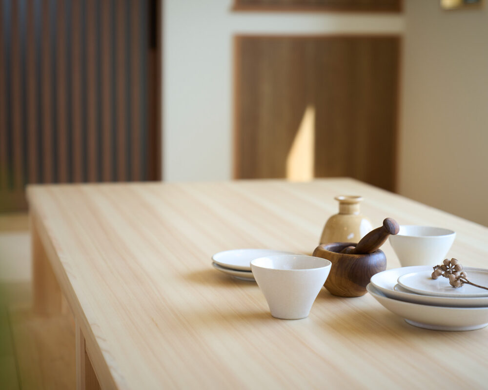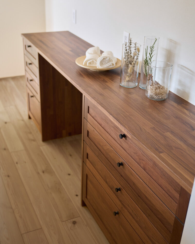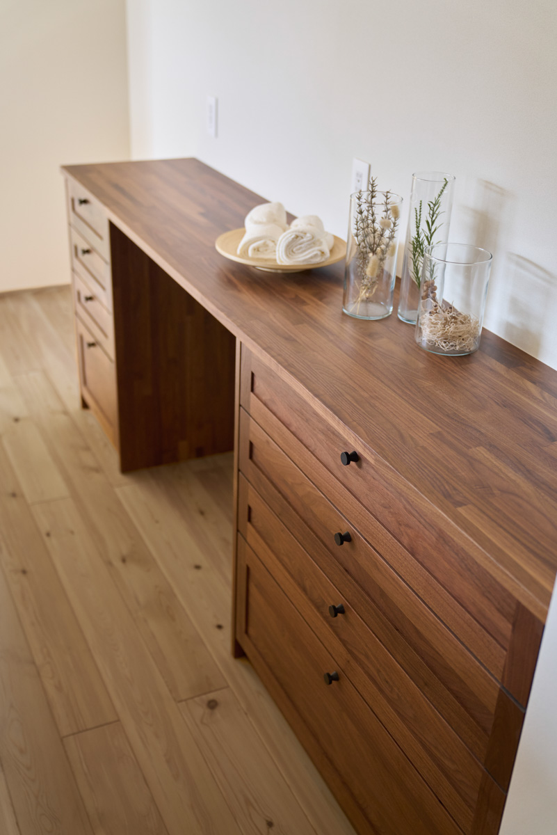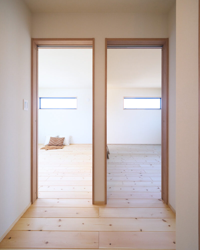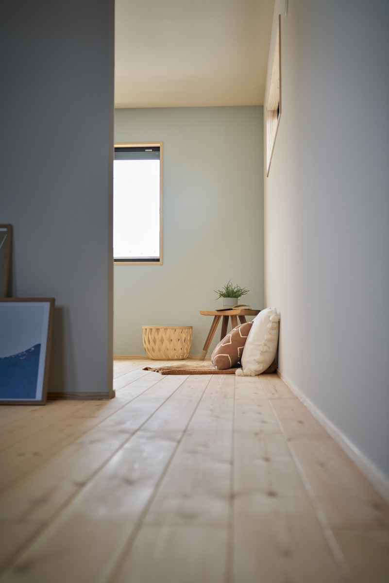 高齢のお母様と暮らす二世帯のお住まい。近隣のお子さまご家族もよく訪ねられるということで、家族が心地よく集まれる空間をご希望されました。 みんなで囲める大きな掘りごたつのある、憩いの畳リビング。家の中で一番日当たりの良い場所に、動線よく配置したお母様のお部屋。夫婦の個室にはちょうど良い距離を保って。回遊動線や使いやすい造作家具で暮らしやすい工夫を。 お話を伺い、住む人も訪ねる人も過ごしやすいようプランを描きました。 家族を思う気持ちを描いたプラン 広い畳リビングには大きな掘り炬燵。ご高齢のお母さまが暮らしやすいよう、暮らし方を大きく変えないよう配慮。1階の日当たりの良い位置にお母さまのお部屋も配置。リビングへもお風呂へも、どこへも行きやすい設計です。 近隣に住むご家族が尋ねられてきても、大きな掘り炬燵リビングで楽しく居心地よく過ごせます。 夫婦の寝室は程よい距離感で 2階にはご夫婦それぞれの個室があるものの、お互いの気配がわかるようオープンにつながっています。 外観はブラックでモダンに