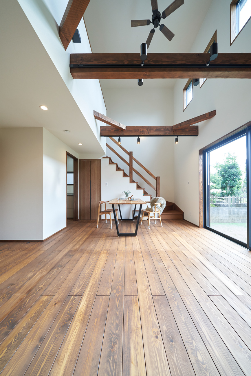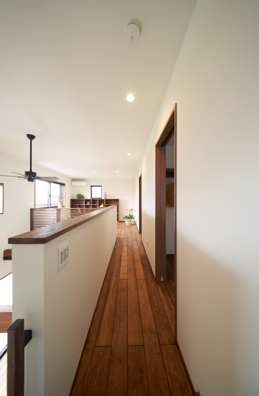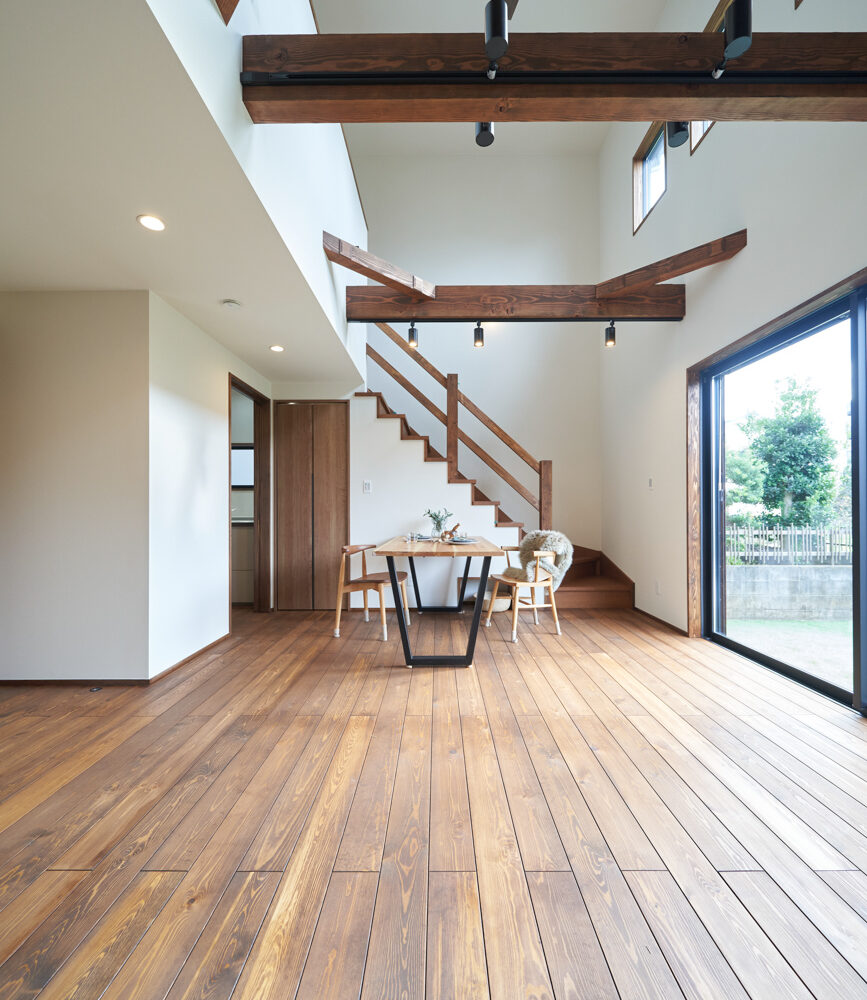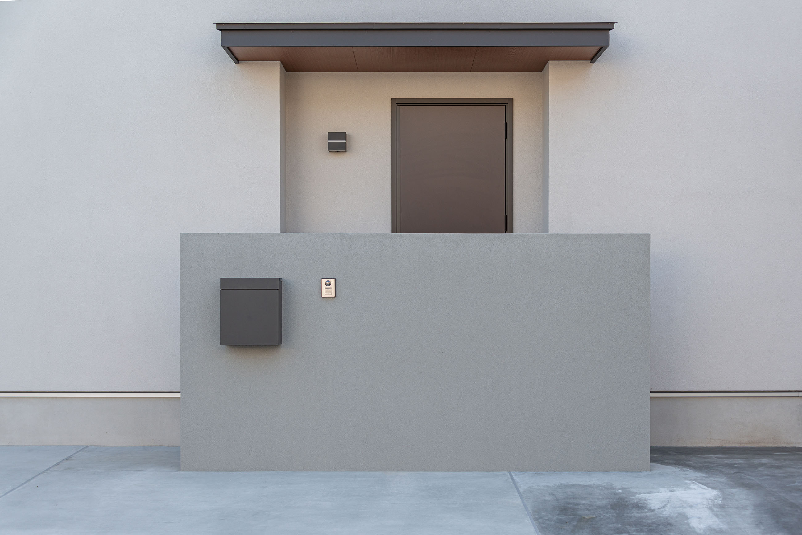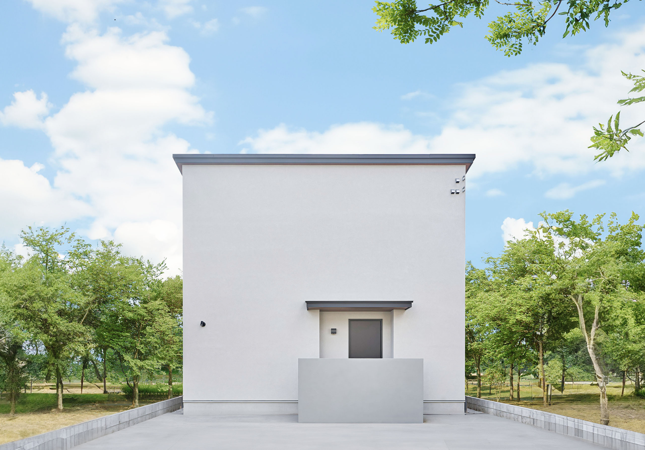 建主様の「箱型の家に住みたい」というご希望と、シムラのスタンダードプランがぴたりと一致しました。玄関側に窓を設けず、箱型のフォルムを強調することで、シンプルでありながら存在感のあるデザインに仕上がっています。