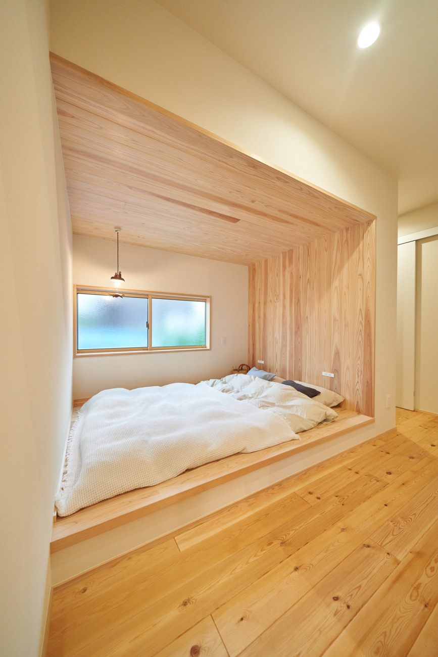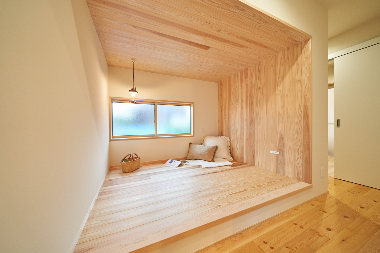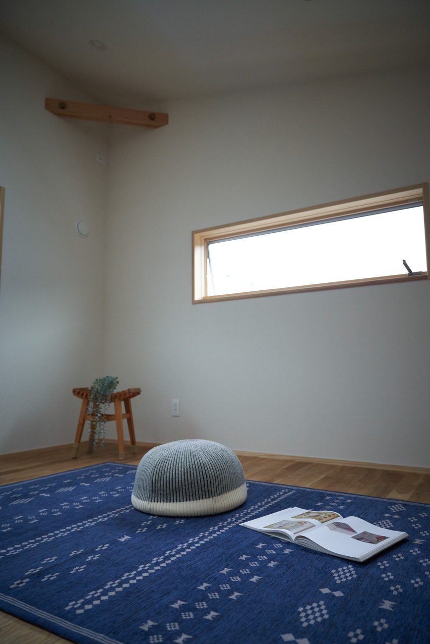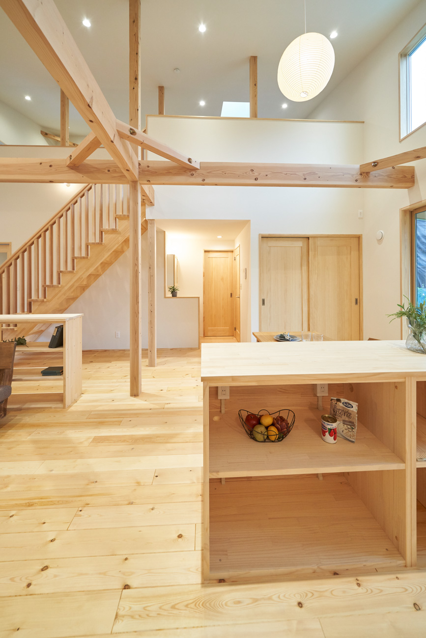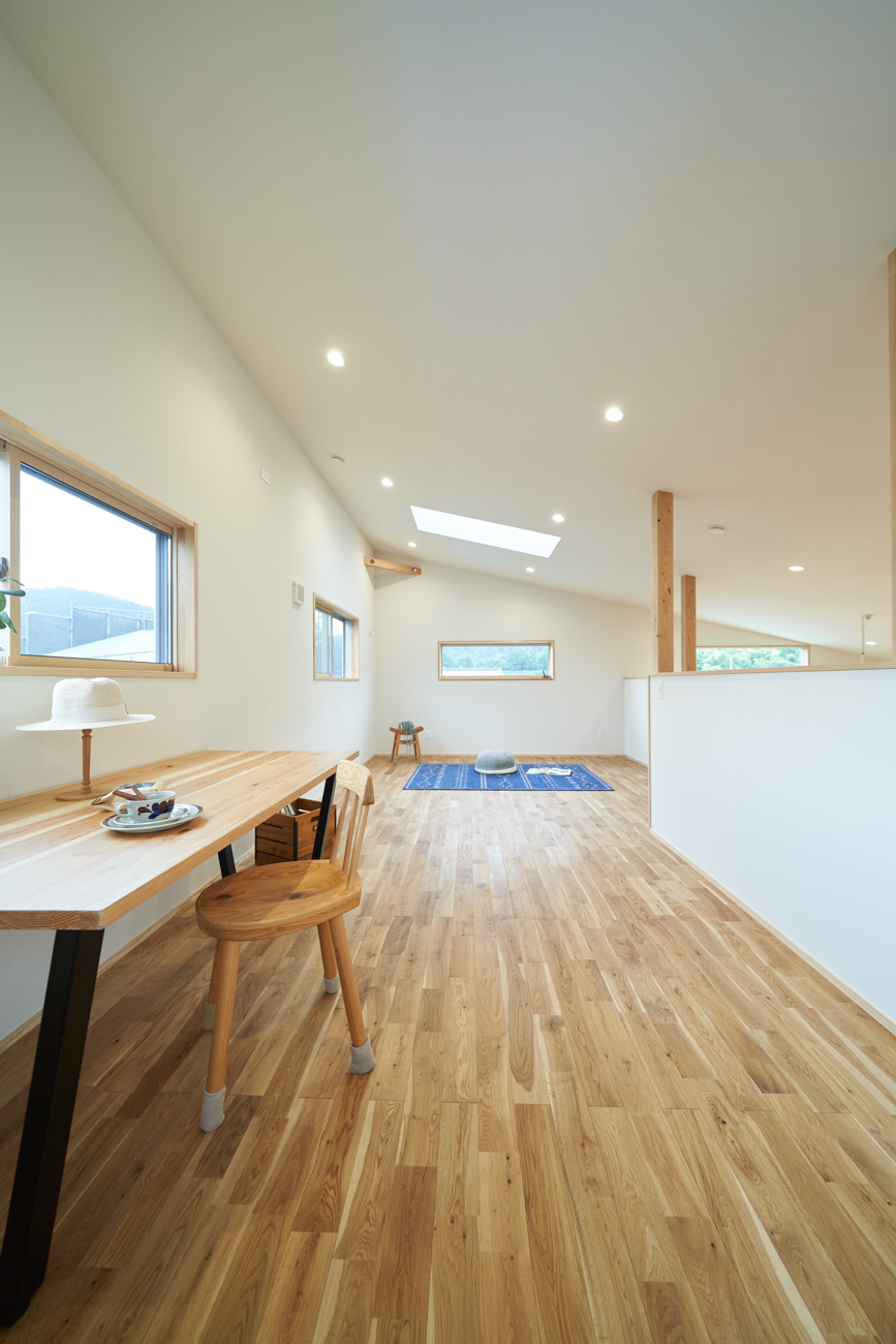 吹き抜けでつながる上下階一体の大空間。使い方様々な広い土間。心地よくまどろむヌックスタイルの寝室。ぐるりと動きやすい回遊動線。シンプルなプランに、機能性とこだわりと余白を心地よくミックスした平屋スタイルのお住まいです。 大開放の吹き抜けリビング 圧倒される大きな吹き抜けでつながる上下階。1Fで暮らしが完結する平屋スタイルでシンプルにプランニングされています。土地の特徴を活かし、近隣の長閑な風景を大きく切り取る窓の配置で、家中に外光と風を届けてくれます。玄関の土間は通り土間のように広く、モルタルのシンプルな仕上げに。 造作でキッチンとリビングに棚を制作。備え付けのため、地震などにも倒れることがないので安心。 吹き抜けでつながるフリースペース 2階は広い仕事部屋。家族の変化に伴って、個室として利用することも。トップライトをつけて明るさを。 かわうそが住むヌックベッド コの字に杉のパネリングで装ったヌックスタイルの寝室は居心地抜群。かわいいカワウソ家族の照明が照らしてくれます。 機能性を集約した回遊動線 ダイニングから寝室を通ってリビングへ回遊できる動線。動線上には手洗い・洗面・浴室・ランドリースペース・オープンクローゼットと、機能設備が並んでいて、家事でのアクションがコンパクトに。