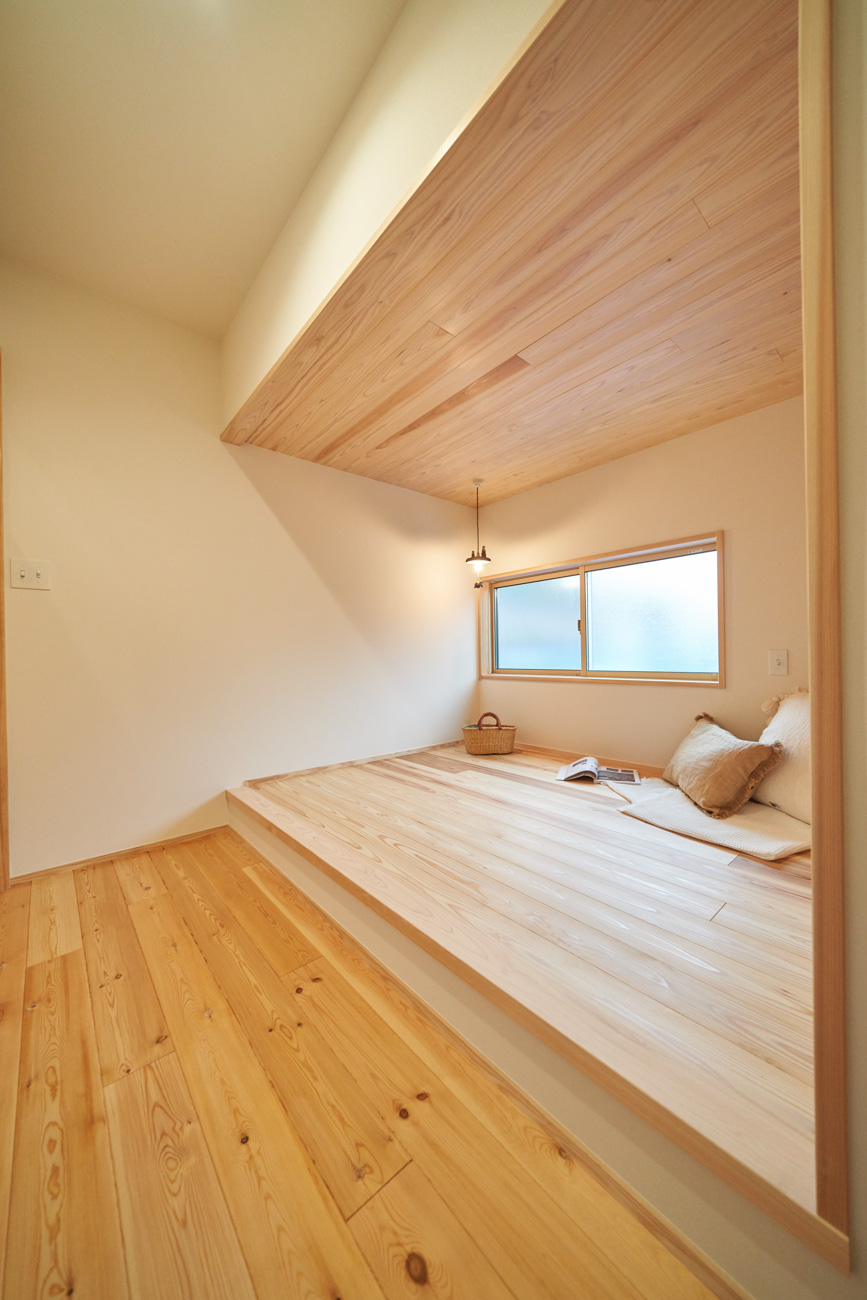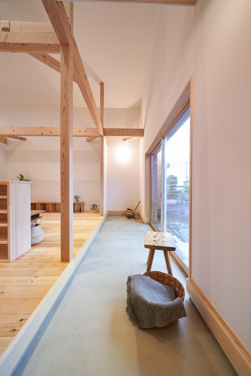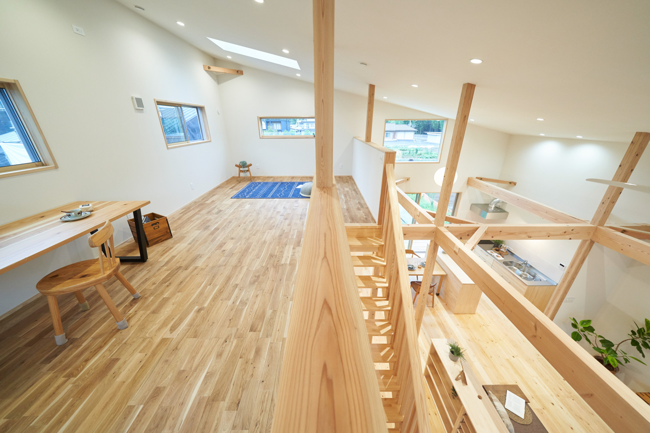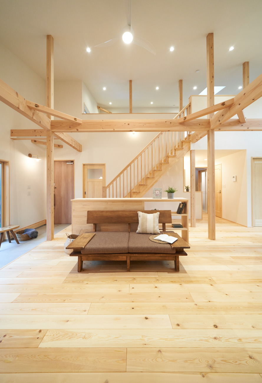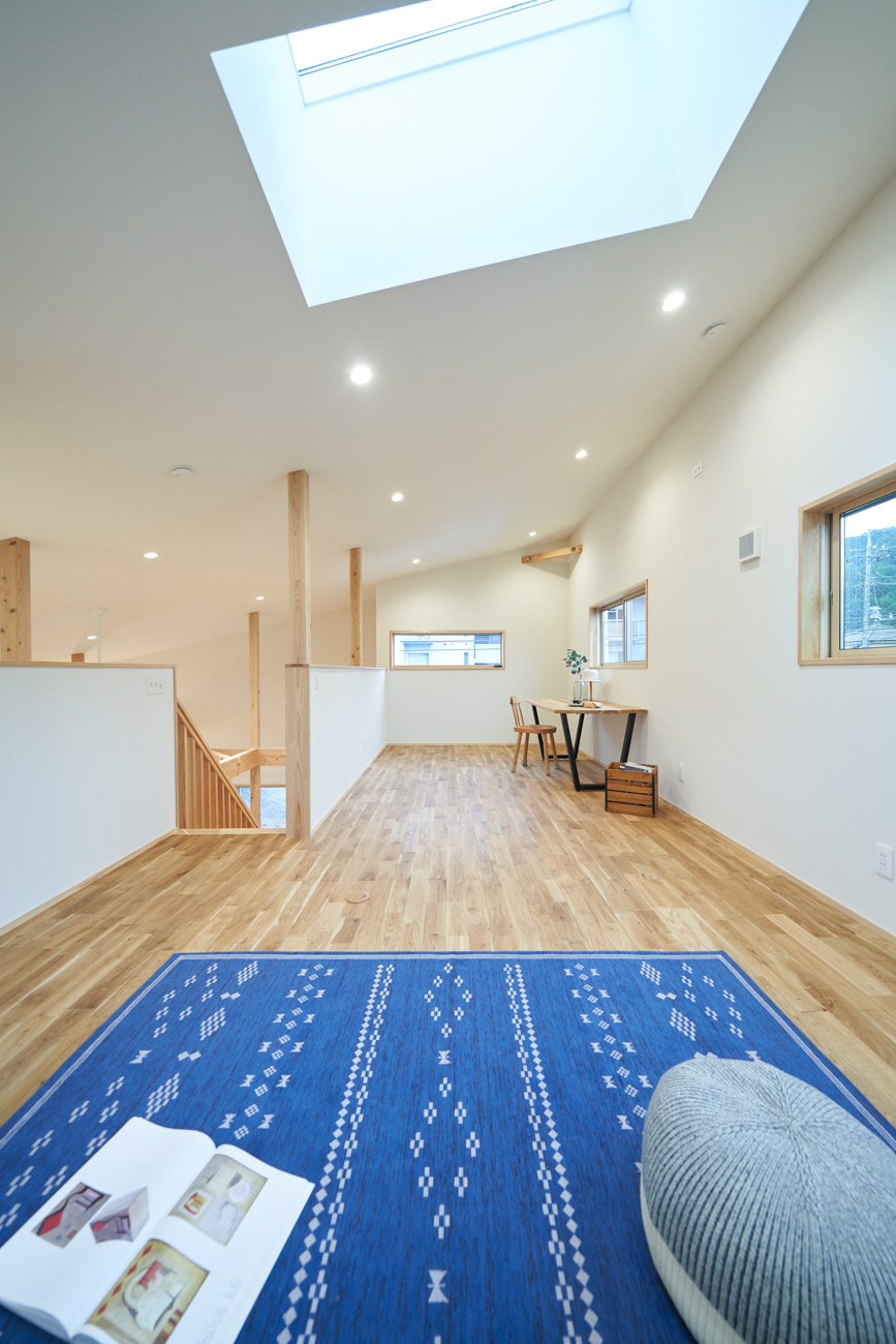 吹き抜けでつながる上下階一体の大空間。使い方様々な広い土間。心地よくまどろむヌックスタイルの寝室。ぐるりと動きやすい回遊動線。シンプルなプランに、機能性とこだわりと余白を心地よくミックスした平屋スタイルのお住まいです。 大開放の吹き抜けリビング 圧倒される大きな吹き抜けでつながる上下階。1Fで暮らしが完結する平屋スタイルでシンプルにプランニングされています。土地の特徴を活かし、近隣の長閑な風景を大きく切り取る窓の配置で、家中に外光と風を届けてくれます。玄関の土間は通り土間のように広く、モルタルのシンプルな仕上げに。 造作でキッチンとリビングに棚を制作。備え付けのため、地震などにも倒れることがないので安心。 吹き抜けでつながるフリースペース 2階は広い仕事部屋。家族の変化に伴って、個室として利用することも。トップライトをつけて明るさを。 かわうそが住むヌックベッド コの字に杉のパネリングで装ったヌックスタイルの寝室は居心地抜群。かわいいカワウソ家族の照明が照らしてくれます。 機能性を集約した回遊動線 ダイニングから寝室を通ってリビングへ回遊できる動線。動線上には手洗い・洗面・浴室・ランドリースペース・オープンクローゼットと、機能設備が並んでいて、家事でのアクションがコンパクトに。