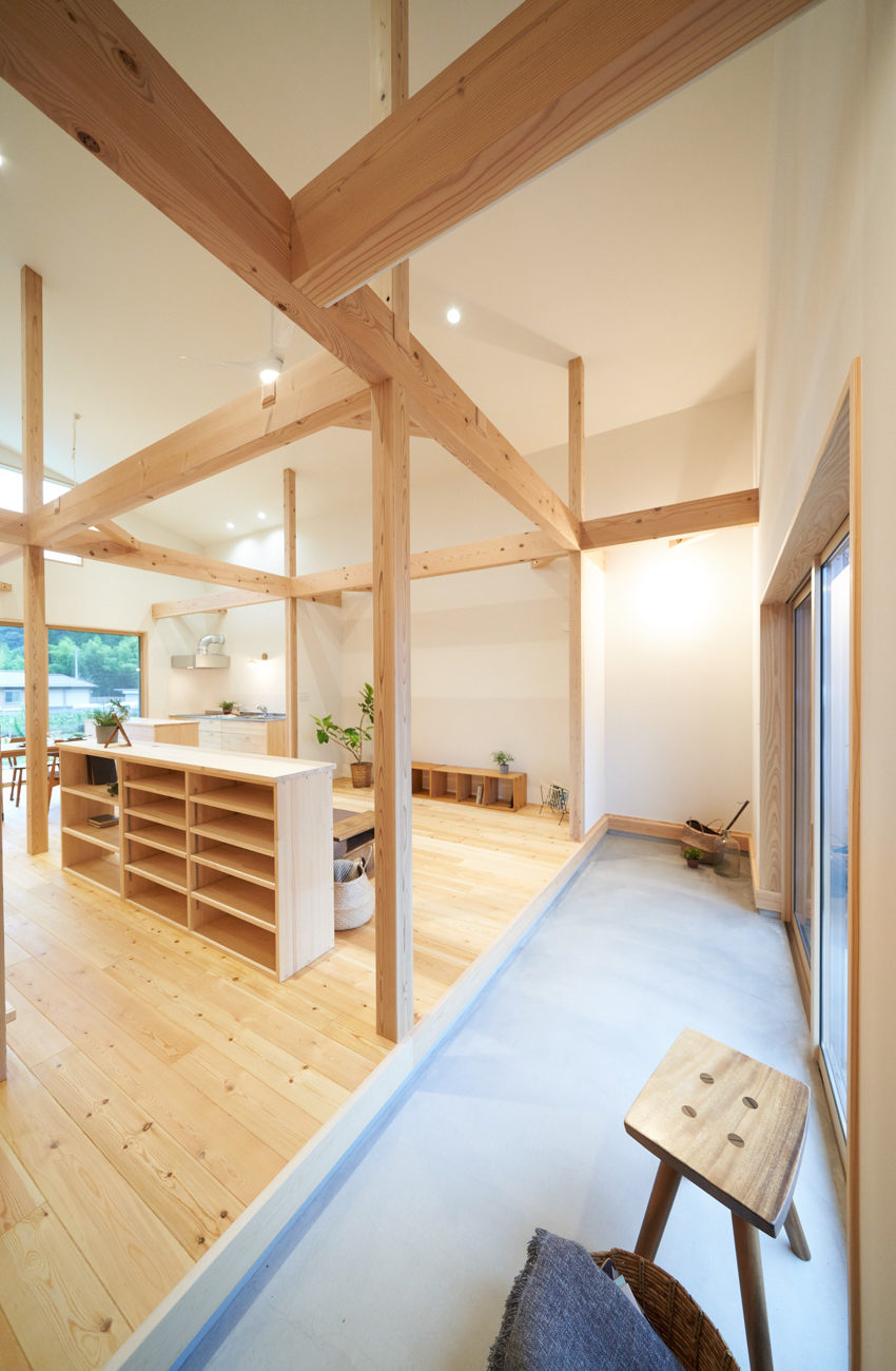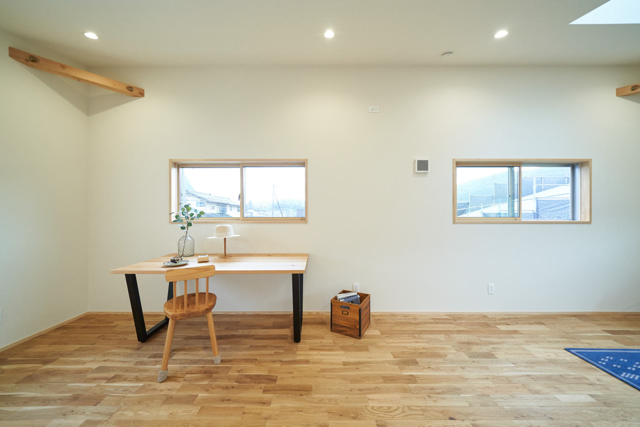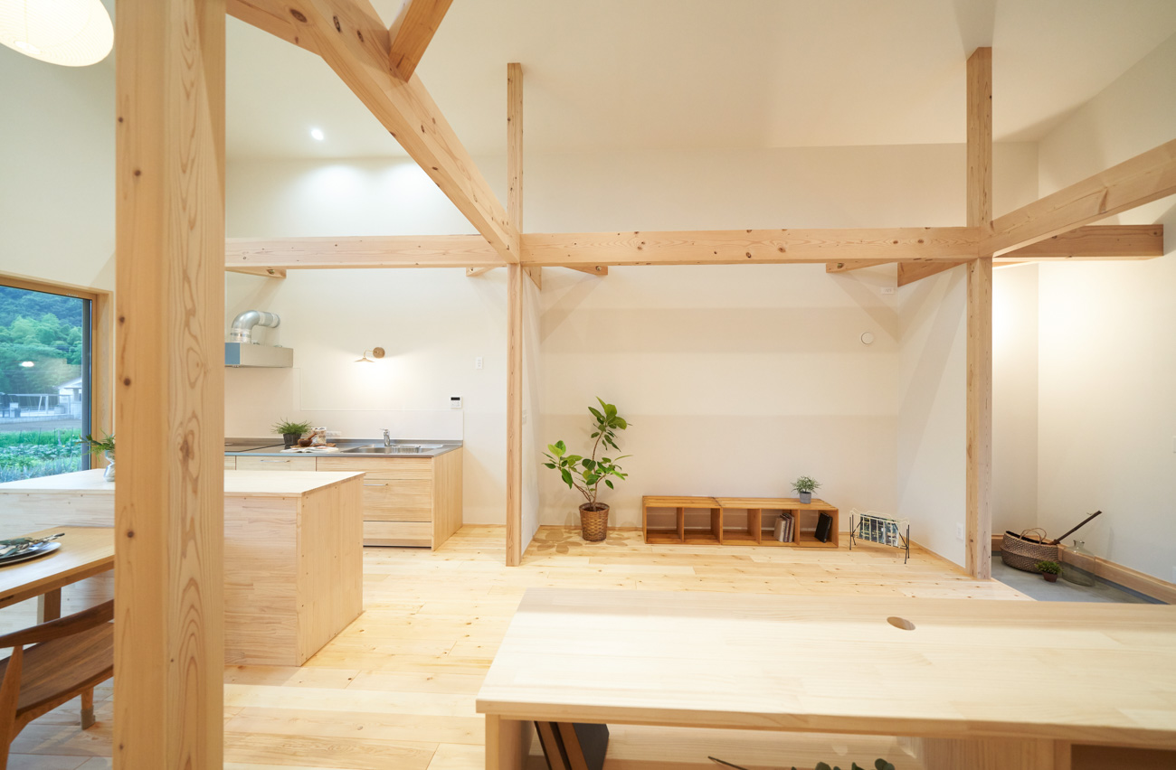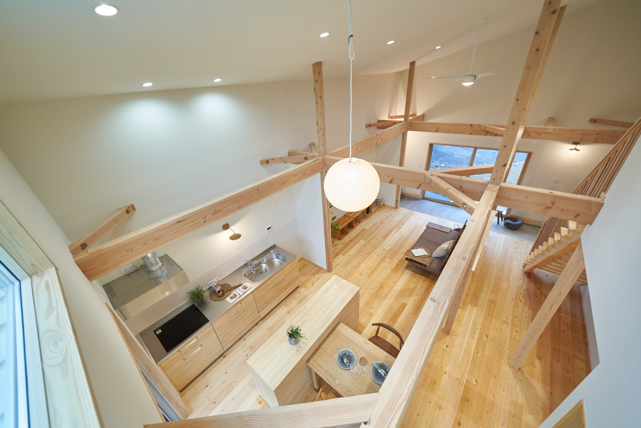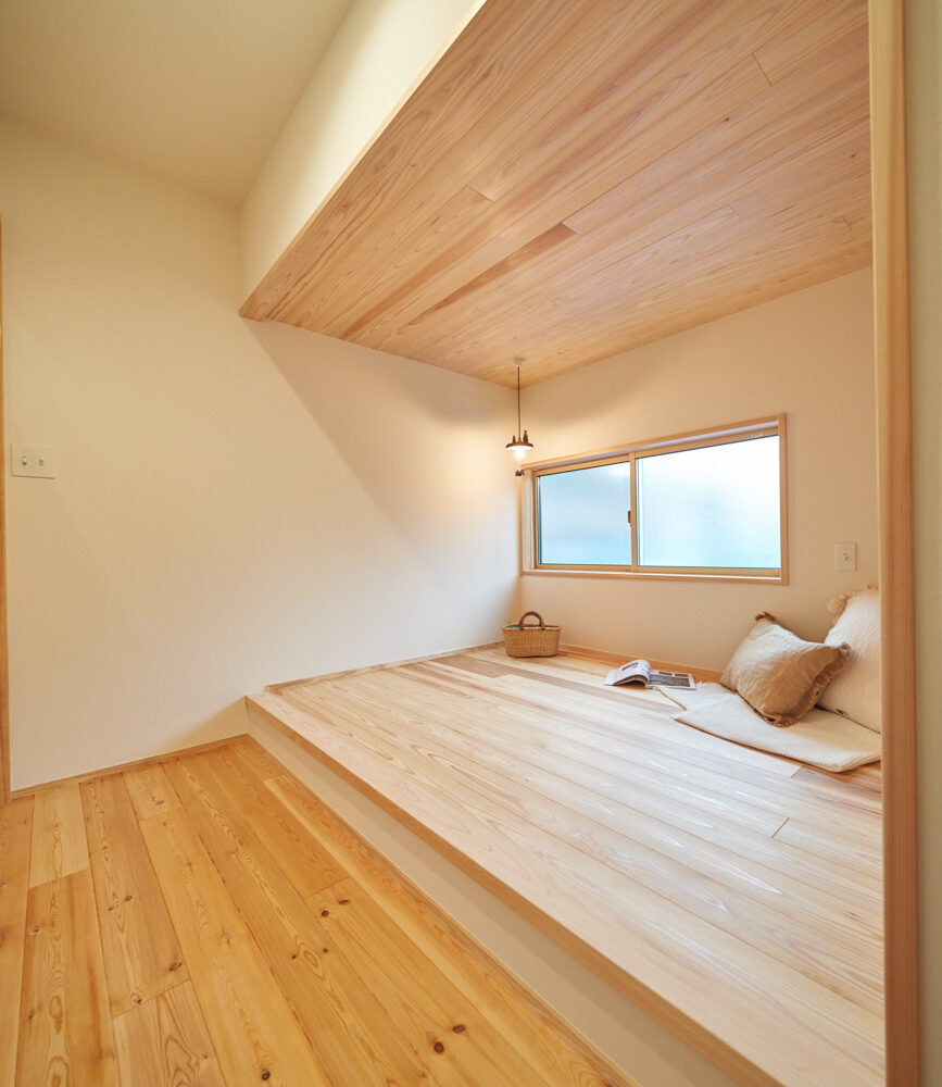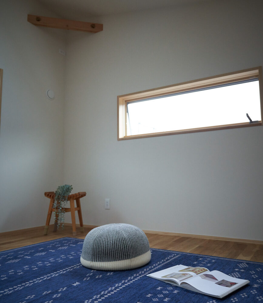 吹き抜けでつながる上下階一体の大空間。使い方様々な広い土間。心地よくまどろむヌックスタイルの寝室。ぐるりと動きやすい回遊動線。シンプルなプランに、機能性とこだわりと余白を心地よくミックスした平屋スタイルのお住まいです。 大開放の吹き抜けリビング 圧倒される大きな吹き抜けでつながる上下階。1Fで暮らしが完結する平屋スタイルでシンプルにプランニングされています。土地の特徴を活かし、近隣の長閑な風景を大きく切り取る窓の配置で、家中に外光と風を届けてくれます。玄関の土間は通り土間のように広く、モルタルのシンプルな仕上げに。 造作でキッチンとリビングに棚を制作。備え付けのため、地震などにも倒れることがないので安心。 吹き抜けでつながるフリースペース 2階は広い仕事部屋。家族の変化に伴って、個室として利用することも。トップライトをつけて明るさを。 かわうそが住むヌックベッド コの字に杉のパネリングで装ったヌックスタイルの寝室は居心地抜群。かわいいカワウソ家族の照明が照らしてくれます。 機能性を集約した回遊動線 ダイニングから寝室を通ってリビングへ回遊できる動線。動線上には手洗い・洗面・浴室・ランドリースペース・オープンクローゼットと、機能設備が並んでいて、家事でのアクションがコンパクトに。