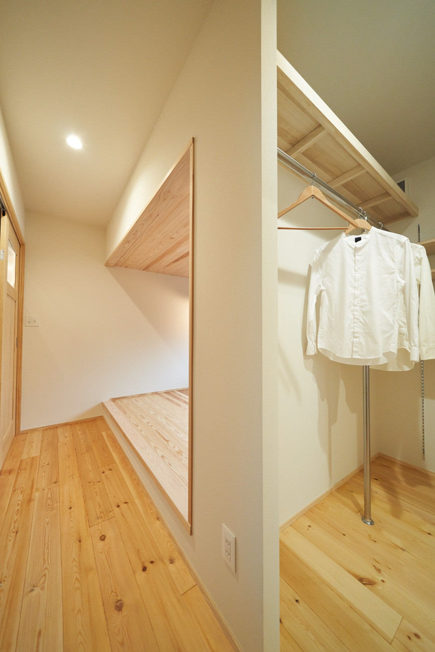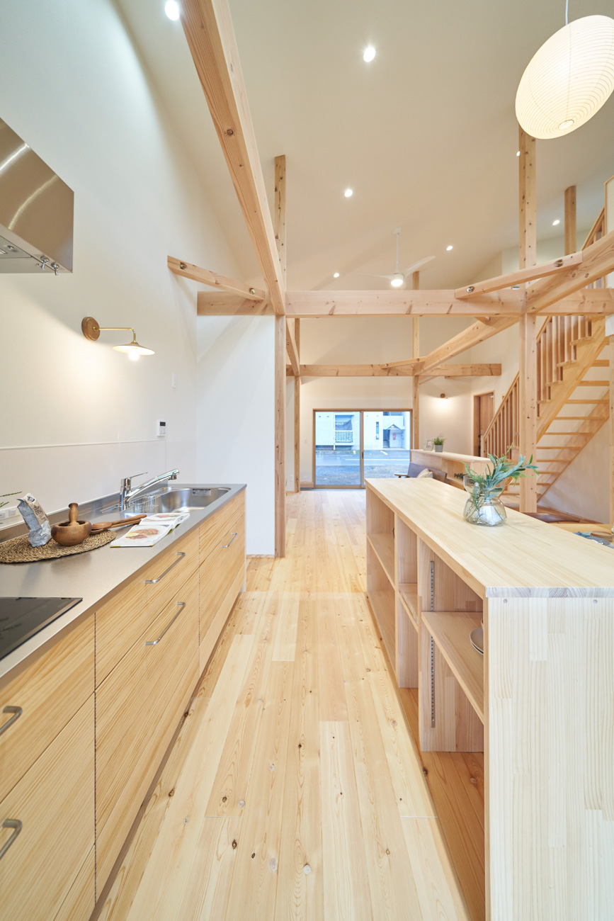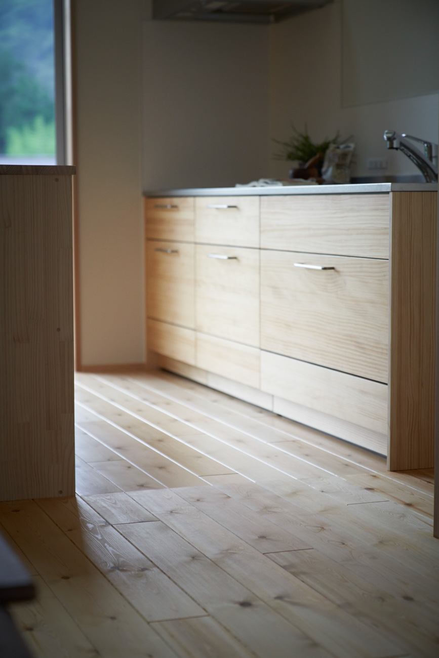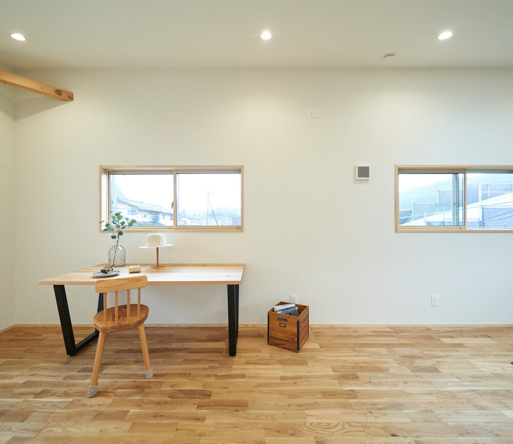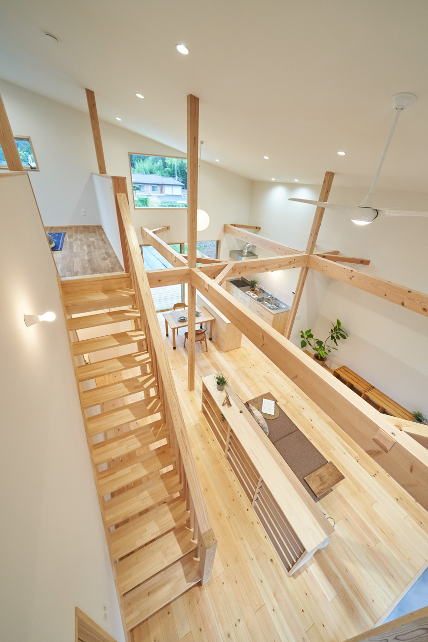吹き抜けでつながる上下階一体の大空間。使い方様々な広い土間。心地よくまどろむヌックスタイルの寝室。ぐるりと動きやすい回遊動線。シンプルなプランに、機能性とこだわりと余白を心地よくミックスした平屋スタイルのお住まいです。 大開放の吹き抜けリビング 圧倒される大きな吹き抜けでつながる上下階。1Fで暮らしが完結する平屋スタイルでシンプルにプランニングされています。土地の特徴を活かし、近隣の長閑な風景を大きく切り取る窓の配置で、家中に外光と風を届けてくれます。玄関の土間は通り土間のように広く、モルタルのシンプルな仕上げに。 造作でキッチンとリビングに棚を制作。備え付けのため、地震などにも倒れることがないので安心。 吹き抜けでつながるフリースペース 2階は広い仕事部屋。家族の変化に伴って、個室として利用することも。トップライトをつけて明るさを。 かわうそが住むヌックベッド コの字に杉のパネリングで装ったヌックスタイルの寝室は居心地抜群。かわいいカワウソ家族の照明が照らしてくれます。 機能性を集約した回遊動線 ダイニングから寝室を通ってリビングへ回遊できる動線。動線上には手洗い・洗面・浴室・ランドリースペース・オープンクローゼットと、機能設備が並んでいて、家事でのアクションがコンパクトに。