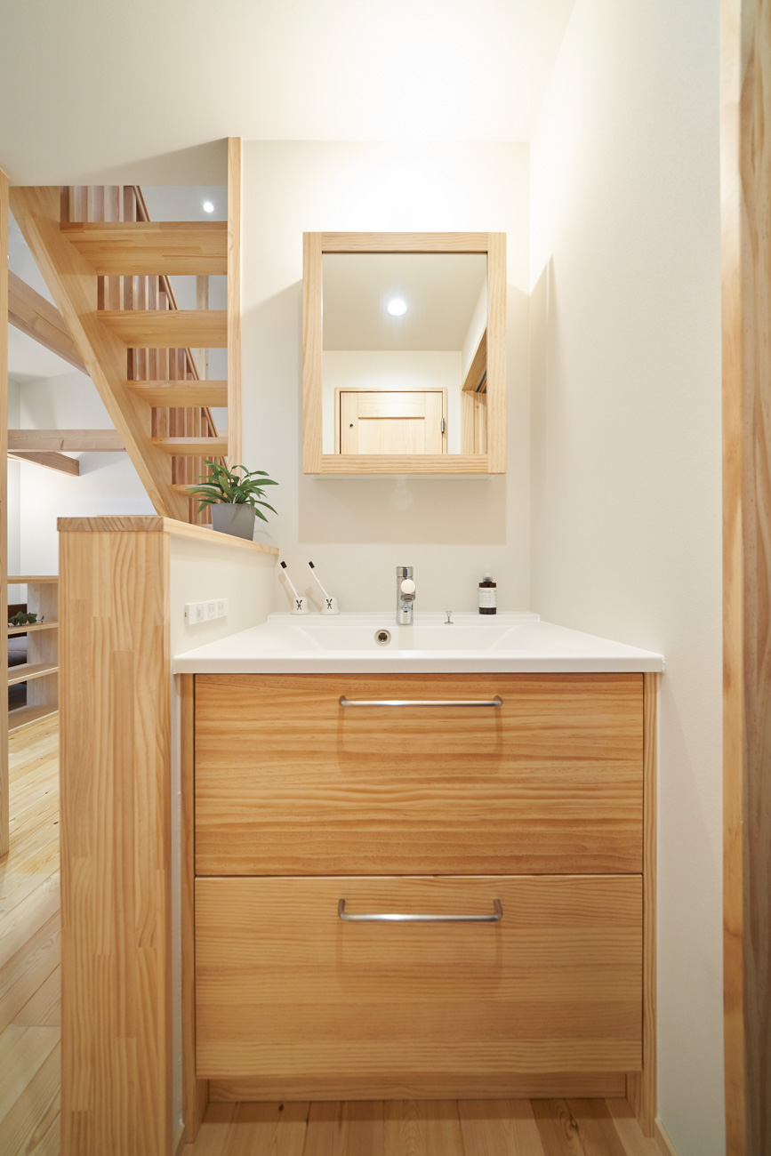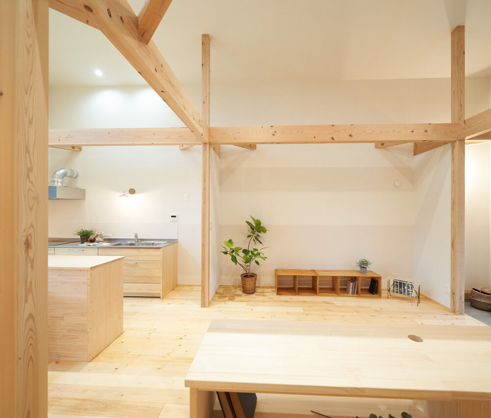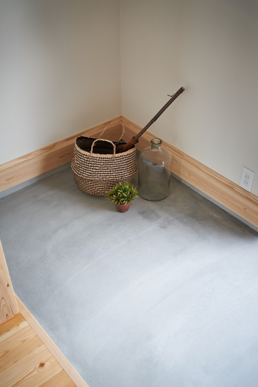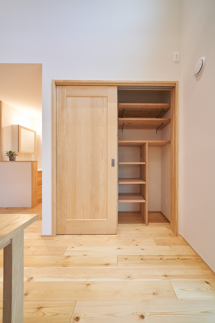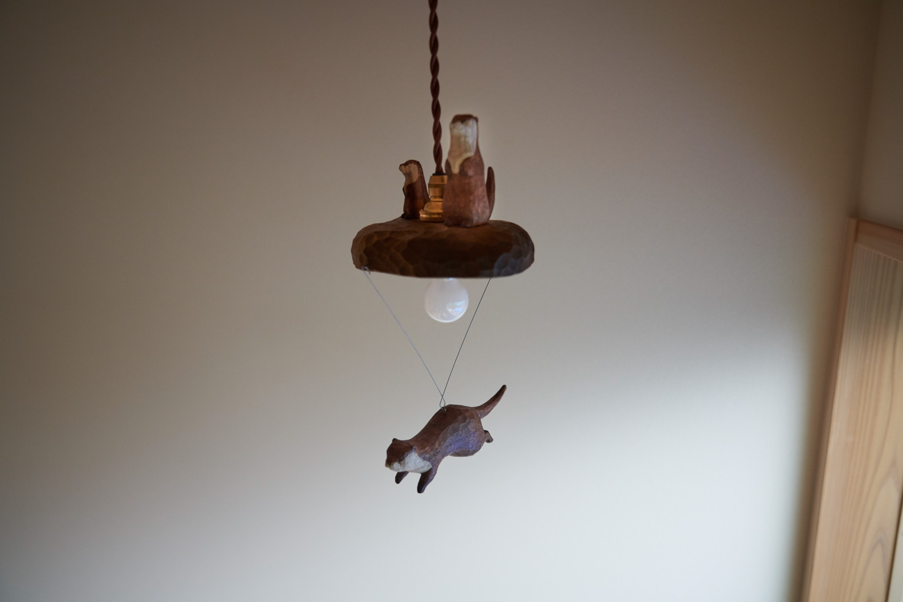 吹き抜けでつながる上下階一体の大空間。使い方様々な広い土間。心地よくまどろむヌックスタイルの寝室。ぐるりと動きやすい回遊動線。シンプルなプランに、機能性とこだわりと余白を心地よくミックスした平屋スタイルのお住まいです。 大開放の吹き抜けリビング 圧倒される大きな吹き抜けでつながる上下階。1Fで暮らしが完結する平屋スタイルでシンプルにプランニングされています。土地の特徴を活かし、近隣の長閑な風景を大きく切り取る窓の配置で、家中に外光と風を届けてくれます。玄関の土間は通り土間のように広く、モルタルのシンプルな仕上げに。 造作でキッチンとリビングに棚を制作。備え付けのため、地震などにも倒れることがないので安心。 吹き抜けでつながるフリースペース 2階は広い仕事部屋。家族の変化に伴って、個室として利用することも。トップライトをつけて明るさを。 かわうそが住むヌックベッド コの字に杉のパネリングで装ったヌックスタイルの寝室は居心地抜群。かわいいカワウソ家族の照明が照らしてくれます。 機能性を集約した回遊動線 ダイニングから寝室を通ってリビングへ回遊できる動線。動線上には手洗い・洗面・浴室・ランドリースペース・オープンクローゼットと、機能設備が並んでいて、家事でのアクションがコンパクトに。