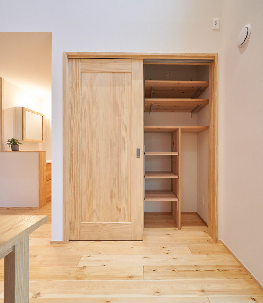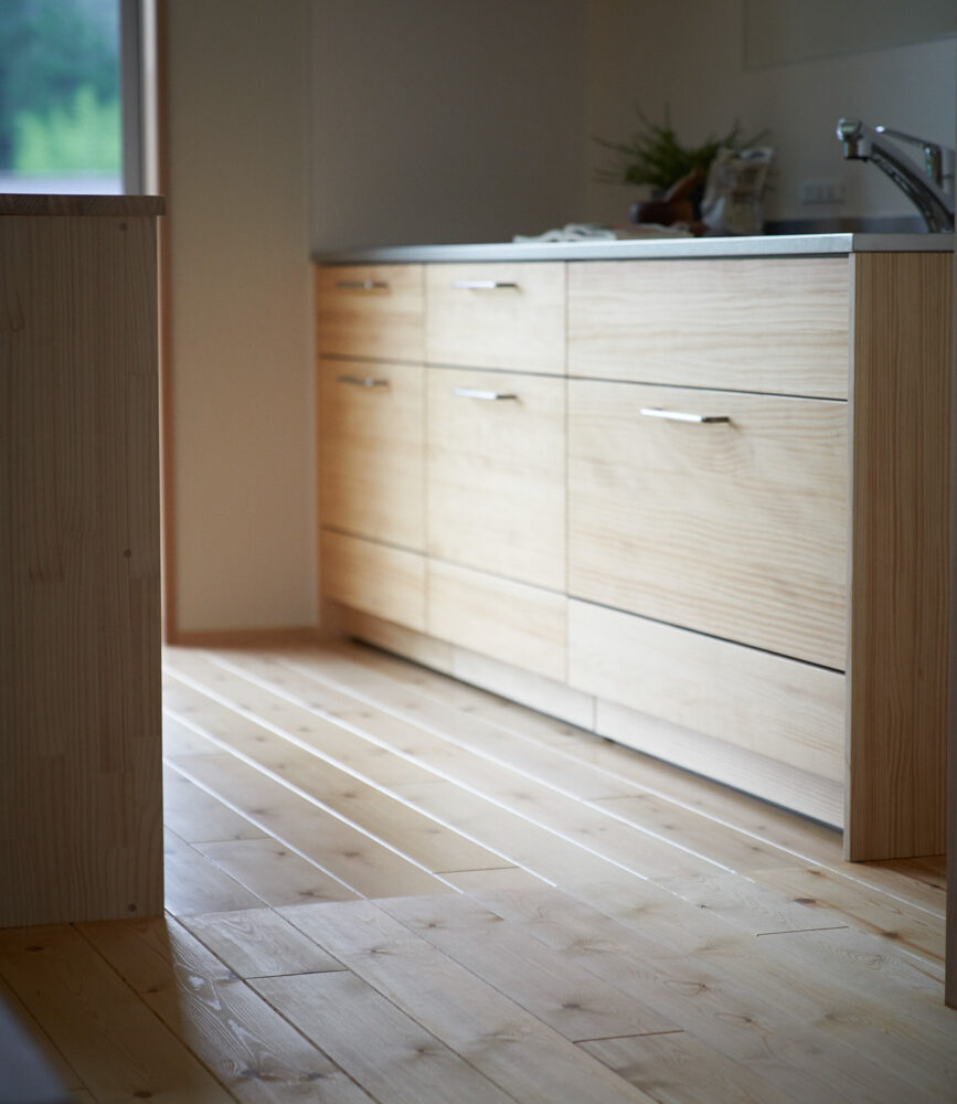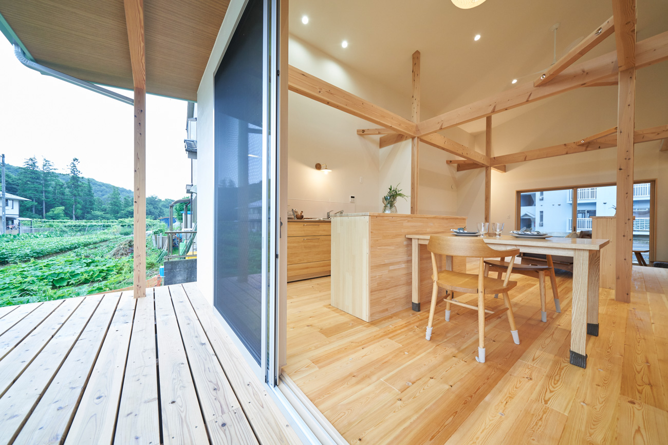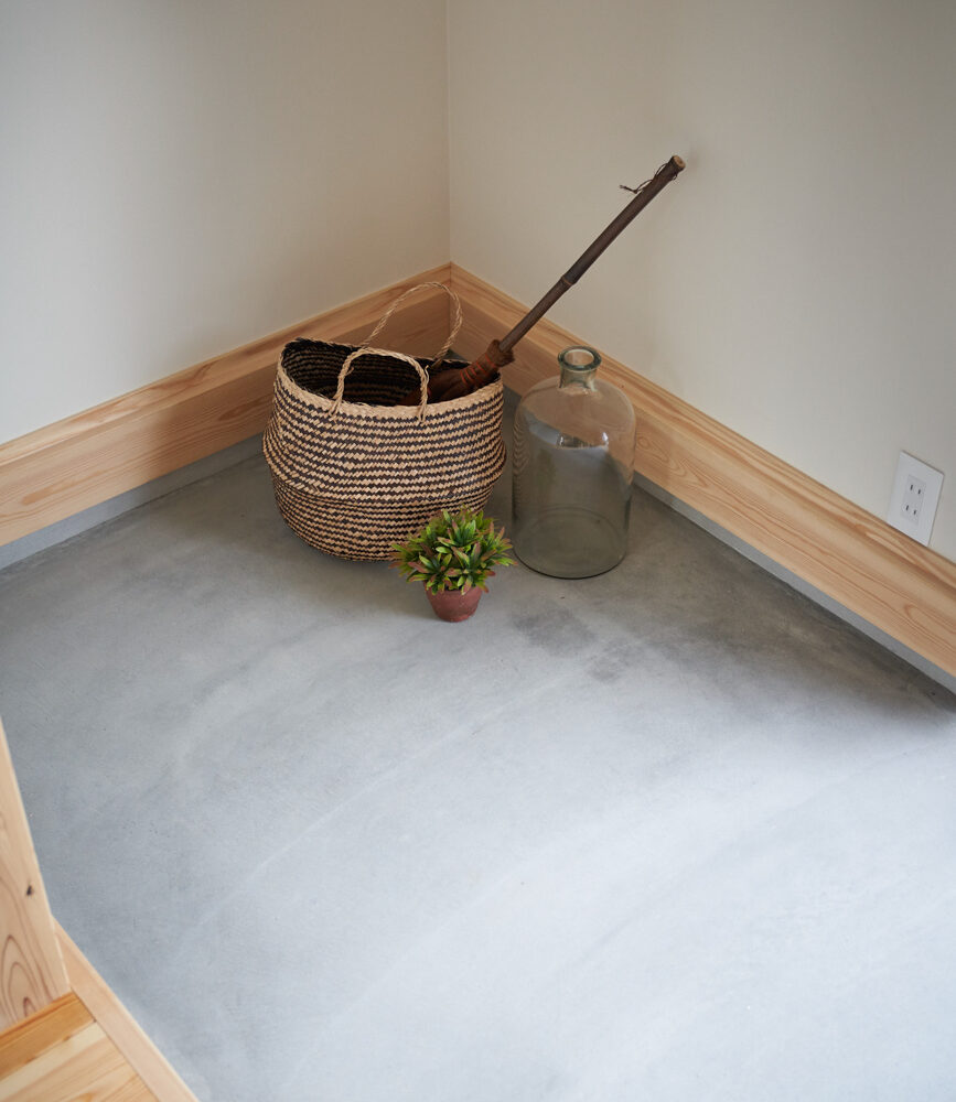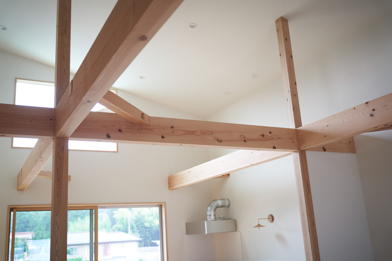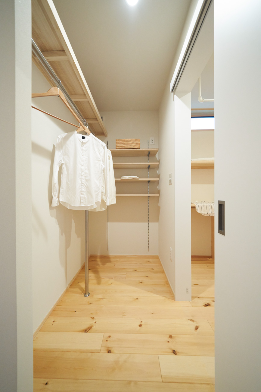 吹き抜けでつながる上下階一体の大空間。使い方様々な広い土間。心地よくまどろむヌックスタイルの寝室。ぐるりと動きやすい回遊動線。シンプルなプランに、機能性とこだわりと余白を心地よくミックスした平屋スタイルのお住まいです。 大開放の吹き抜けリビング 圧倒される大きな吹き抜けでつながる上下階。1Fで暮らしが完結する平屋スタイルでシンプルにプランニングされています。土地の特徴を活かし、近隣の長閑な風景を大きく切り取る窓の配置で、家中に外光と風を届けてくれます。玄関の土間は通り土間のように広く、モルタルのシンプルな仕上げに。 造作でキッチンとリビングに棚を制作。備え付けのため、地震などにも倒れることがないので安心。 吹き抜けでつながるフリースペース 2階は広い仕事部屋。家族の変化に伴って、個室として利用することも。トップライトをつけて明るさを。 かわうそが住むヌックベッド コの字に杉のパネリングで装ったヌックスタイルの寝室は居心地抜群。かわいいカワウソ家族の照明が照らしてくれます。 機能性を集約した回遊動線 ダイニングから寝室を通ってリビングへ回遊できる動線。動線上には手洗い・洗面・浴室・ランドリースペース・オープンクローゼットと、機能設備が並んでいて、家事でのアクションがコンパクトに。
