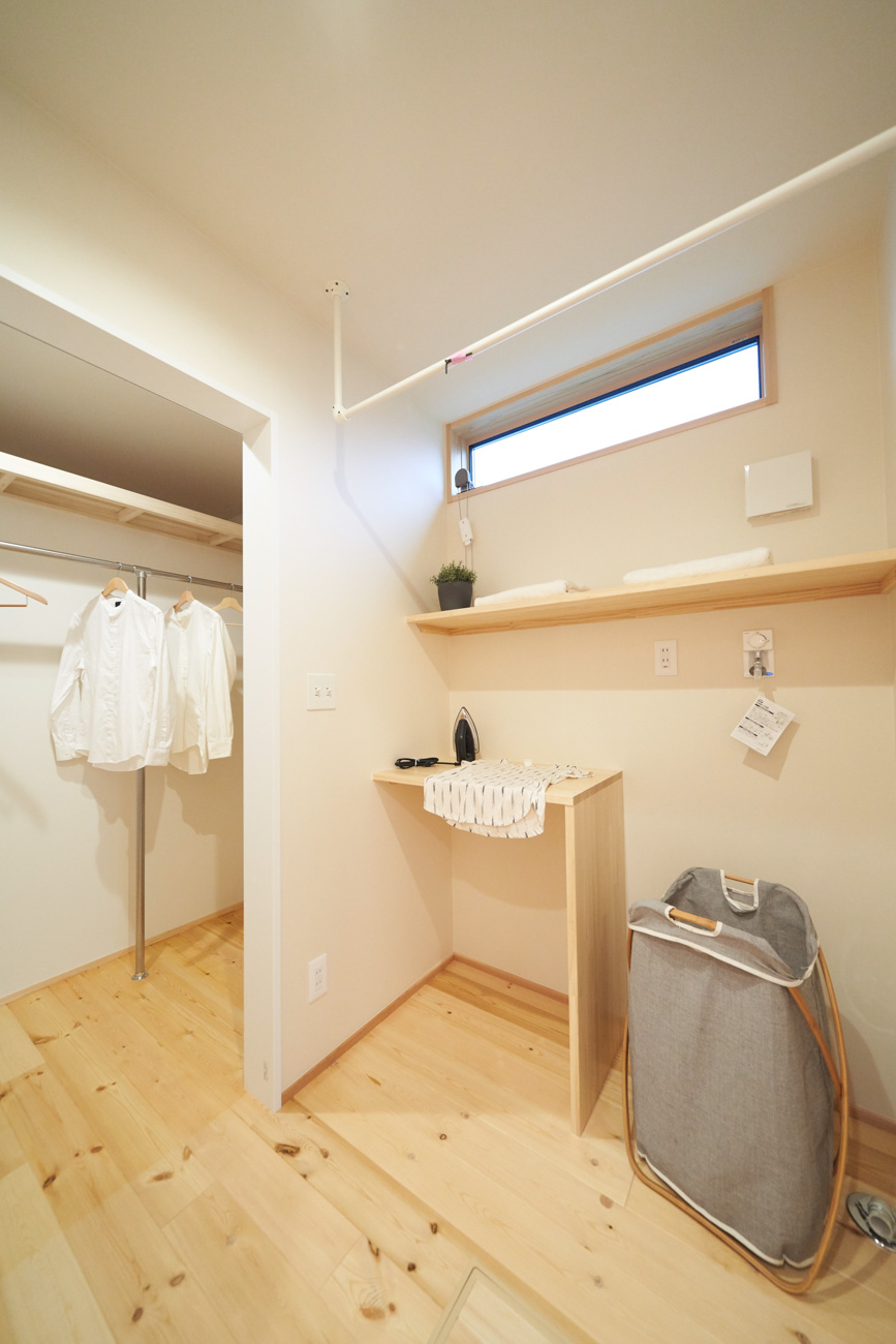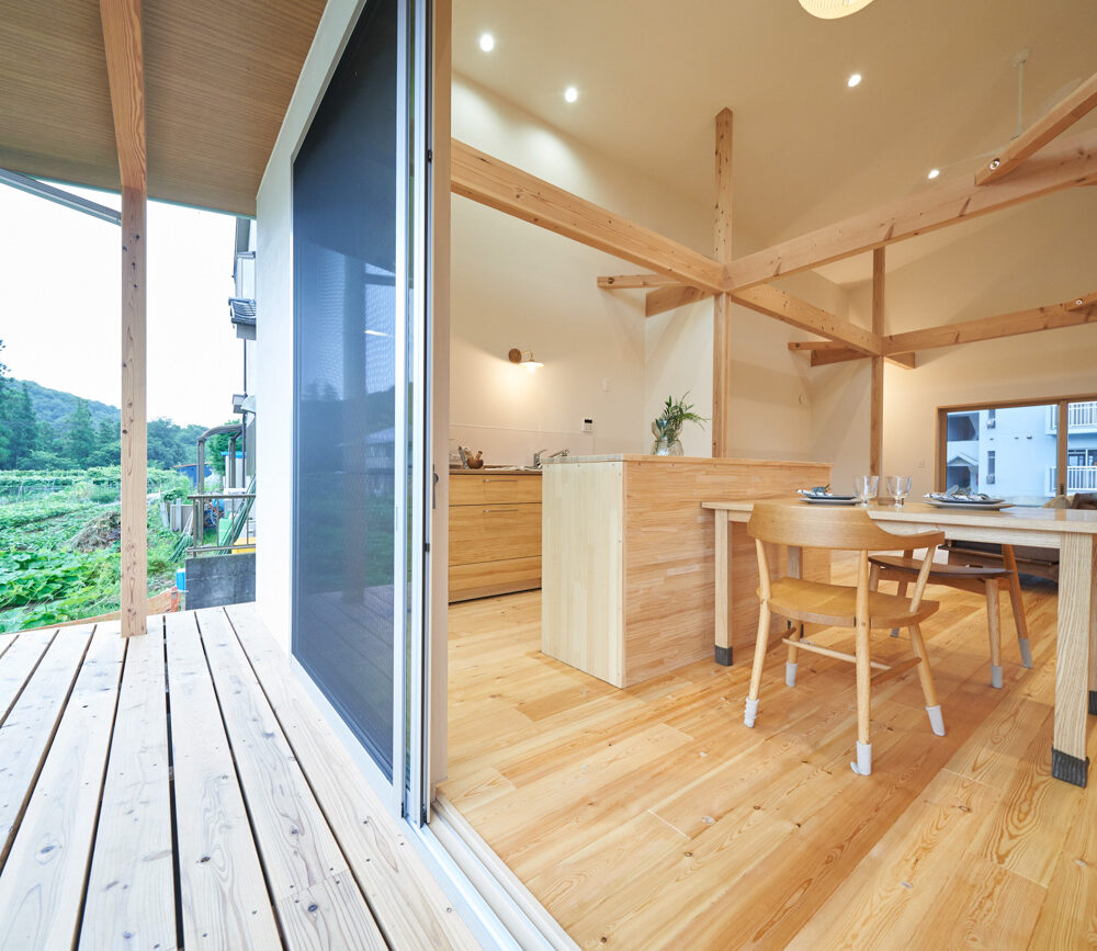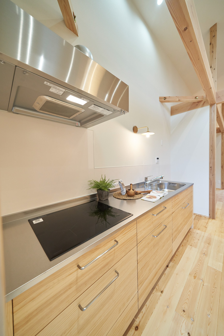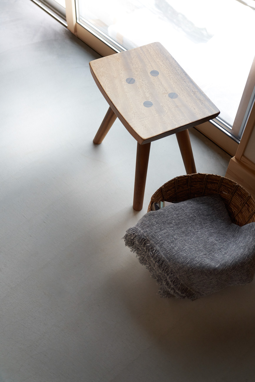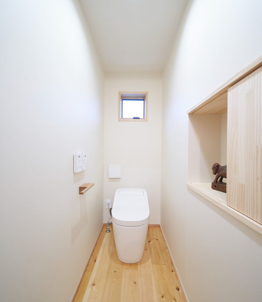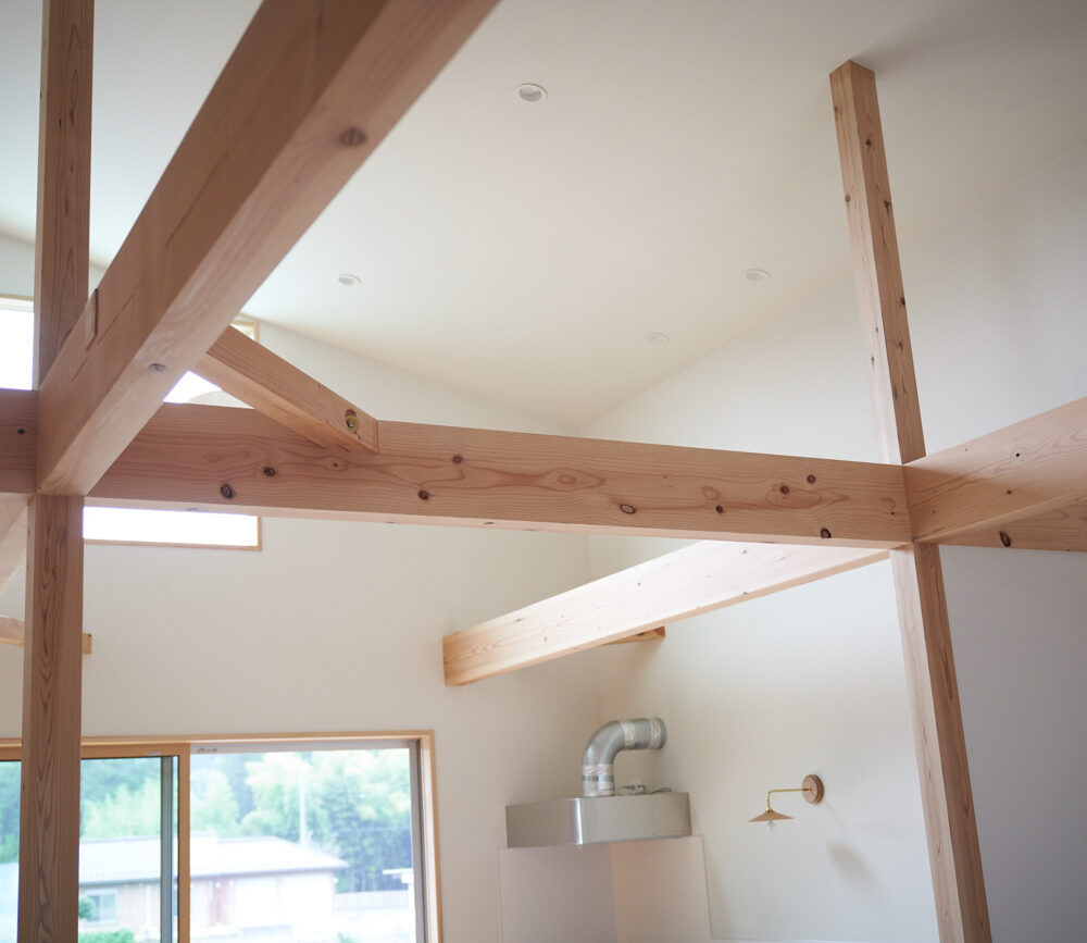 吹き抜けでつながる上下階一体の大空間。使い方様々な広い土間。心地よくまどろむヌックスタイルの寝室。ぐるりと動きやすい回遊動線。シンプルなプランに、機能性とこだわりと余白を心地よくミックスした平屋スタイルのお住まいです。 大開放の吹き抜けリビング 圧倒される大きな吹き抜けでつながる上下階。1Fで暮らしが完結する平屋スタイルでシンプルにプランニングされています。土地の特徴を活かし、近隣の長閑な風景を大きく切り取る窓の配置で、家中に外光と風を届けてくれます。玄関の土間は通り土間のように広く、モルタルのシンプルな仕上げに。 造作でキッチンとリビングに棚を制作。備え付けのため、地震などにも倒れることがないので安心。 吹き抜けでつながるフリースペース 2階は広い仕事部屋。家族の変化に伴って、個室として利用することも。トップライトをつけて明るさを。 かわうそが住むヌックベッド コの字に杉のパネリングで装ったヌックスタイルの寝室は居心地抜群。かわいいカワウソ家族の照明が照らしてくれます。 機能性を集約した回遊動線 ダイニングから寝室を通ってリビングへ回遊できる動線。動線上には手洗い・洗面・浴室・ランドリースペース・オープンクローゼットと、機能設備が並んでいて、家事でのアクションがコンパクトに。
