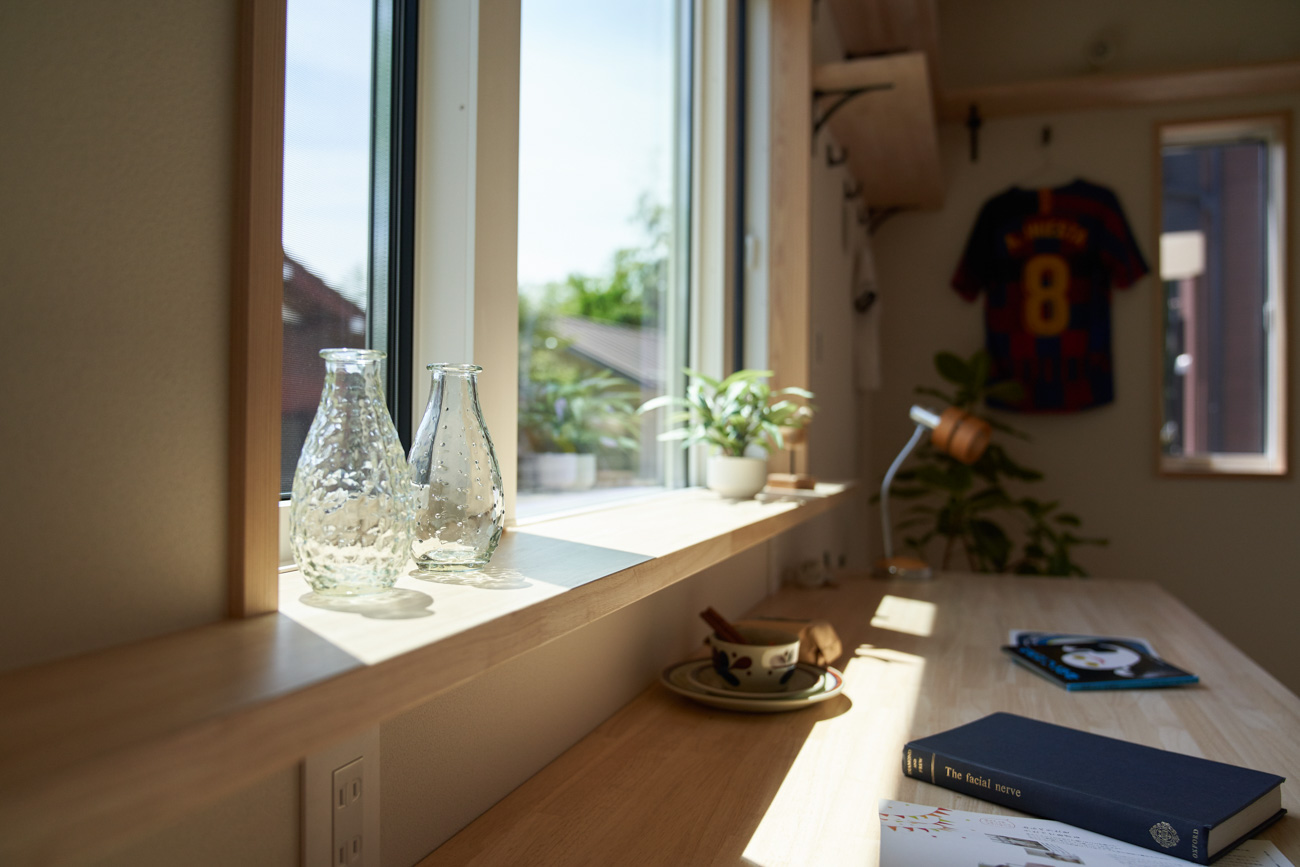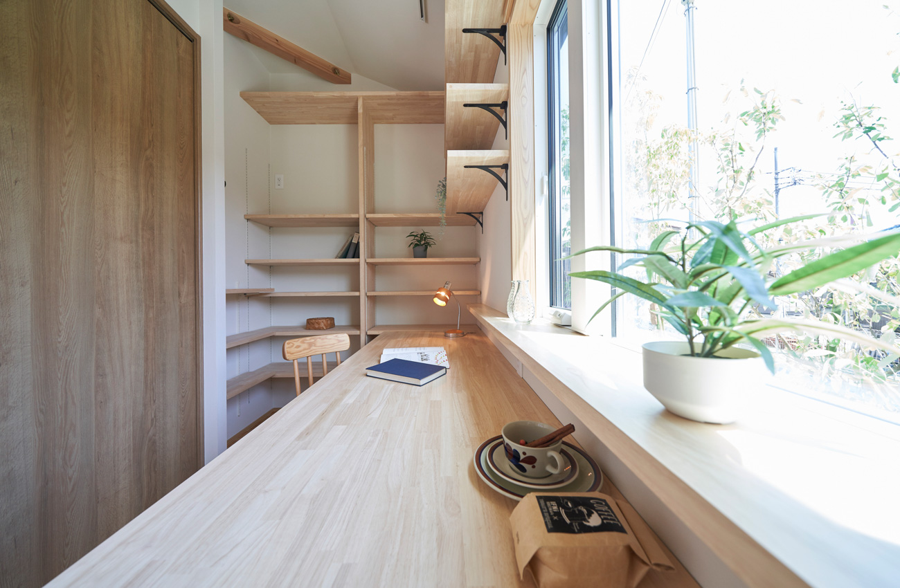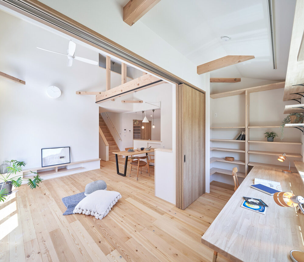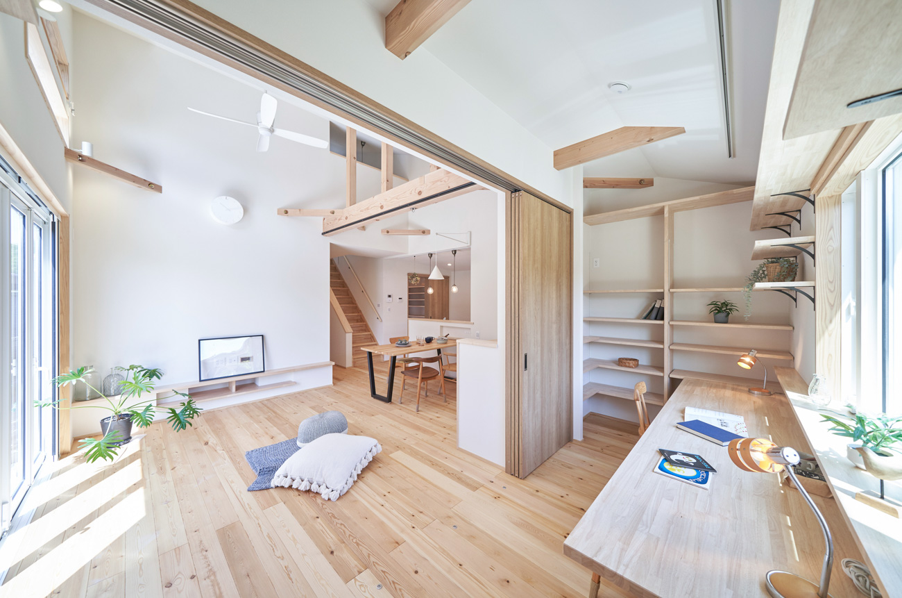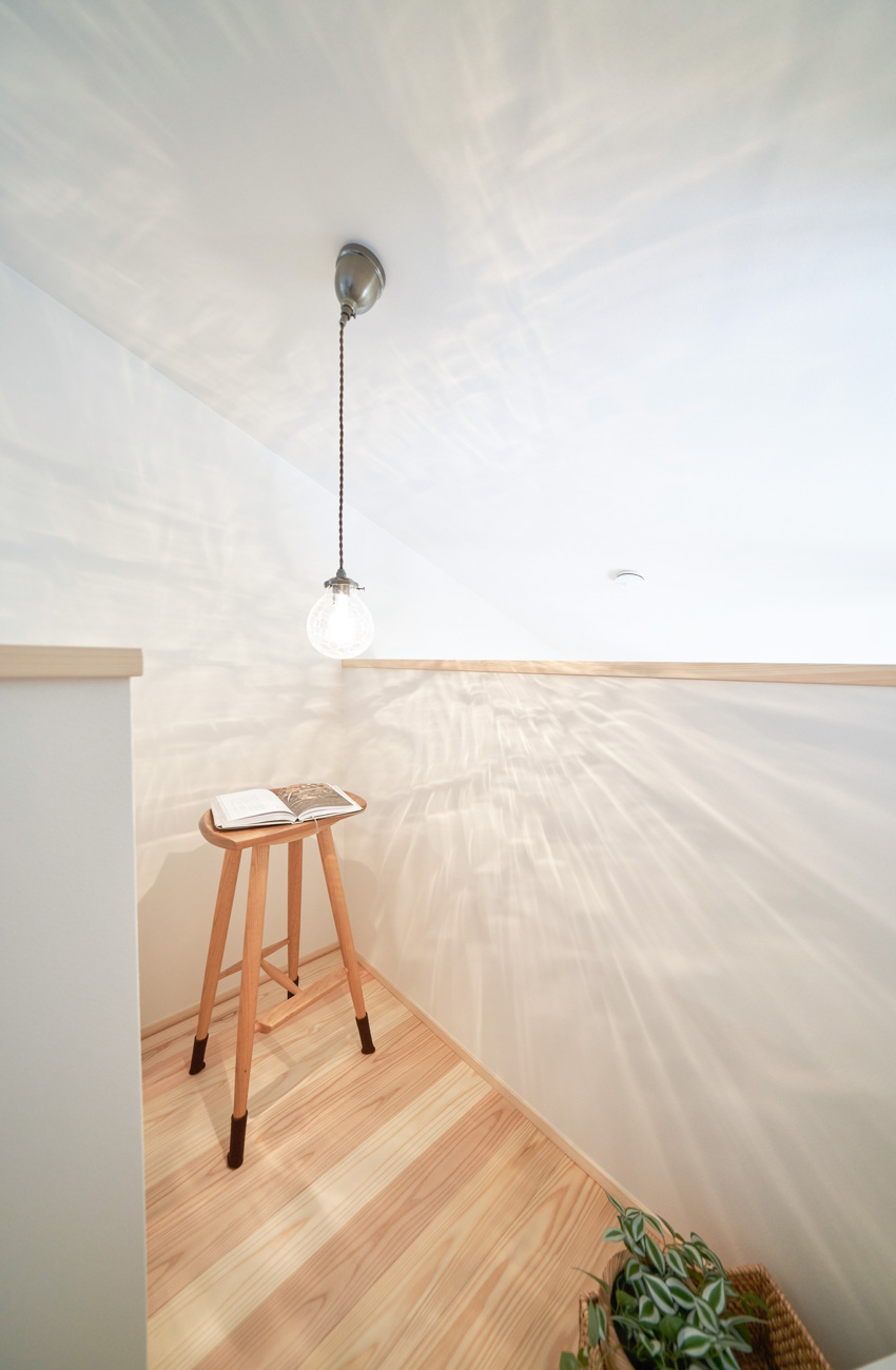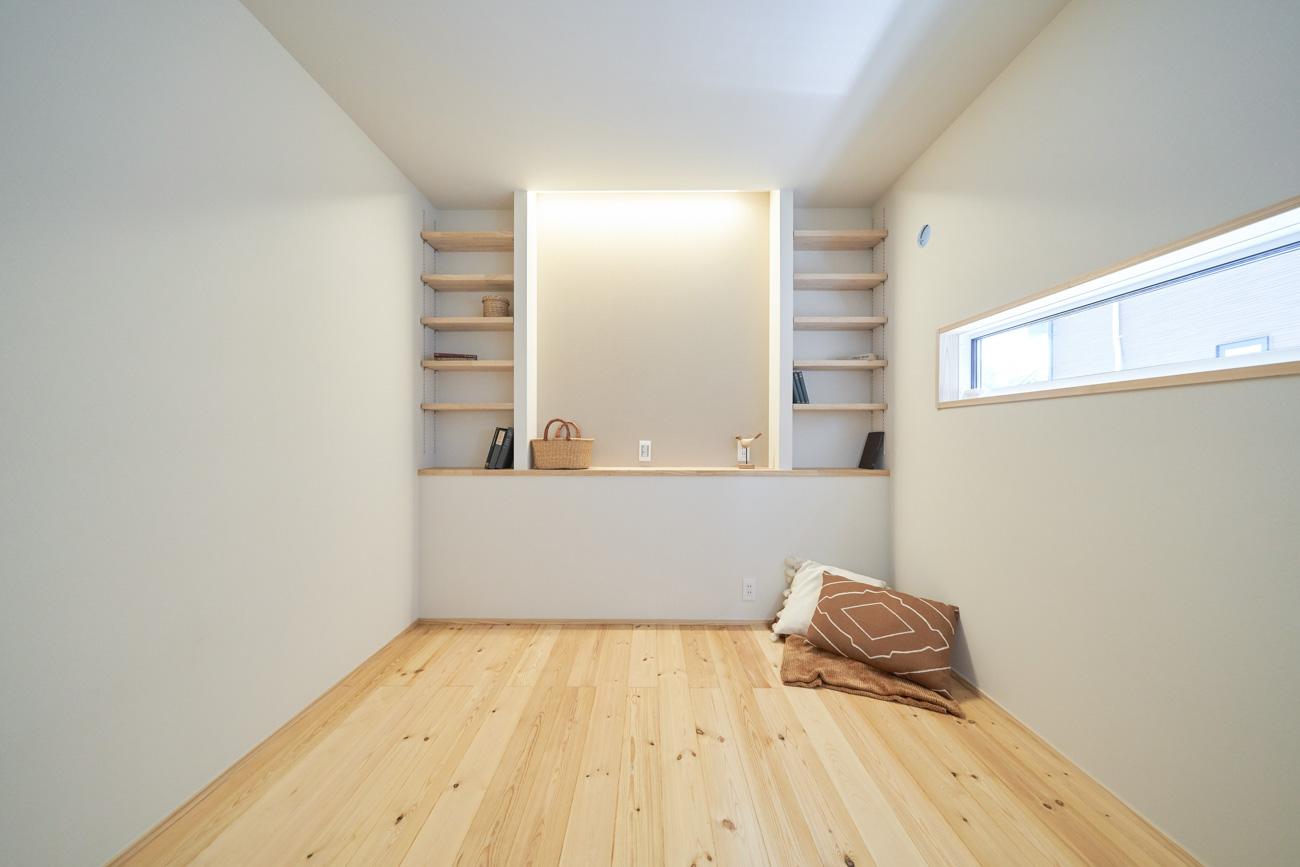 リビングにはテレビを壁面設置して配線類を隠せるテレビボードを造作。その裏にある主寝室には配線収納の出っ張りを利用したニッチと壁面本棚。壁の表裏の凸凹をうまく利用した二つの造作棚です。2階は子供部屋と収納のみのシンプルプラン。子供部屋は家族の成長に合わせて勾配天井のある2部屋に増やすことが可能です。そして廊下の奥まった場所は、読書好きの建主様の秘密の場所。吹き抜けから家族の気配を感じつつも読書に集中できる子守スペースです。自由設計ならではの暮らしやスタイルに合わせた設計アプローチです。