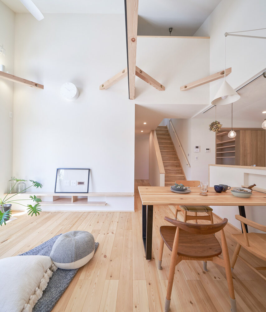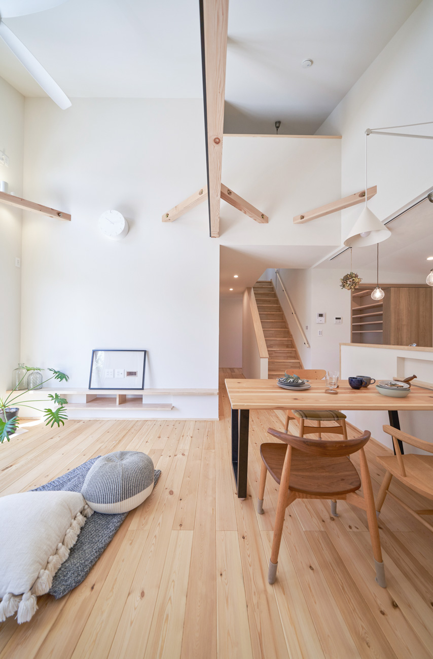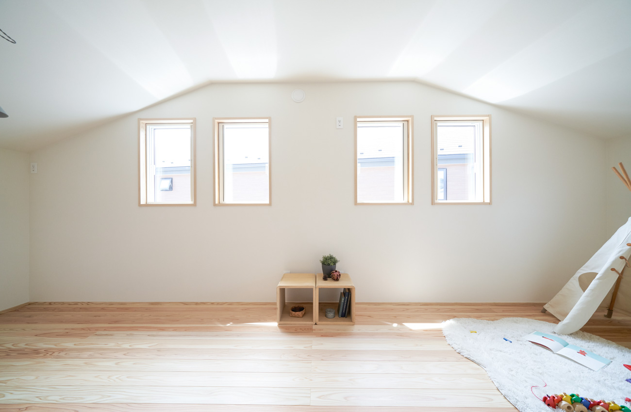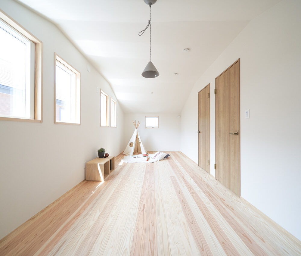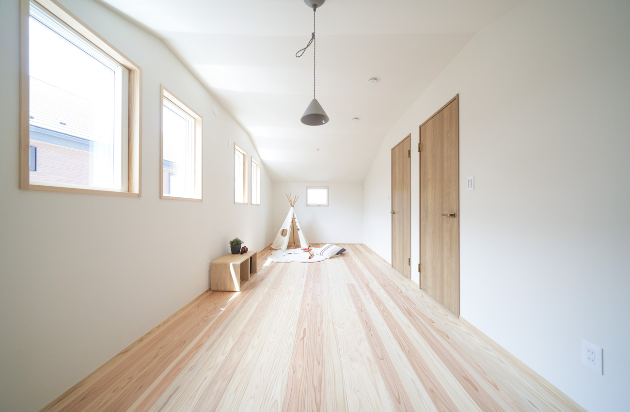 リビングにはテレビを壁面設置して配線類を隠せるテレビボードを造作。その裏にある主寝室には配線収納の出っ張りを利用したニッチと壁面本棚。壁の表裏の凸凹をうまく利用した二つの造作棚です。2階は子供部屋と収納のみのシンプルプラン。子供部屋は家族の成長に合わせて勾配天井のある2部屋に増やすことが可能です。そして廊下の奥まった場所は、読書好きの建主様の秘密の場所。吹き抜けから家族の気配を感じつつも読書に集中できる子守スペースです。自由設計ならではの暮らしやスタイルに合わせた設計アプローチです。