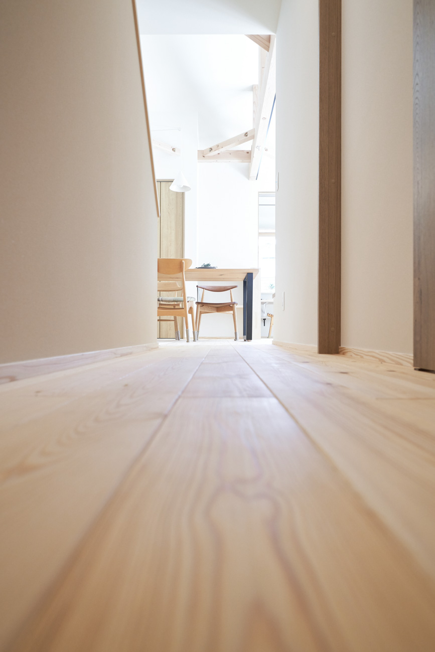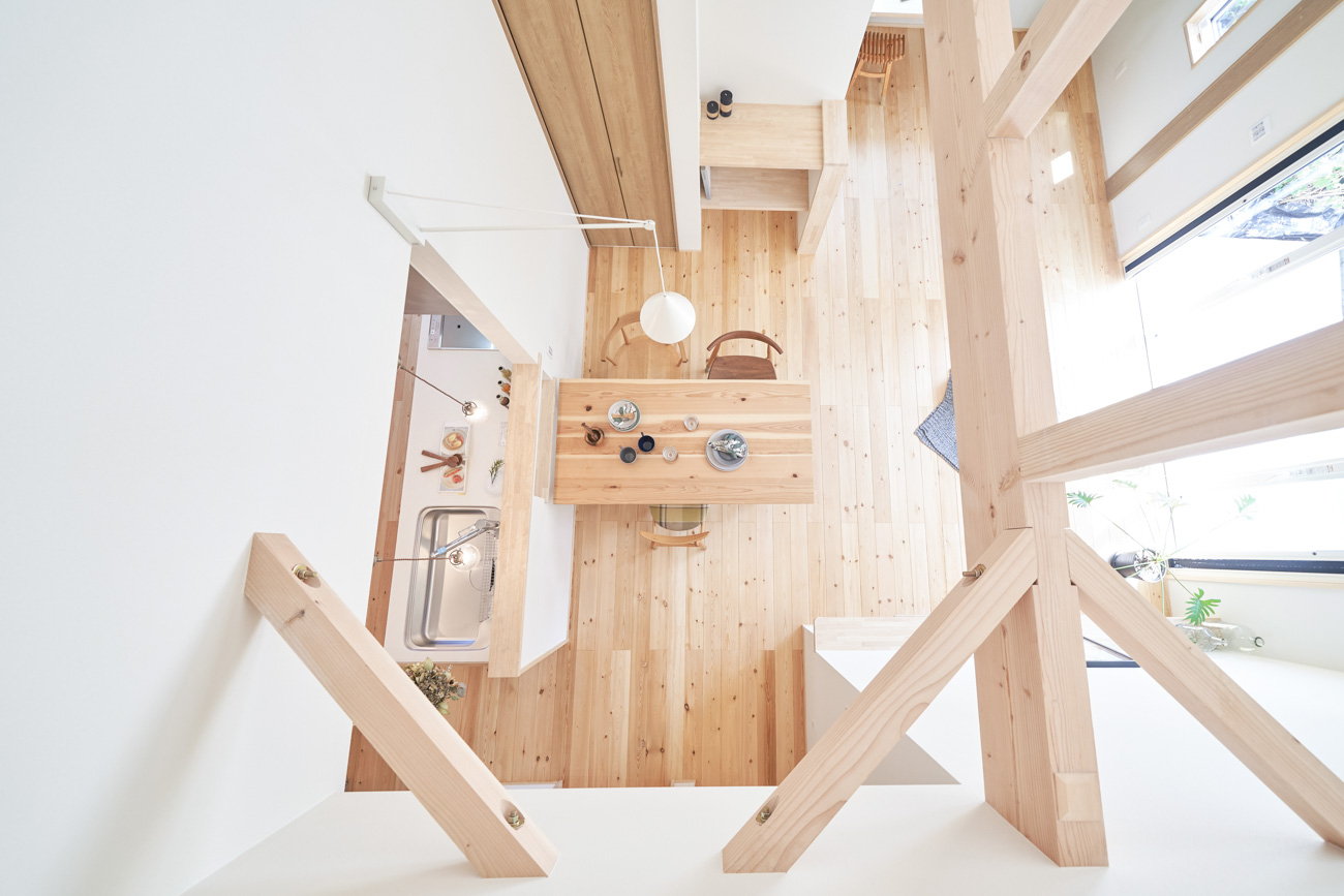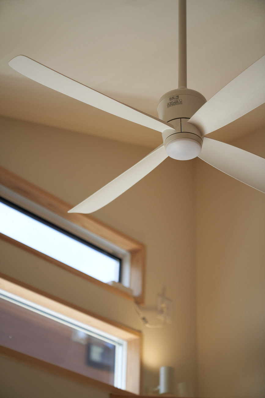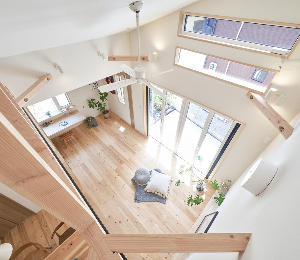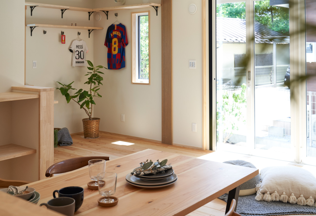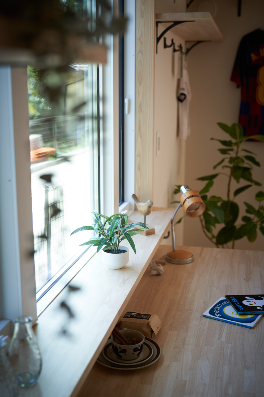 リビングにはテレビを壁面設置して配線類を隠せるテレビボードを造作。その裏にある主寝室には配線収納の出っ張りを利用したニッチと壁面本棚。壁の表裏の凸凹をうまく利用した二つの造作棚です。2階は子供部屋と収納のみのシンプルプラン。子供部屋は家族の成長に合わせて勾配天井のある2部屋に増やすことが可能です。そして廊下の奥まった場所は、読書好きの建主様の秘密の場所。吹き抜けから家族の気配を感じつつも読書に集中できる子守スペースです。自由設計ならではの暮らしやスタイルに合わせた設計アプローチです。