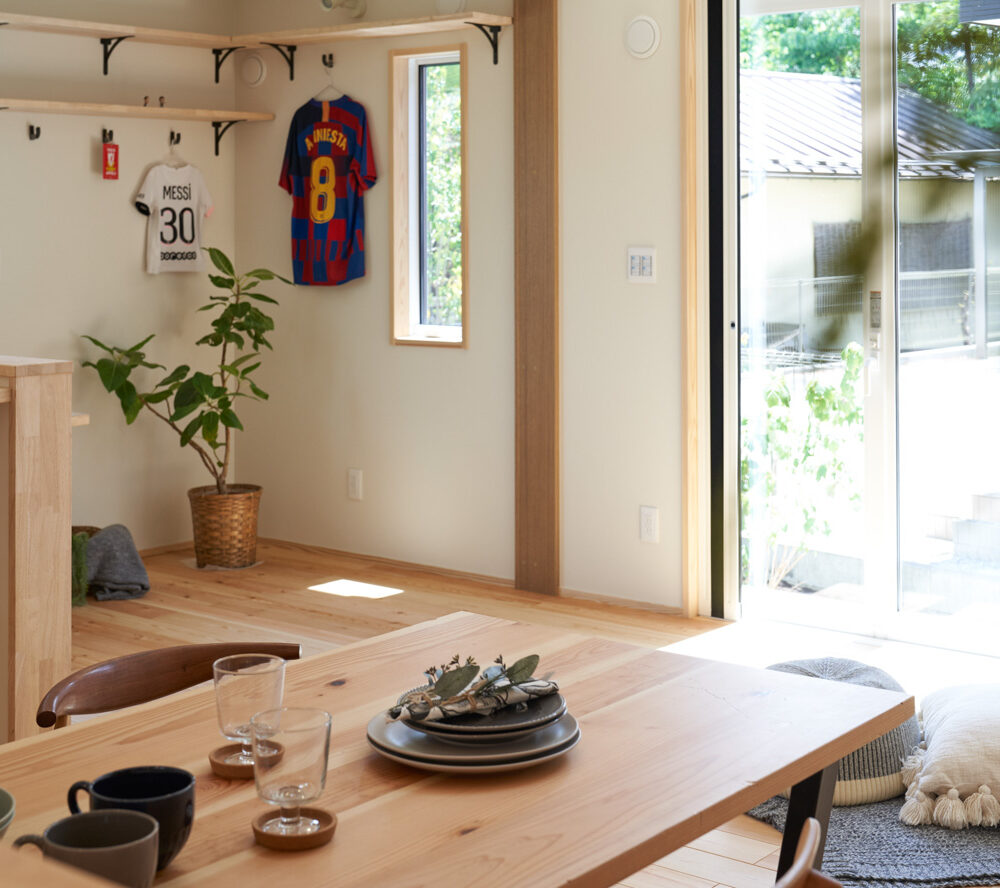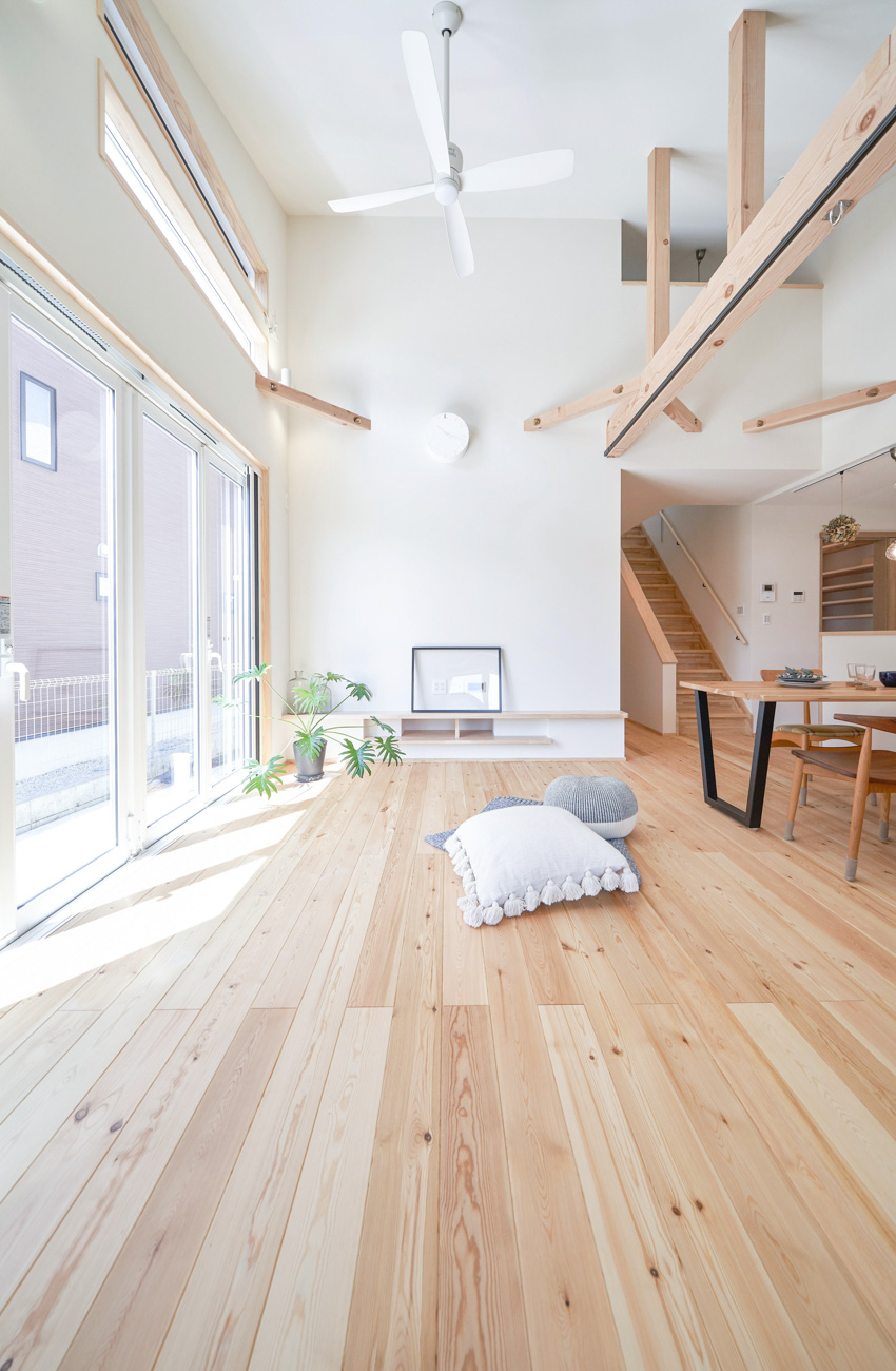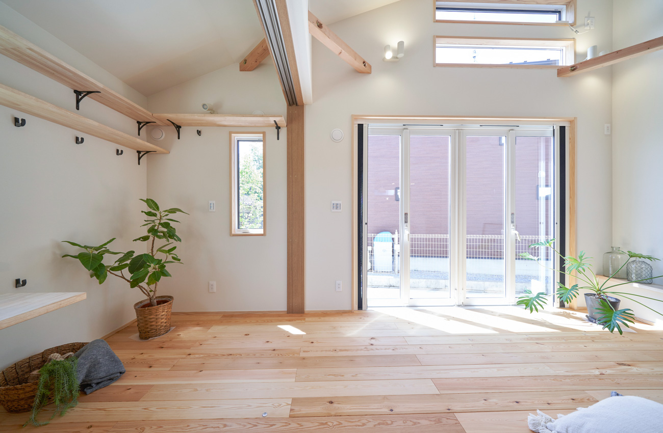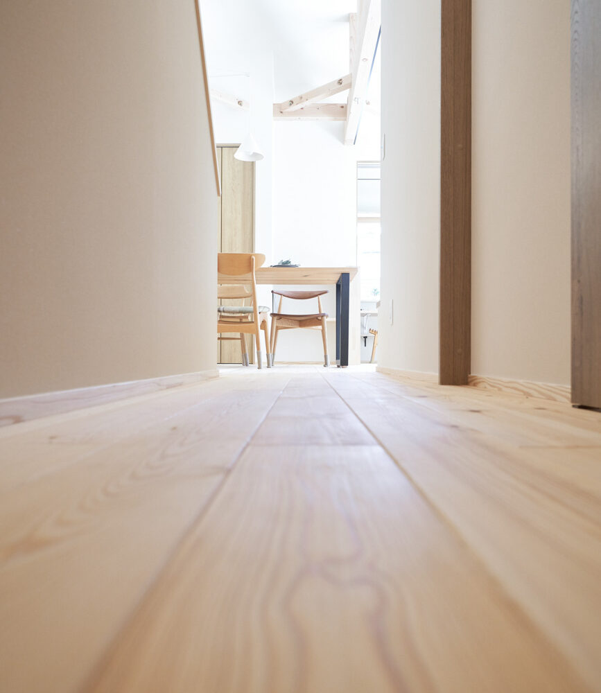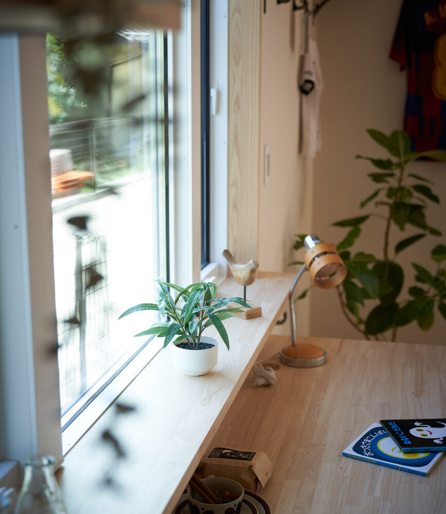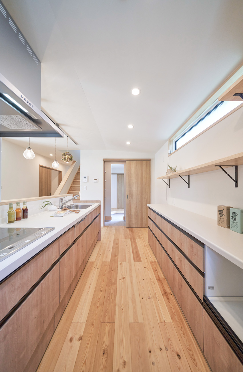 リビングにはテレビを壁面設置して配線類を隠せるテレビボードを造作。その裏にある主寝室には配線収納の出っ張りを利用したニッチと壁面本棚。壁の表裏の凸凹をうまく利用した二つの造作棚です。2階は子供部屋と収納のみのシンプルプラン。子供部屋は家族の成長に合わせて勾配天井のある2部屋に増やすことが可能です。そして廊下の奥まった場所は、読書好きの建主様の秘密の場所。吹き抜けから家族の気配を感じつつも読書に集中できる子守スペースです。自由設計ならではの暮らしやスタイルに合わせた設計アプローチです。