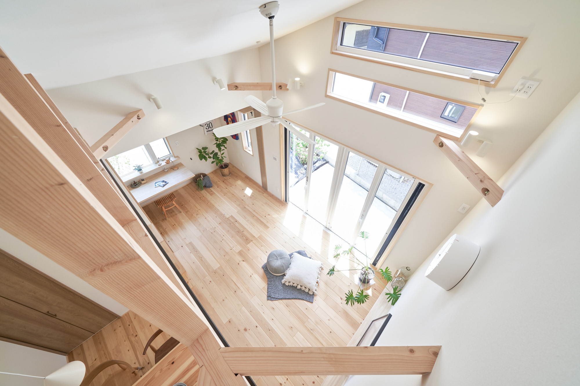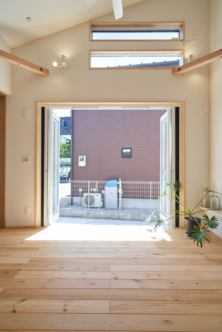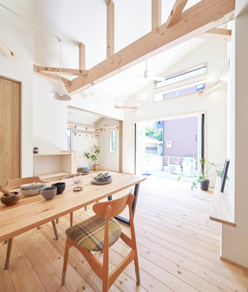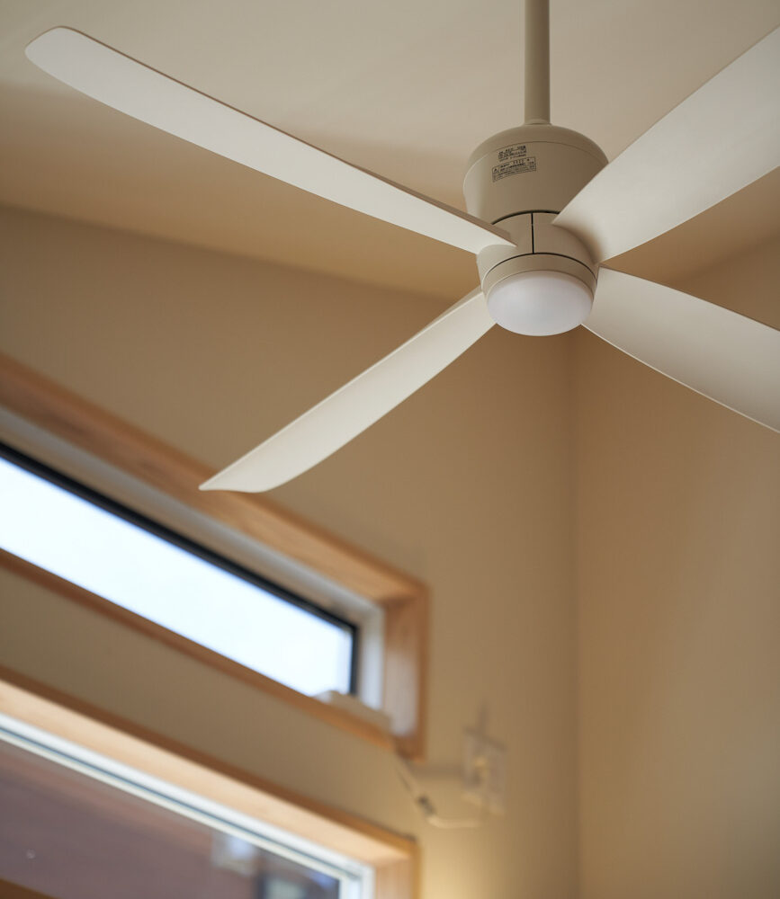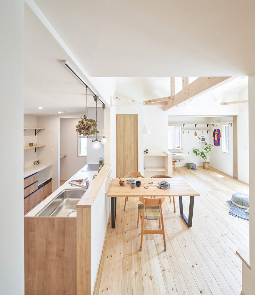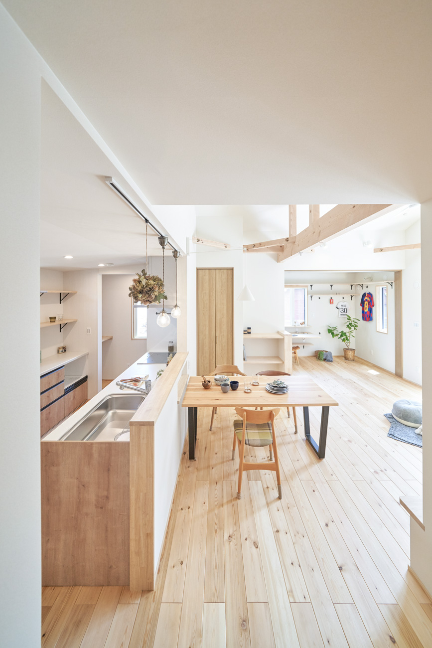リビングにはテレビを壁面設置して配線類を隠せるテレビボードを造作。その裏にある主寝室には配線収納の出っ張りを利用したニッチと壁面本棚。壁の表裏の凸凹をうまく利用した二つの造作棚です。2階は子供部屋と収納のみのシンプルプラン。子供部屋は家族の成長に合わせて勾配天井のある2部屋に増やすことが可能です。そして廊下の奥まった場所は、読書好きの建主様の秘密の場所。吹き抜けから家族の気配を感じつつも読書に集中できる子守スペースです。自由設計ならではの暮らしやスタイルに合わせた設計アプローチです。