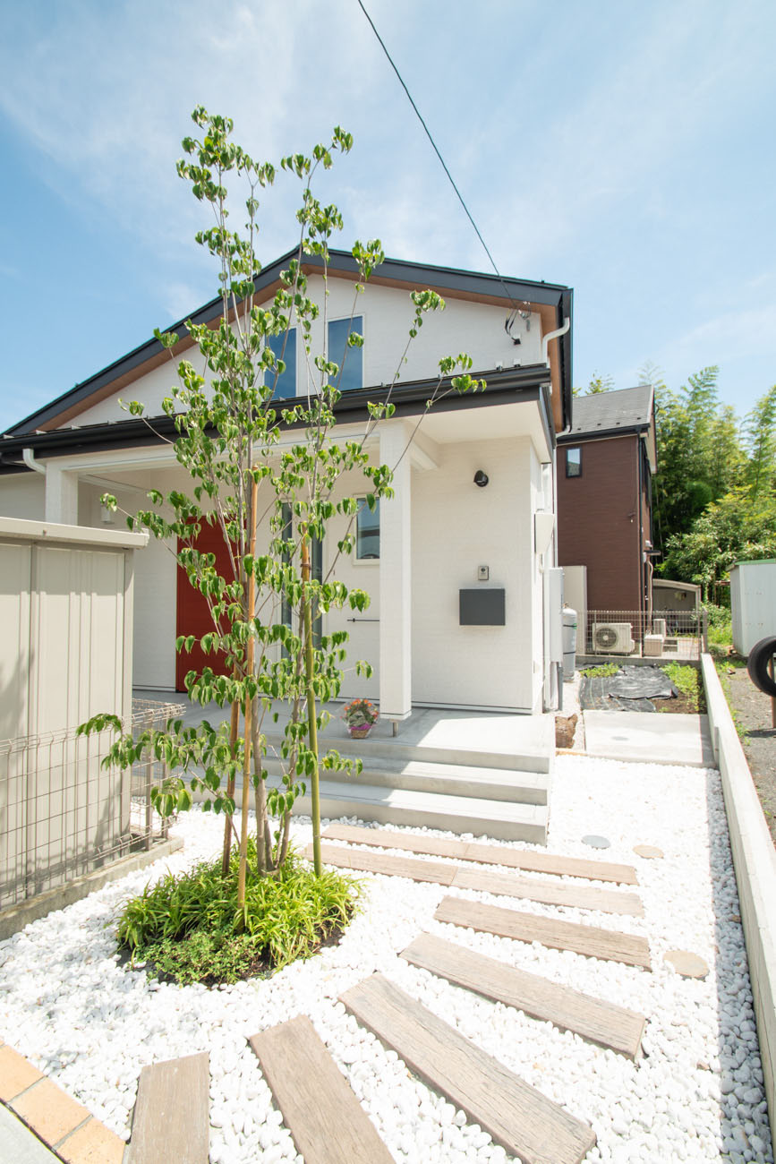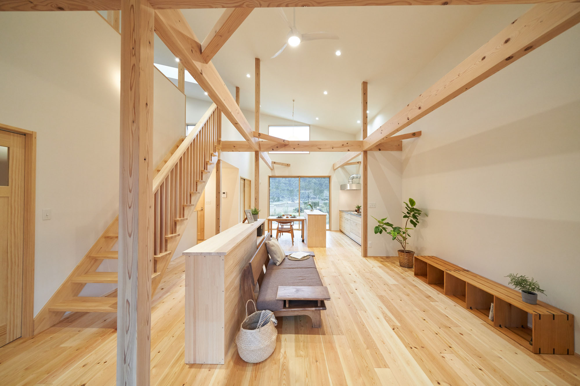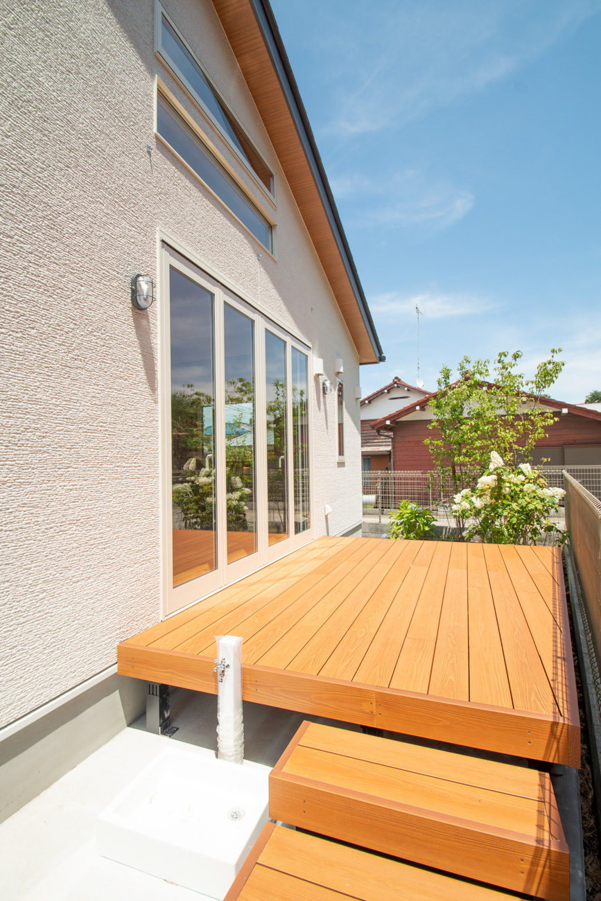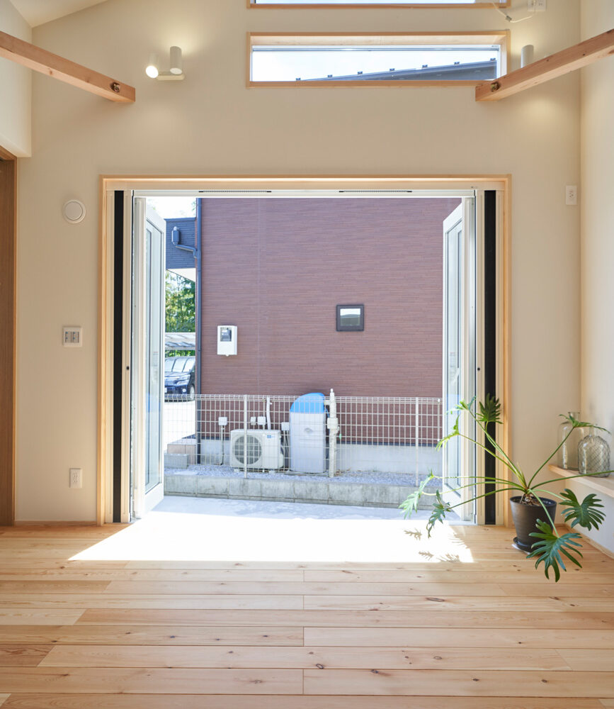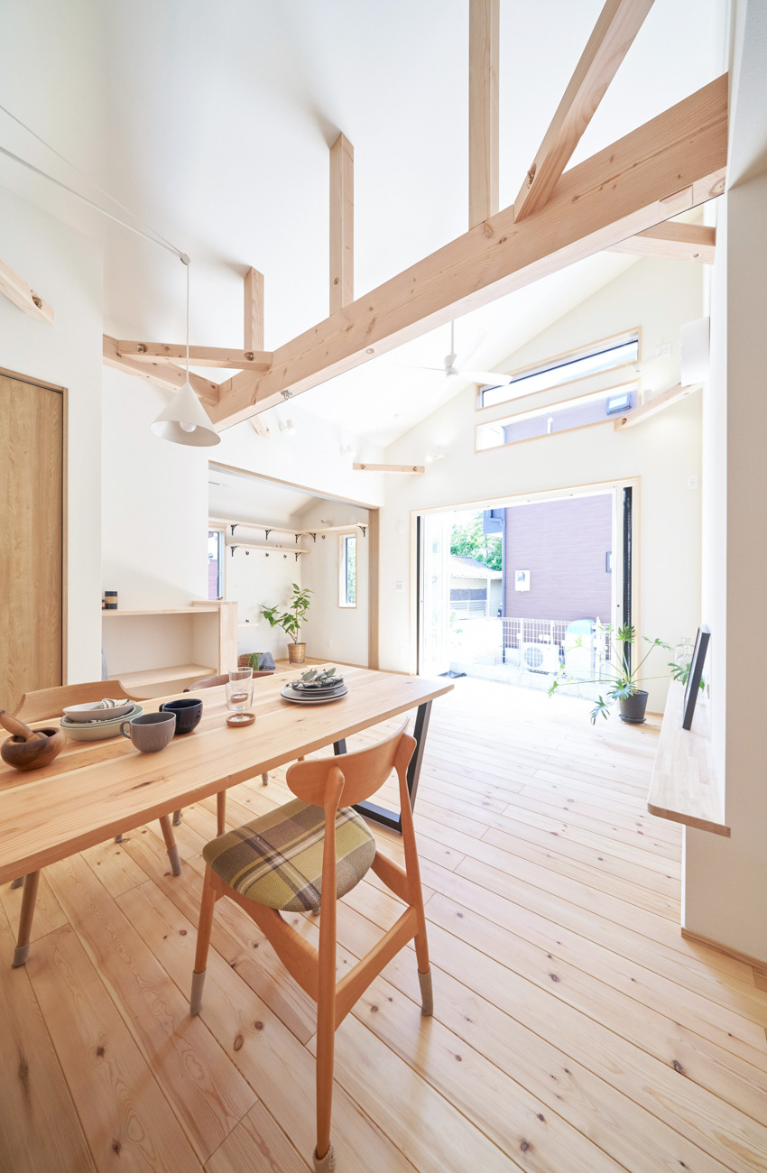 リビングにはテレビを壁面設置して配線類を隠せるテレビボードを造作。その裏にある主寝室には配線収納の出っ張りを利用したニッチと壁面本棚。壁の表裏の凸凹をうまく利用した二つの造作棚です。2階は子供部屋と収納のみのシンプルプラン。子供部屋は家族の成長に合わせて勾配天井のある2部屋に増やすことが可能です。そして廊下の奥まった場所は、読書好きの建主様の秘密の場所。吹き抜けから家族の気配を感じつつも読書に集中できる子守スペースです。自由設計ならではの暮らしやスタイルに合わせた設計アプローチです。