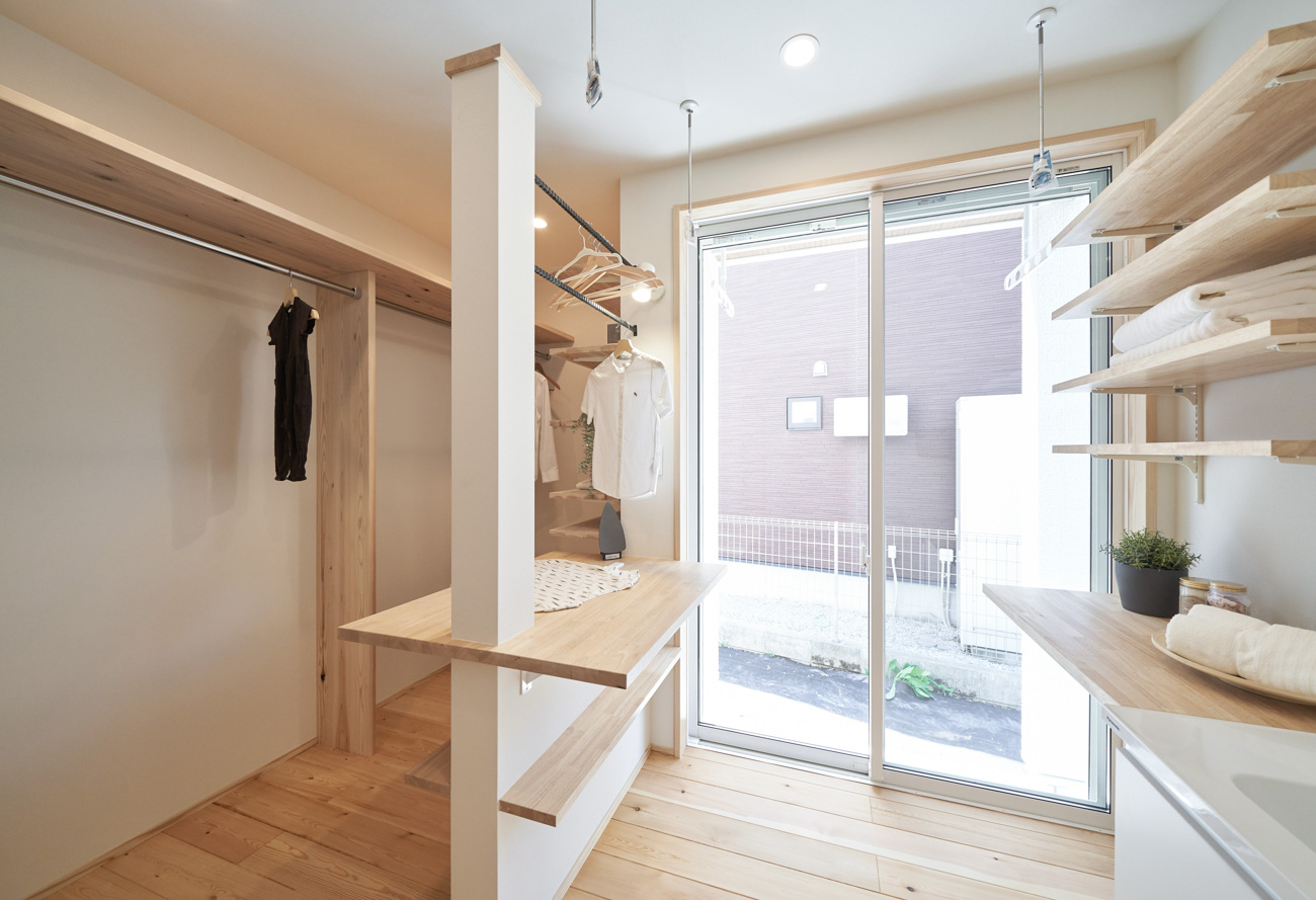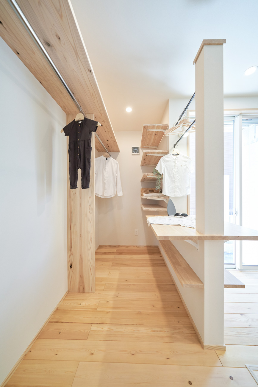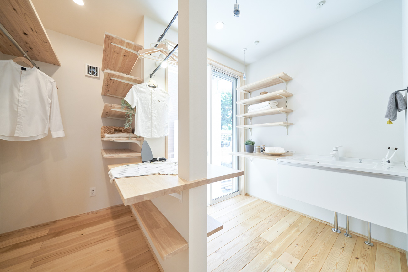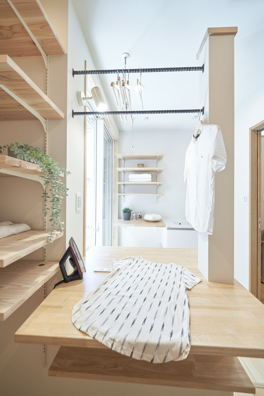 ランドリールームはクローゼットも兼ねており、洗濯→干す→アイロン→そのまま掛ける収納と、なんと洗濯動線が1箇所で終わるように設計。忙しい共働き家庭で取り入れたいアイデアです。玄関からの動線は2方向あり、キッチン&パントリー方面と洗面室のあるランドリールーム方面へと分かれています。出入りの際に渋滞なく、家人がそれぞれの目的の場所へ。