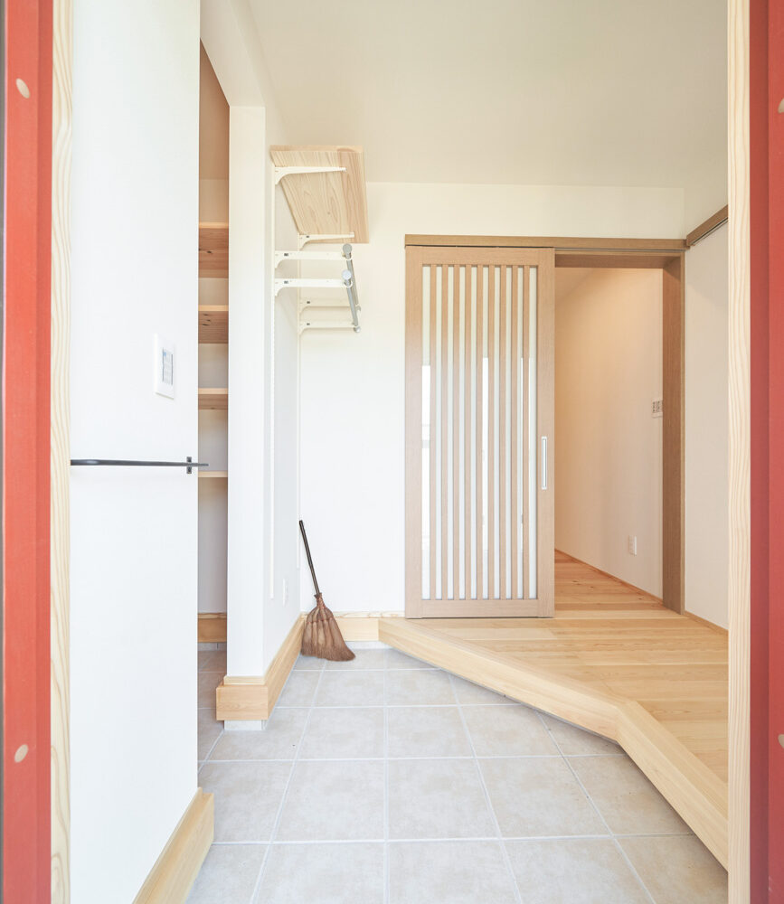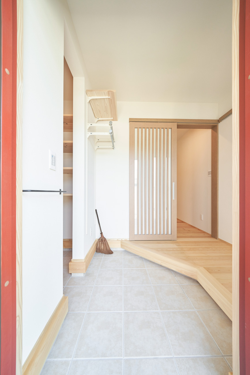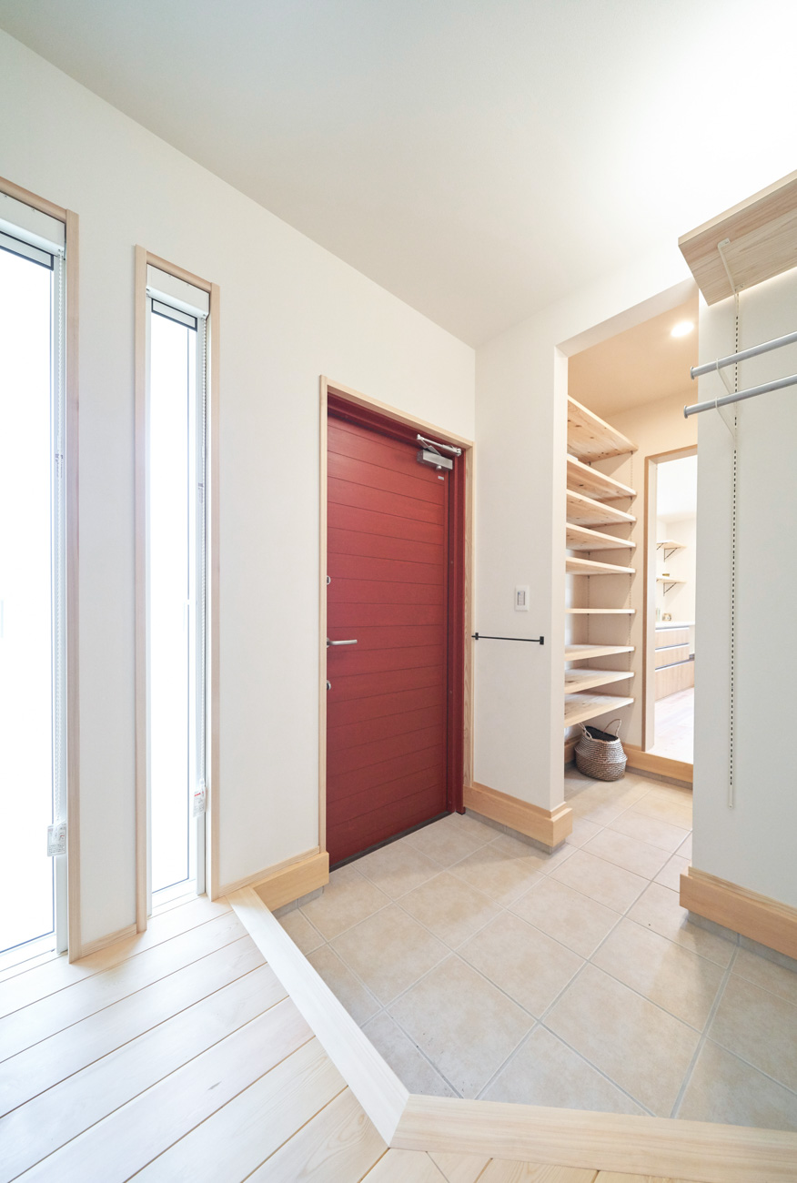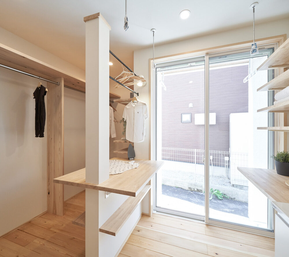 ランドリールームはクローゼットも兼ねており、洗濯→干す→アイロン→そのまま掛ける収納と、なんと洗濯動線が1箇所で終わるように設計。忙しい共働き家庭で取り入れたいアイデアです。玄関からの動線は2方向あり、キッチン&パントリー方面と洗面室のあるランドリールーム方面へと分かれています。出入りの際に渋滞なく、家人がそれぞれの目的の場所へ。