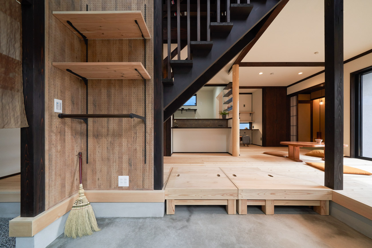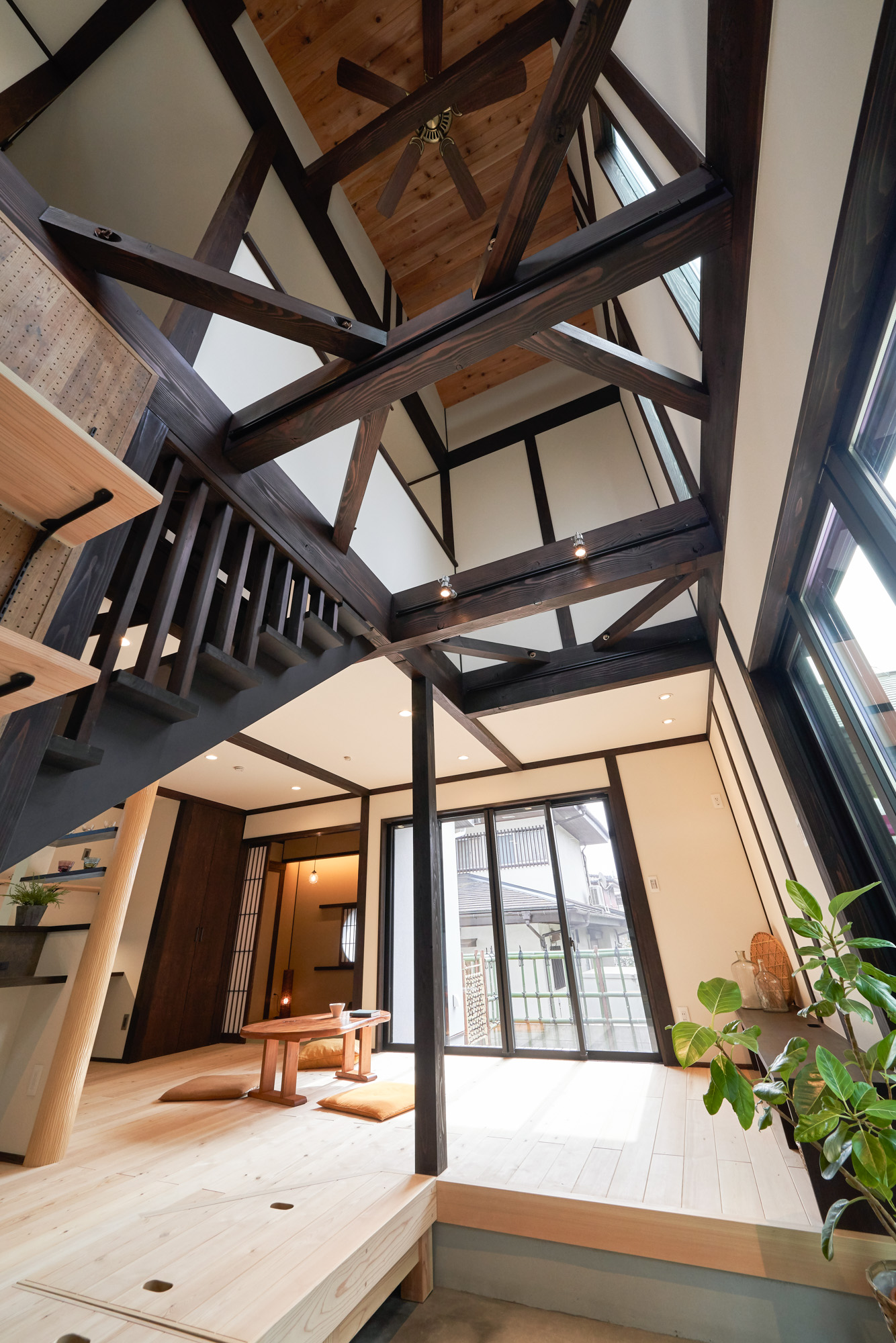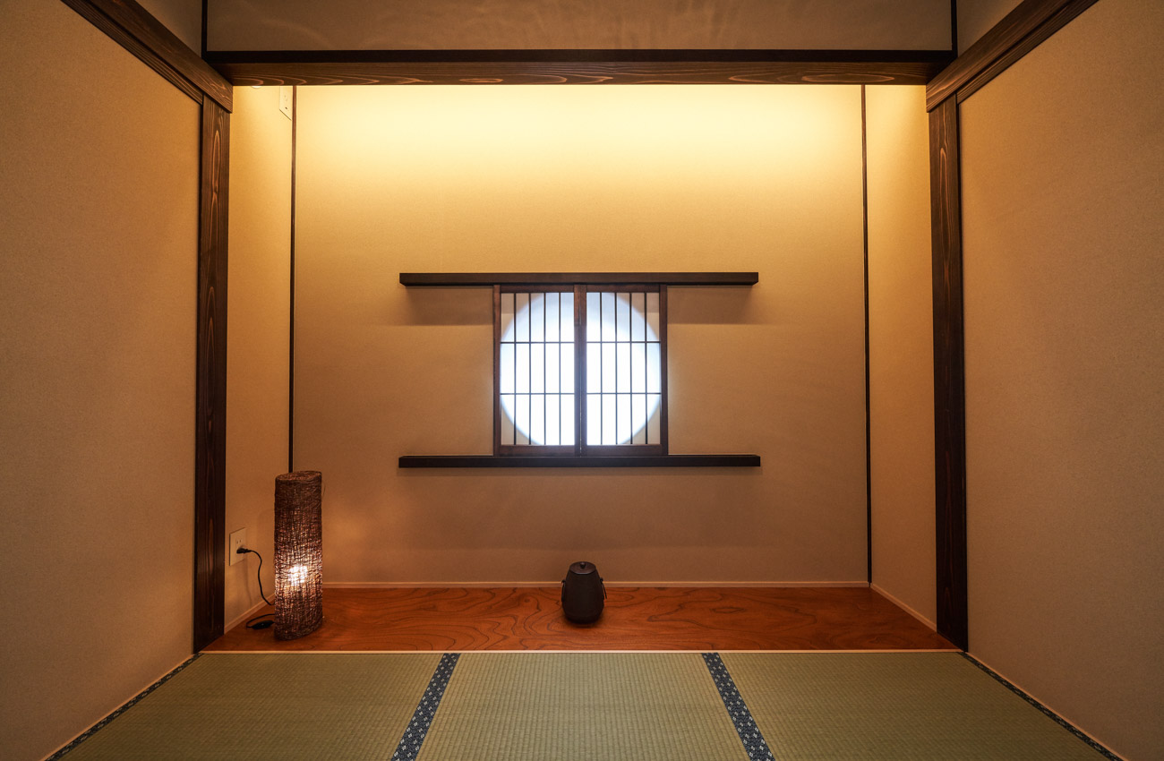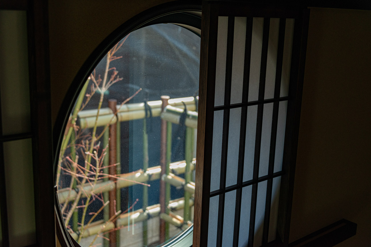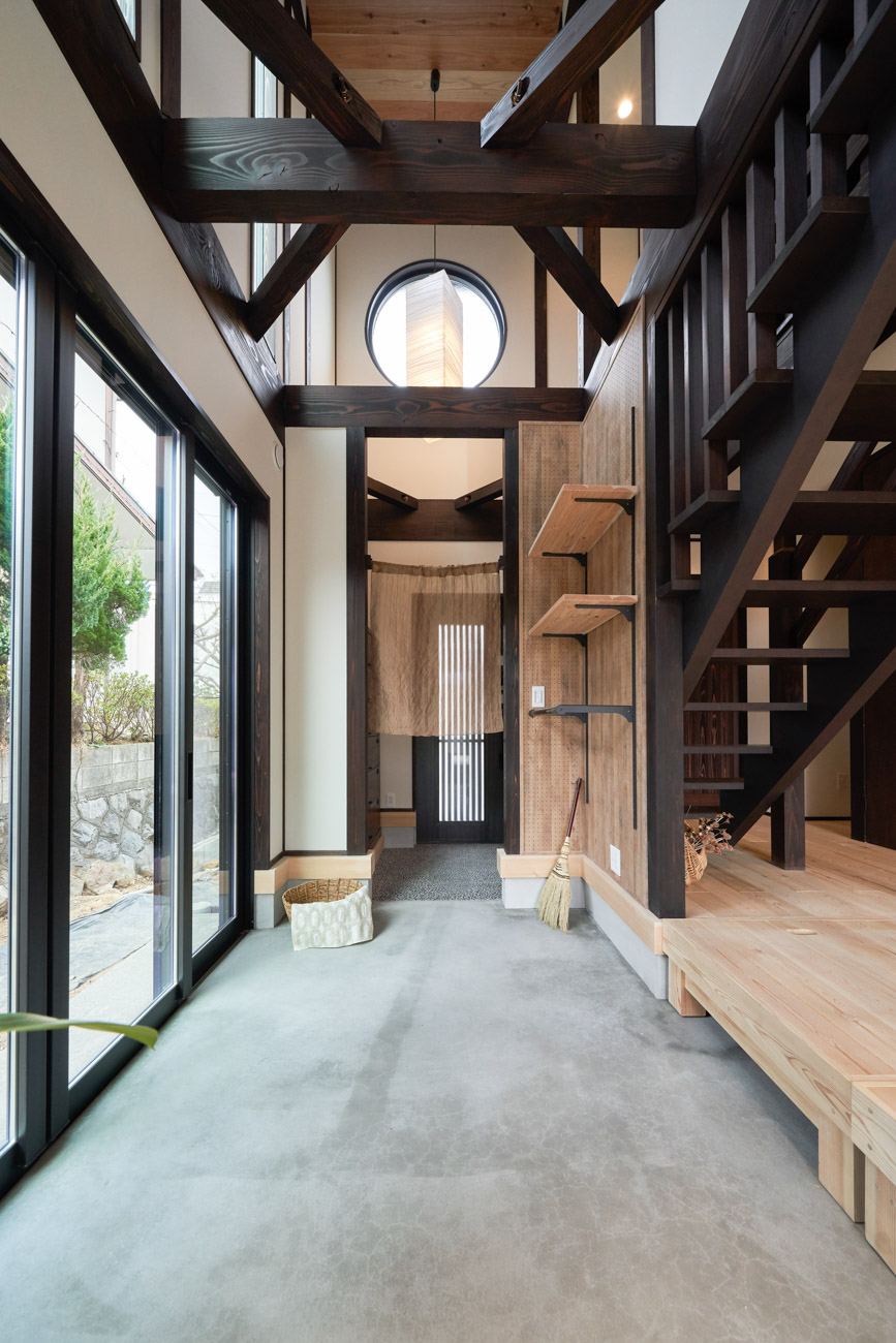 玄関の三和土から続く通り土間をイメージした広い土間スペース。黒紫色に染められた重厚な梁や柱、シンボリックな丸窓、造作扉の明かり窓を組子とガラスや障子で仕上げたりと細部までこだわりを散りばめています。和室の丸窓からは季節ごとの趣を楽しめる金閣寺垣の風情あふれる庭。ご自身で選ばれたアンティークの家具や古い欄間をリメイクした小物などを設置され、統一感のある空間となっています。