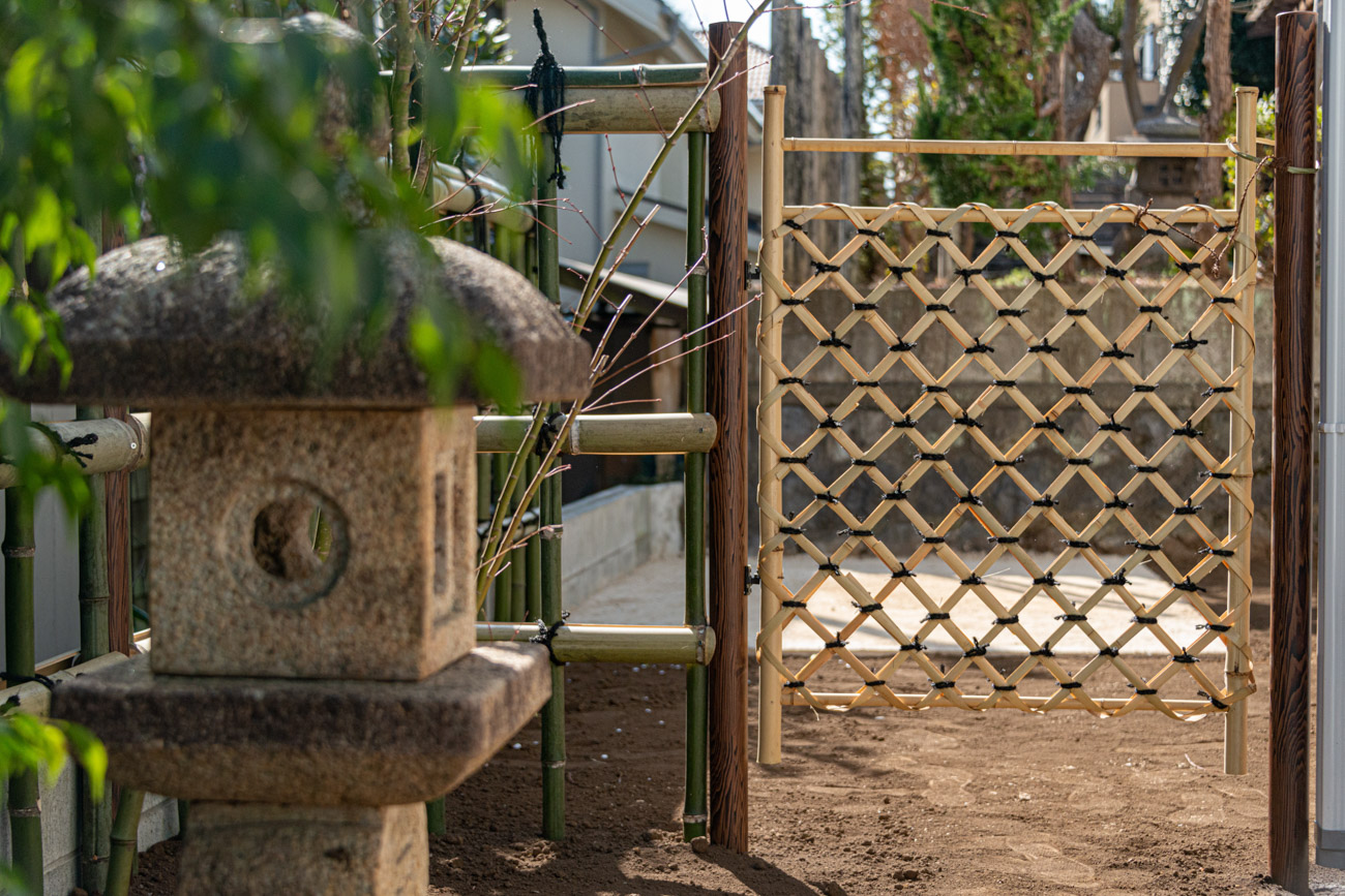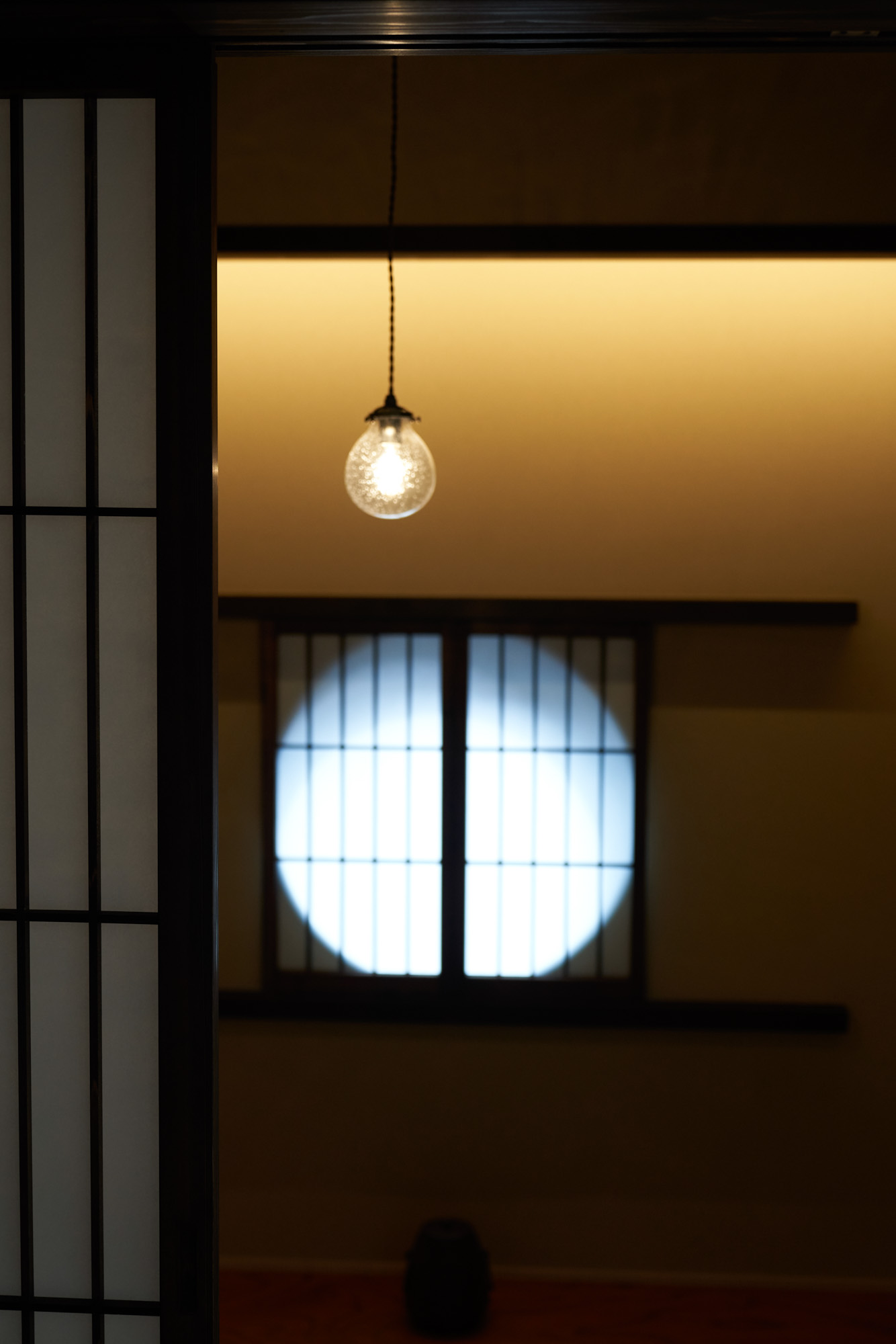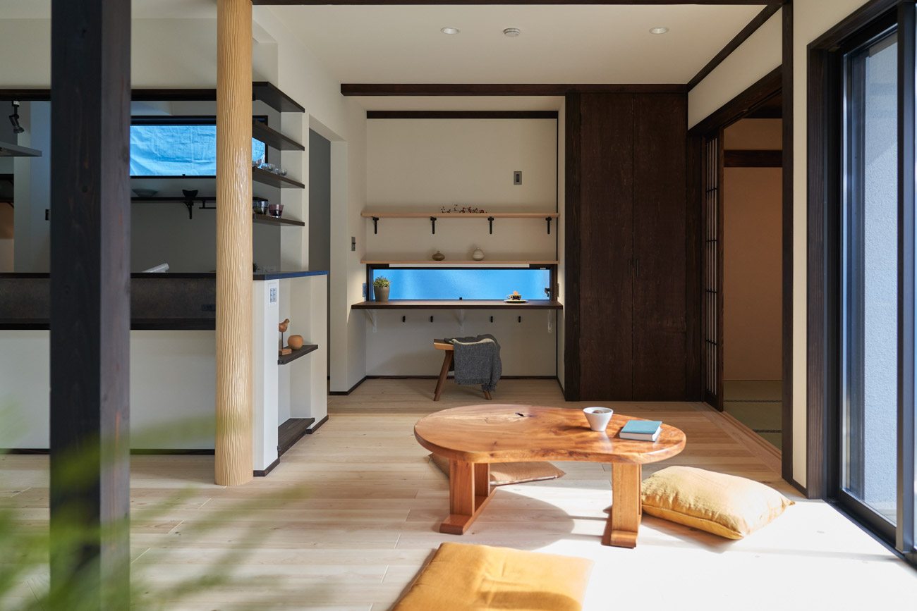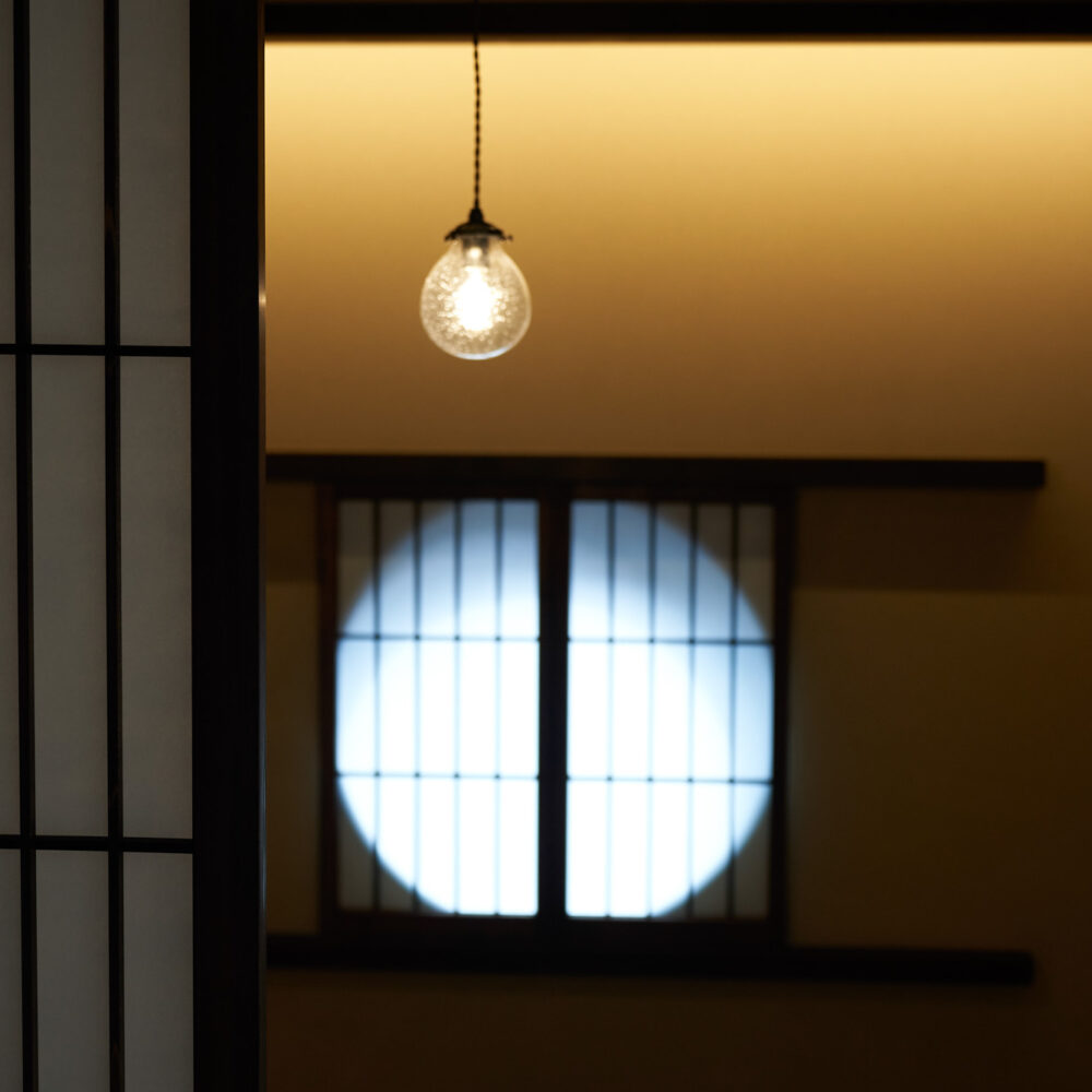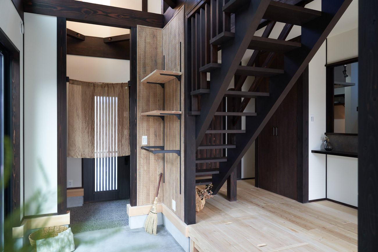 玄関の三和土から続く通り土間をイメージした広い土間スペース。黒紫色に染められた重厚な梁や柱、シンボリックな丸窓、造作扉の明かり窓を組子とガラスや障子で仕上げたりと細部までこだわりを散りばめています。和室の丸窓からは季節ごとの趣を楽しめる金閣寺垣の風情あふれる庭。ご自身で選ばれたアンティークの家具や古い欄間をリメイクした小物などを設置され、統一感のある空間となっています。