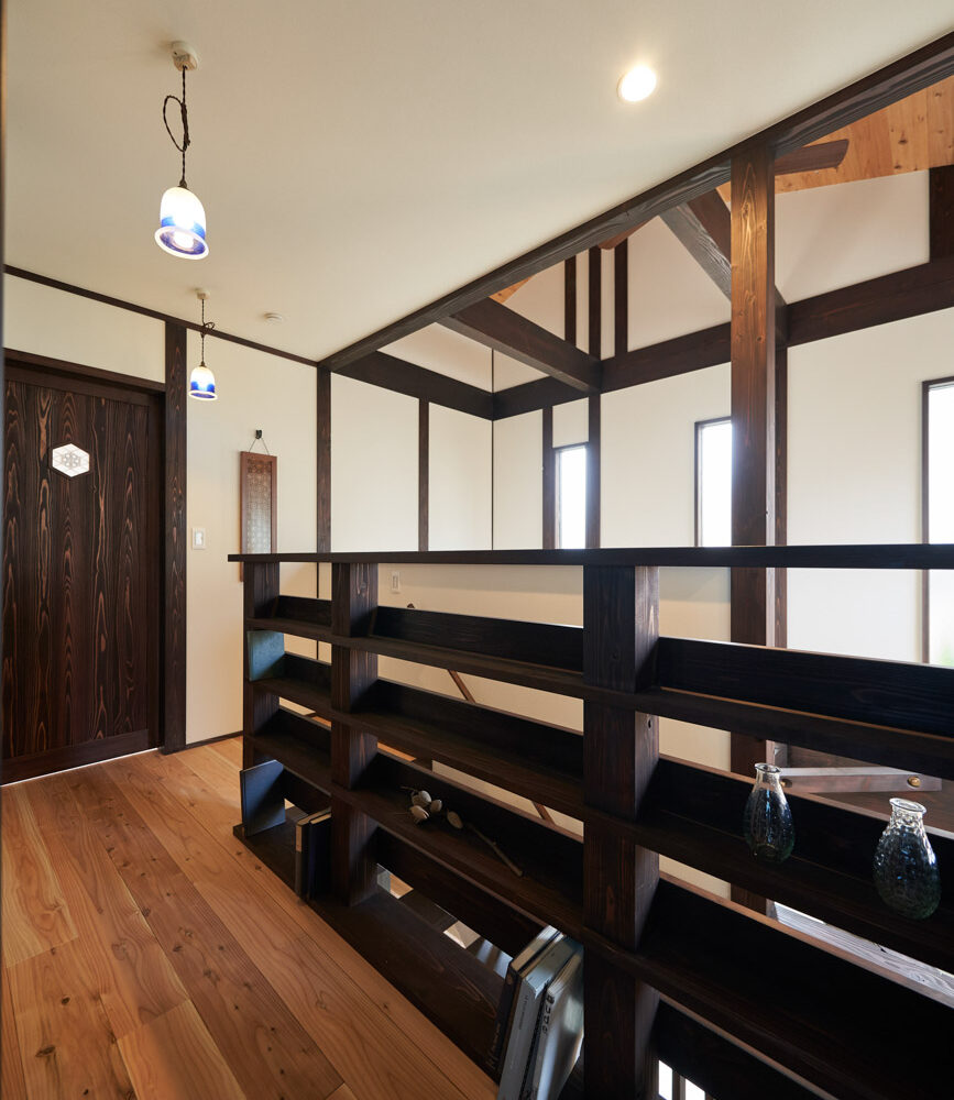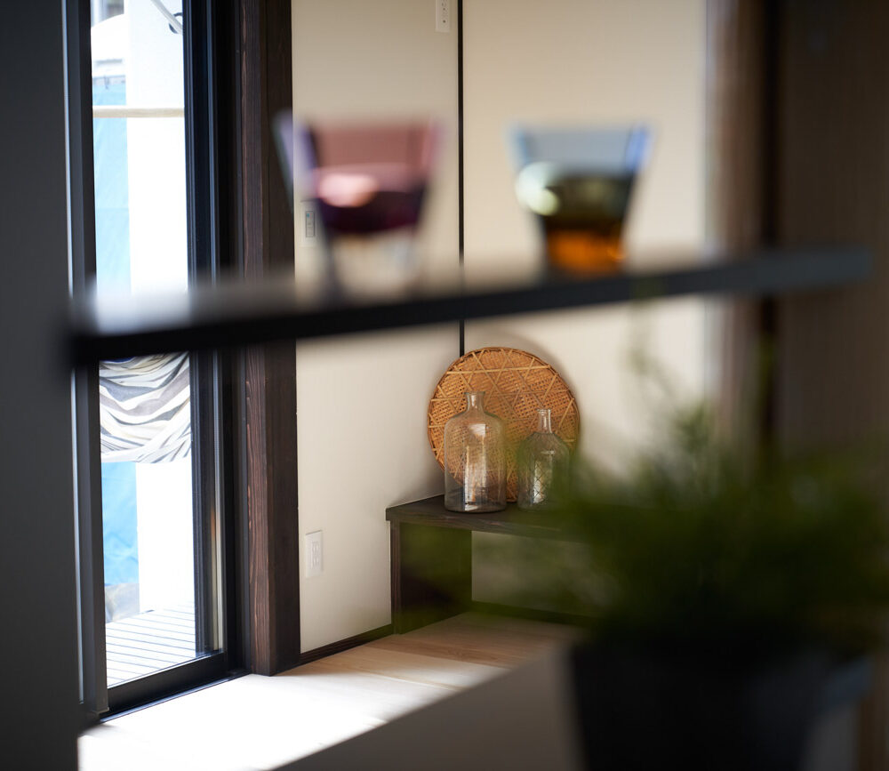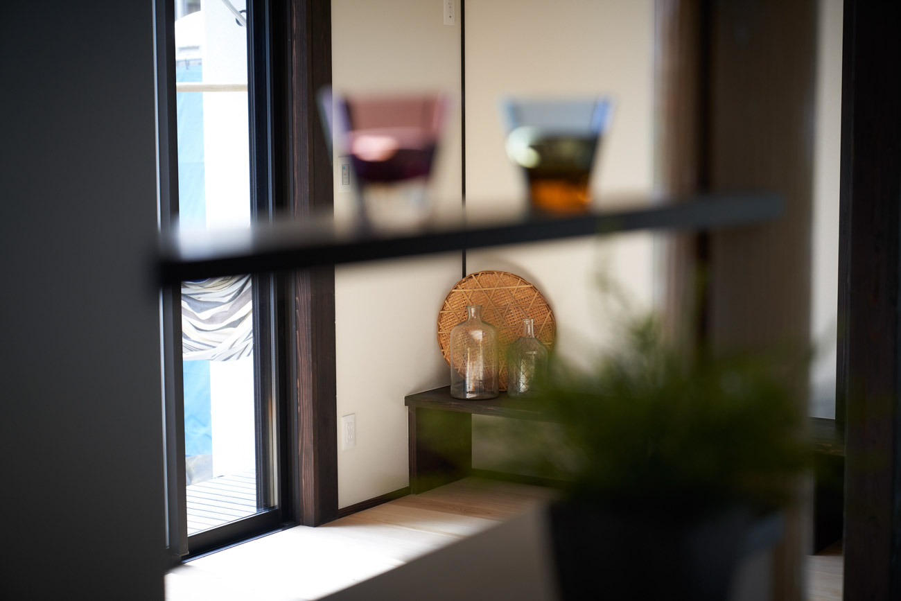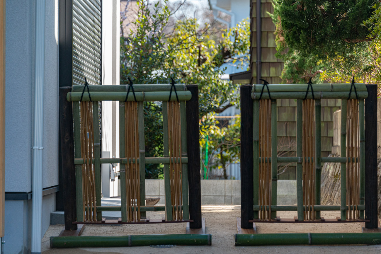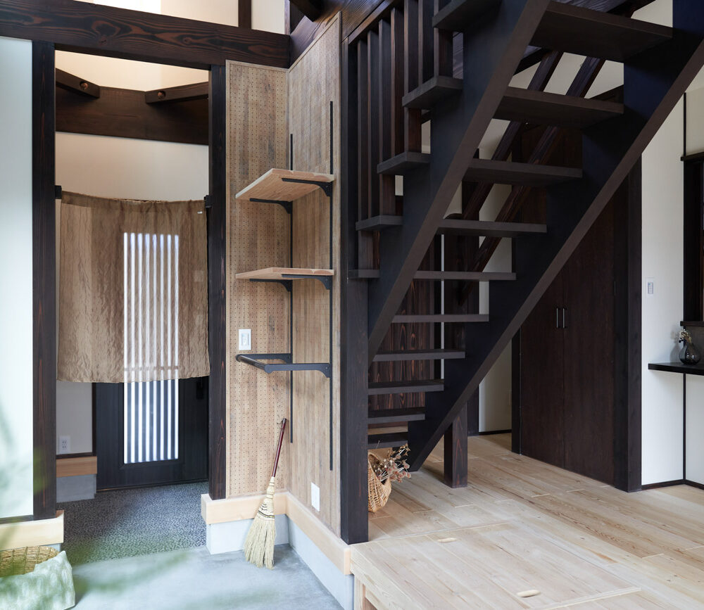 玄関の三和土から続く通り土間をイメージした広い土間スペース。黒紫色に染められた重厚な梁や柱、シンボリックな丸窓、造作扉の明かり窓を組子とガラスや障子で仕上げたりと細部までこだわりを散りばめています。和室の丸窓からは季節ごとの趣を楽しめる金閣寺垣の風情あふれる庭。ご自身で選ばれたアンティークの家具や古い欄間をリメイクした小物などを設置され、統一感のある空間となっています。