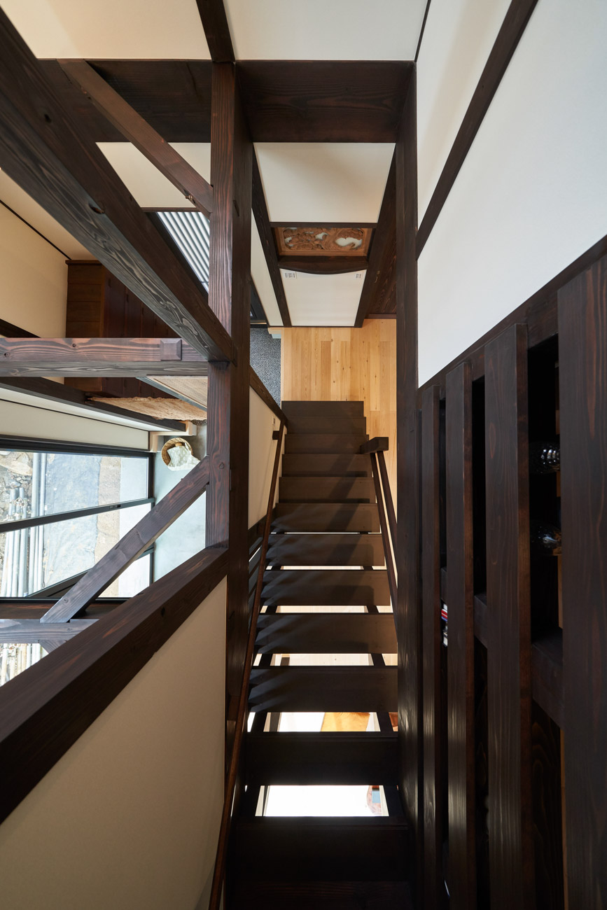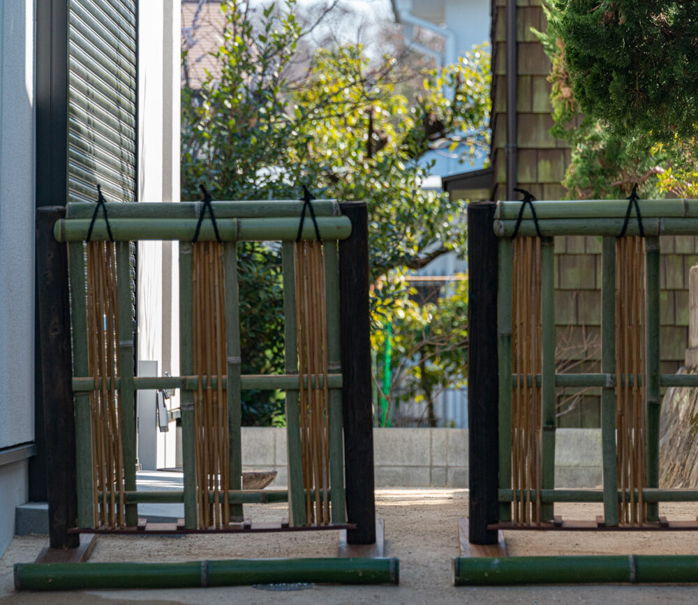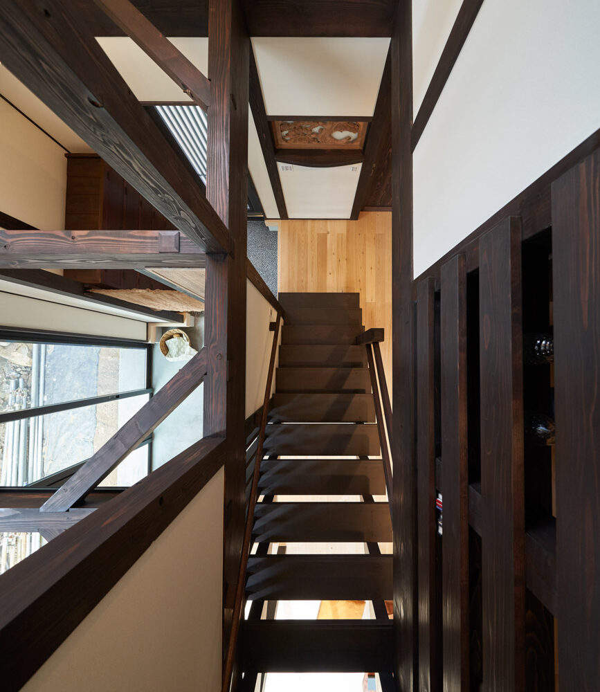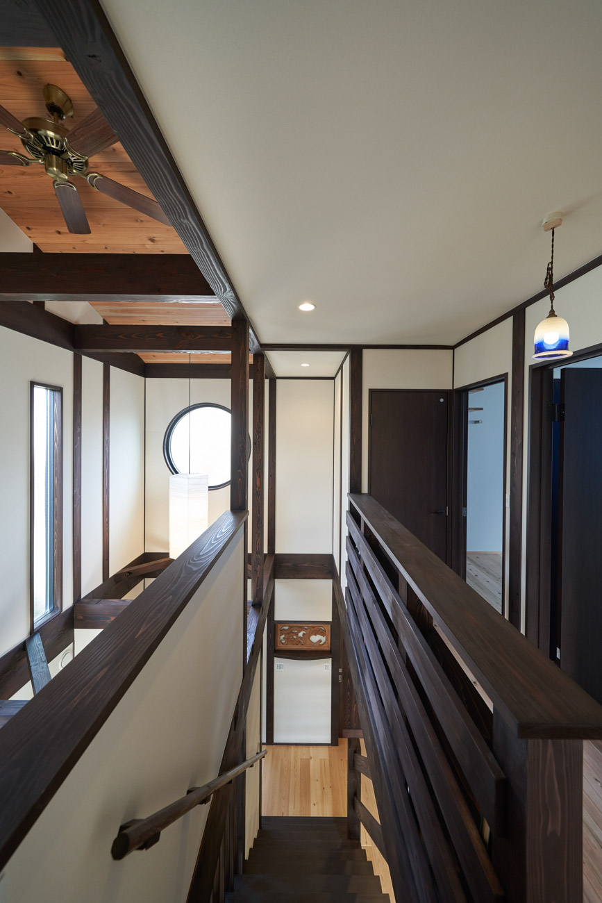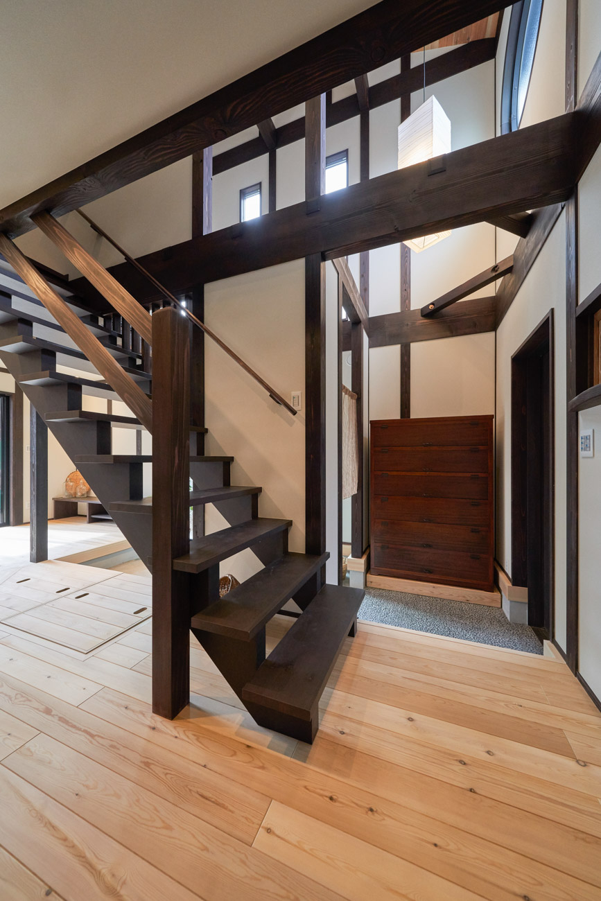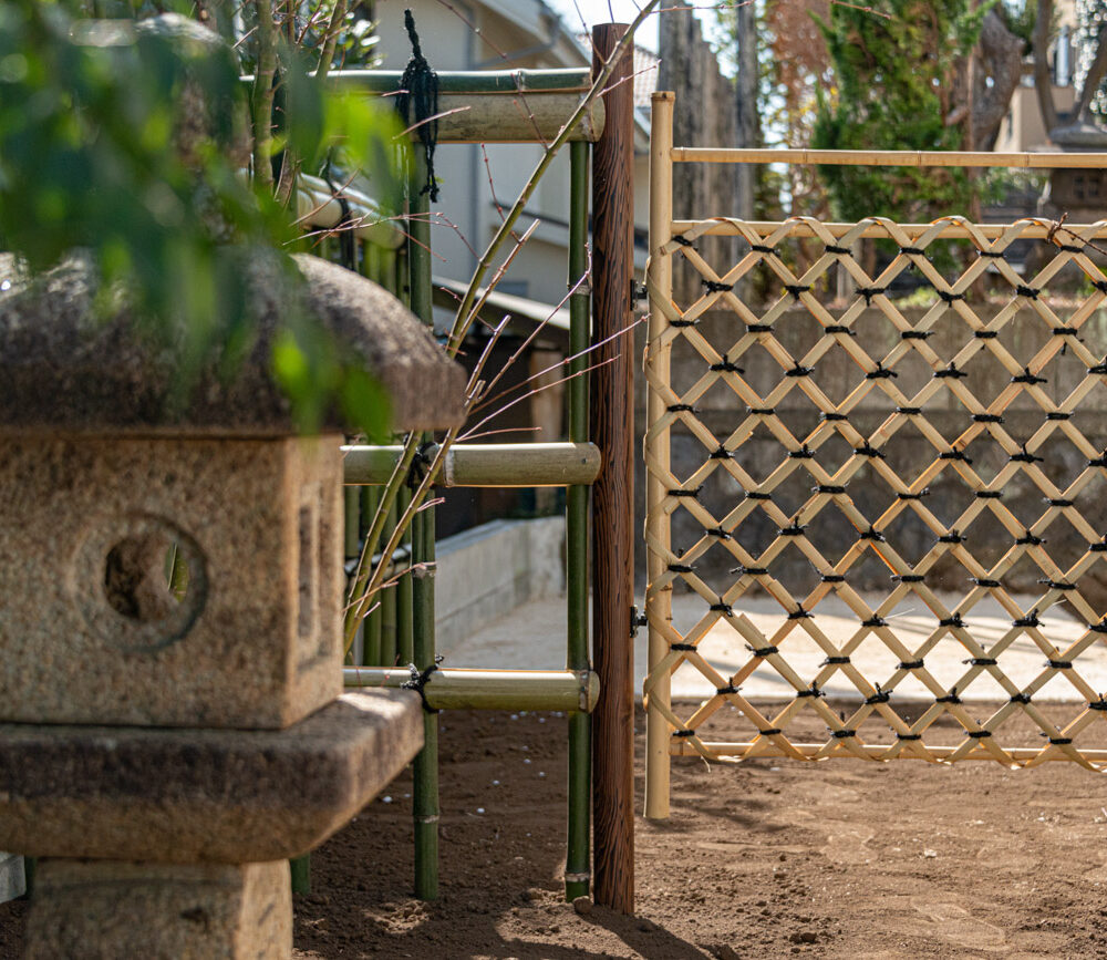 玄関の三和土から続く通り土間をイメージした広い土間スペース。黒紫色に染められた重厚な梁や柱、シンボリックな丸窓、造作扉の明かり窓を組子とガラスや障子で仕上げたりと細部までこだわりを散りばめています。和室の丸窓からは季節ごとの趣を楽しめる金閣寺垣の風情あふれる庭。ご自身で選ばれたアンティークの家具や古い欄間をリメイクした小物などを設置され、統一感のある空間となっています。