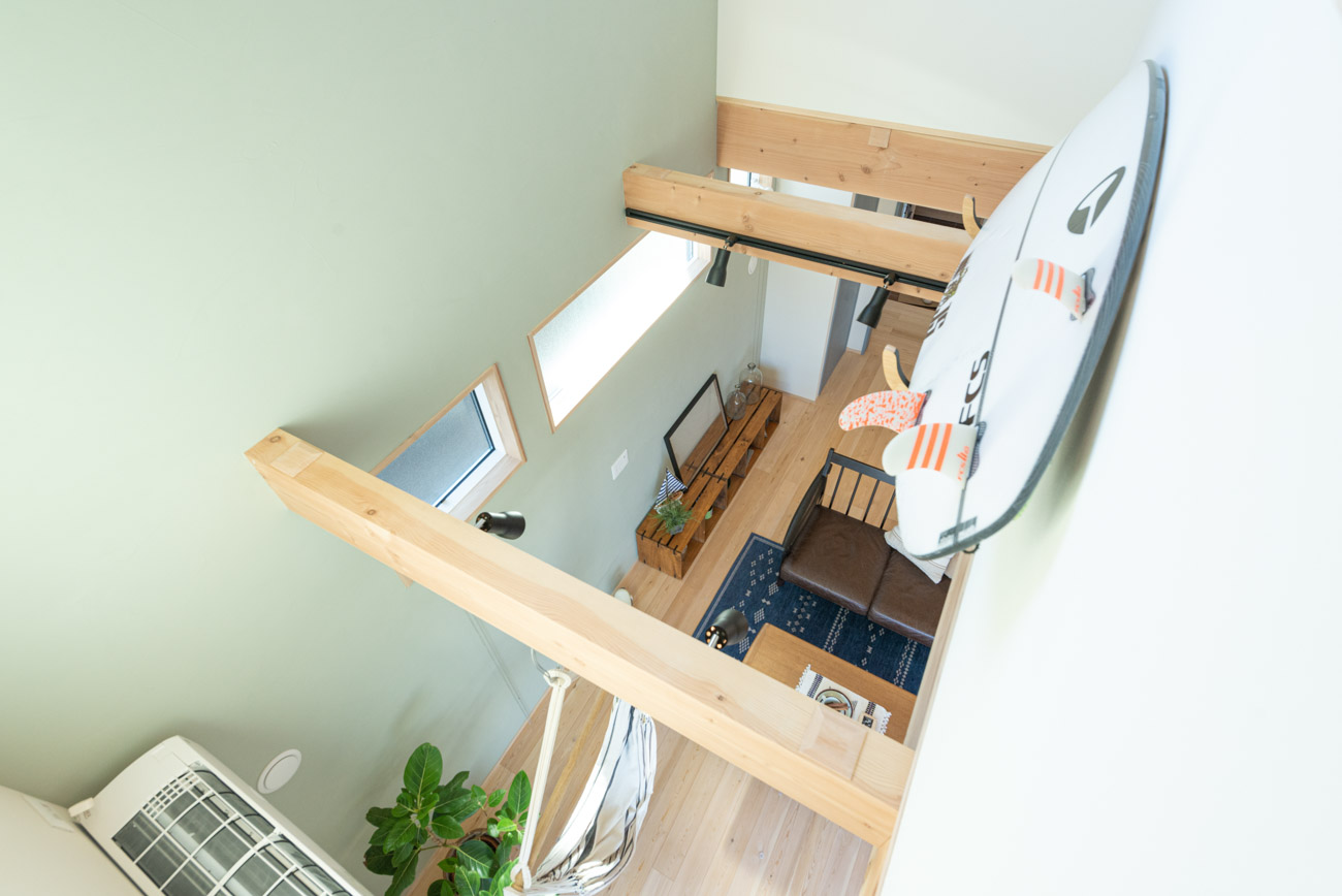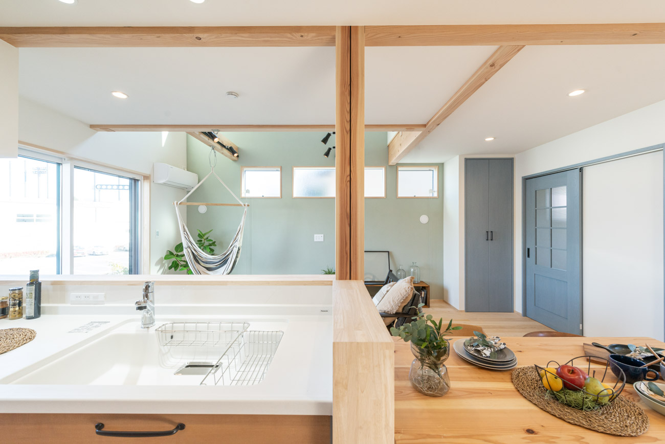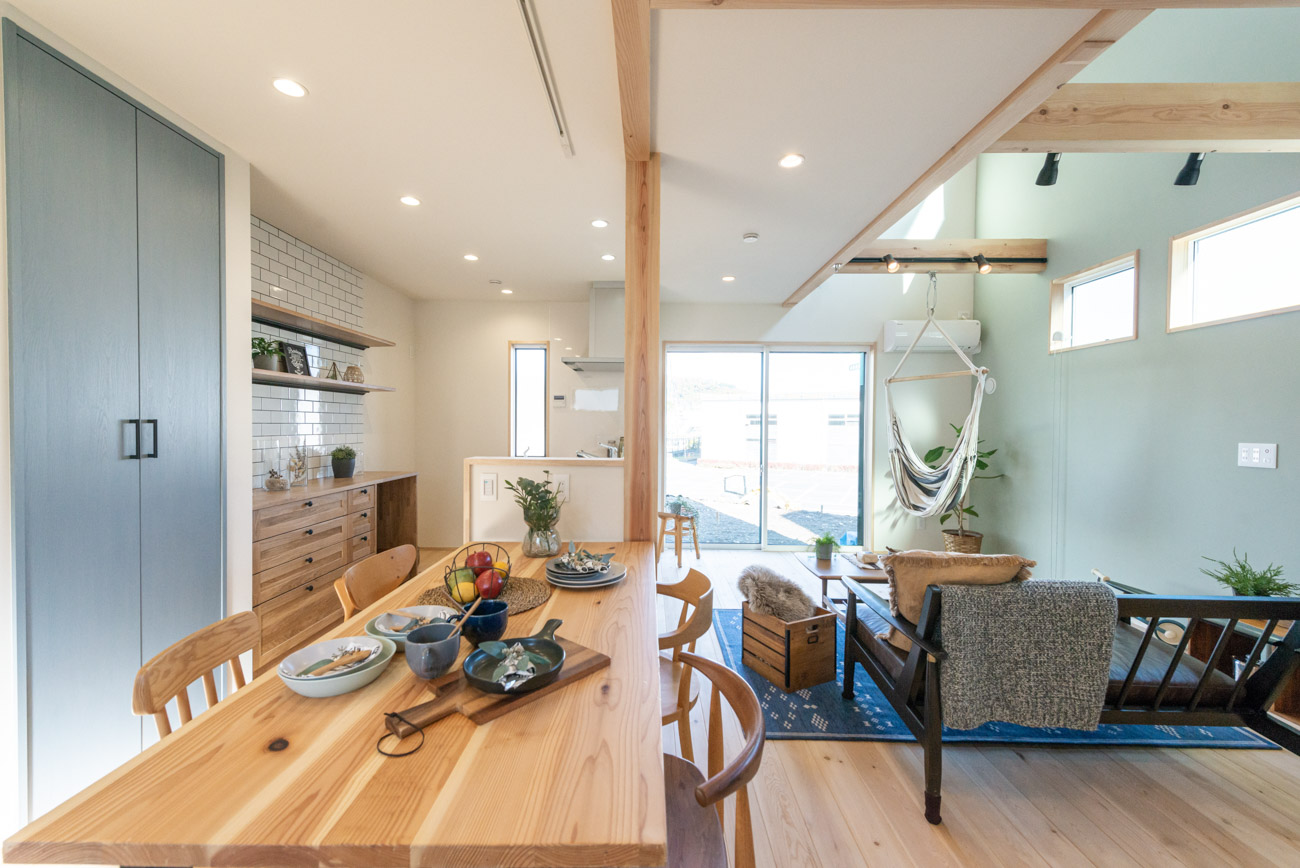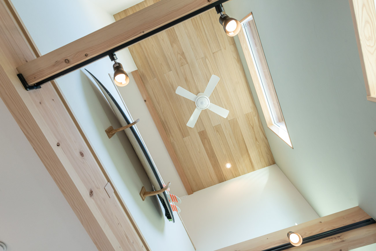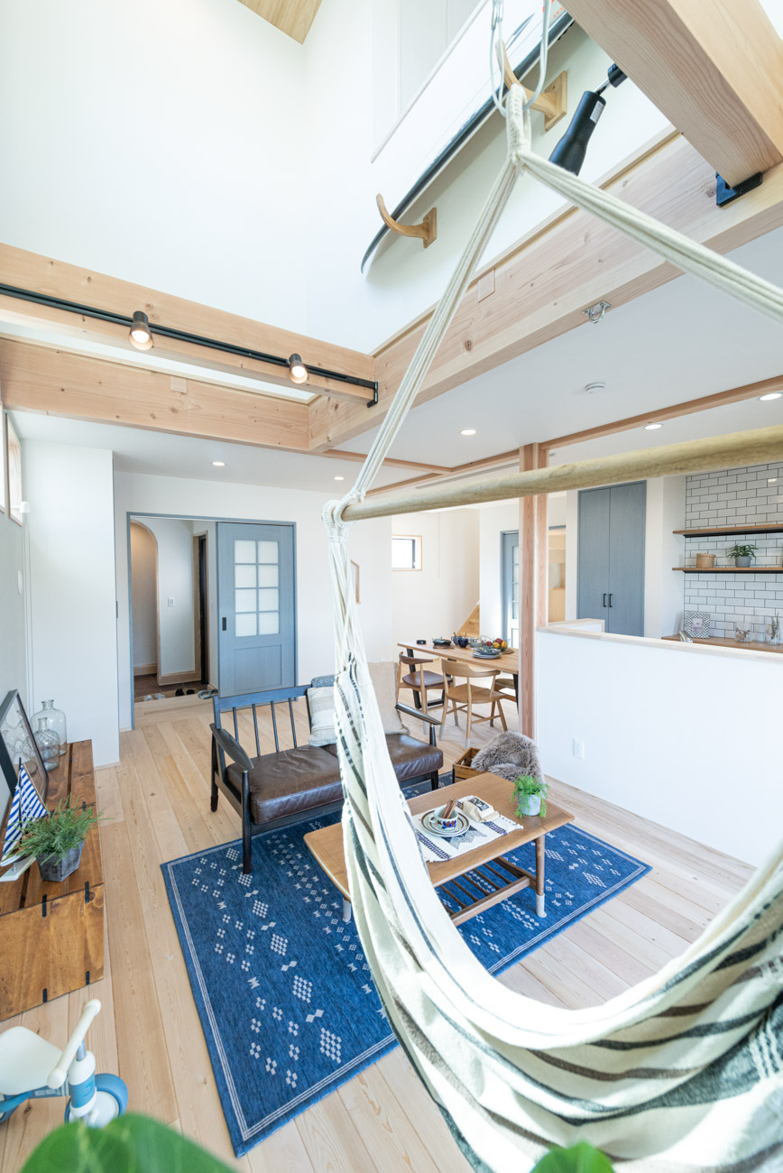 ふわっと暖かい自然素材で優しくしつらえた室内デザイン。タイルの表情が美しい、造作の洗面化粧台。爽やかなアクセントウォールと桐のパネリングが相性良く収まる高い吹き抜け。家族の成長に合わせて対応できるプランニング。若いご家族がやわらかく暮らすお住まい。 家族が集まる吹き抜けリビング ハンモックを取り付けたり趣味のサーフボードを展示したりと親子で楽しめる空間に。キッチンからぐるっとリビングを見渡せるため、家事をしながらお子様の様子を見守れます。吹き抜けの淡いカラーリングのアクセントウォールは珪藻土左官塗壁。調湿性・消臭性・抗菌作用があり、室内の空気を清浄に保つ効果があります。天井には桐の幅広パネリングを使用。落ち着いた表情で、上品な雰囲気に。軽い素材で施工しやすく狂いが少ない優れた無垢素材です。 家族が繋がるシンプル設計 上下階を繋ぐ吹き抜けで、家族がどこにいても気配をつないでくれます。また、2階フリースペースは将来的に2部屋に仕切れる仕様。扉をつけないおープンクローゼットは掃除がしやすい優れもの。シンプルに作ることで、無駄な予算も抑え、開放的に暮らせます。断熱性・機密性も高く、広くても冷暖房効率が良く、コストパフォーマンスの良いお住まいです。 自分だけのオリジナル造作家具 お好きなタイルと照明を組み合わせ、マリンスタイルの一点ものの洗面化粧台を造作。建具や家具、既製品は数あれど、しっくり来るものがないというときは、皆様の好みや暮らし方に合わせて作る造作家具や建具をおすすめしています。