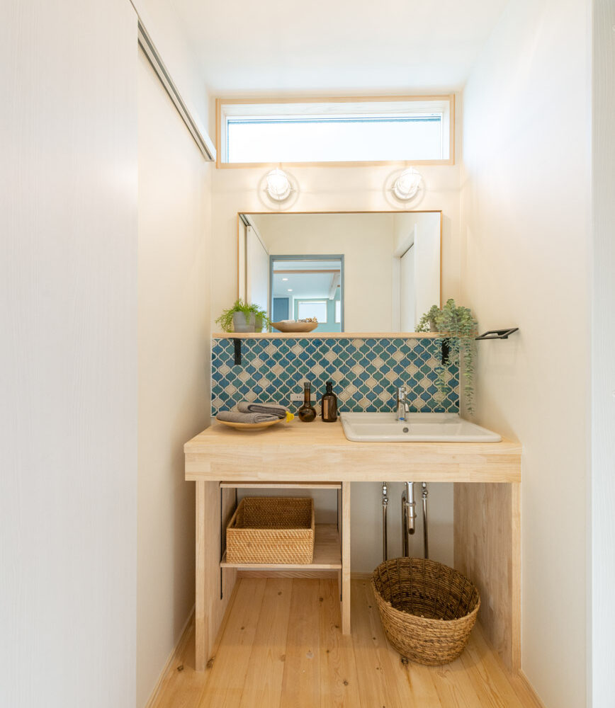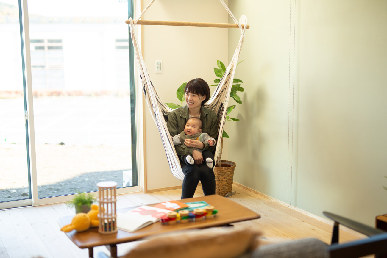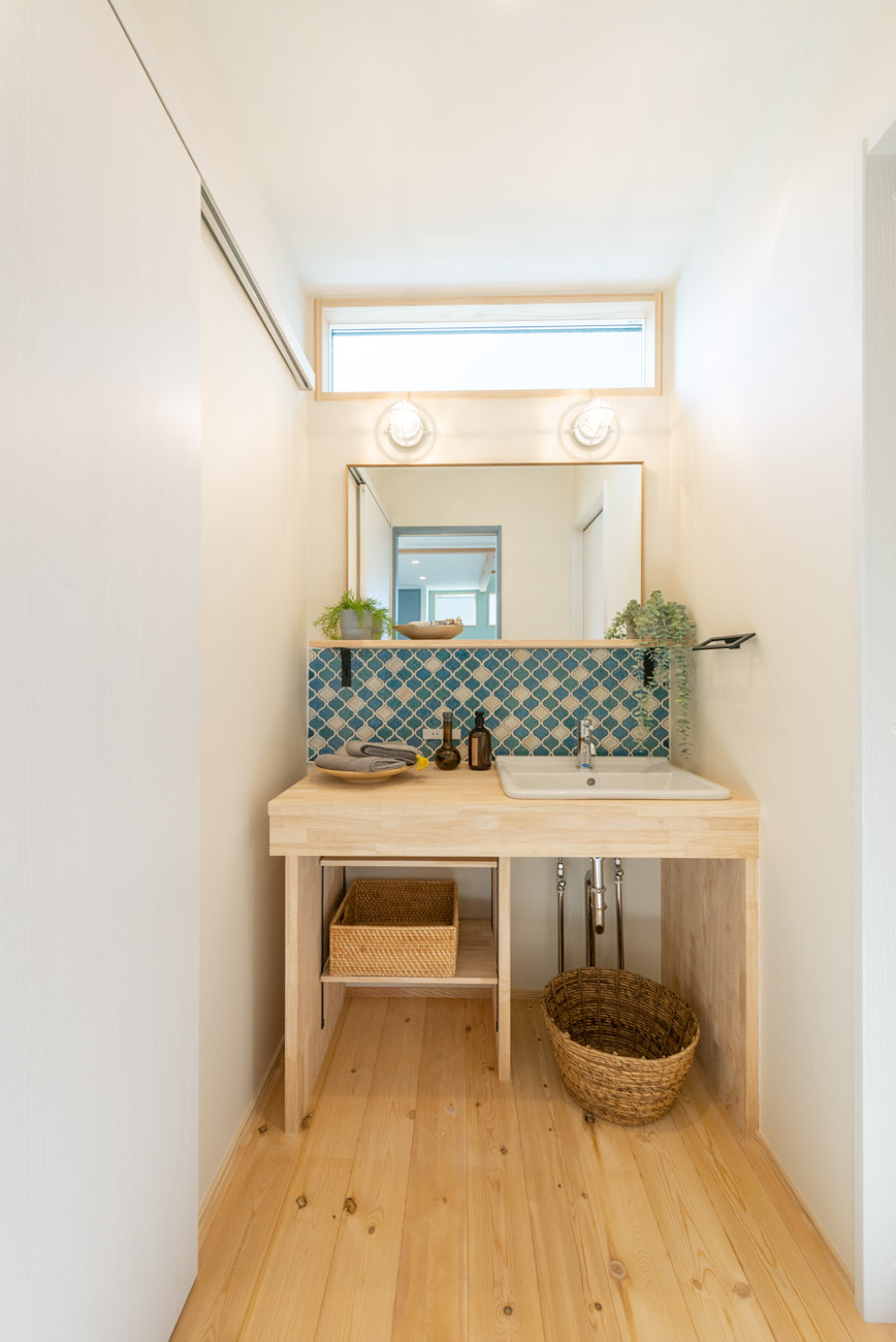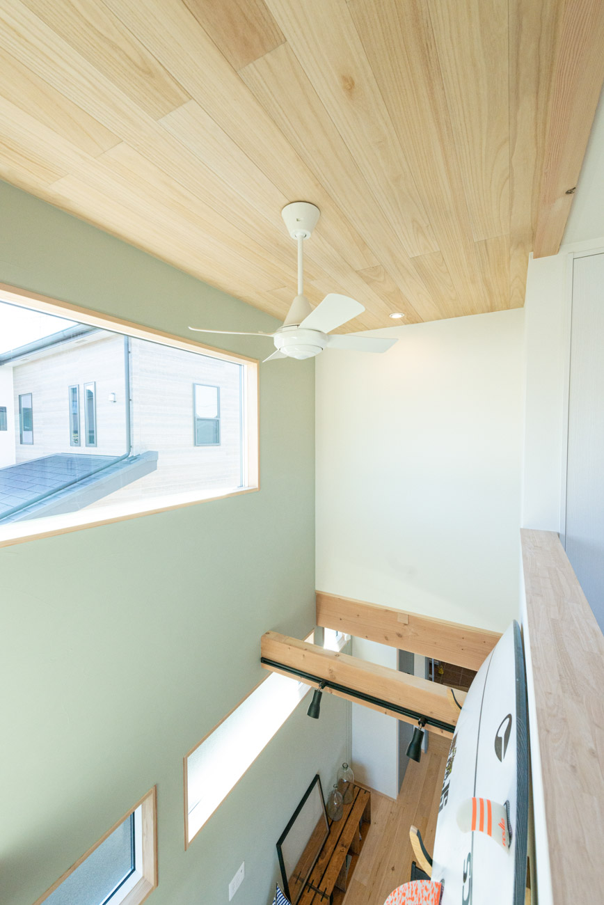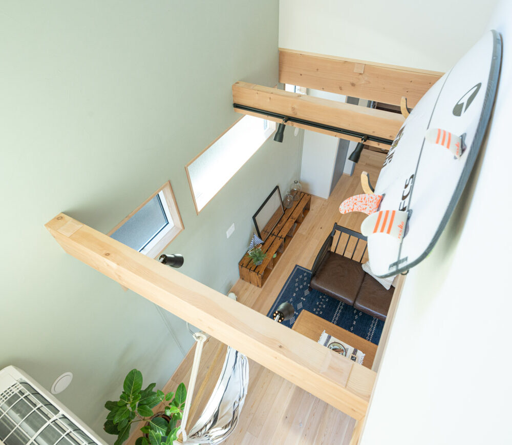 ふわっと暖かい自然素材で優しくしつらえた室内デザイン。タイルの表情が美しい、造作の洗面化粧台。爽やかなアクセントウォールと桐のパネリングが相性良く収まる高い吹き抜け。家族の成長に合わせて対応できるプランニング。若いご家族がやわらかく暮らすお住まい。 家族が集まる吹き抜けリビング ハンモックを取り付けたり趣味のサーフボードを展示したりと親子で楽しめる空間に。キッチンからぐるっとリビングを見渡せるため、家事をしながらお子様の様子を見守れます。吹き抜けの淡いカラーリングのアクセントウォールは珪藻土左官塗壁。調湿性・消臭性・抗菌作用があり、室内の空気を清浄に保つ効果があります。天井には桐の幅広パネリングを使用。落ち着いた表情で、上品な雰囲気に。軽い素材で施工しやすく狂いが少ない優れた無垢素材です。 家族が繋がるシンプル設計 上下階を繋ぐ吹き抜けで、家族がどこにいても気配をつないでくれます。また、2階フリースペースは将来的に2部屋に仕切れる仕様。扉をつけないおープンクローゼットは掃除がしやすい優れもの。シンプルに作ることで、無駄な予算も抑え、開放的に暮らせます。断熱性・機密性も高く、広くても冷暖房効率が良く、コストパフォーマンスの良いお住まいです。 自分だけのオリジナル造作家具 お好きなタイルと照明を組み合わせ、マリンスタイルの一点ものの洗面化粧台を造作。建具や家具、既製品は数あれど、しっくり来るものがないというときは、皆様の好みや暮らし方に合わせて作る造作家具や建具をおすすめしています。