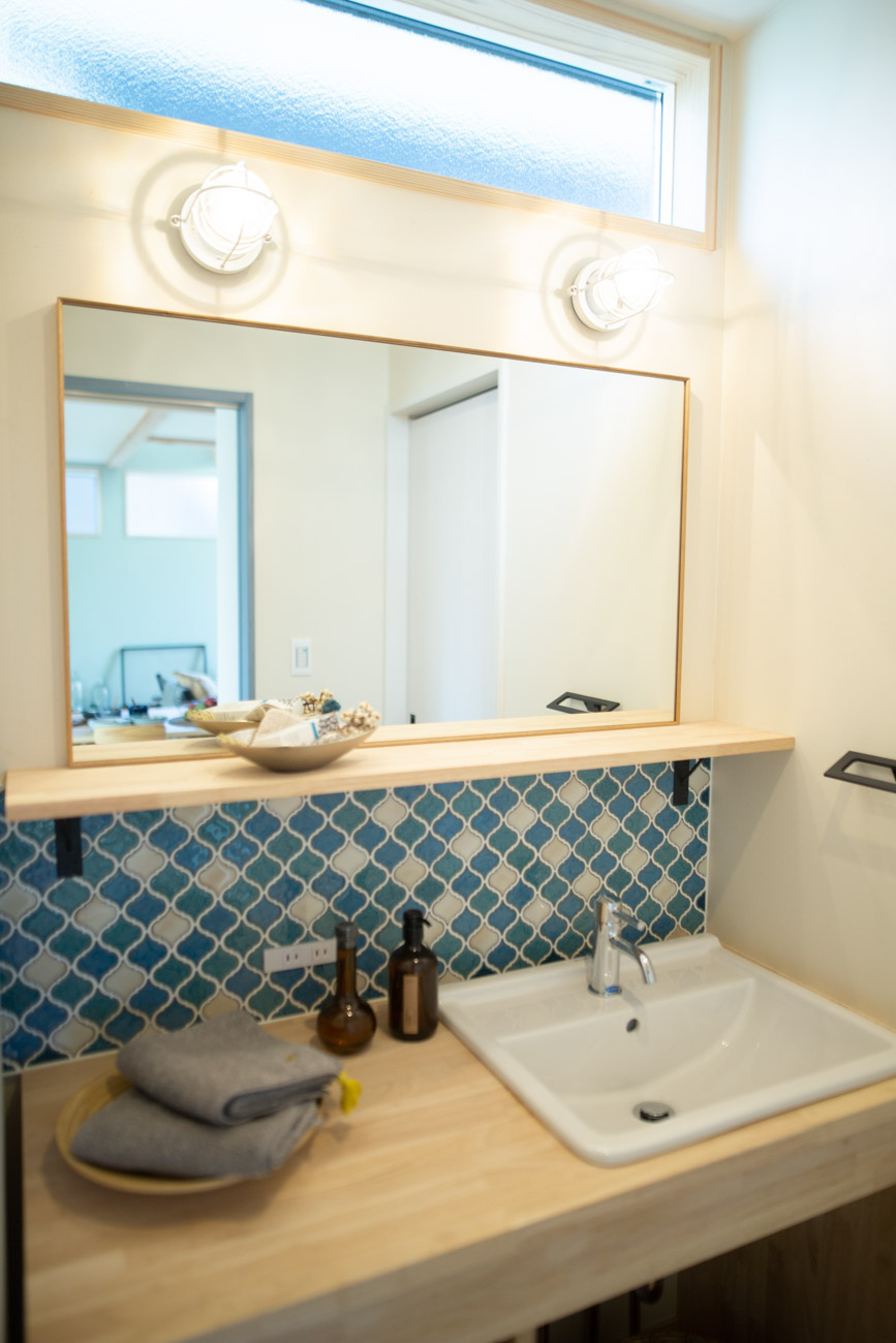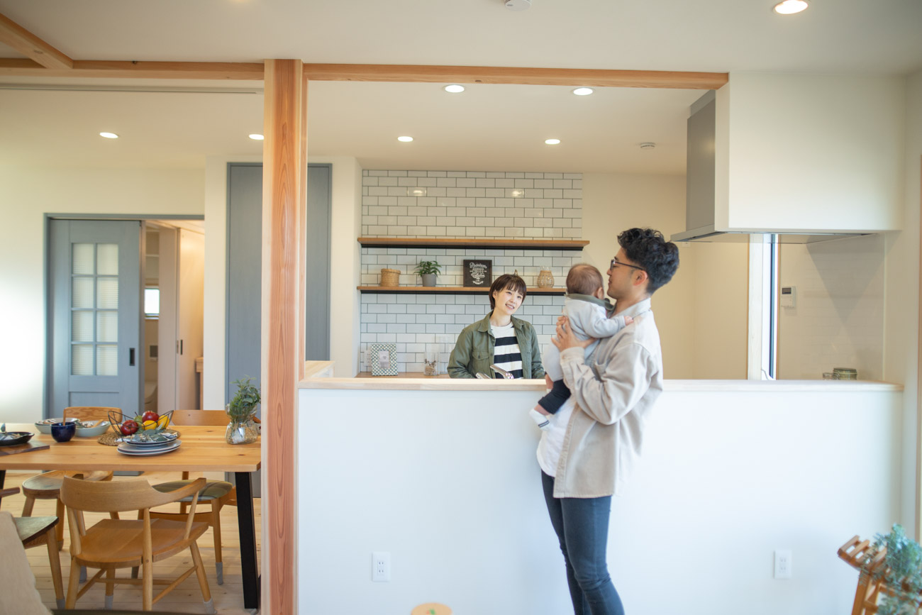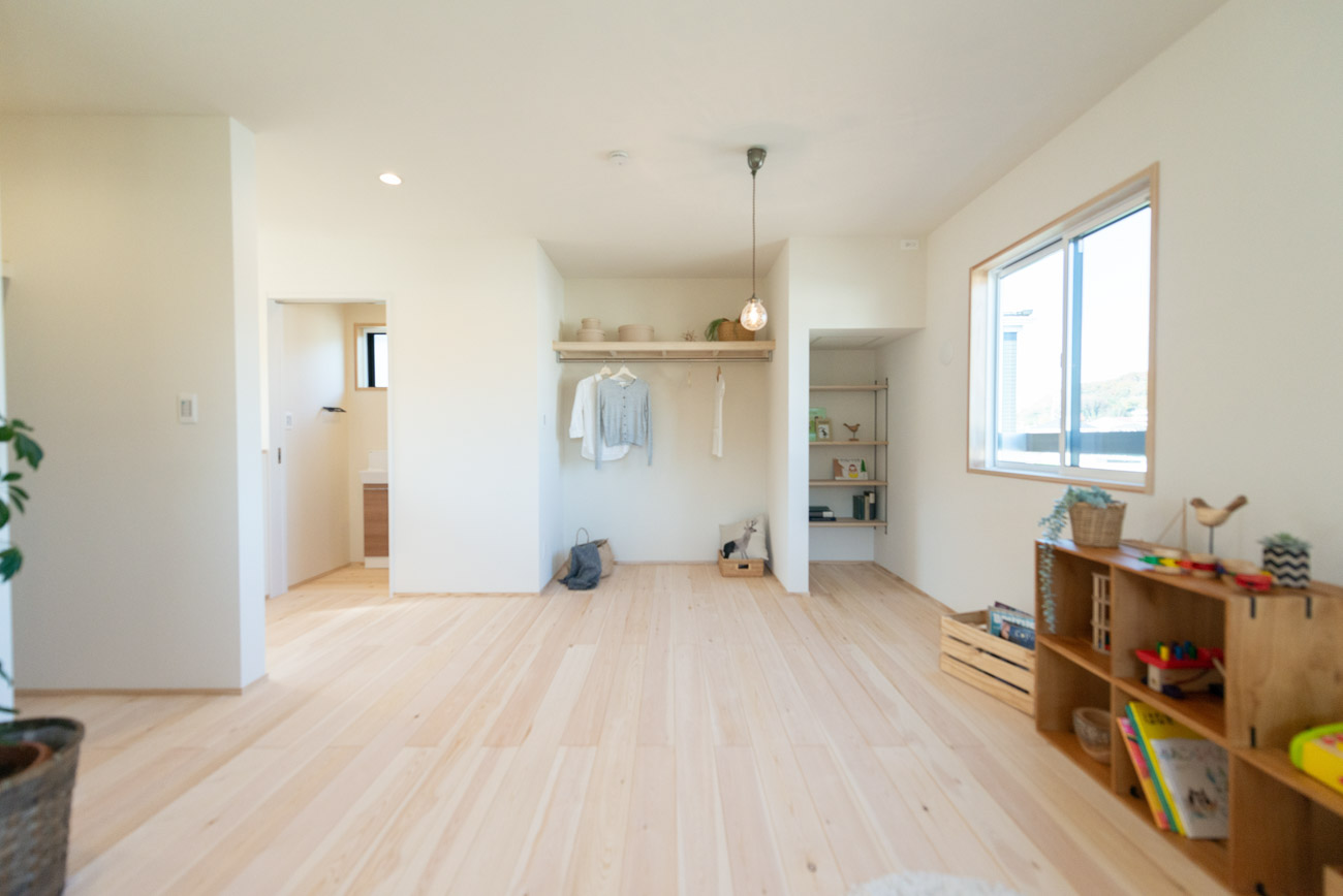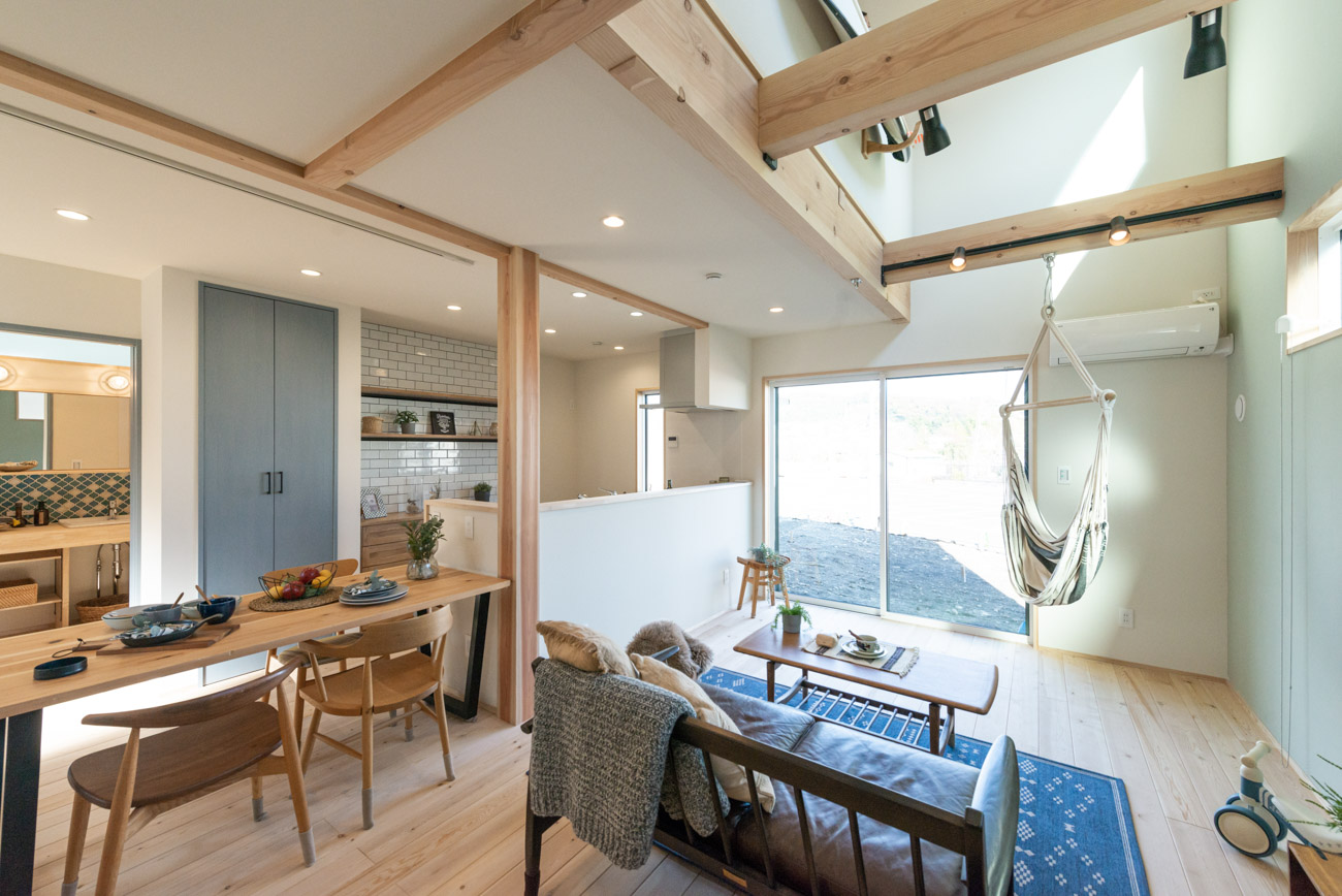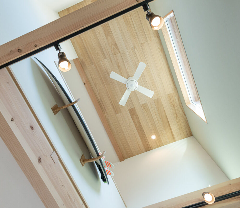 ふわっと暖かい自然素材で優しくしつらえた室内デザイン。タイルの表情が美しい、造作の洗面化粧台。爽やかなアクセントウォールと桐のパネリングが相性良く収まる高い吹き抜け。家族の成長に合わせて対応できるプランニング。若いご家族がやわらかく暮らすお住まい。 家族が集まる吹き抜けリビング ハンモックを取り付けたり趣味のサーフボードを展示したりと親子で楽しめる空間に。キッチンからぐるっとリビングを見渡せるため、家事をしながらお子様の様子を見守れます。吹き抜けの淡いカラーリングのアクセントウォールは珪藻土左官塗壁。調湿性・消臭性・抗菌作用があり、室内の空気を清浄に保つ効果があります。天井には桐の幅広パネリングを使用。落ち着いた表情で、上品な雰囲気に。軽い素材で施工しやすく狂いが少ない優れた無垢素材です。 家族が繋がるシンプル設計 上下階を繋ぐ吹き抜けで、家族がどこにいても気配をつないでくれます。また、2階フリースペースは将来的に2部屋に仕切れる仕様。扉をつけないおープンクローゼットは掃除がしやすい優れもの。シンプルに作ることで、無駄な予算も抑え、開放的に暮らせます。断熱性・機密性も高く、広くても冷暖房効率が良く、コストパフォーマンスの良いお住まいです。 自分だけのオリジナル造作家具 お好きなタイルと照明を組み合わせ、マリンスタイルの一点ものの洗面化粧台を造作。建具や家具、既製品は数あれど、しっくり来るものがないというときは、皆様の好みや暮らし方に合わせて作る造作家具や建具をおすすめしています。