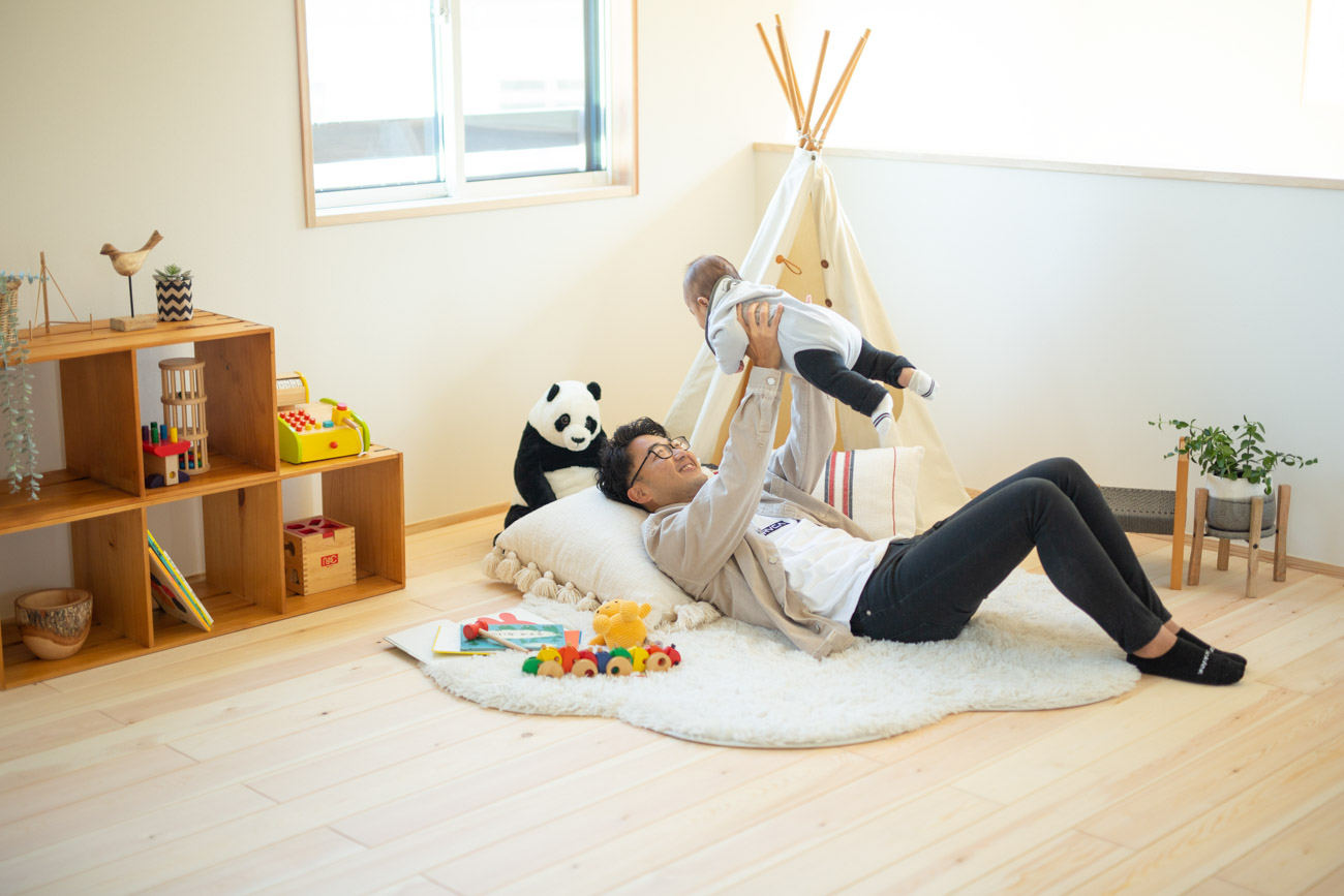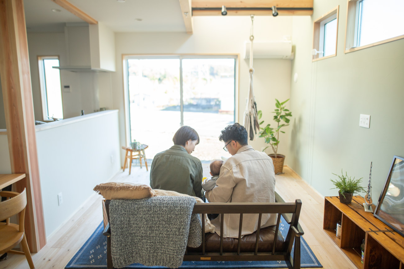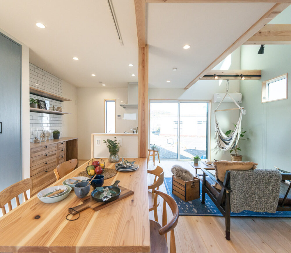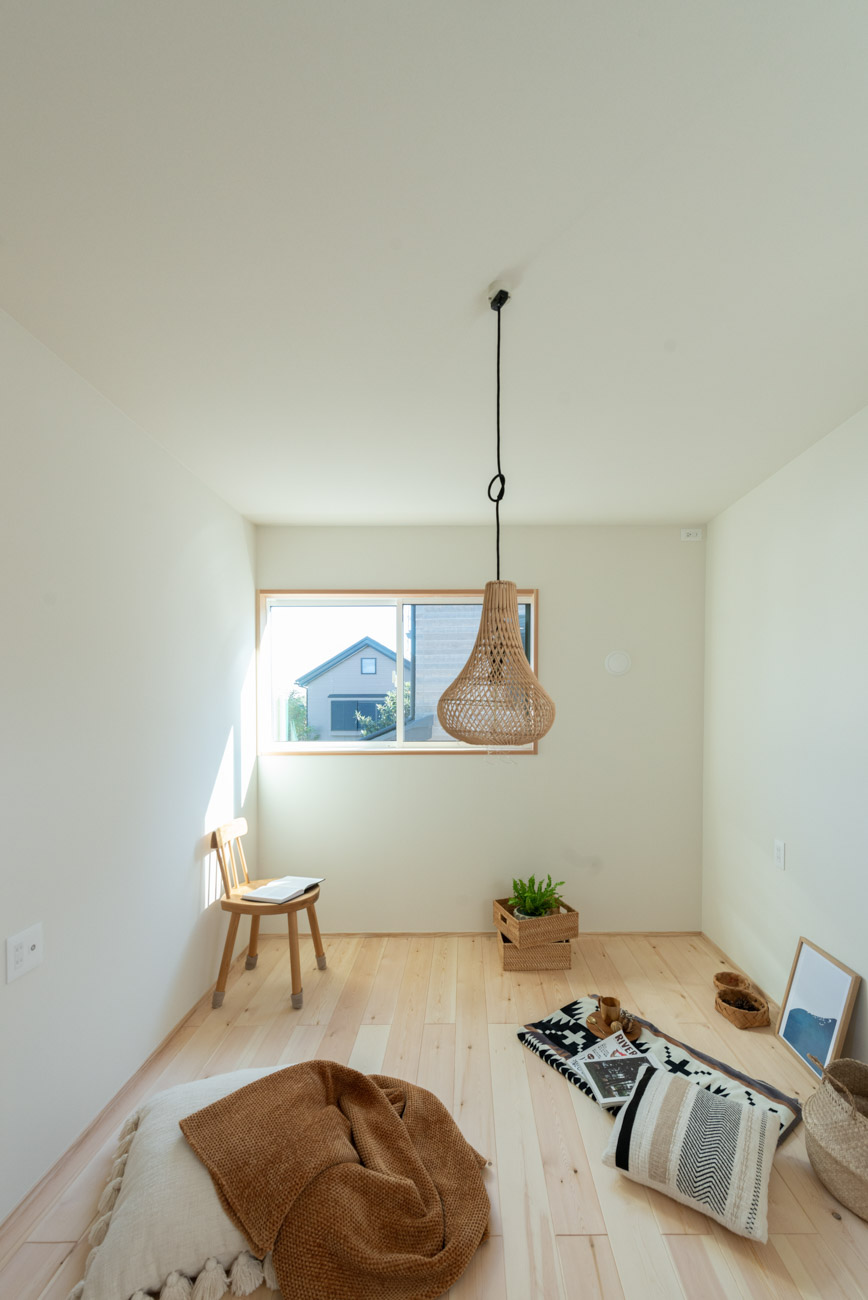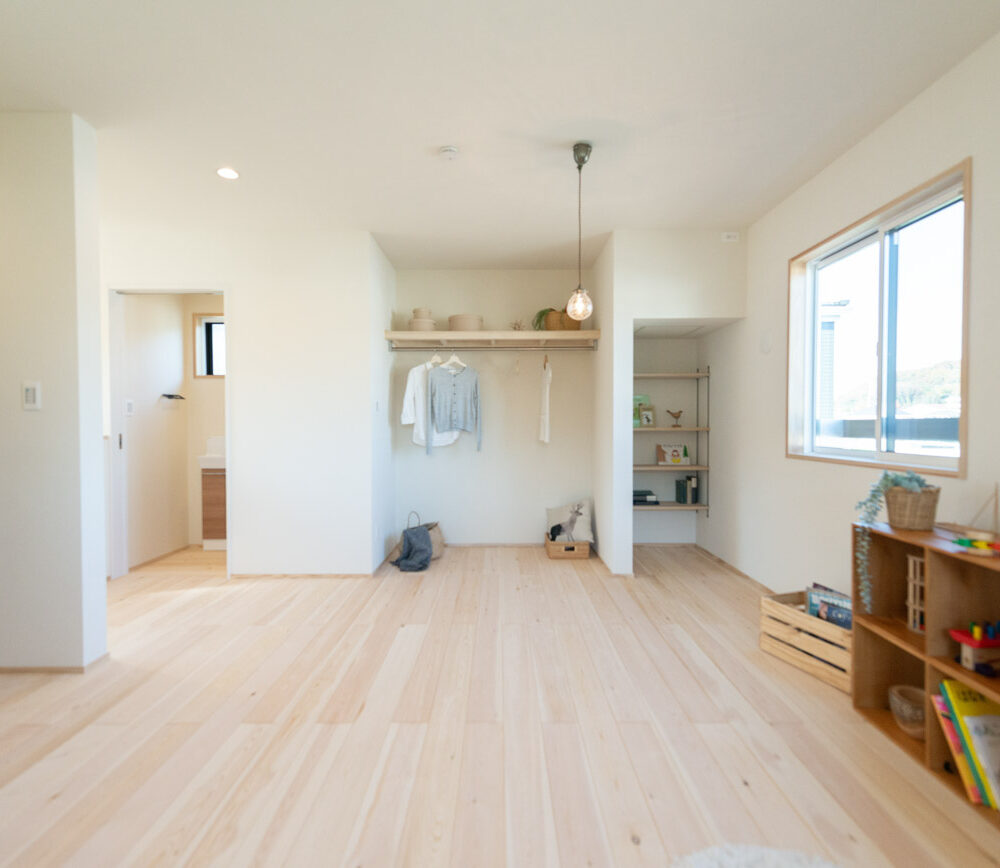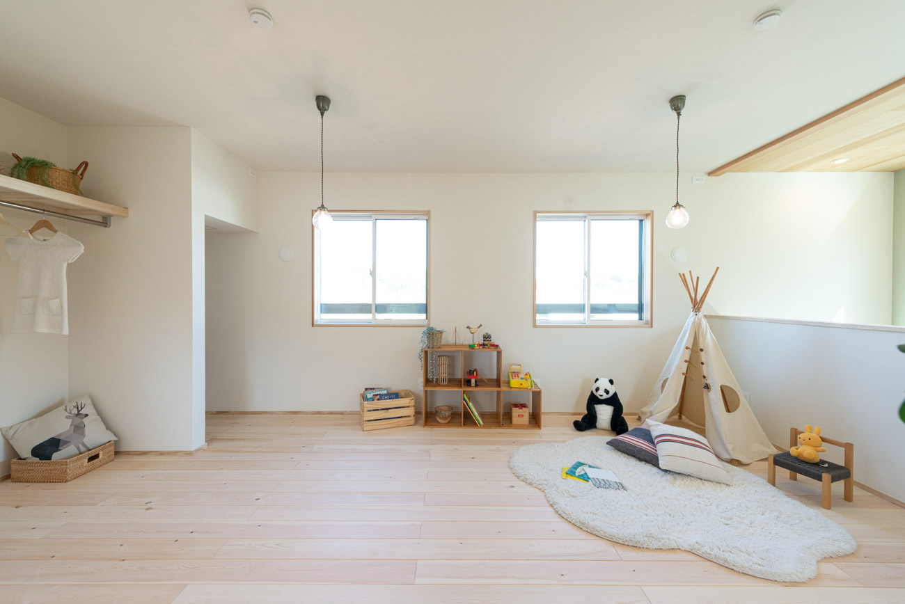 ふわっと暖かい自然素材で優しくしつらえた室内デザイン。タイルの表情が美しい、造作の洗面化粧台。爽やかなアクセントウォールと桐のパネリングが相性良く収まる高い吹き抜け。家族の成長に合わせて対応できるプランニング。若いご家族がやわらかく暮らすお住まい。 家族が集まる吹き抜けリビング ハンモックを取り付けたり趣味のサーフボードを展示したりと親子で楽しめる空間に。キッチンからぐるっとリビングを見渡せるため、家事をしながらお子様の様子を見守れます。吹き抜けの淡いカラーリングのアクセントウォールは珪藻土左官塗壁。調湿性・消臭性・抗菌作用があり、室内の空気を清浄に保つ効果があります。天井には桐の幅広パネリングを使用。落ち着いた表情で、上品な雰囲気に。軽い素材で施工しやすく狂いが少ない優れた無垢素材です。 家族が繋がるシンプル設計 上下階を繋ぐ吹き抜けで、家族がどこにいても気配をつないでくれます。また、2階フリースペースは将来的に2部屋に仕切れる仕様。扉をつけないおープンクローゼットは掃除がしやすい優れもの。シンプルに作ることで、無駄な予算も抑え、開放的に暮らせます。断熱性・機密性も高く、広くても冷暖房効率が良く、コストパフォーマンスの良いお住まいです。 自分だけのオリジナル造作家具 お好きなタイルと照明を組み合わせ、マリンスタイルの一点ものの洗面化粧台を造作。建具や家具、既製品は数あれど、しっくり来るものがないというときは、皆様の好みや暮らし方に合わせて作る造作家具や建具をおすすめしています。