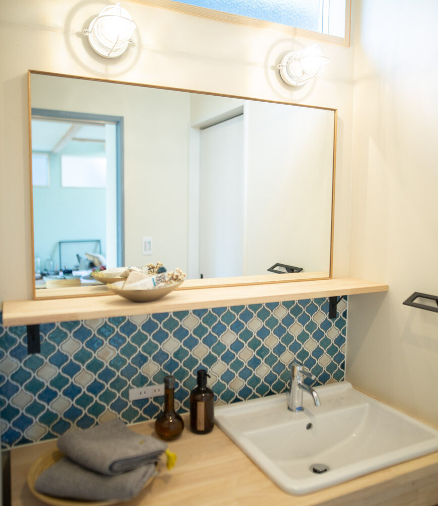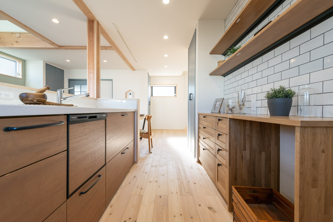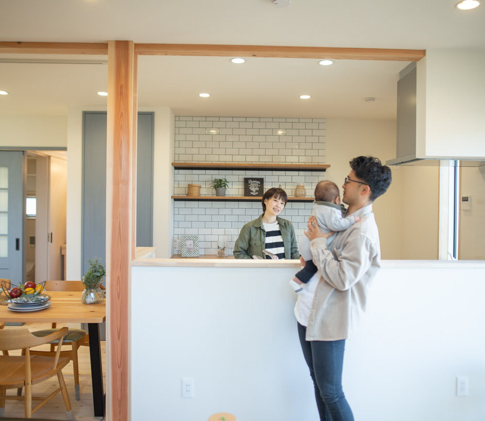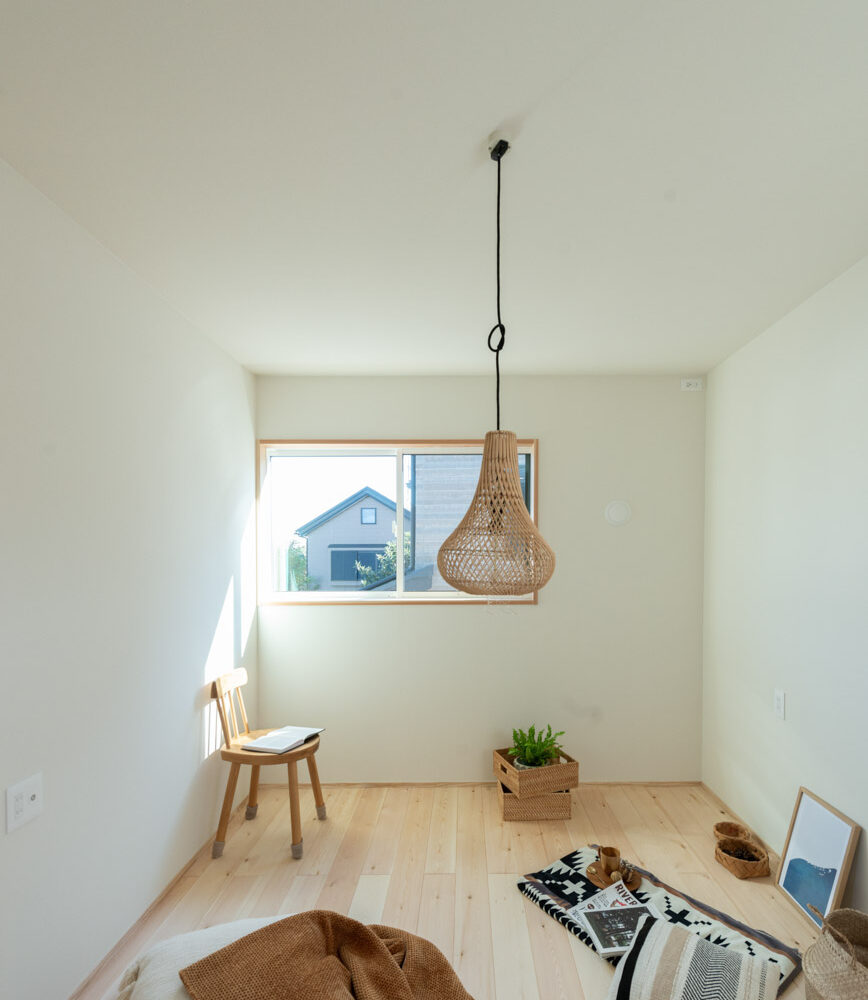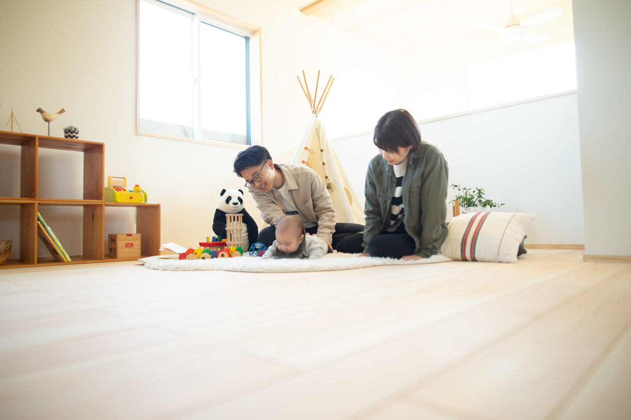 ふわっと暖かい自然素材で優しくしつらえた室内デザイン。タイルの表情が美しい、造作の洗面化粧台。爽やかなアクセントウォールと桐のパネリングが相性良く収まる高い吹き抜け。家族の成長に合わせて対応できるプランニング。若いご家族がやわらかく暮らすお住まい。 家族が集まる吹き抜けリビング ハンモックを取り付けたり趣味のサーフボードを展示したりと親子で楽しめる空間に。キッチンからぐるっとリビングを見渡せるため、家事をしながらお子様の様子を見守れます。吹き抜けの淡いカラーリングのアクセントウォールは珪藻土左官塗壁。調湿性・消臭性・抗菌作用があり、室内の空気を清浄に保つ効果があります。天井には桐の幅広パネリングを使用。落ち着いた表情で、上品な雰囲気に。軽い素材で施工しやすく狂いが少ない優れた無垢素材です。 家族が繋がるシンプル設計 上下階を繋ぐ吹き抜けで、家族がどこにいても気配をつないでくれます。また、2階フリースペースは将来的に2部屋に仕切れる仕様。扉をつけないおープンクローゼットは掃除がしやすい優れもの。シンプルに作ることで、無駄な予算も抑え、開放的に暮らせます。断熱性・機密性も高く、広くても冷暖房効率が良く、コストパフォーマンスの良いお住まいです。 自分だけのオリジナル造作家具 お好きなタイルと照明を組み合わせ、マリンスタイルの一点ものの洗面化粧台を造作。建具や家具、既製品は数あれど、しっくり来るものがないというときは、皆様の好みや暮らし方に合わせて作る造作家具や建具をおすすめしています。